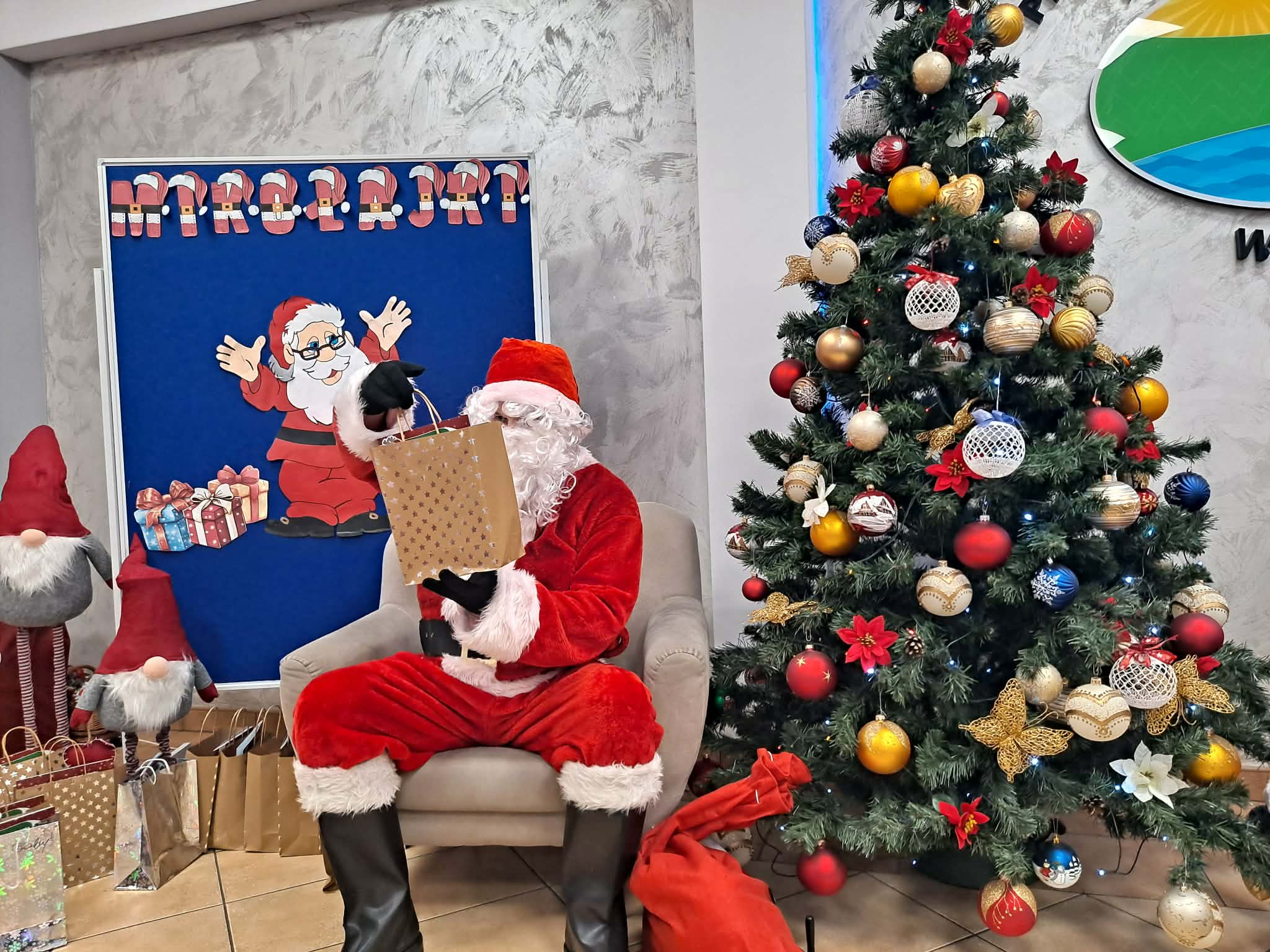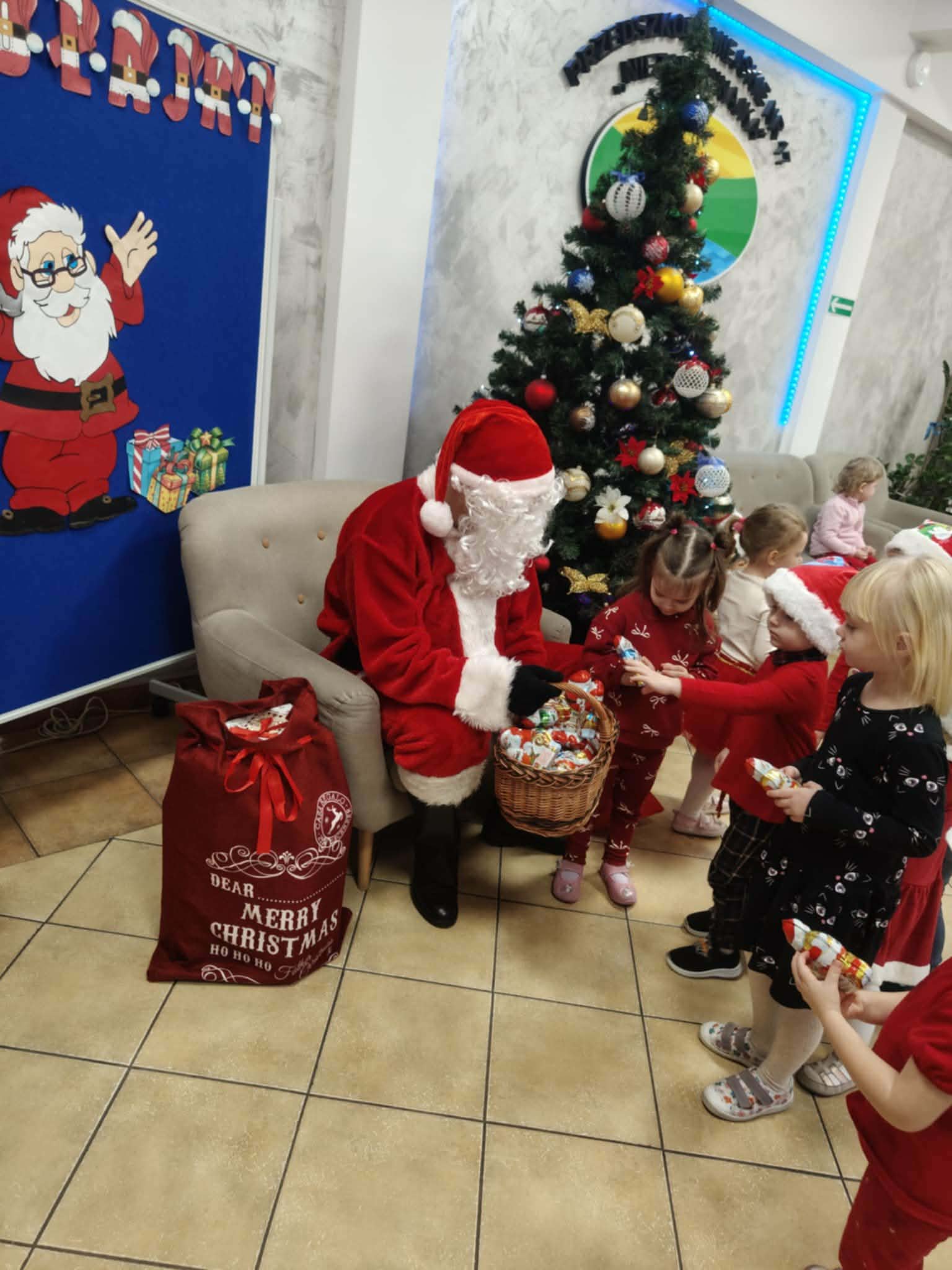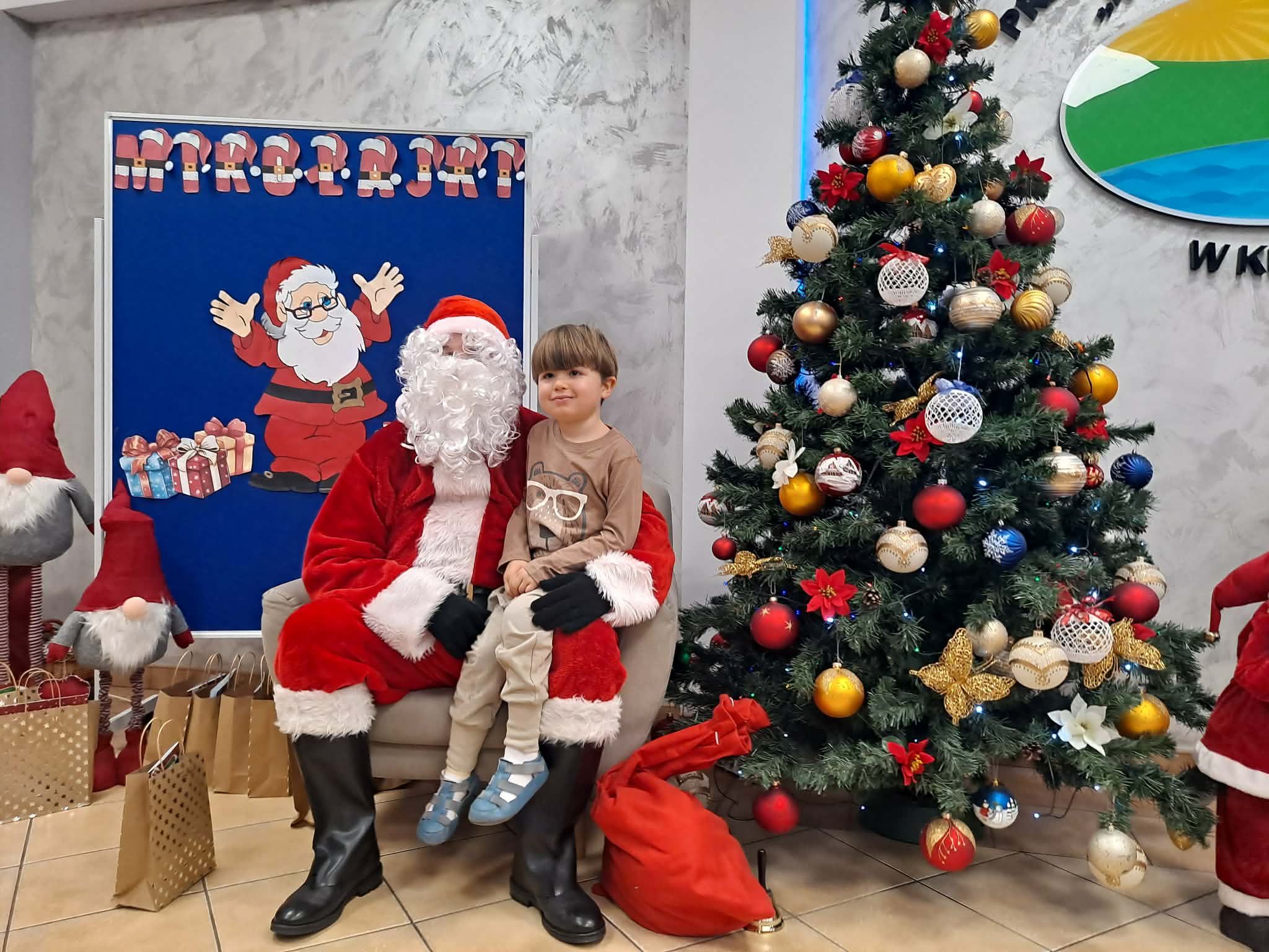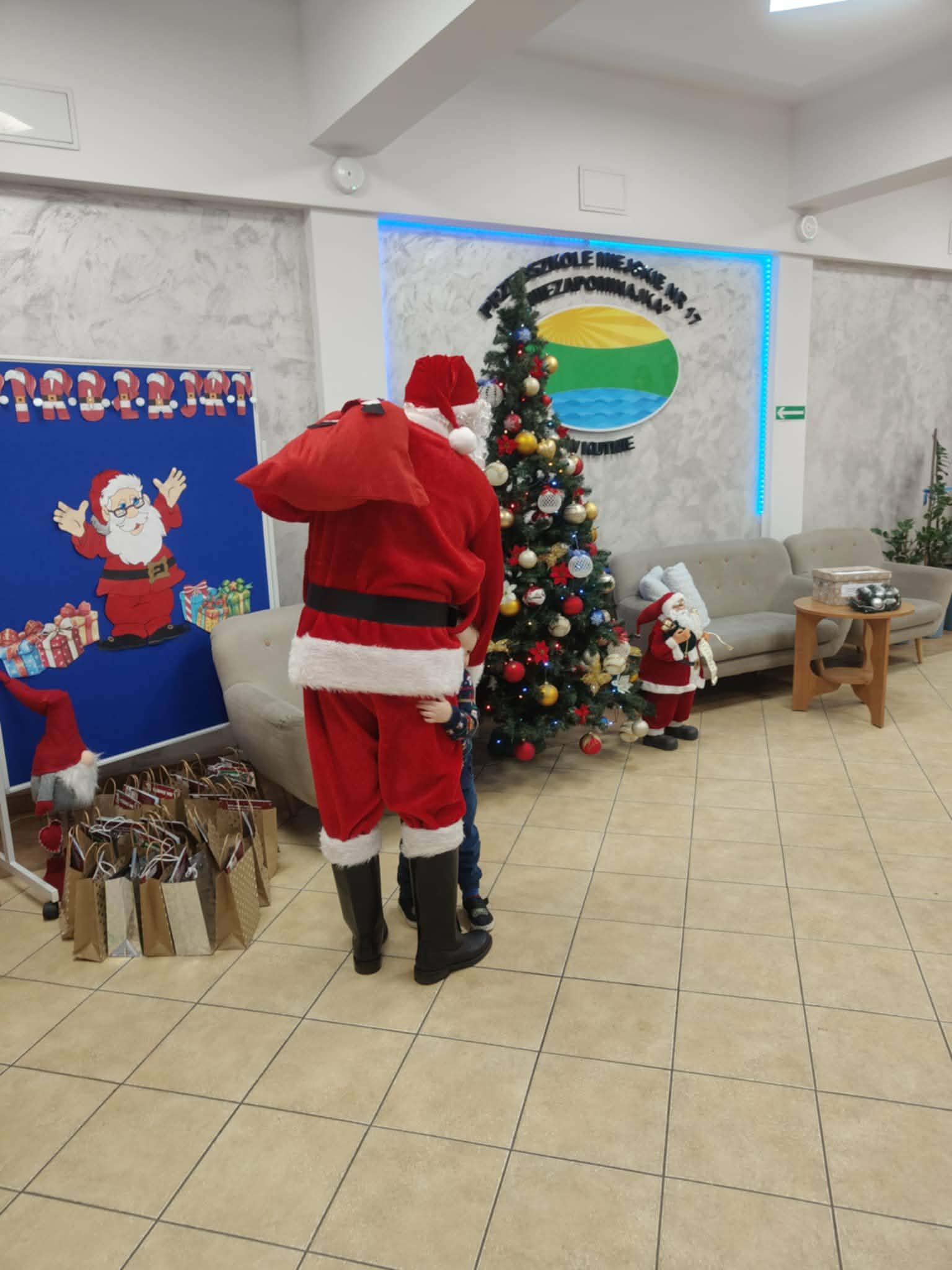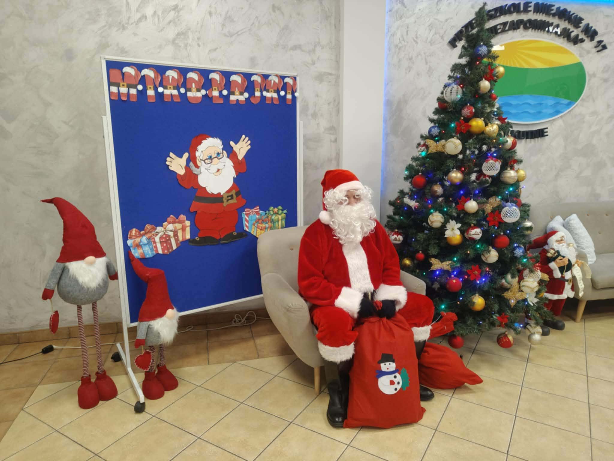 Zasiadł w holu, tuż obok pięknie przystrojonej choinki, gdzie w świątecznej atmosferze czekał na wszystkie przedszkolne grupy. Każde dziecko mogło podejść, serdecznie się przywitać, chwilę porozmawiać z Mikołajem oraz odebrać wyjątkowy prezent. Radość, zaciekawienie i świąteczny nastrój wypełniły cały budynek.