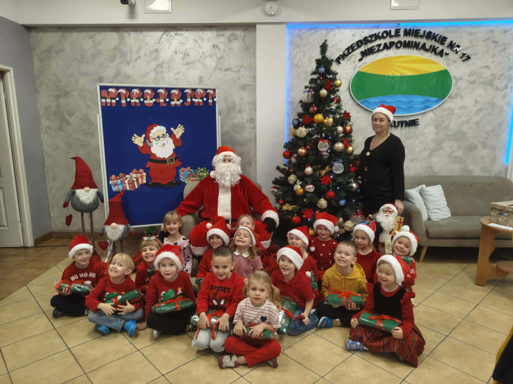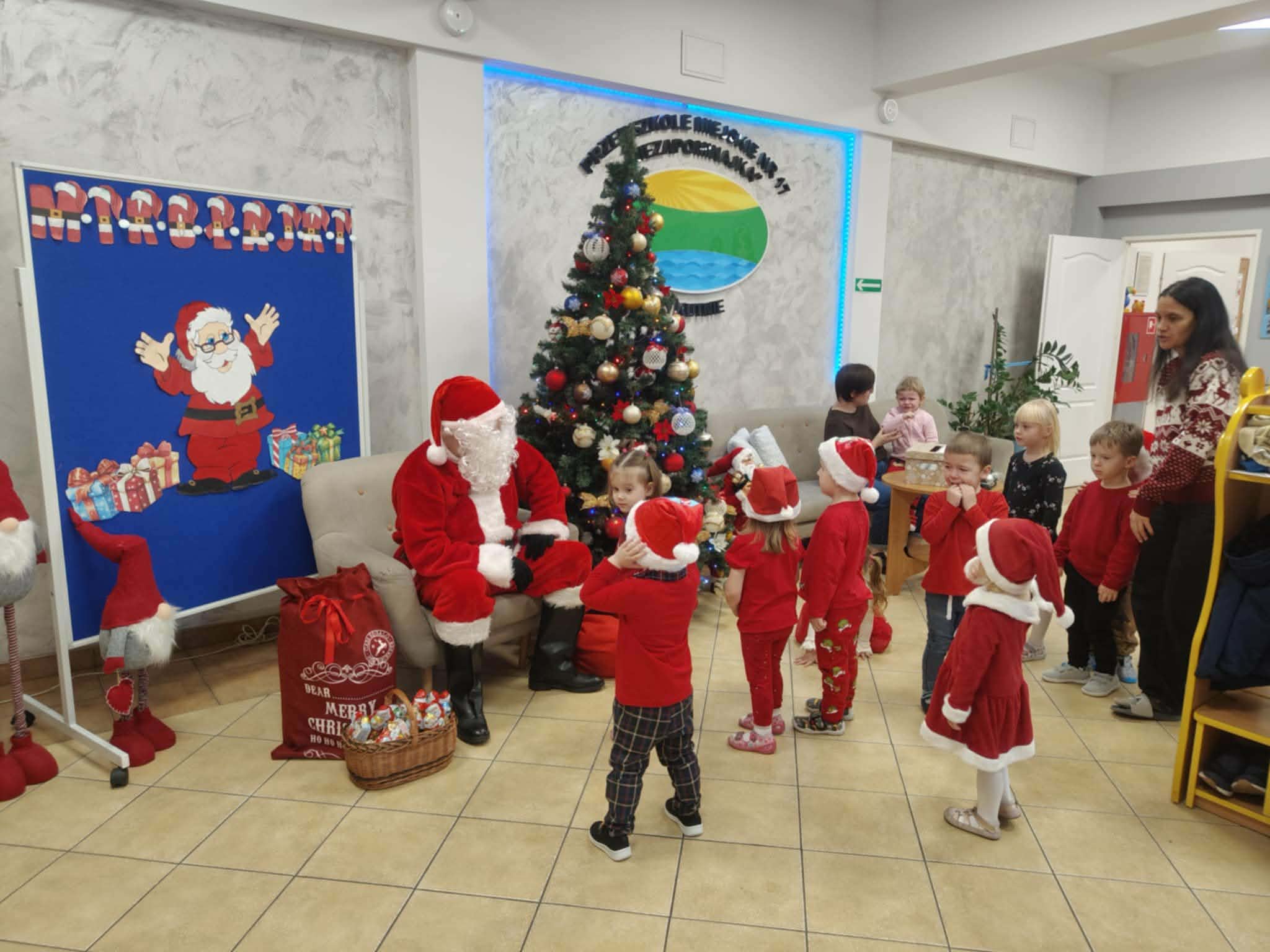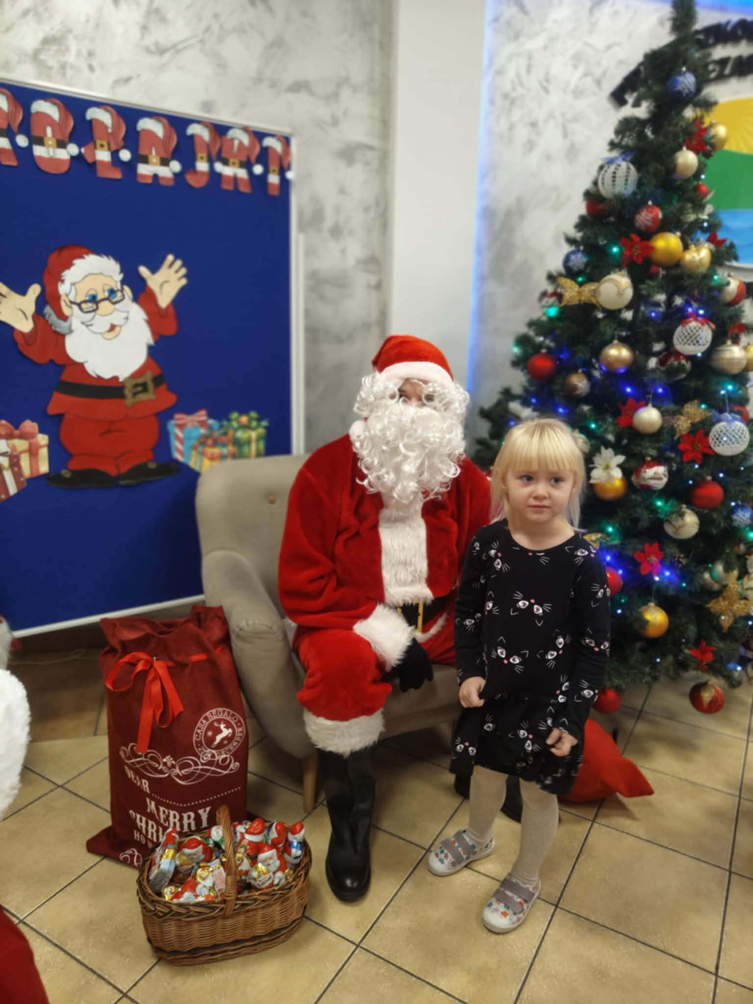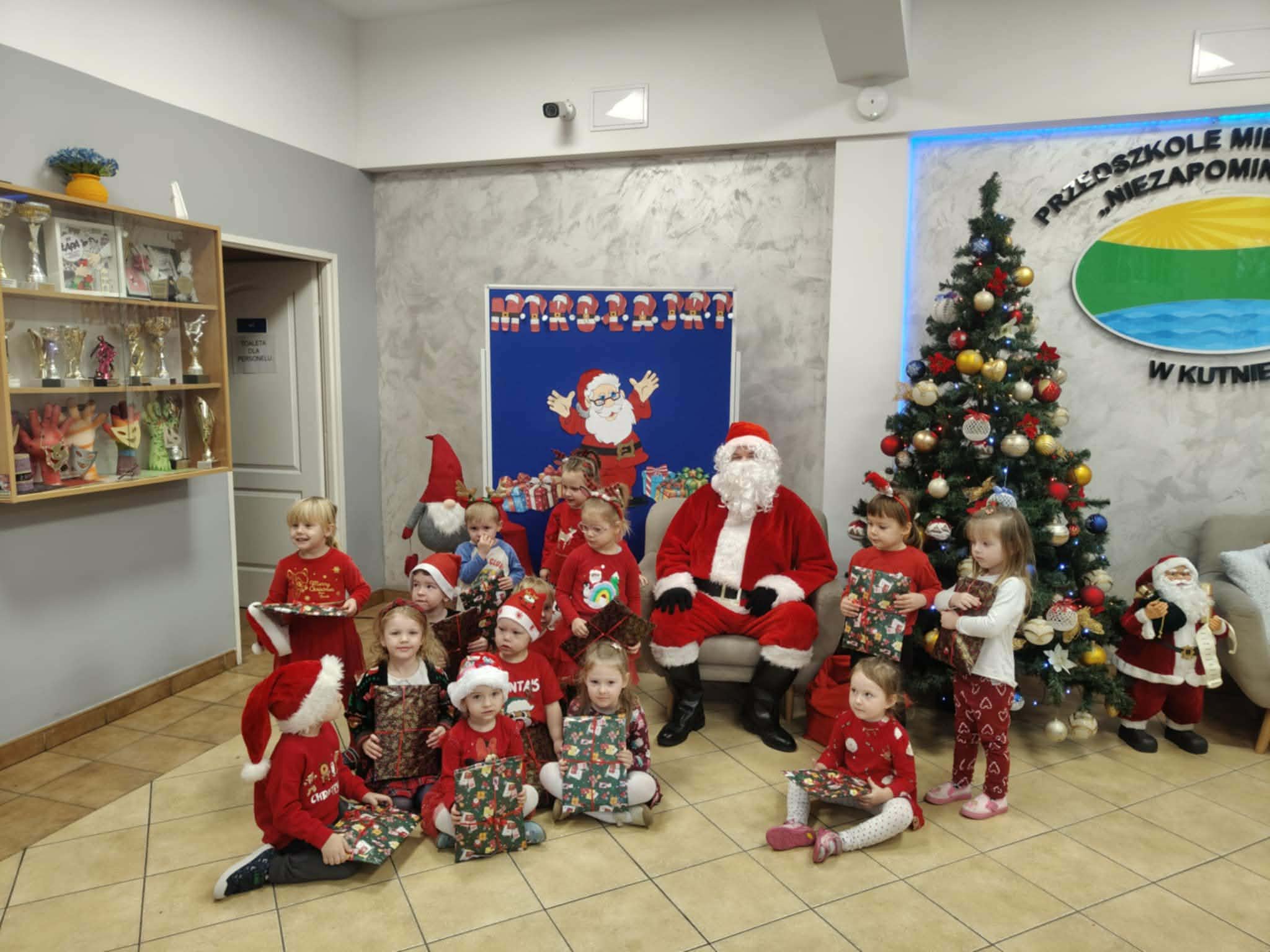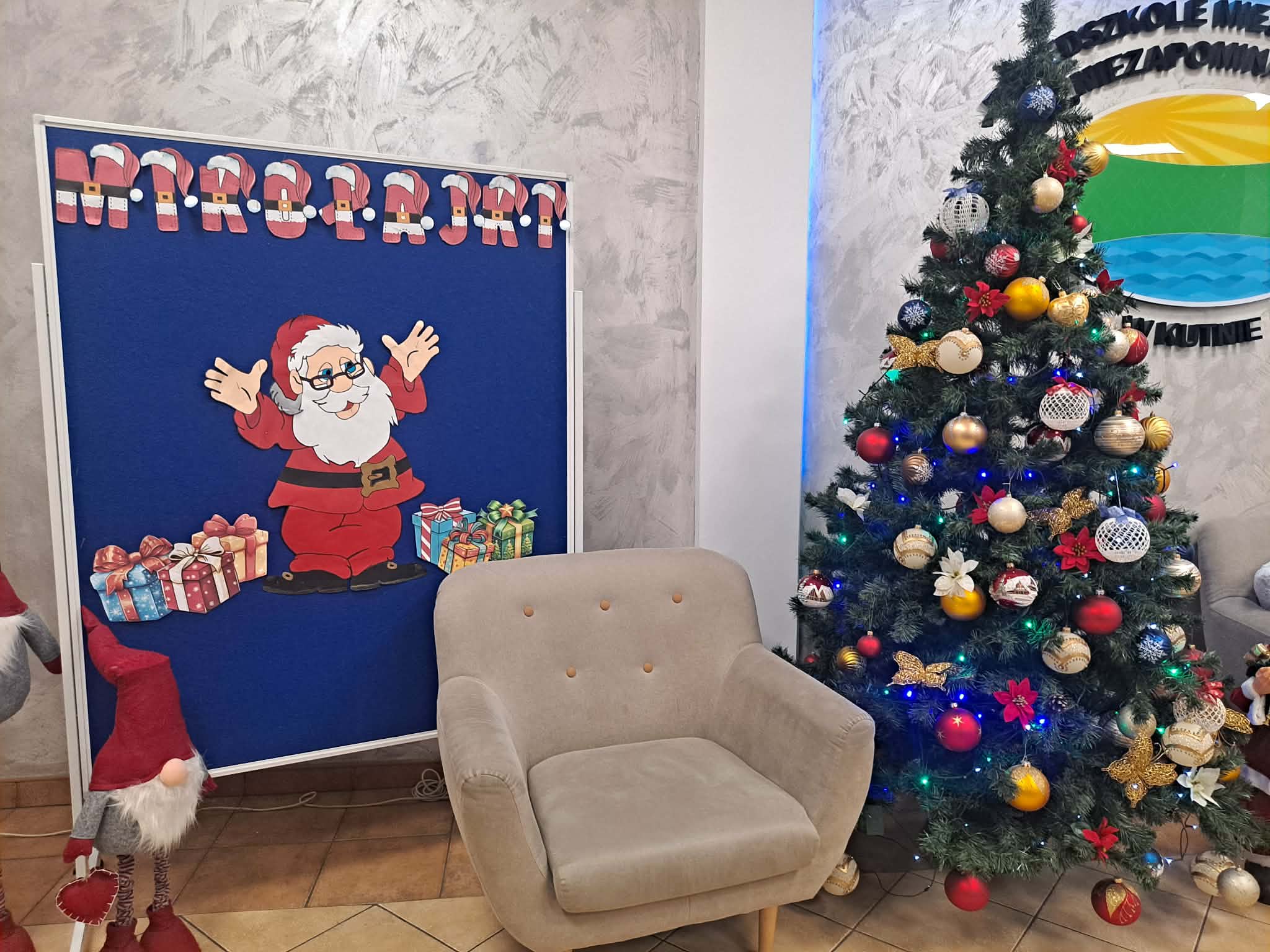 Zasiadł w holu, tuż obok pięknie przystrojonej choinki, gdzie w świątecznej atmosferze czekał na wszystkie przedszkolne grupy. Każde dziecko mogło podejść, serdecznie się przywitać, chwilę porozmawiać z Mikołajem oraz odebrać wyjątkowy prezent. Radość, zaciekawienie i świąteczny nastrój wypełniły cały budynek.