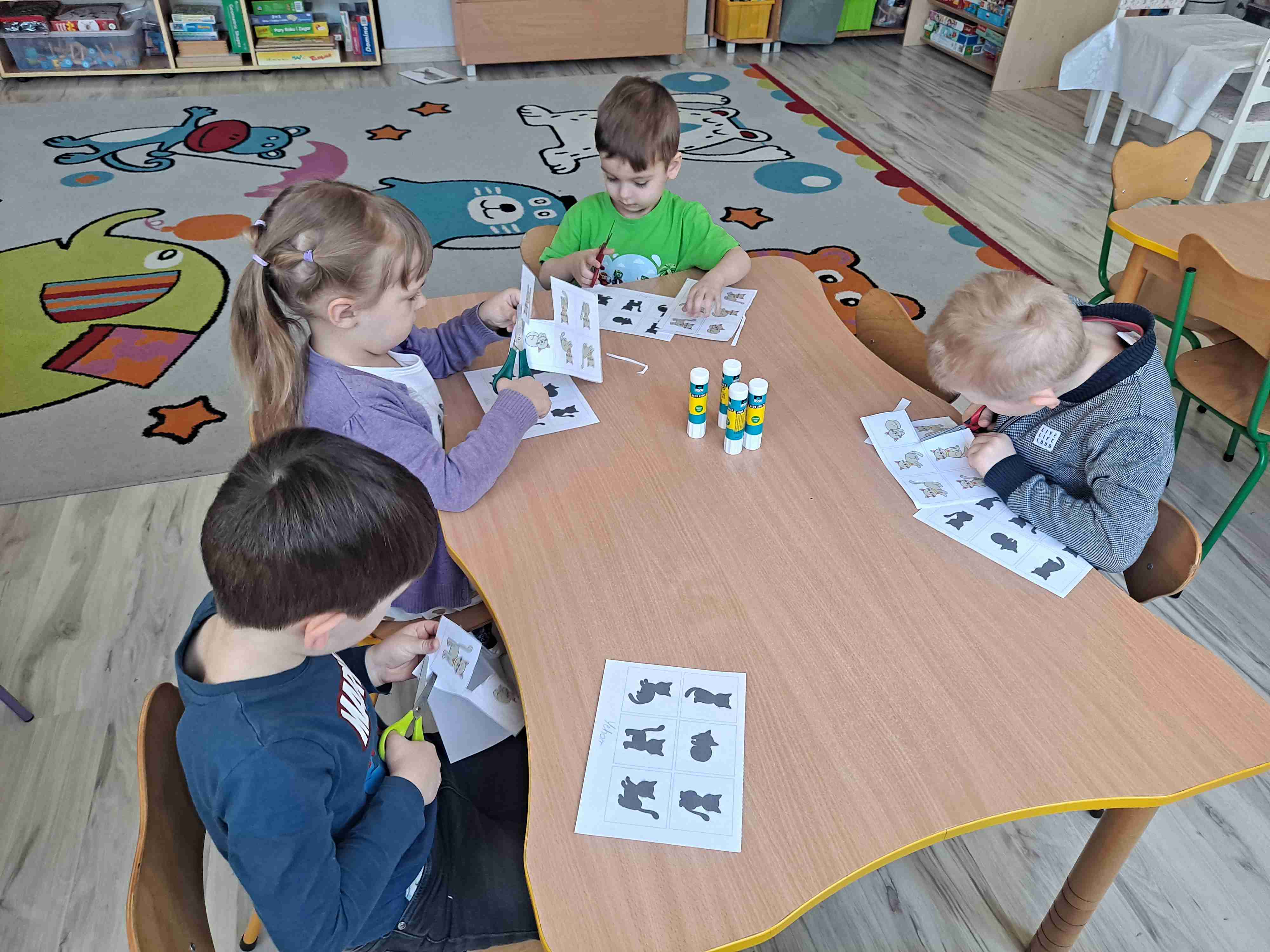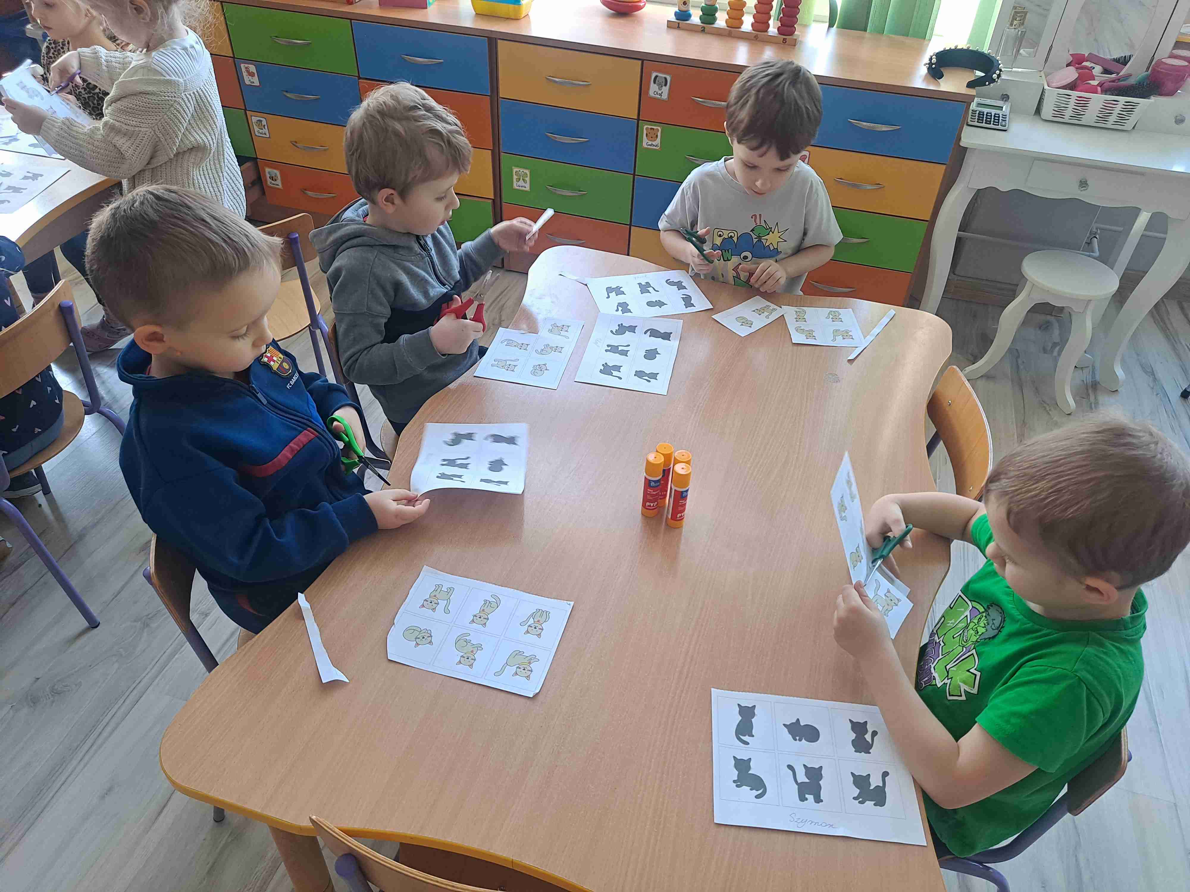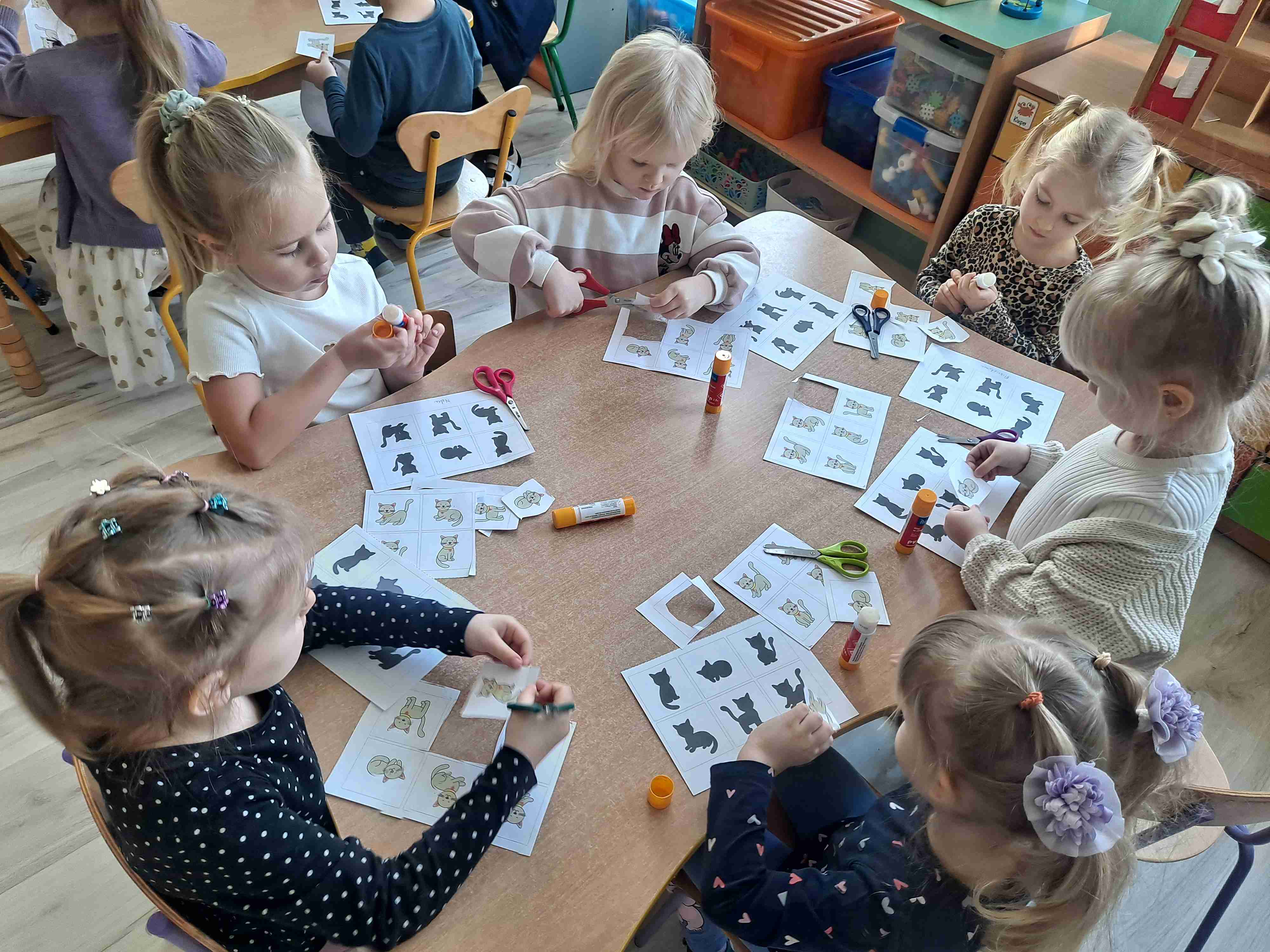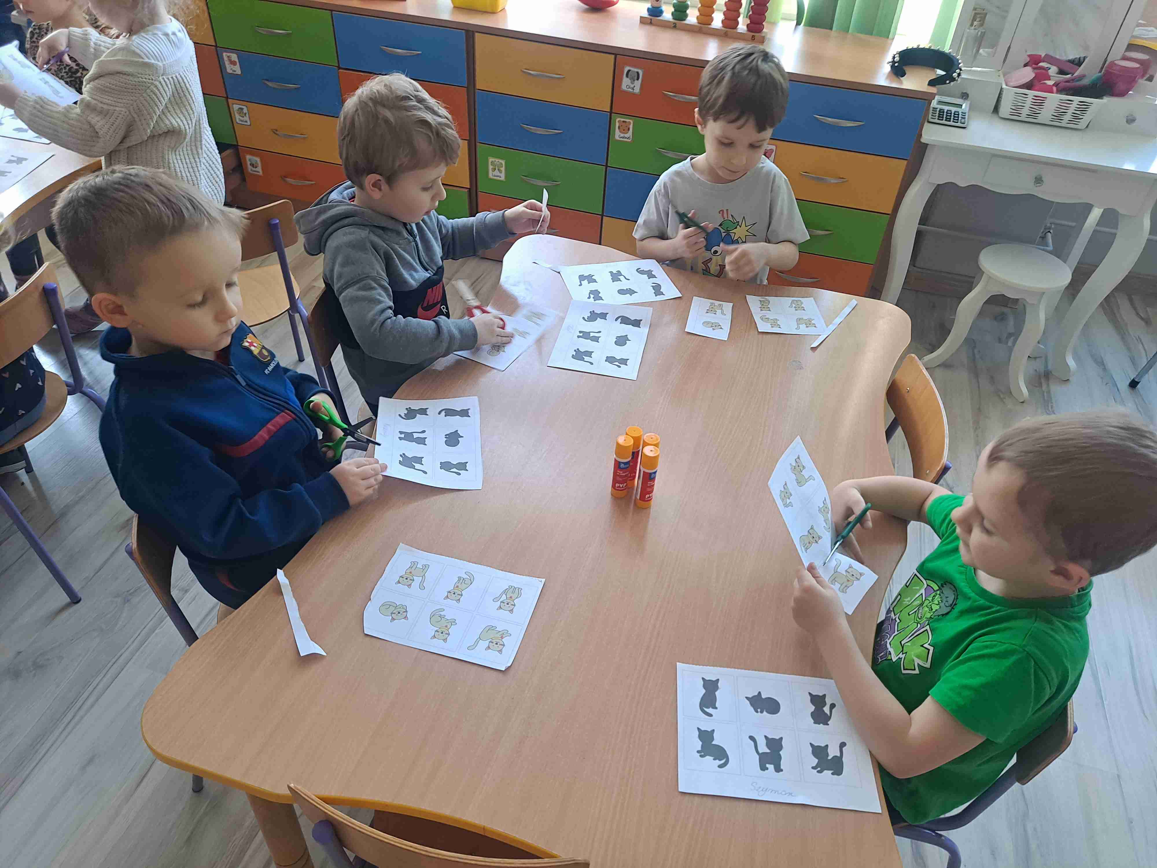 Na zakończenie przedszkolaki wykonały pracę plastyczną polegającą na dopasowaniu kotka do jego cienia. Dzieci bardzo sprawnie i starannie posługiwały się nożyczkami oraz klejem