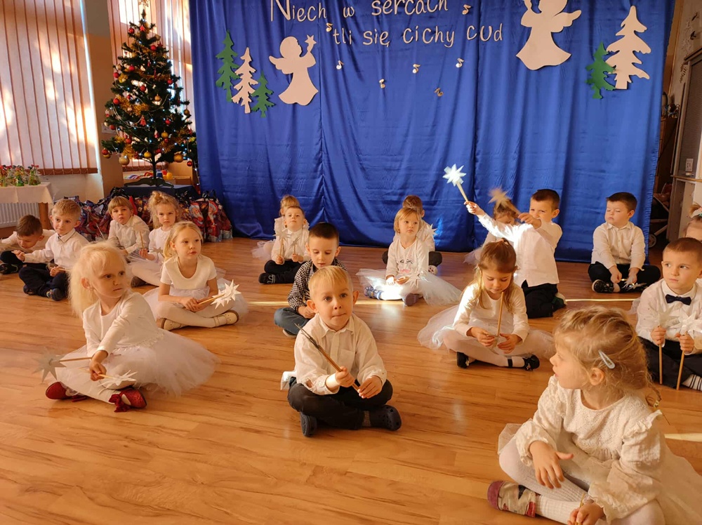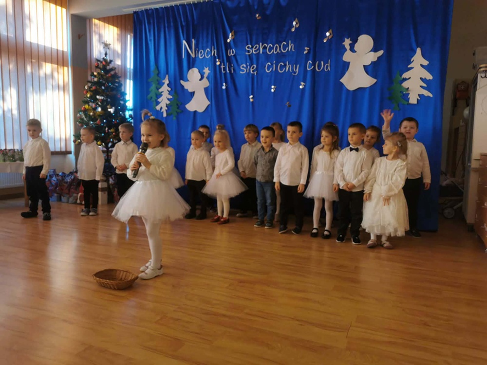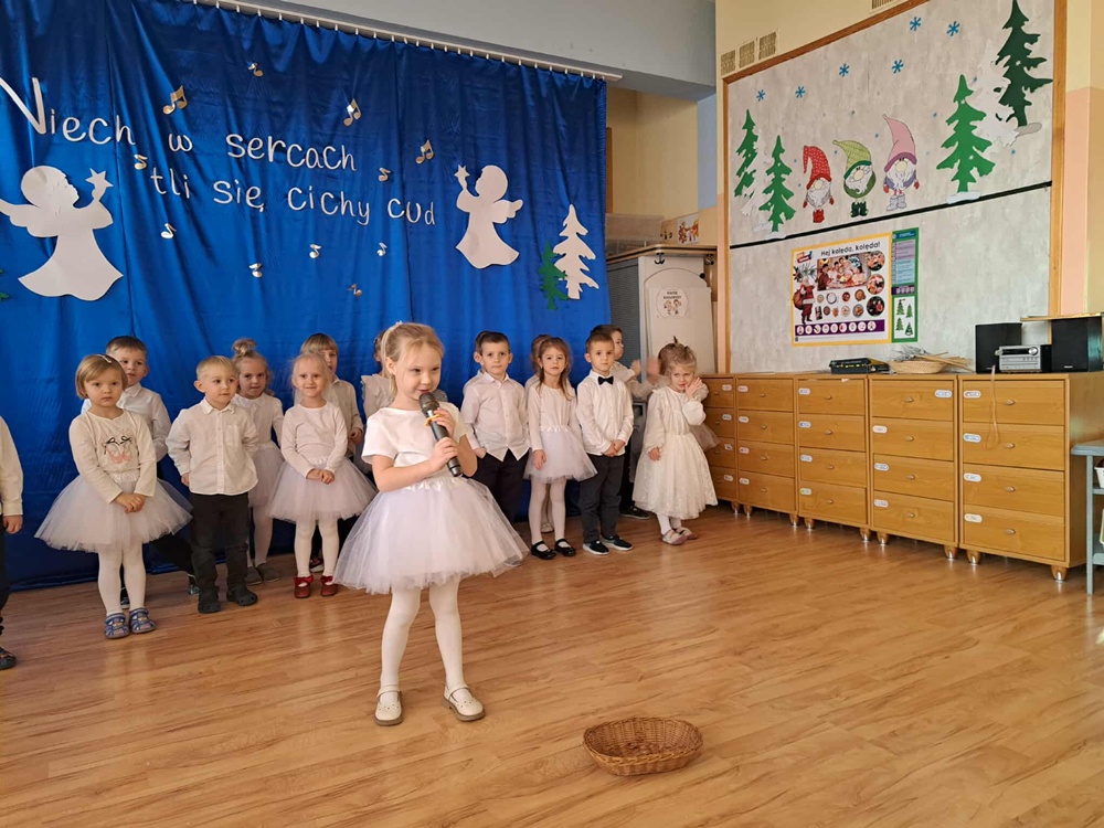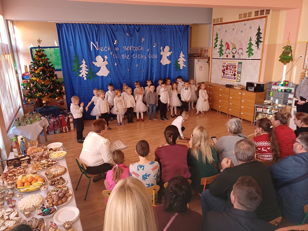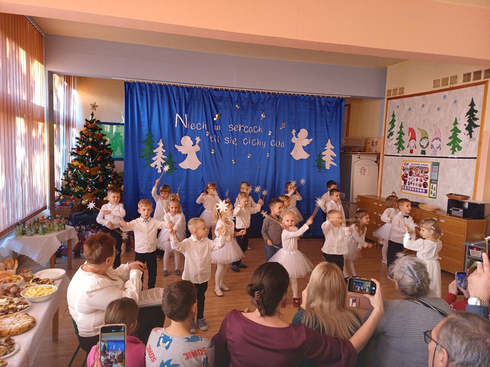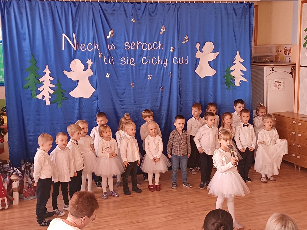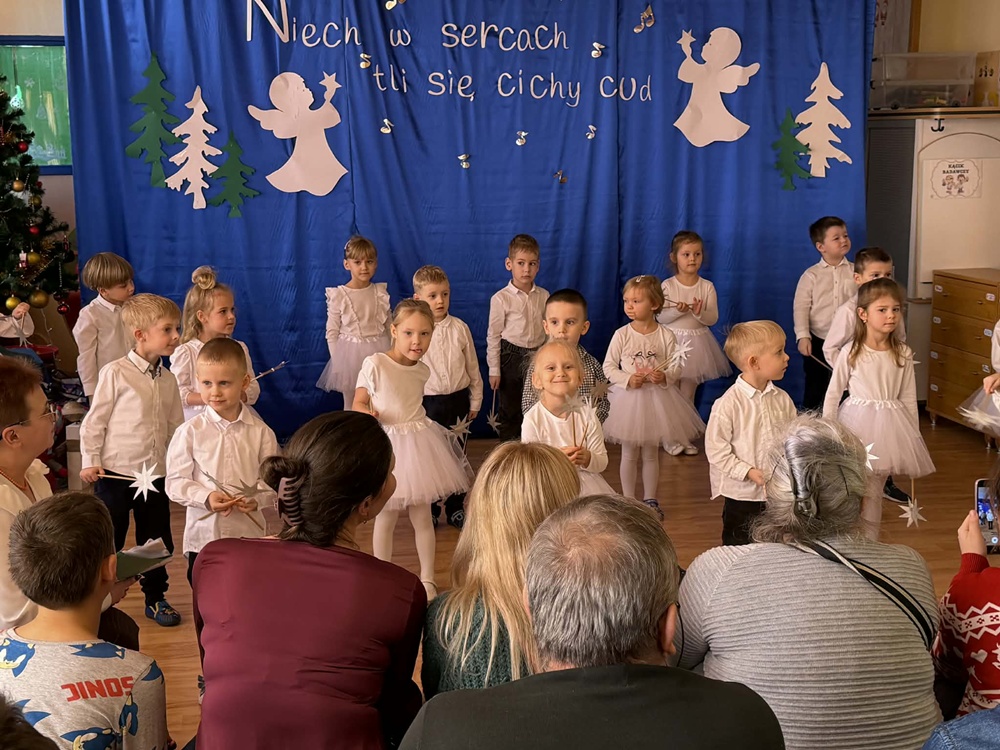 W ciepłej, świątecznej atmosferze mali artyści zaprezentowali przygotowany występ, wprowadzając wszystkich w nastrój radości i wzruszeń. Wspólne kolędowanie, rozmowy oraz chwile spędzone razem przyczyniły się do integracji społeczności przedszkolnej i podkreśliły magię nadchodzących Świąt Bożego Narodzenia. Dziękujemy rodzicom za obecność i wspólnie spędzony czas.