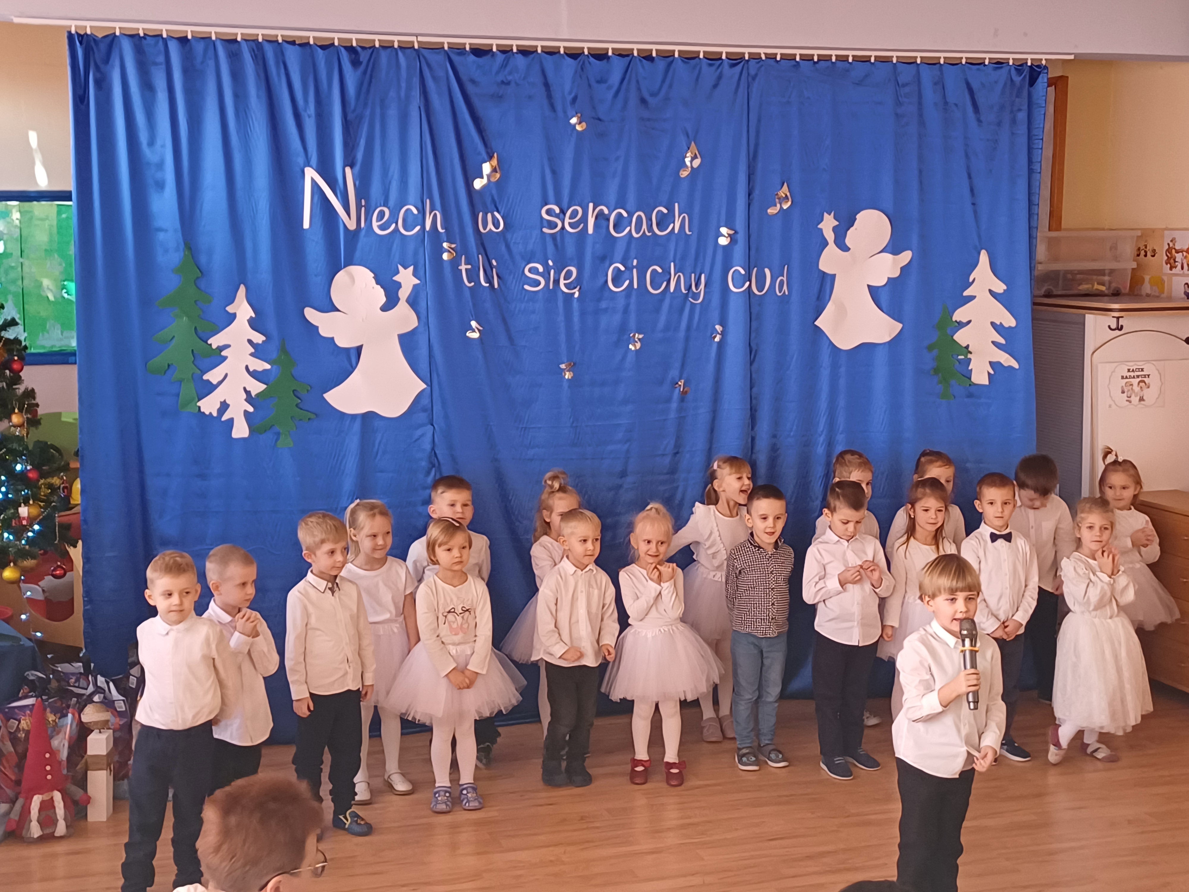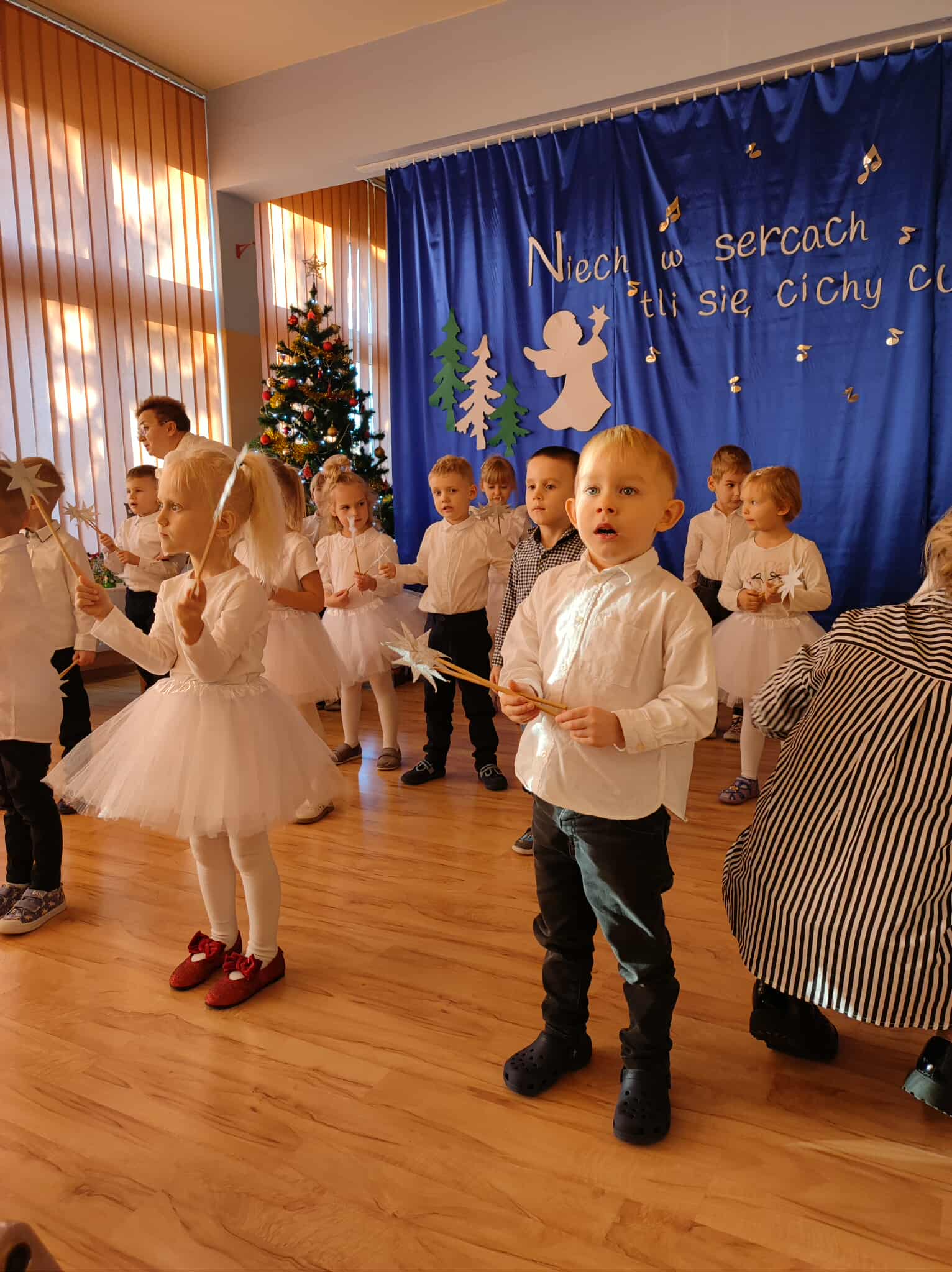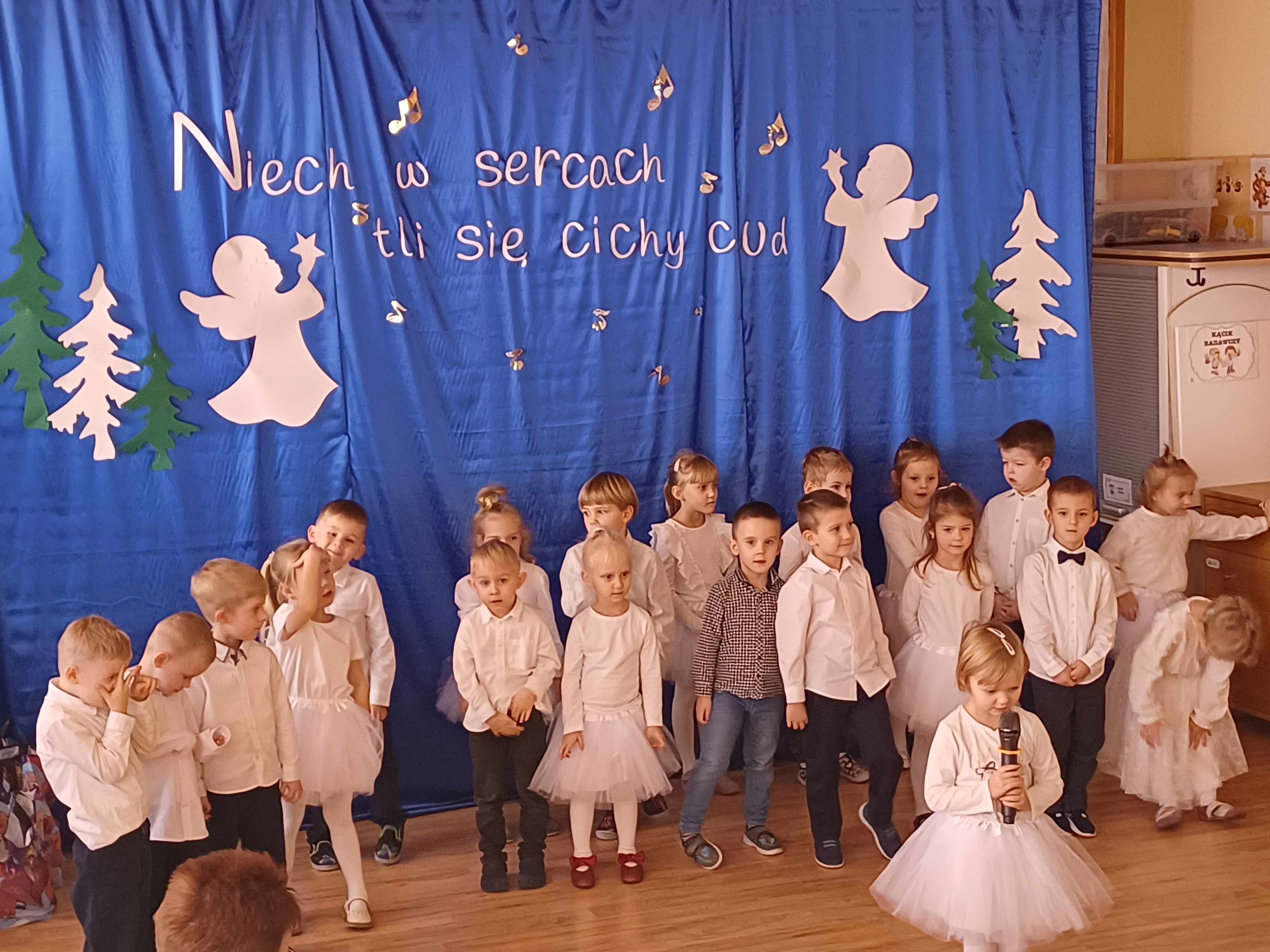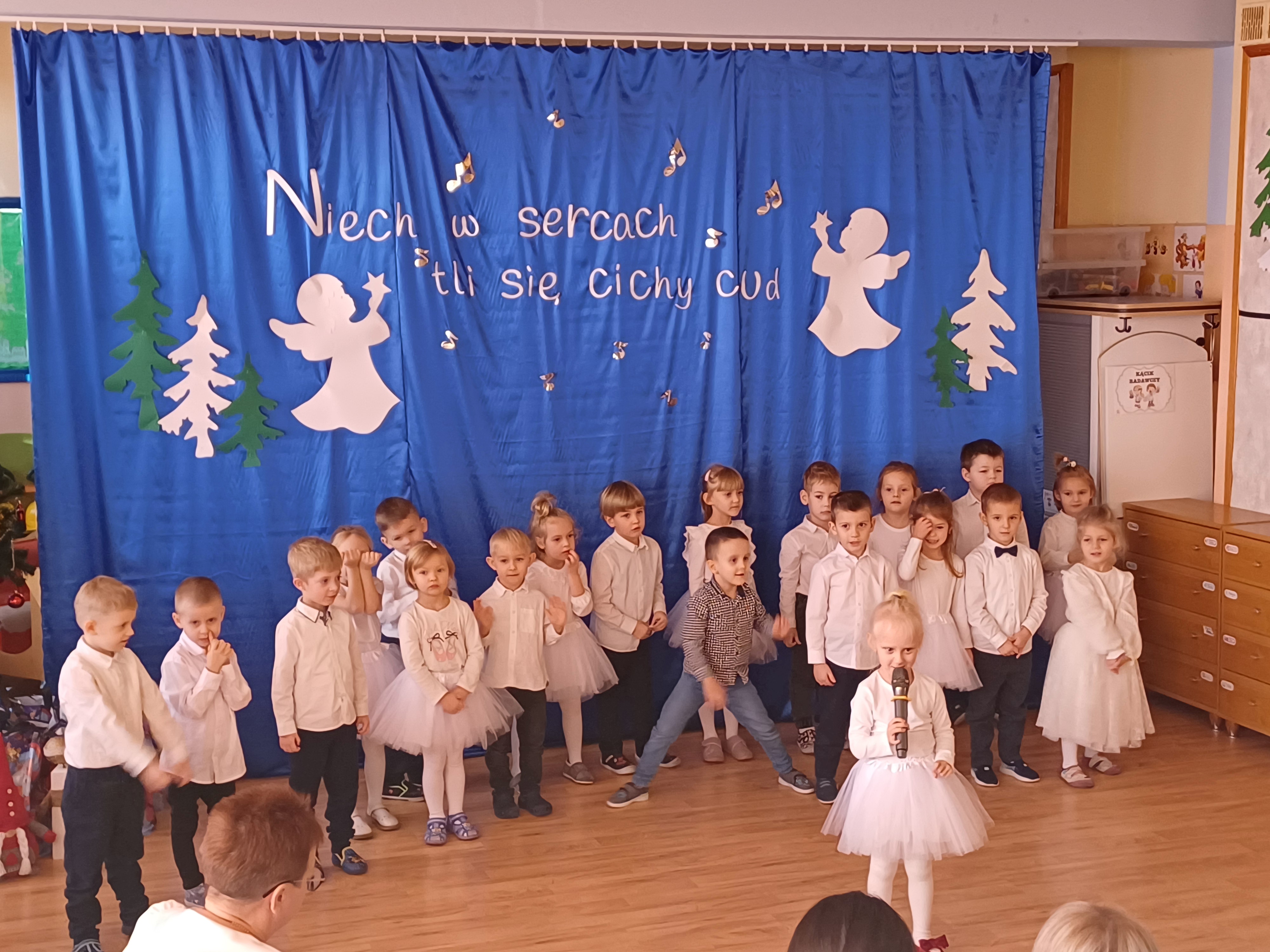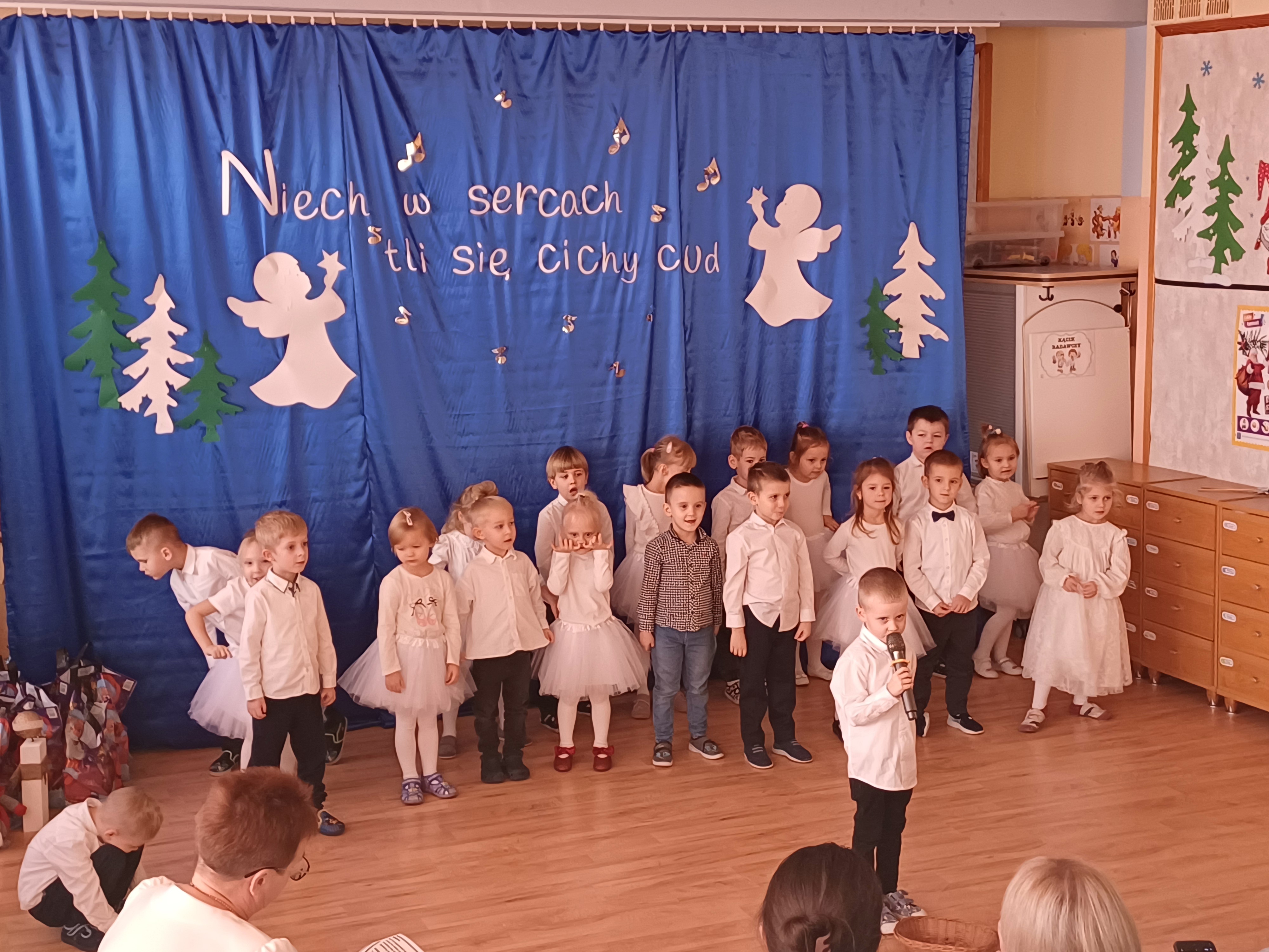 W ciepłej, świątecznej atmosferze mali artyści zaprezentowali przygotowany występ, wprowadzając wszystkich w nastrój radości i wzruszeń. Wspólne kolędowanie, rozmowy oraz chwile spędzone razem przyczyniły się do integracji społeczności przedszkolnej i podkreśliły magię nadchodzących Świąt Bożego Narodzenia. Dziękujemy rodzicom za obecność i wspólnie spędzony czas.
