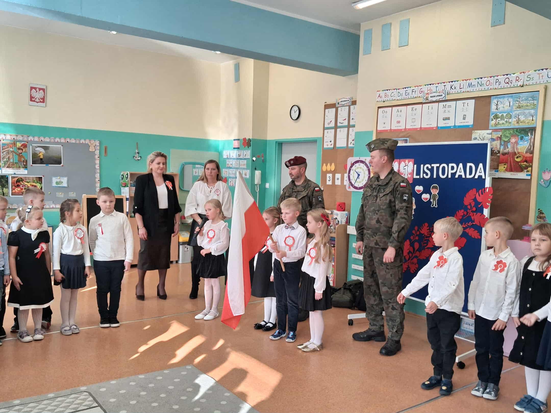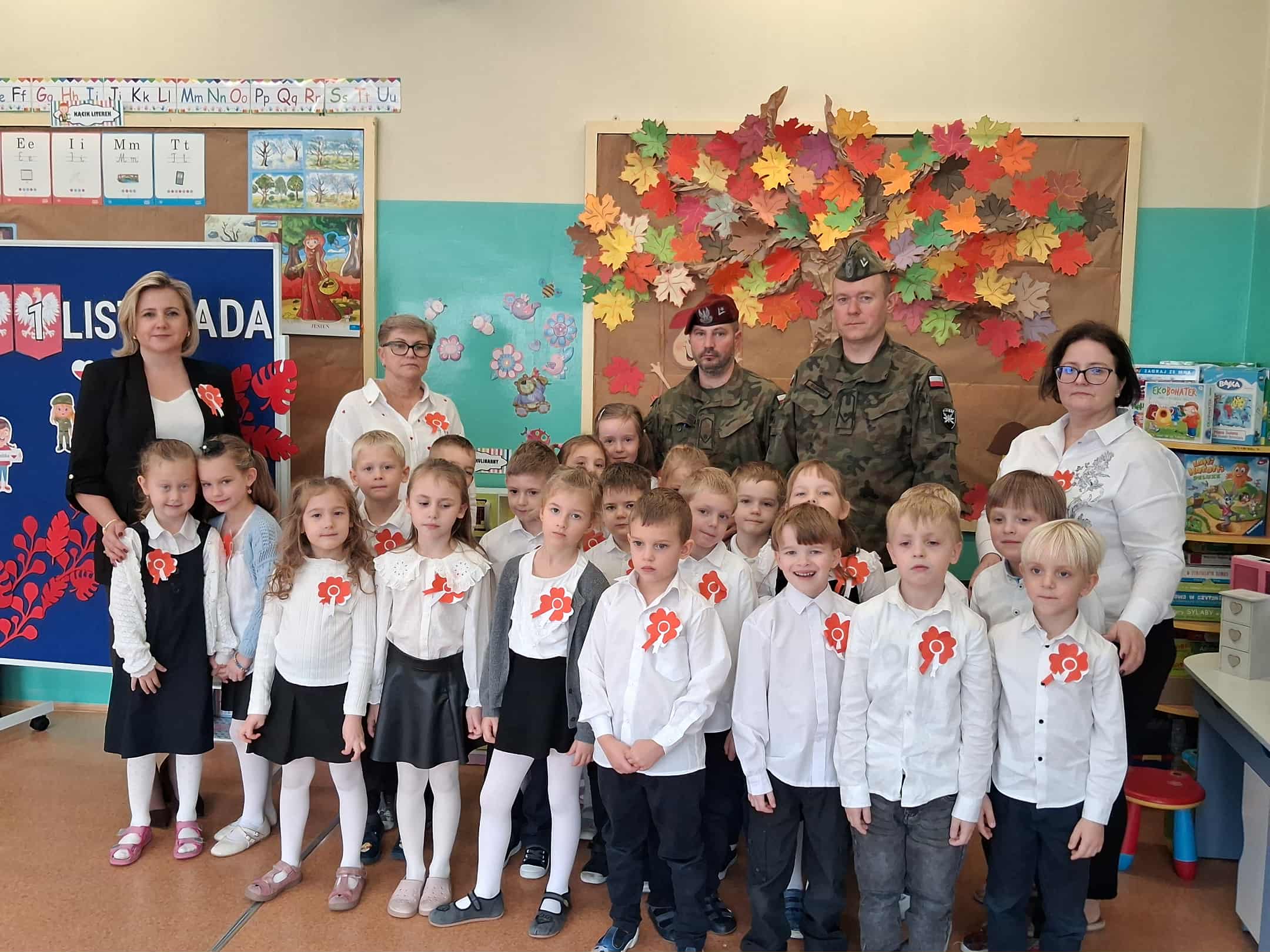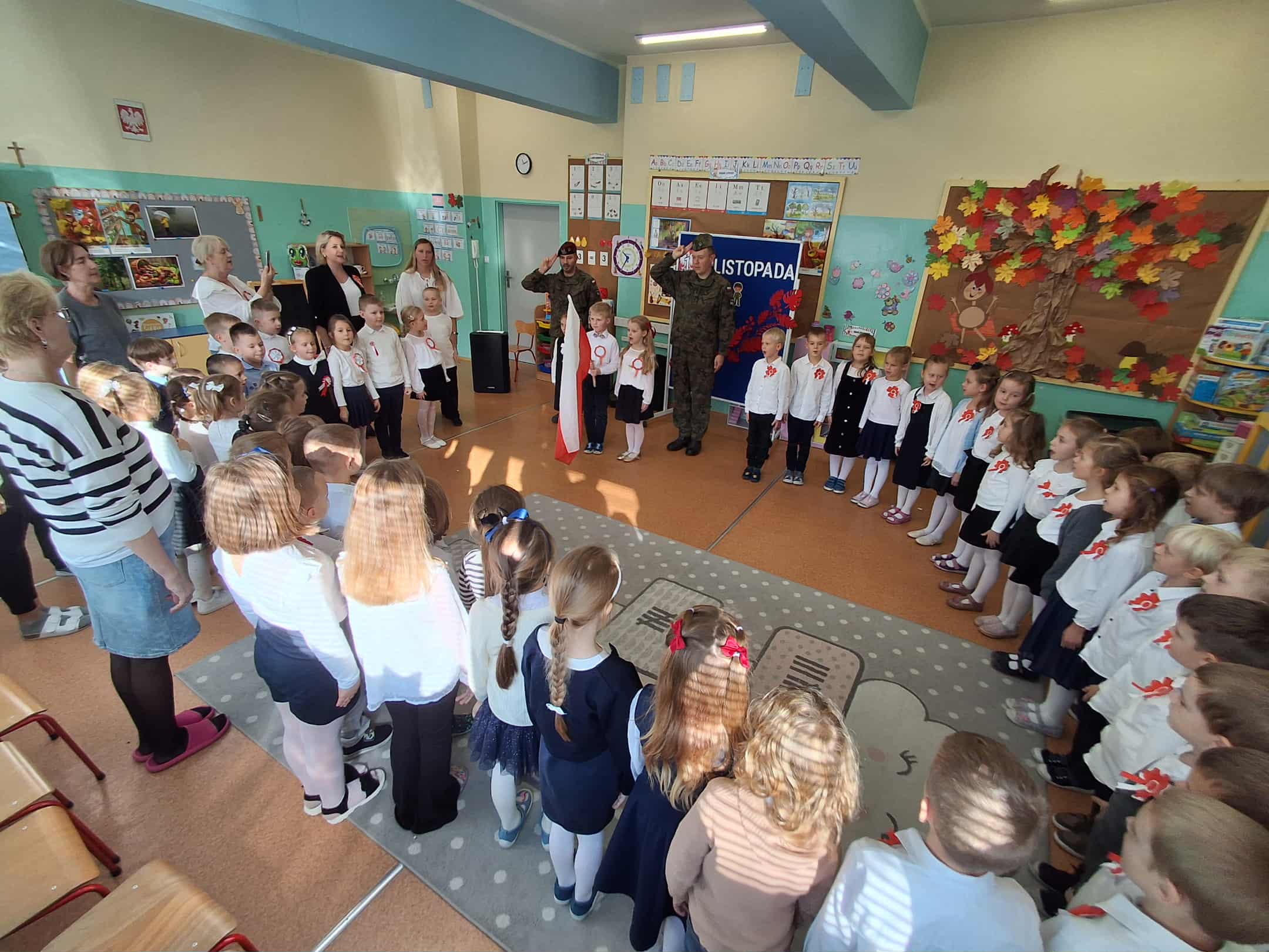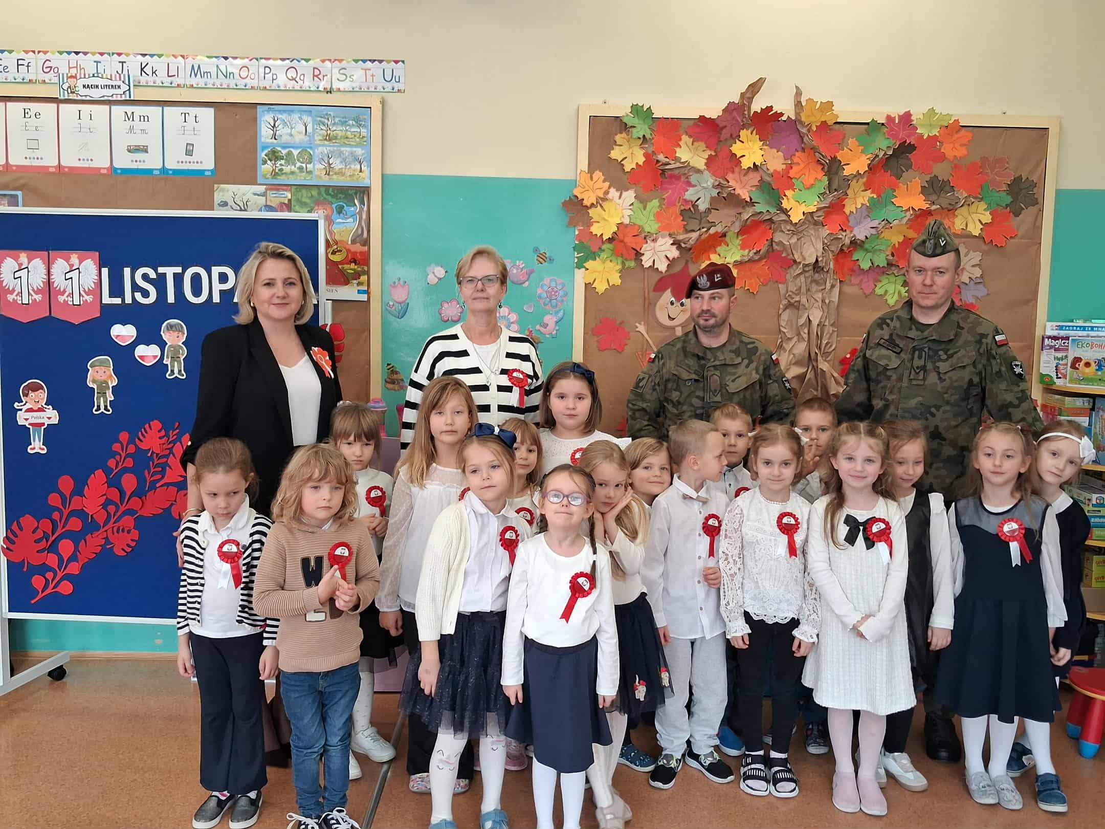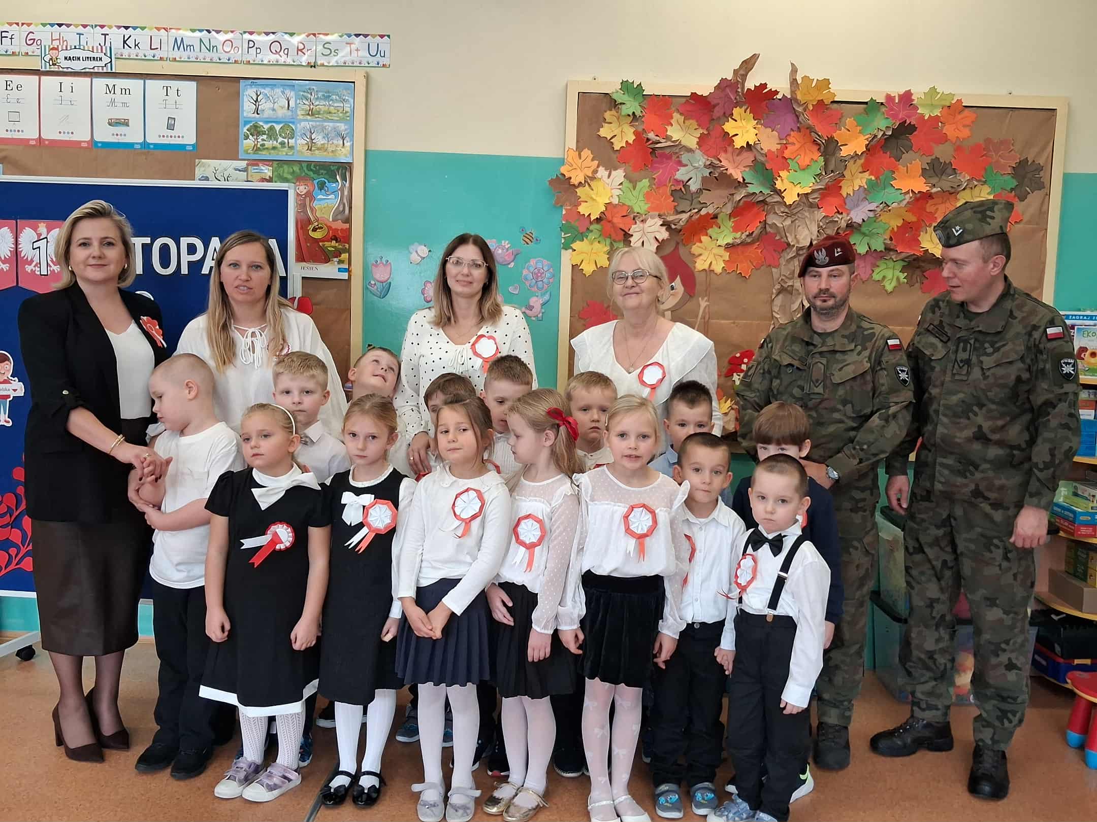 w dniu 7 listopada uroczyście obchodziliśmy Święto Niepodległości. Dzieci z oddziałów najstarszych naszego przedszkola podkreśliły powagę i uroczysty charakter tego dnia odświętnym, galowym strojem i biało - czerwonym kotylionem. Grupa "Rumianki" pod kierunkiem p. Elżbiety Janeckiej, p. Izabeli Maj i p. Anny Stańczyk przedstawiła montaż słowno - muzyczny o tematyce patriotycznej. Tego dnia odwiedzili nas również wyjątkowi goście - żołnierze, którzy zaprezentowali dzieciom sprzęt wojskowy, a także opowiedzieli o swojej pracy i służbie państwu. O godzinie 11.11 całą społecznością przedszkolną odśpiewaliśmy hymn Polski - Mazurek Dąbrowskiego włączając się tym samym w akcję MEN - "Szkoła do hymnu". Dzień ten był z pewnością piękną lekcją patriotyzmu i miłości do Ojczyzny.