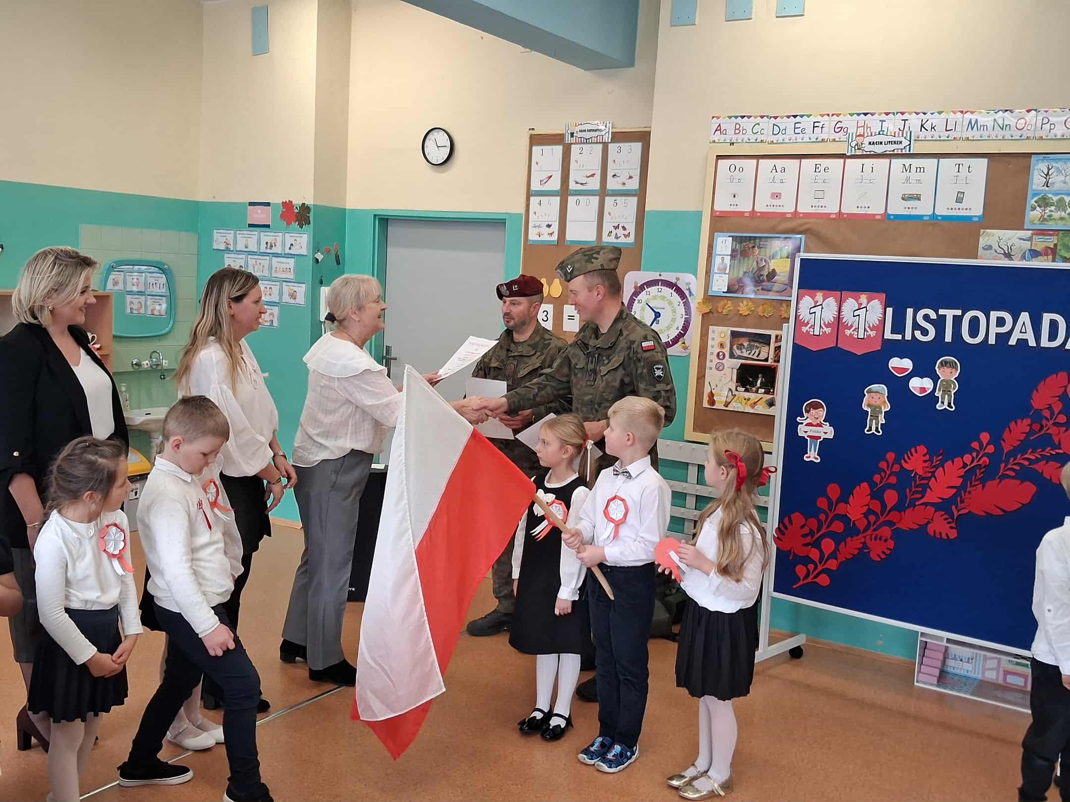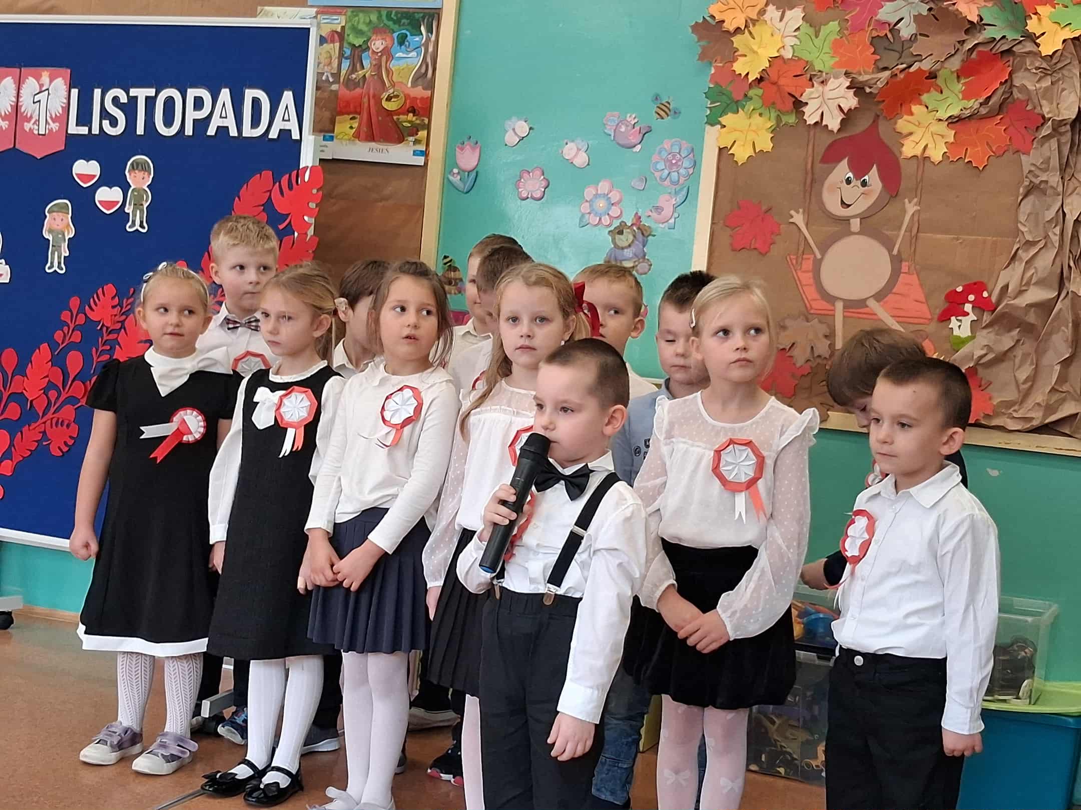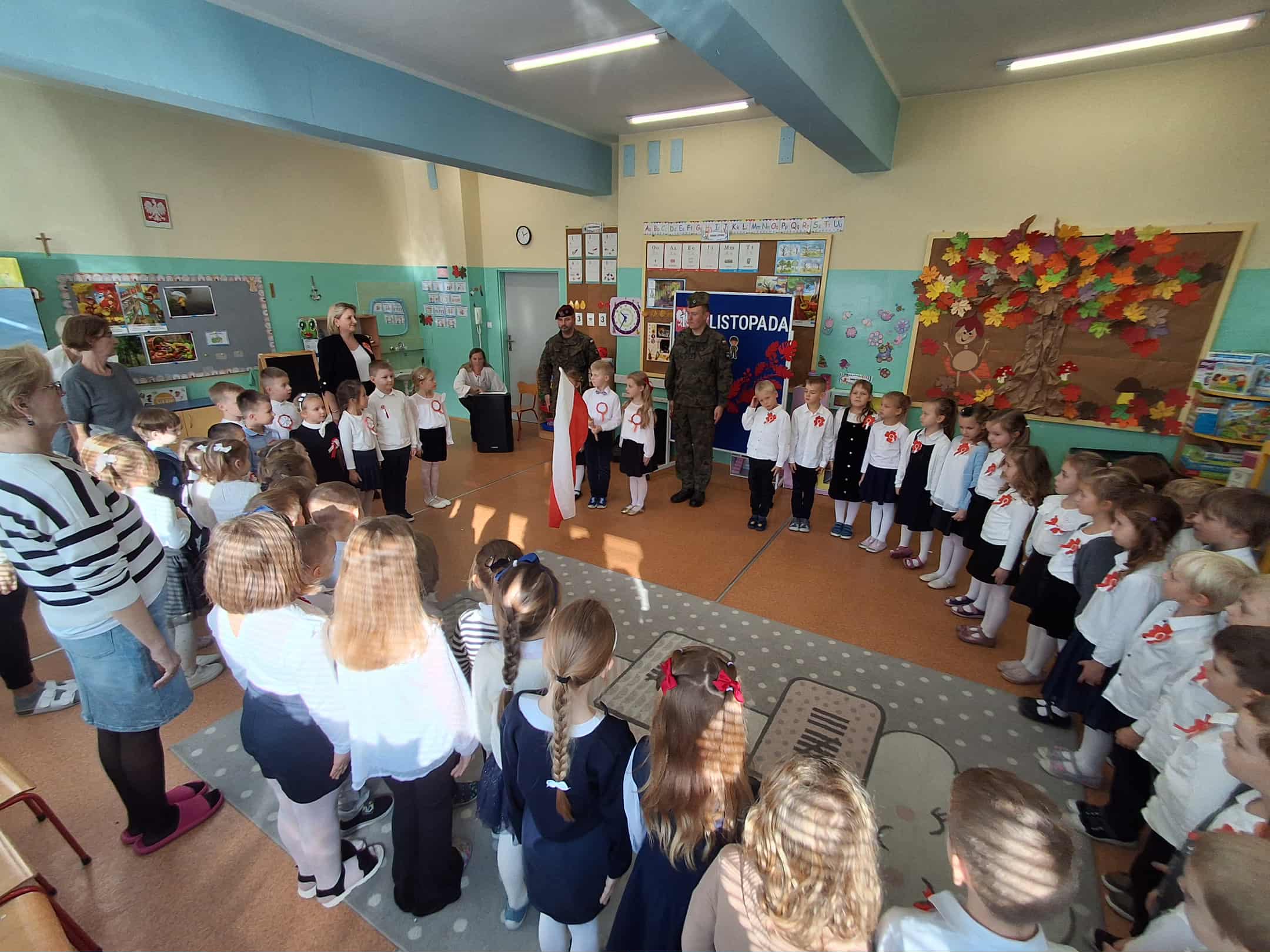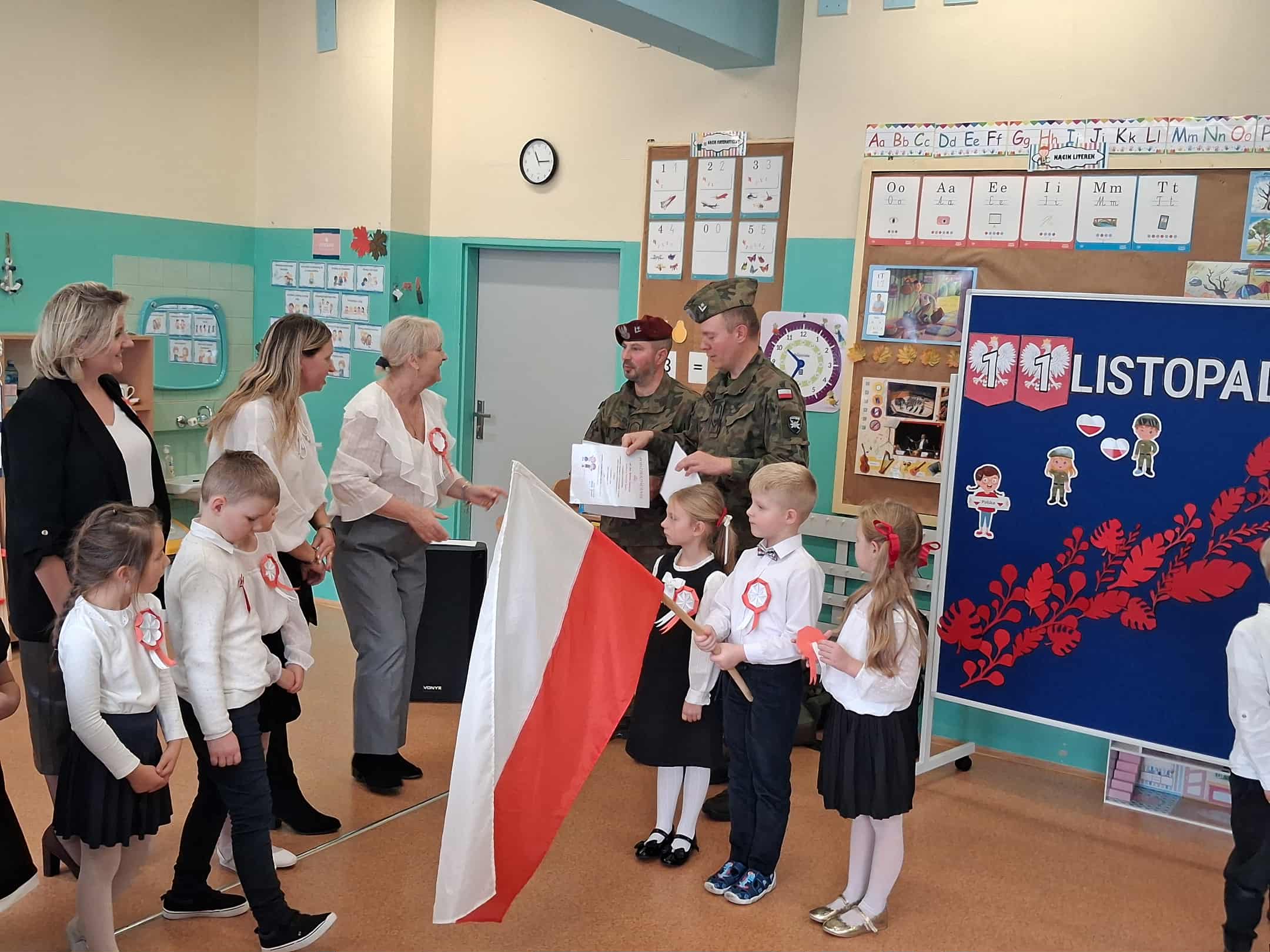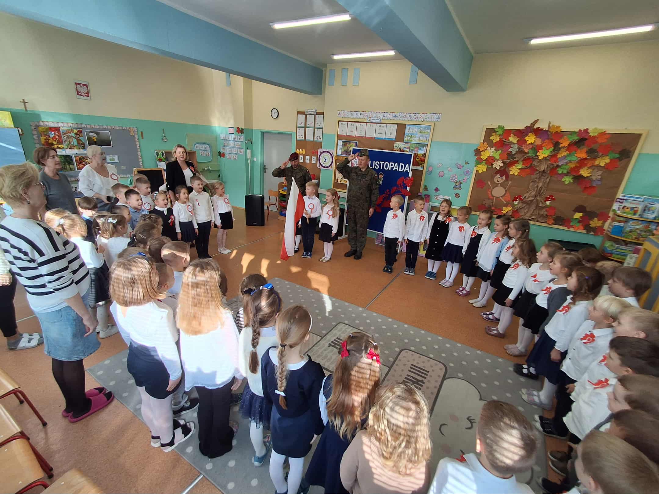 w dniu 7 listopada uroczyście obchodziliśmy Święto Niepodległości. Dzieci z oddziałów najstarszych naszego przedszkola podkreśliły powagę i uroczysty charakter tego dnia odświętnym, galowym strojem i biało - czerwonym kotylionem. Grupa "Rumianki" pod kierunkiem p. Elżbiety Janeckiej, p. Izabeli Maj i p. Anny Stańczyk przedstawiła montaż słowno - muzyczny o tematyce patriotycznej. Tego dnia odwiedzili nas również wyjątkowi goście - żołnierze, którzy zaprezentowali dzieciom sprzęt wojskowy, a także opowiedzieli o swojej pracy i służbie państwu. O godzinie 11.11 całą społecznością przedszkolną odśpiewaliśmy hymn Polski - Mazurek Dąbrowskiego włączając się tym samym w akcję MEN - "Szkoła do hymnu". Dzień ten był z pewnością piękną lekcją patriotyzmu i miłości do Ojczyzny.