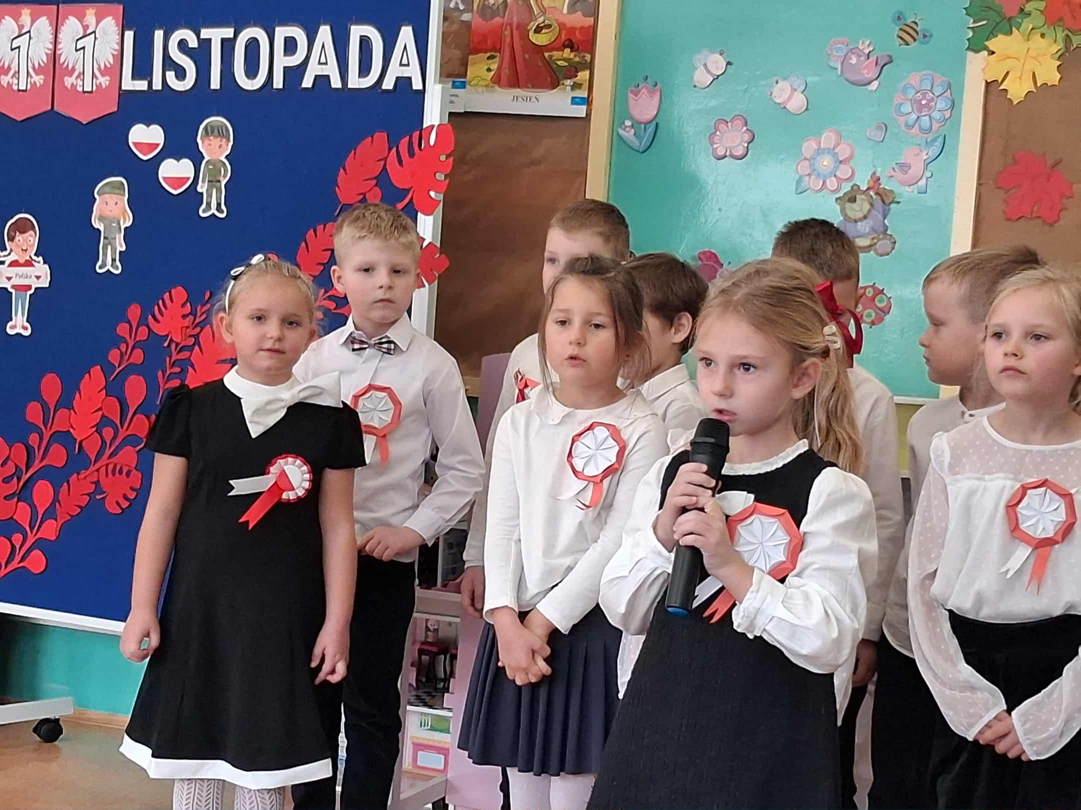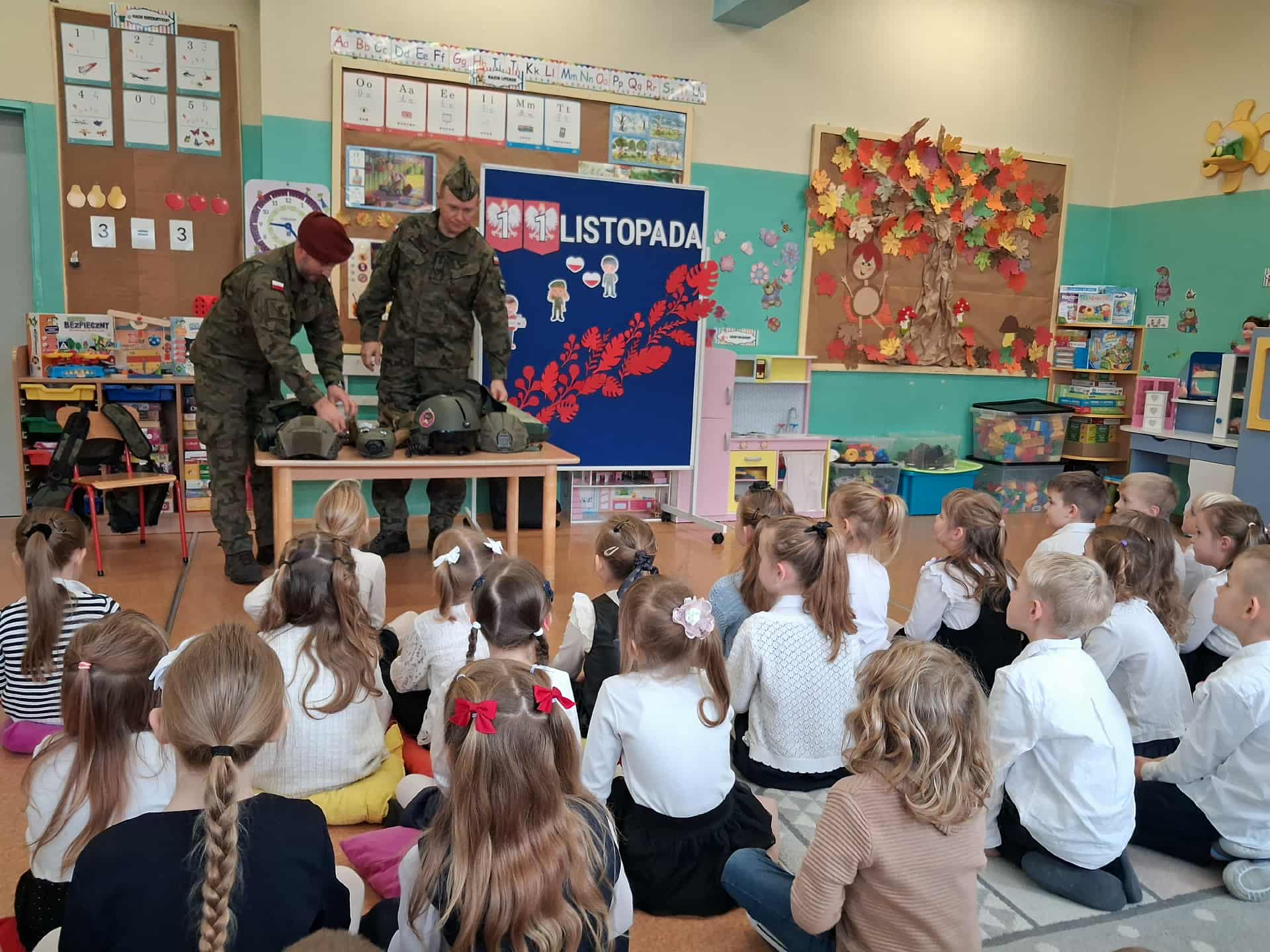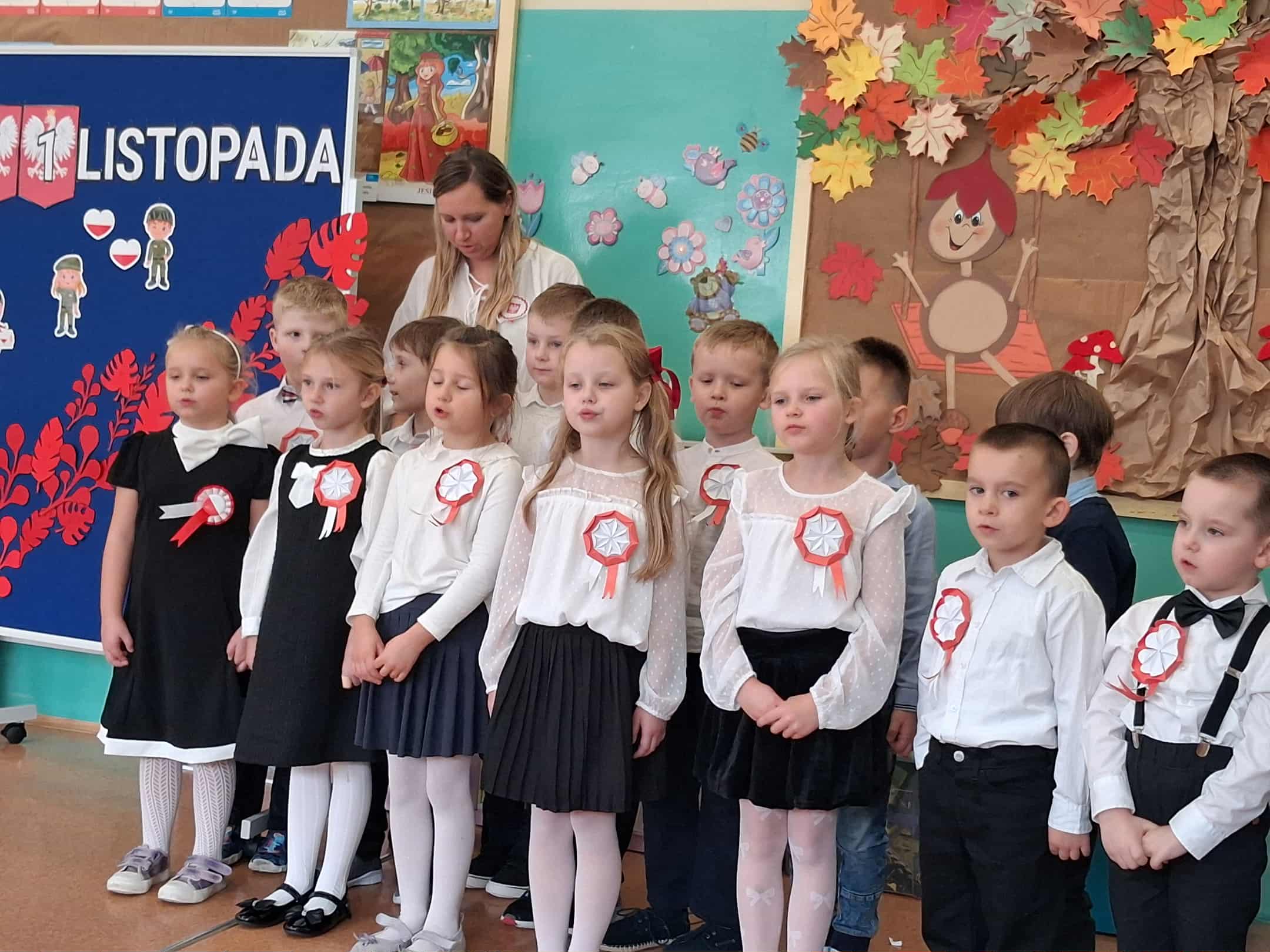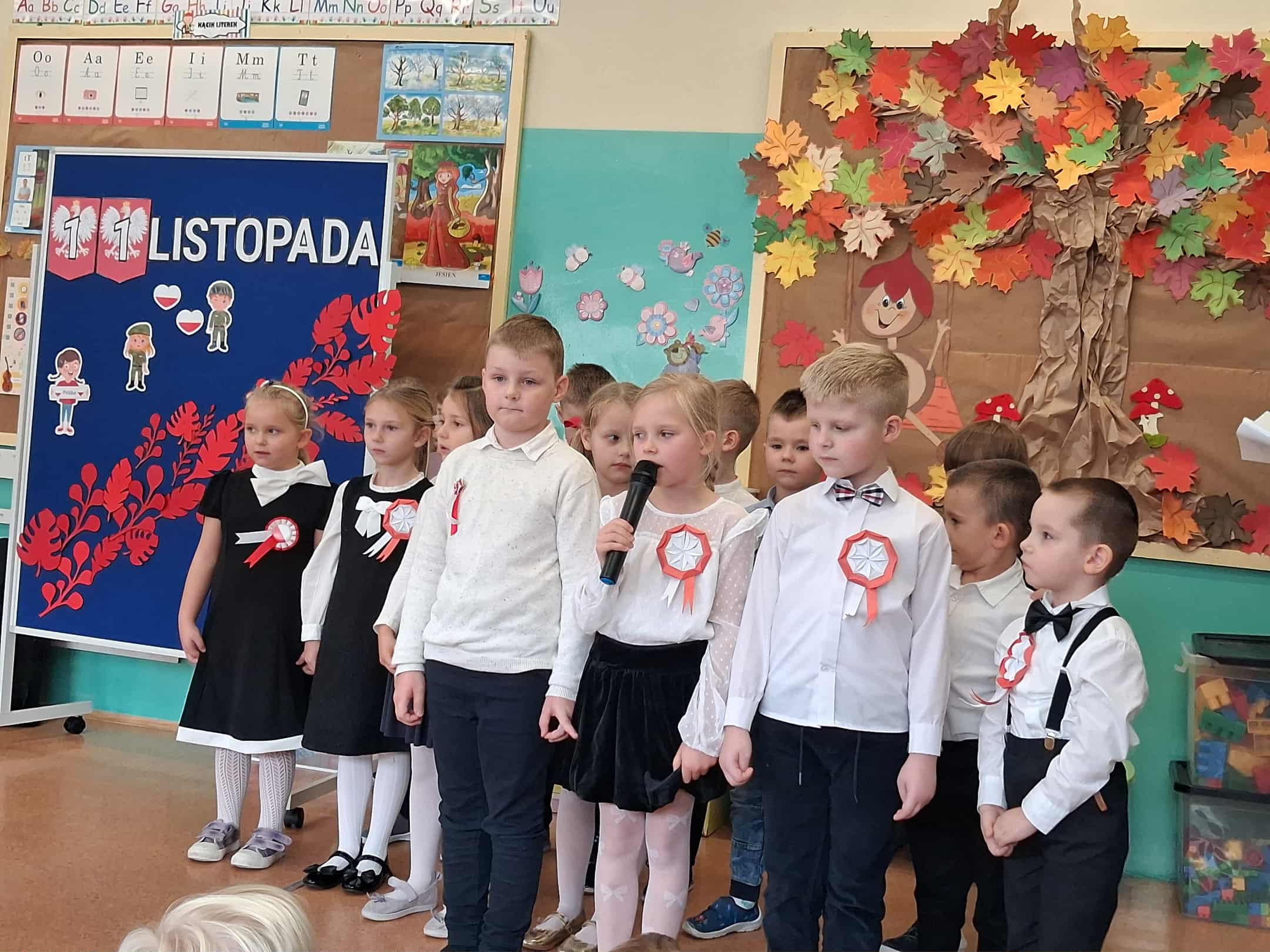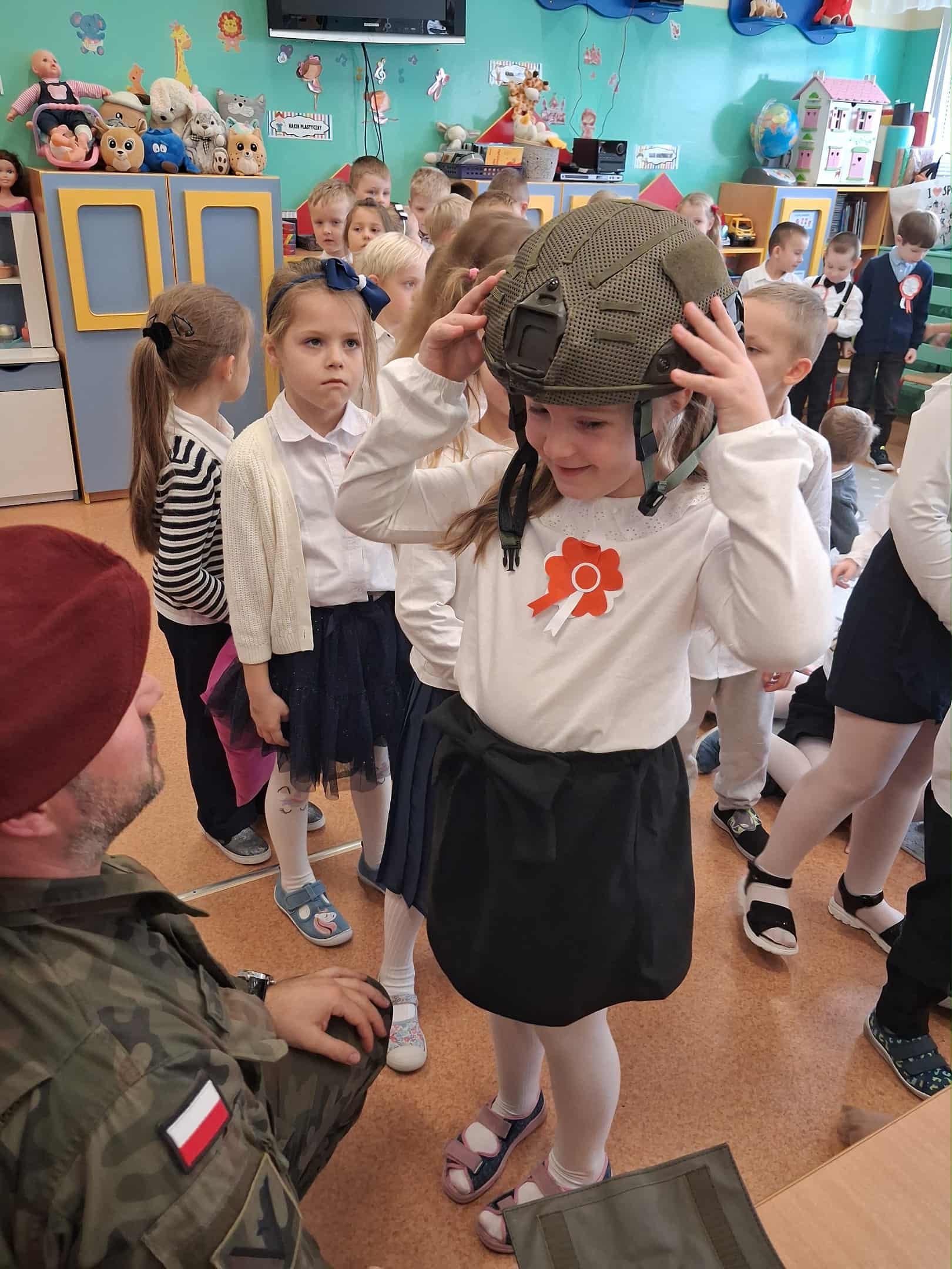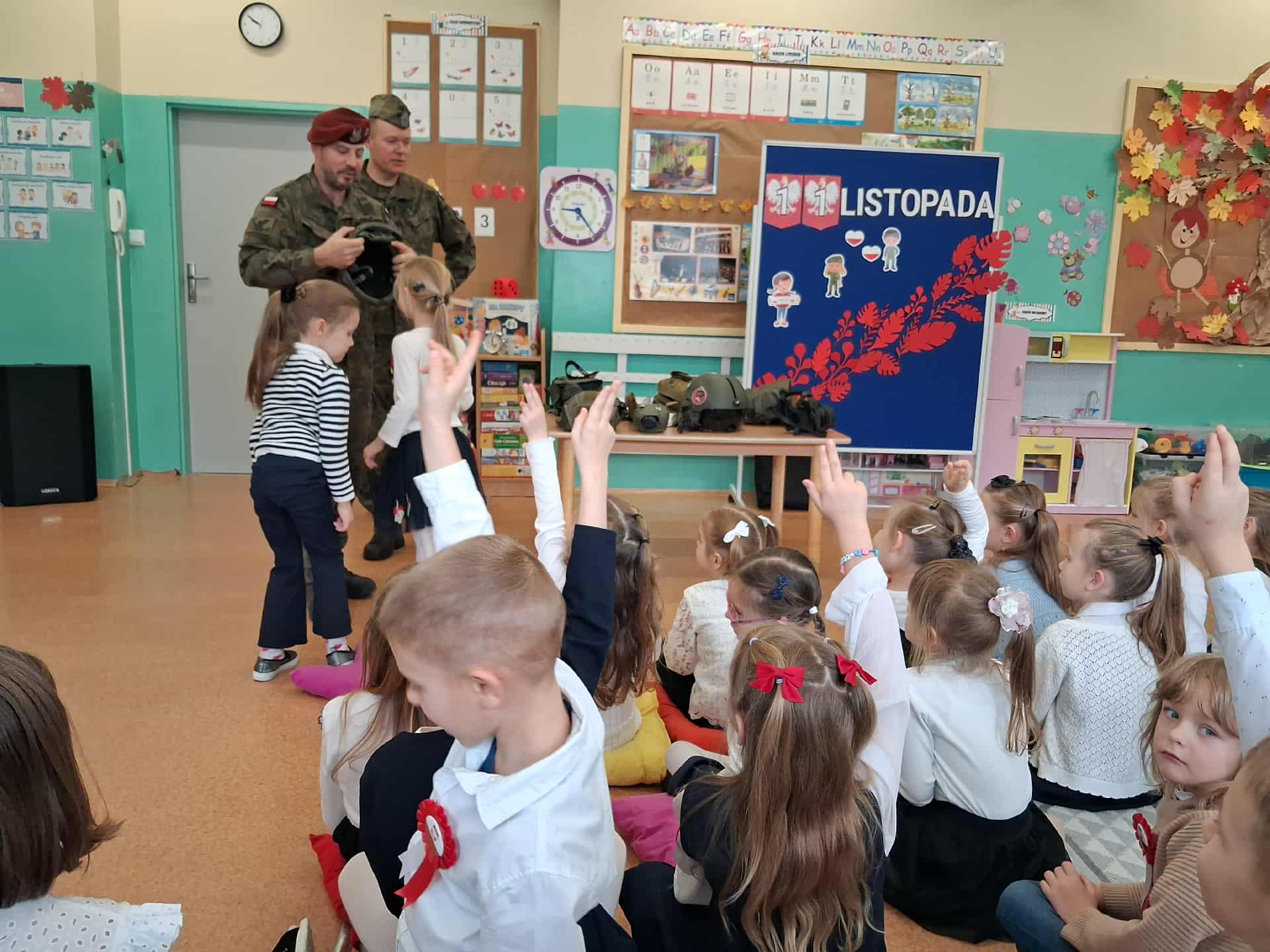 w dniu 7 listopada uroczyście obchodziliśmy Święto Niepodległości. Dzieci z oddziałów najstarszych naszego przedszkola podkreśliły powagę i uroczysty charakter tego dnia odświętnym, galowym strojem i biało - czerwonym kotylionem. Grupa "Rumianki" pod kierunkiem p. Elżbiety Janeckiej, p. Izabeli Maj i p. Anny Stańczyk przedstawiła montaż słowno - muzyczny o tematyce patriotycznej. Tego dnia odwiedzili nas również wyjątkowi goście - żołnierze, którzy zaprezentowali dzieciom sprzęt wojskowy, a także opowiedzieli o swojej pracy i służbie państwu. O godzinie 11.11 całą społecznością przedszkolną odśpiewaliśmy hymn Polski - Mazurek Dąbrowskiego włączając się tym samym w akcję MEN - "Szkoła do hymnu". Dzień ten był z pewnością piękną lekcją patriotyzmu i miłości do Ojczyzny.