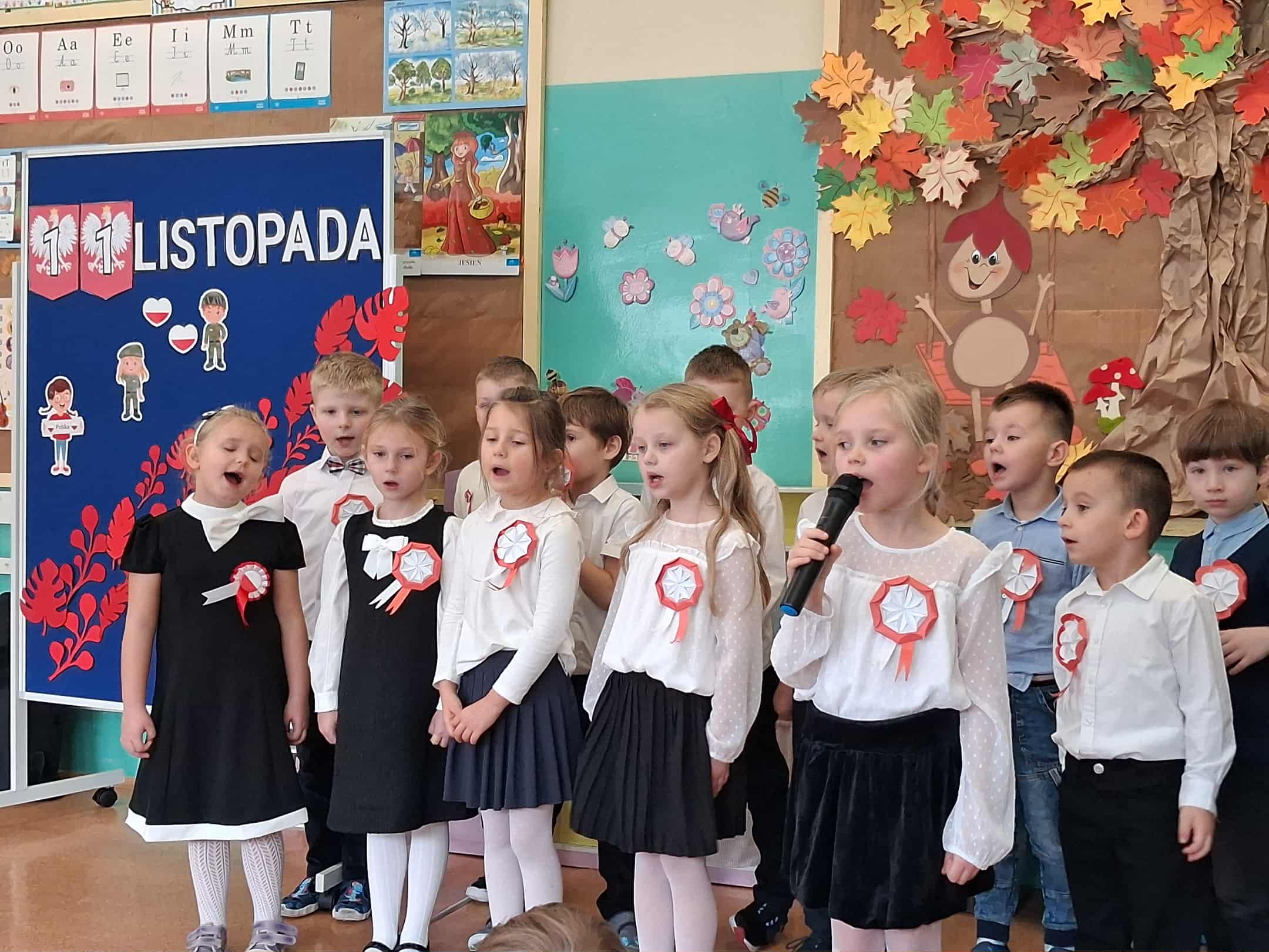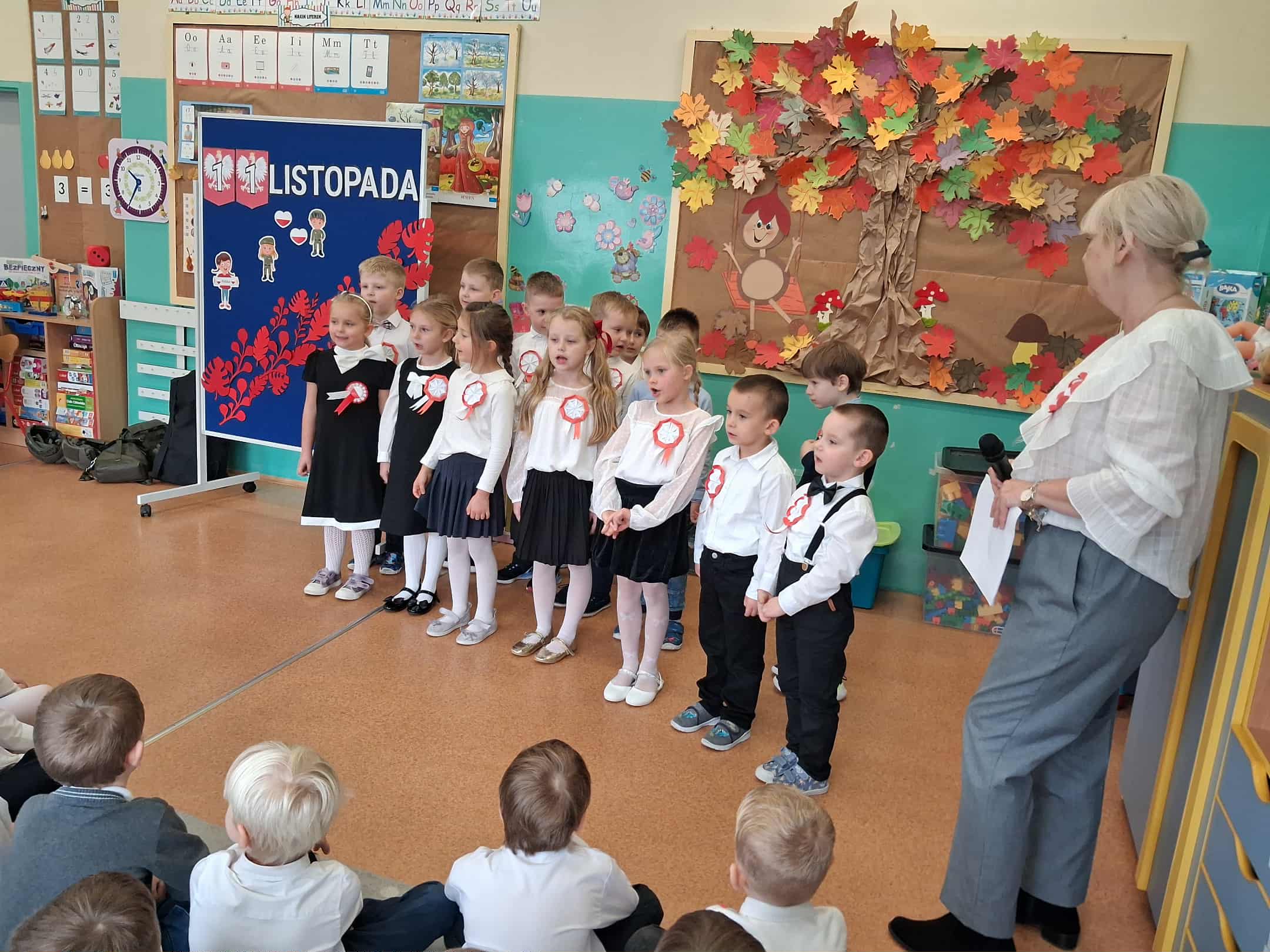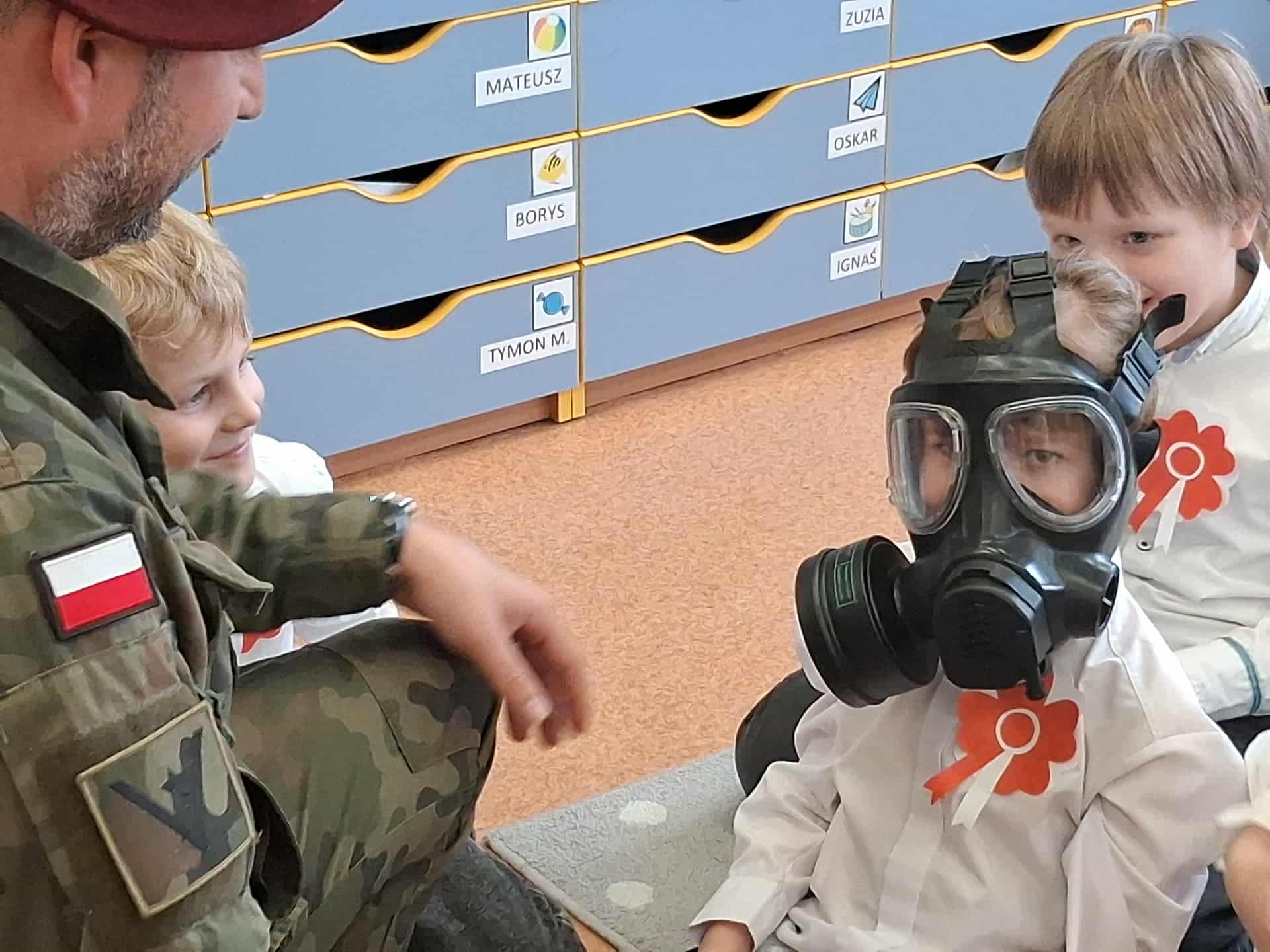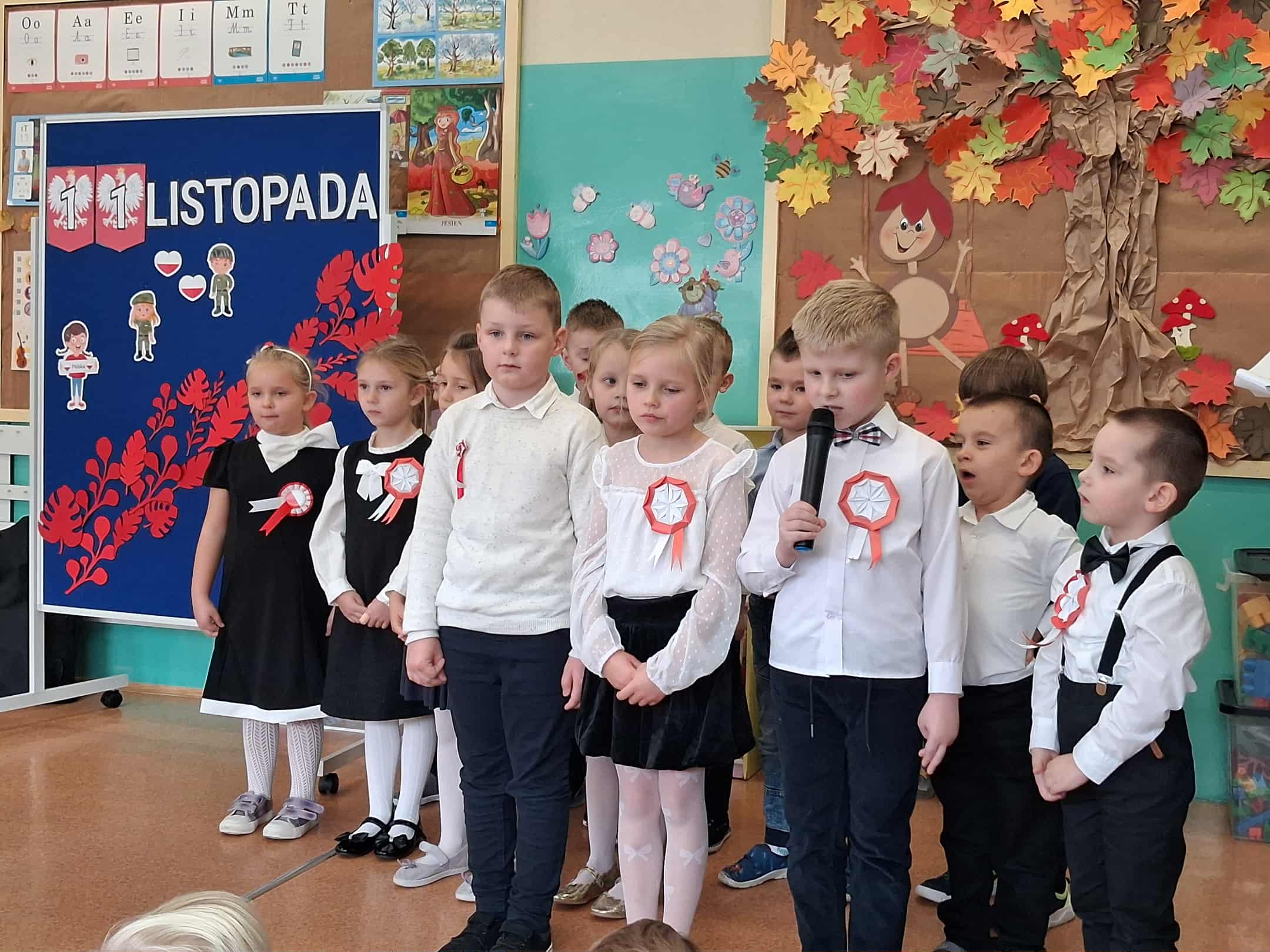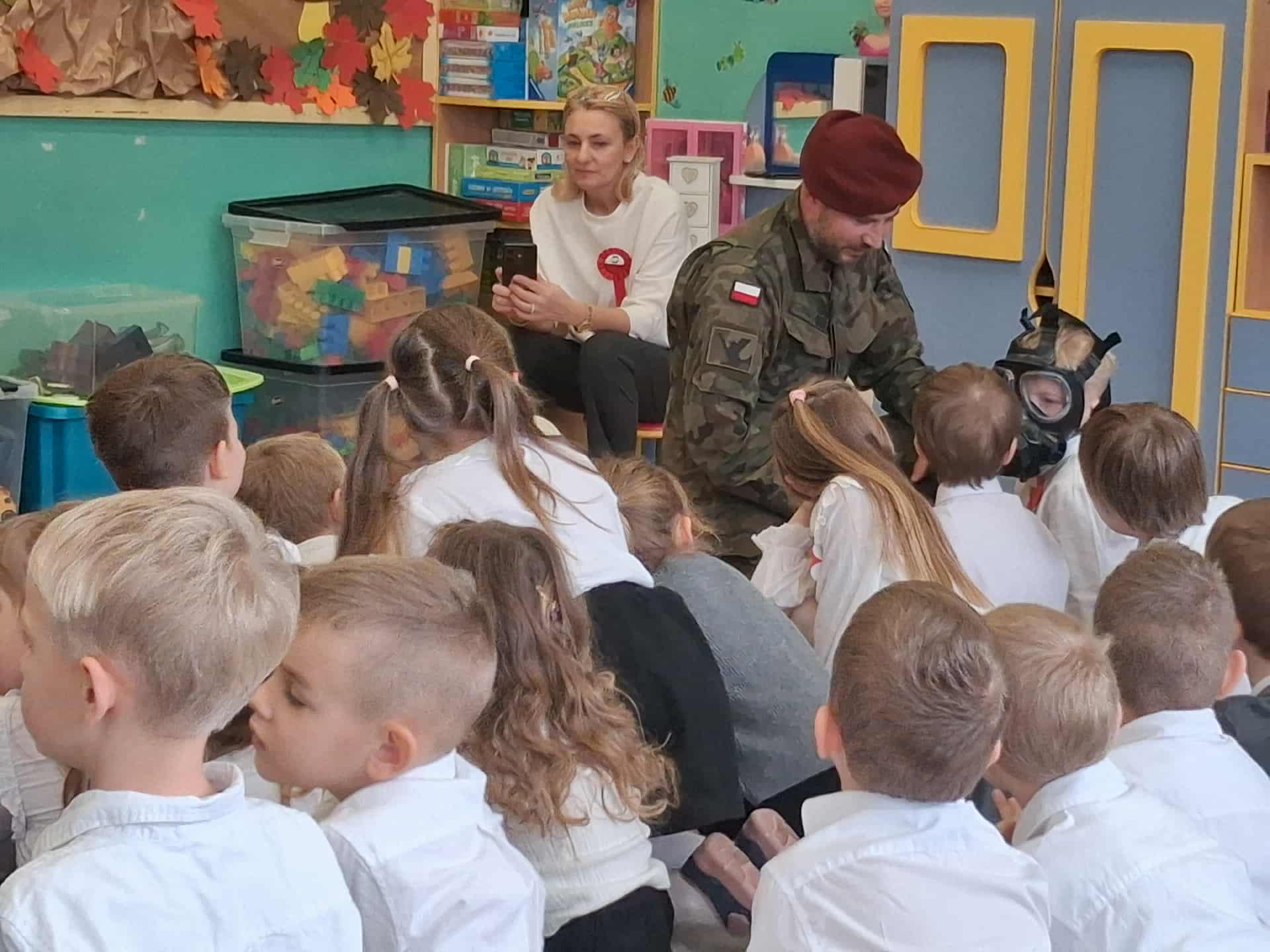 w dniu 7 listopada uroczyście obchodziliśmy Święto Niepodległości. Dzieci z oddziałów najstarszych naszego przedszkola podkreśliły powagę i uroczysty charakter tego dnia odświętnym, galowym strojem i biało - czerwonym kotylionem. Grupa "Rumianki" pod kierunkiem p. Elżbiety Janeckiej, p. Izabeli Maj i p. Anny Stańczyk przedstawiła montaż słowno - muzyczny o tematyce patriotycznej. Tego dnia odwiedzili nas również wyjątkowi goście - żołnierze, którzy zaprezentowali dzieciom sprzęt wojskowy, a także opowiedzieli o swojej pracy i służbie państwu. O godzinie 11.11 całą społecznością przedszkolną odśpiewaliśmy hymn Polski - Mazurek Dąbrowskiego włączając się tym samym w akcję MEN - "Szkoła do hymnu". Dzień ten był z pewnością piękną lekcją patriotyzmu i miłości do Ojczyzny.