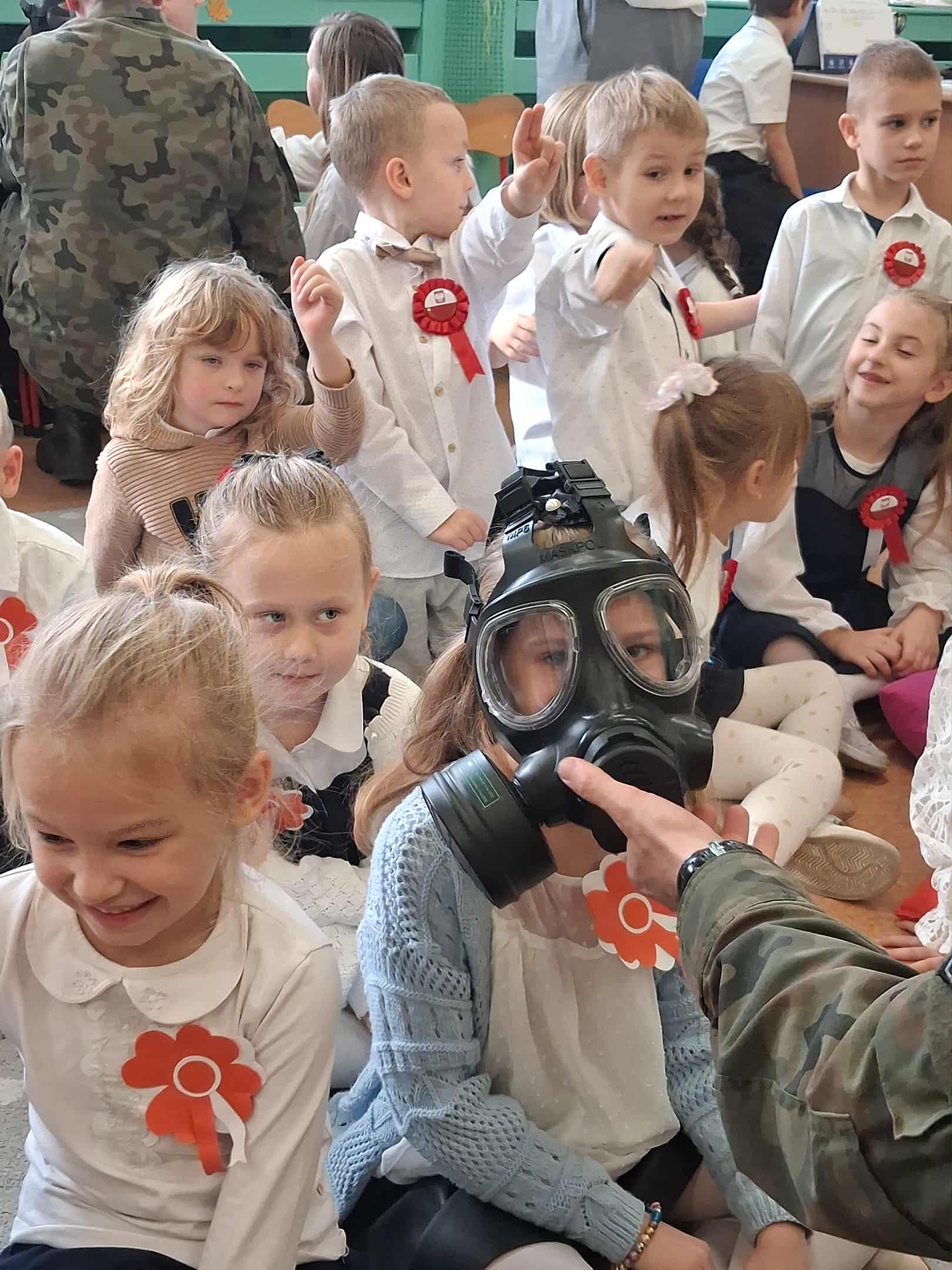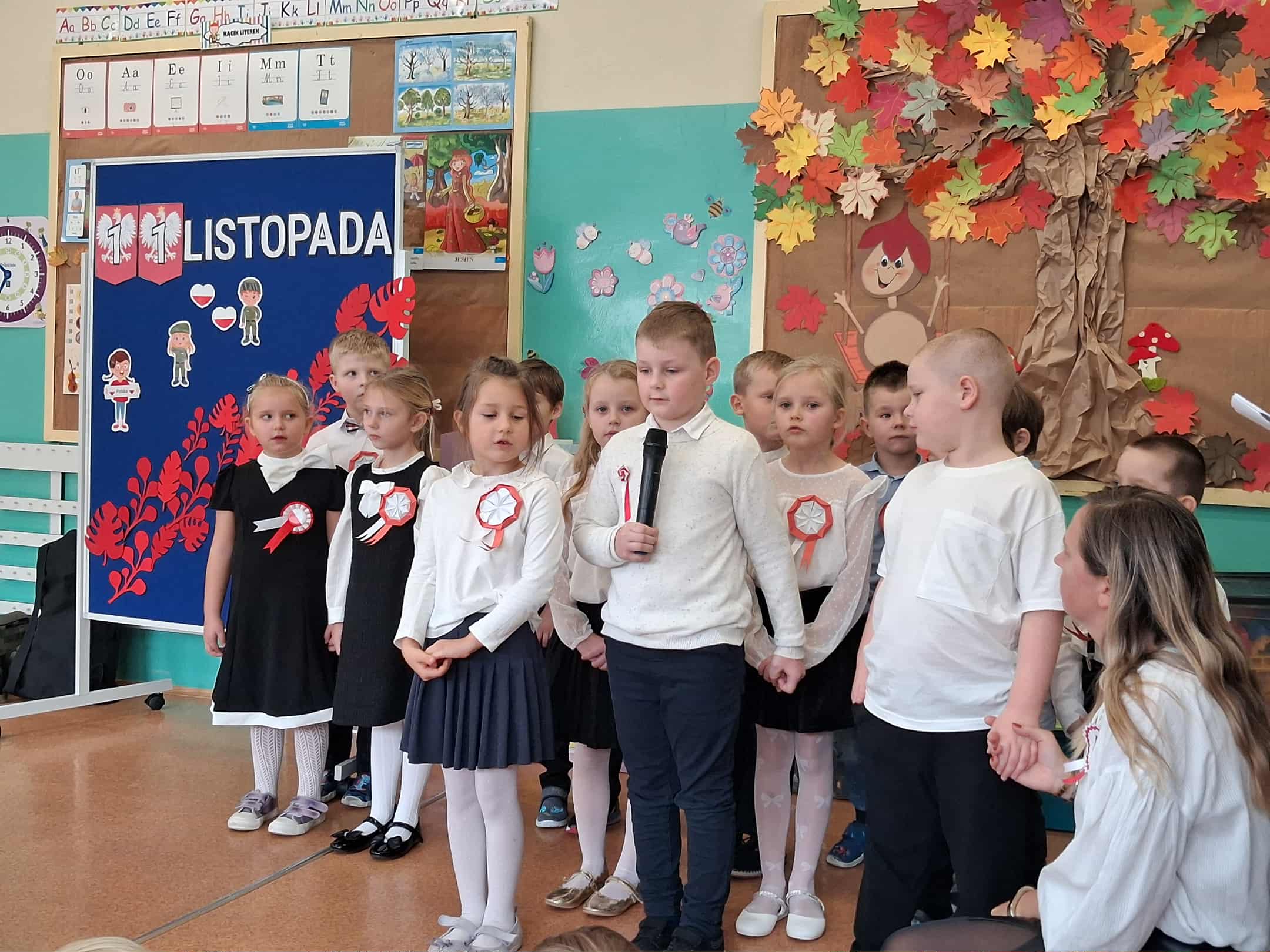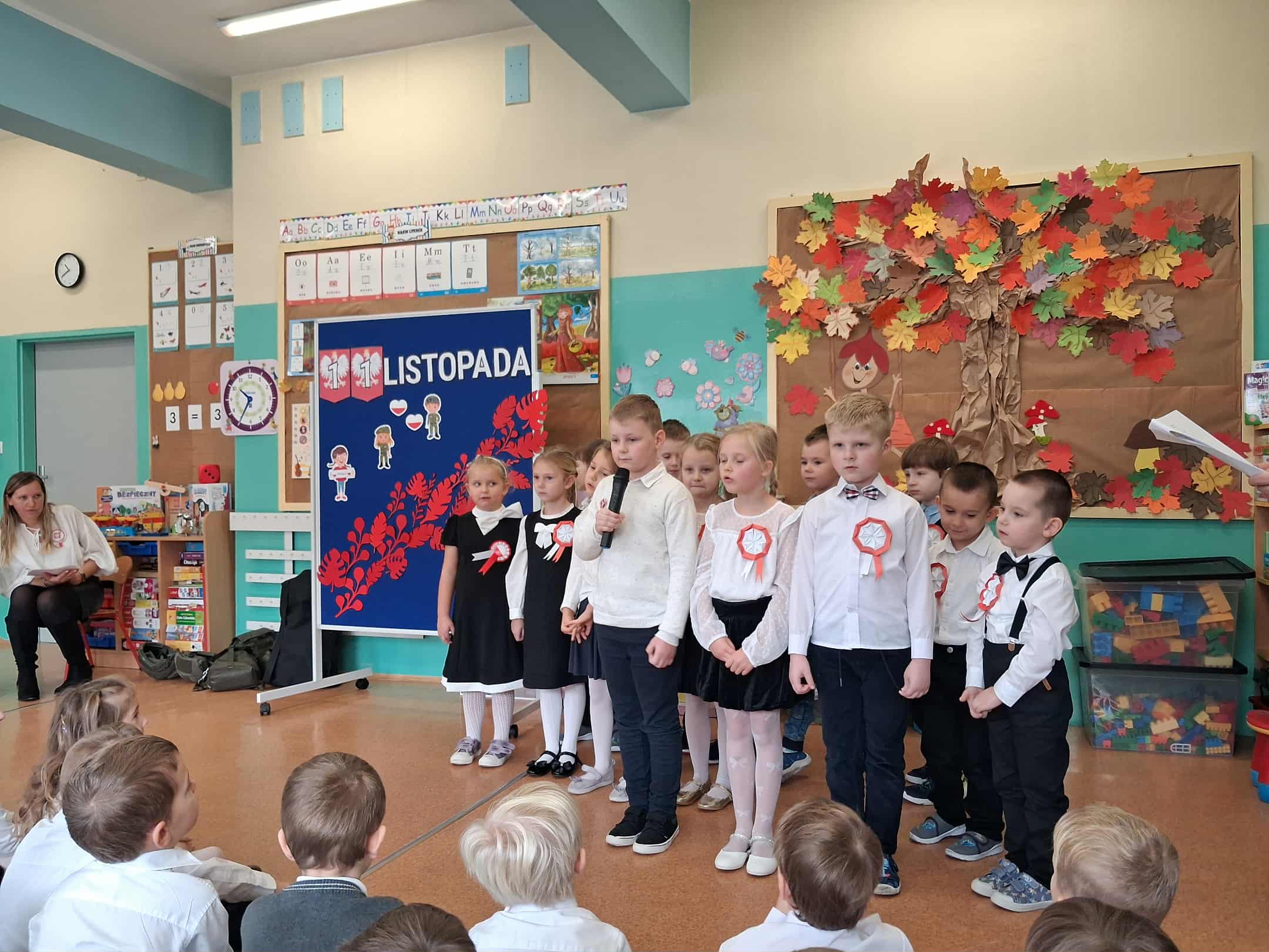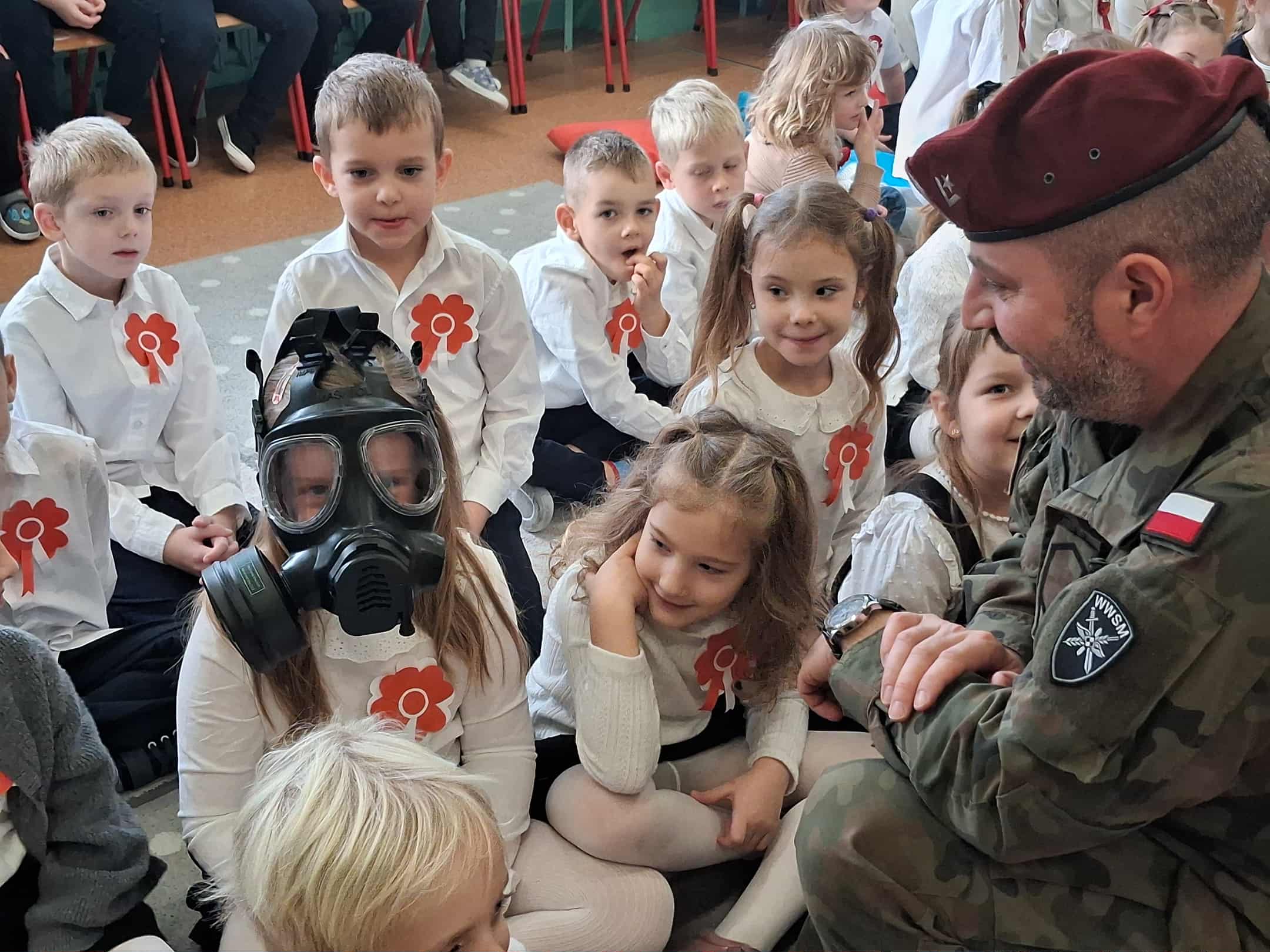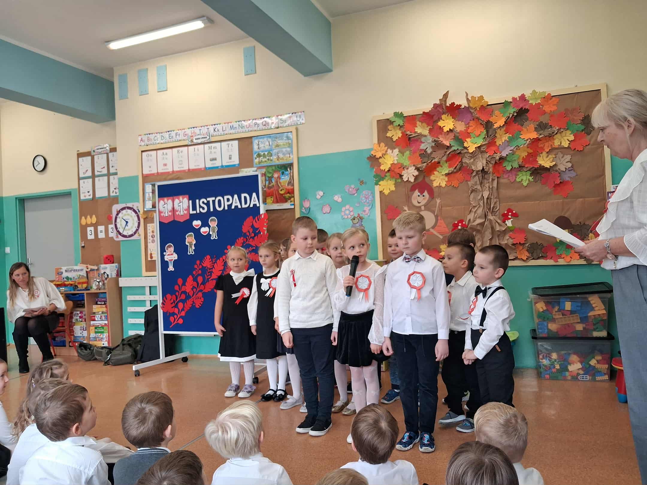 w dniu 7 listopada uroczyście obchodziliśmy Święto Niepodległości. Dzieci z oddziałów najstarszych naszego przedszkola podkreśliły powagę i uroczysty charakter tego dnia odświętnym, galowym strojem i biało - czerwonym kotylionem. Grupa "Rumianki" pod kierunkiem p. Elżbiety Janeckiej, p. Izabeli Maj i p. Anny Stańczyk przedstawiła montaż słowno - muzyczny o tematyce patriotycznej. Tego dnia odwiedzili nas również wyjątkowi goście - żołnierze, którzy zaprezentowali dzieciom sprzęt wojskowy, a także opowiedzieli o swojej pracy i służbie państwu. O godzinie 11.11 całą społecznością przedszkolną odśpiewaliśmy hymn Polski - Mazurek Dąbrowskiego włączając się tym samym w akcję MEN - "Szkoła do hymnu". Dzień ten był z pewnością piękną lekcją patriotyzmu i miłości do Ojczyzny.