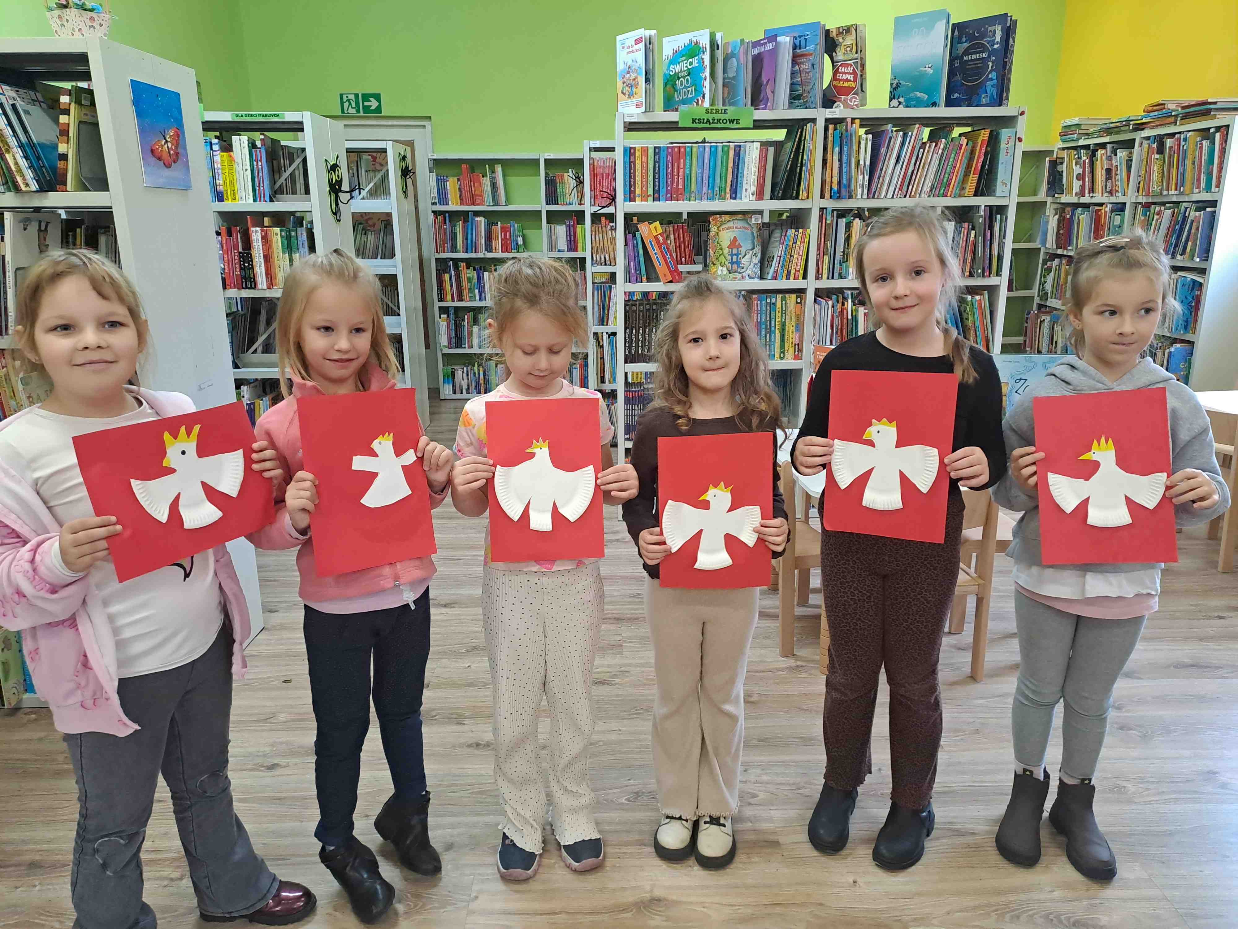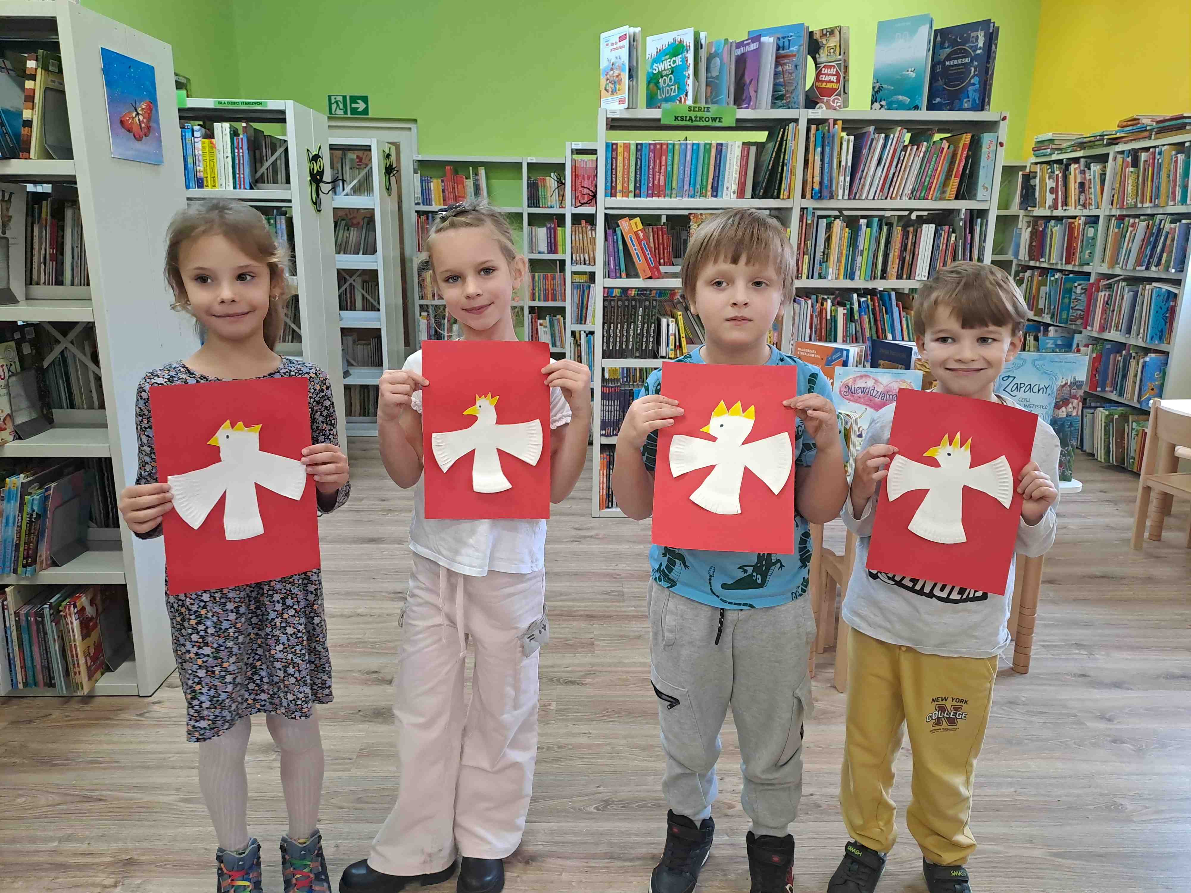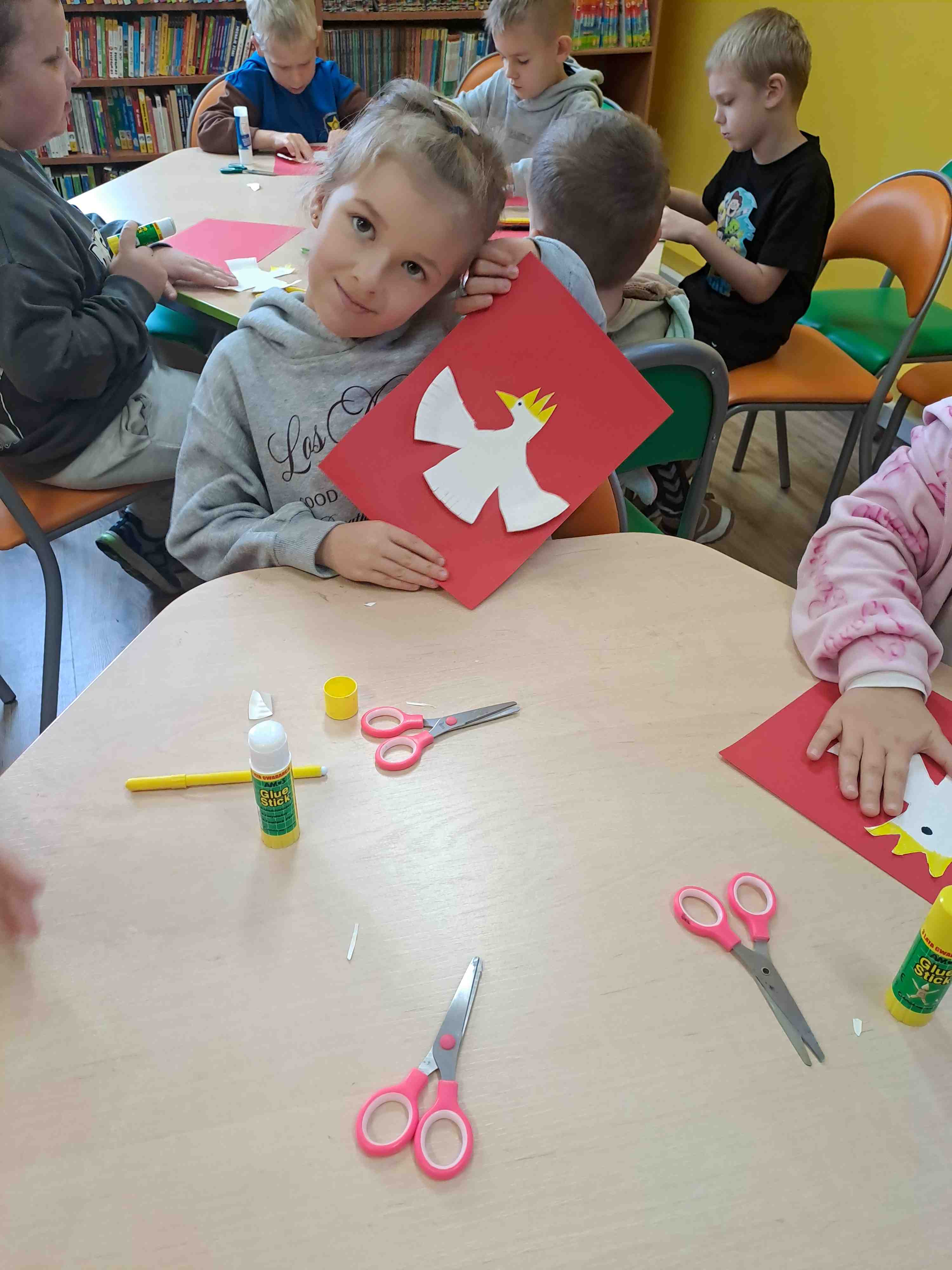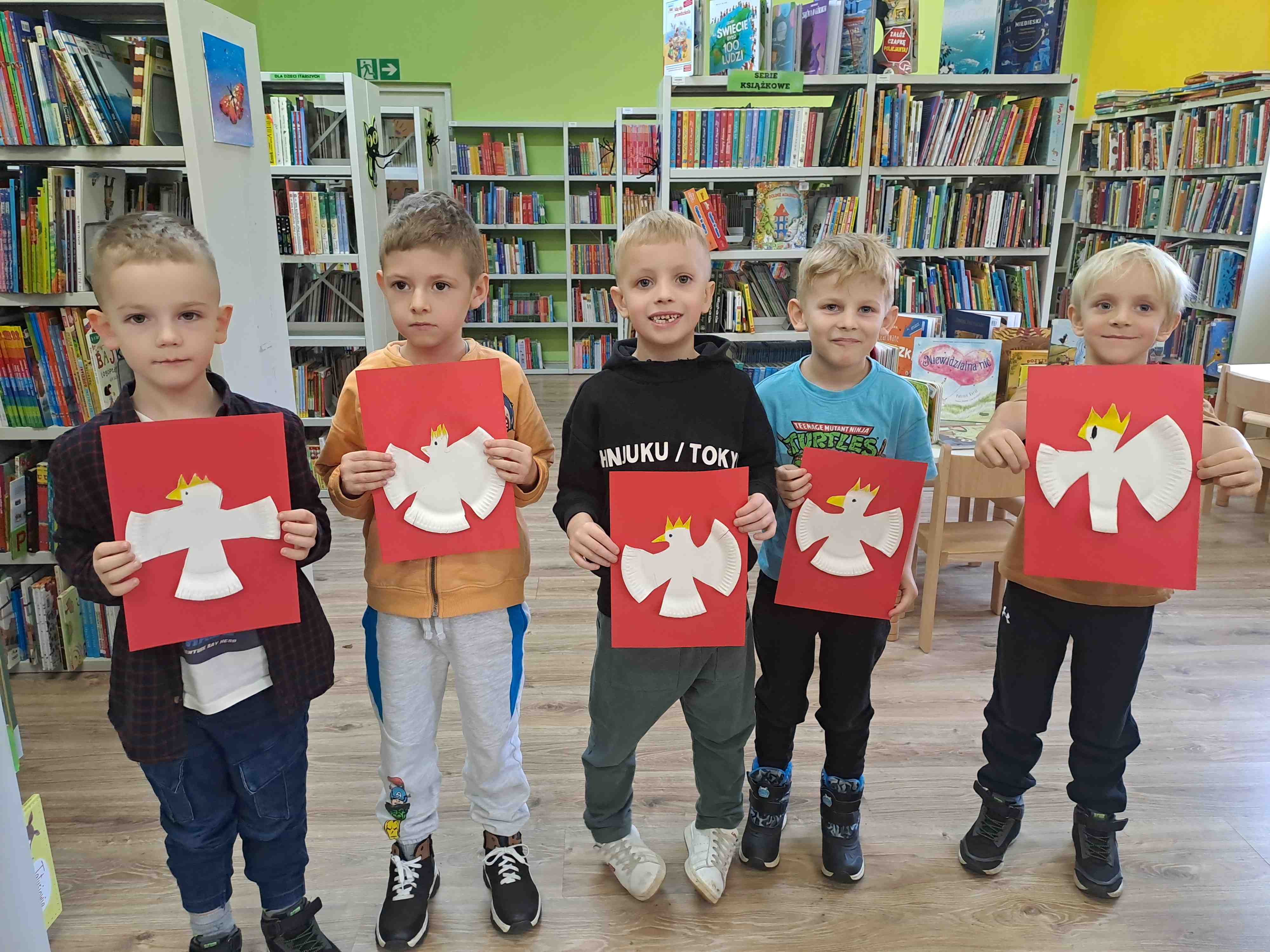 Podczas dzisiejszych zajęć w Bibliotece Miejskiej Motylki omawiały tematykę polskich symboli narodowych. Wspólnie z panią Moniką opowiedziały legendę o założeniu państwa polskiego - "O Lechu, Czechu i Rusie". Recytowały wiersz W. Bełzy "Katechizm polskiego dziecka". Miały okazję zaobserwować, jak zmieniał się wygląd polskiego godła na przestrzeni wieków. Zwieńczeniem zajęć było wykonanie pracy plastycznej z wykorzystaniem papierowych talerzyków i czerwonych kartek, które dzieci przerobiły na wizerunek białego orła na czerwonym tle czyli współczesnego godła Polski.