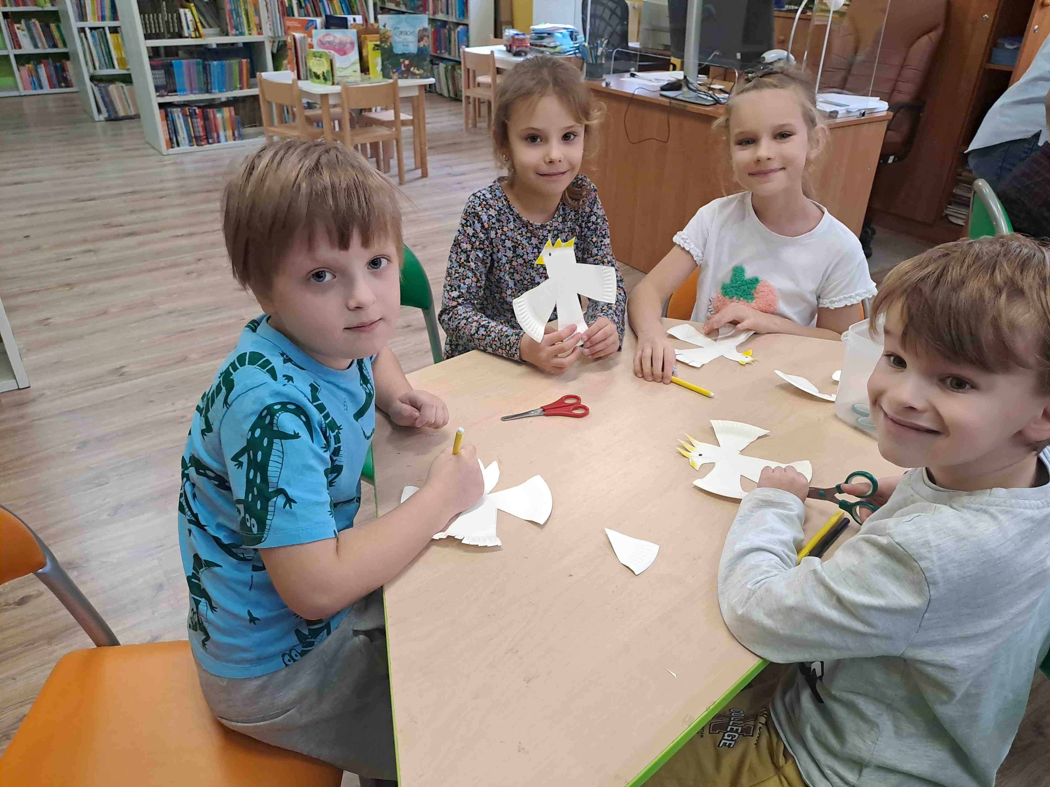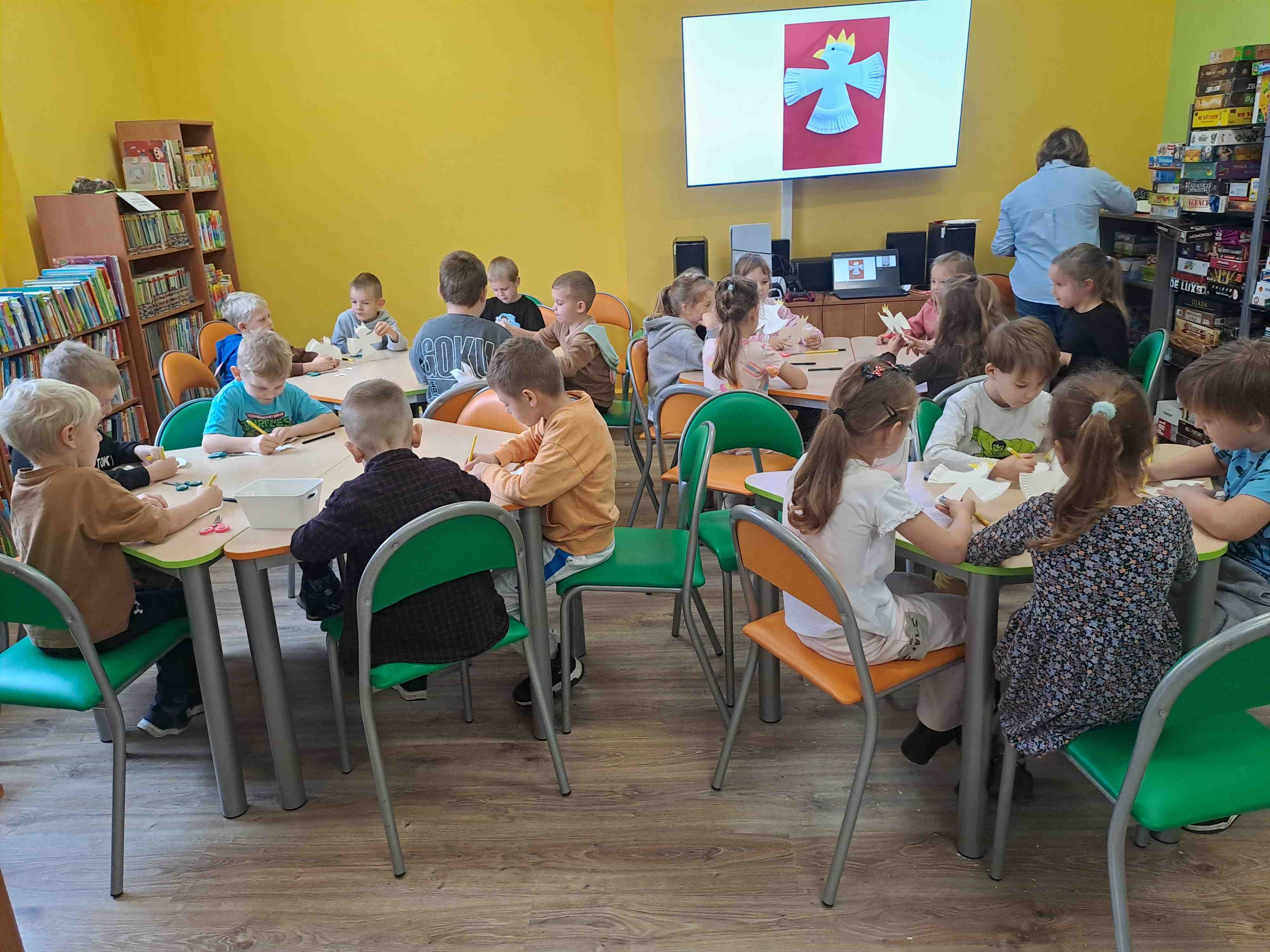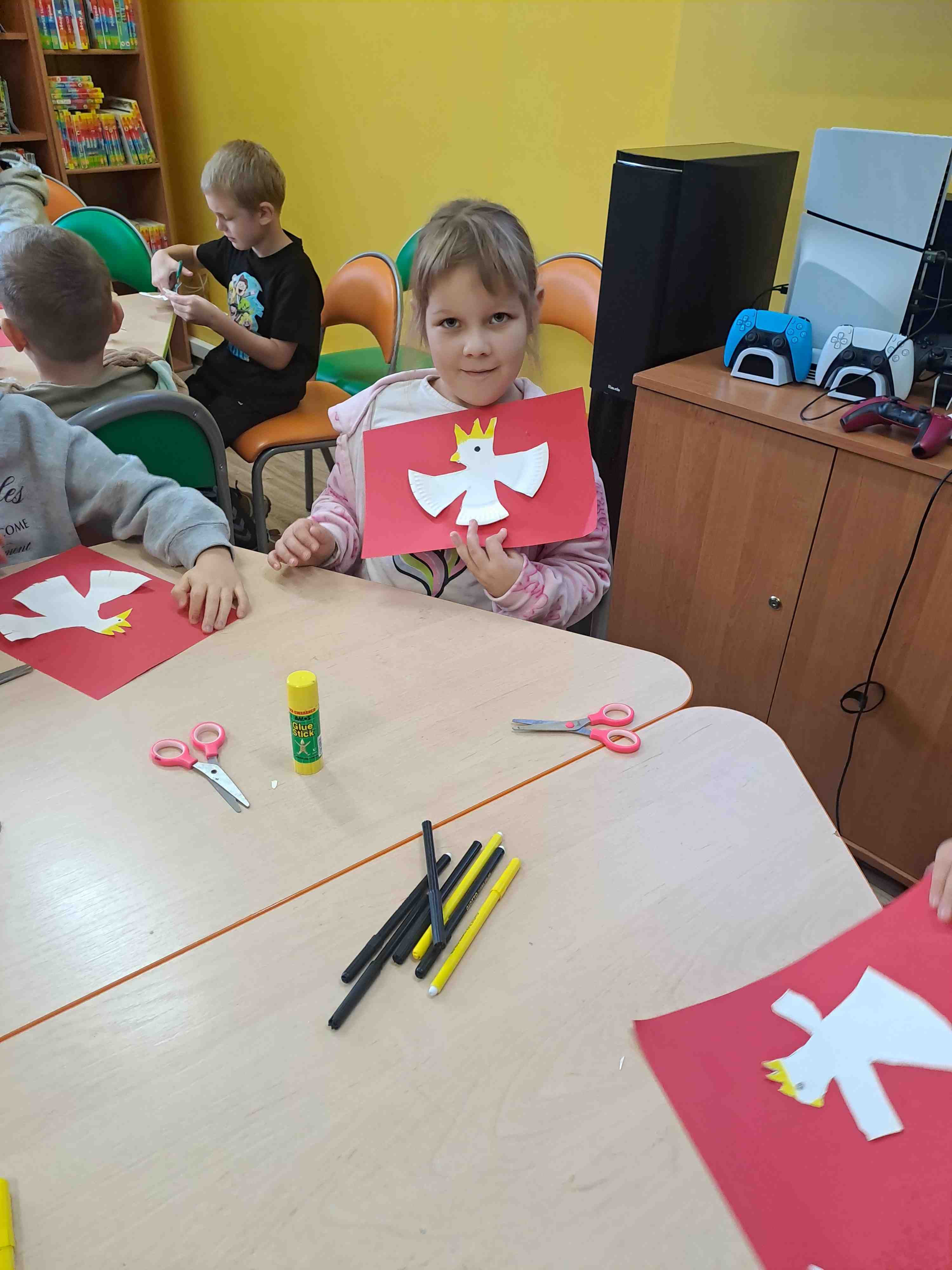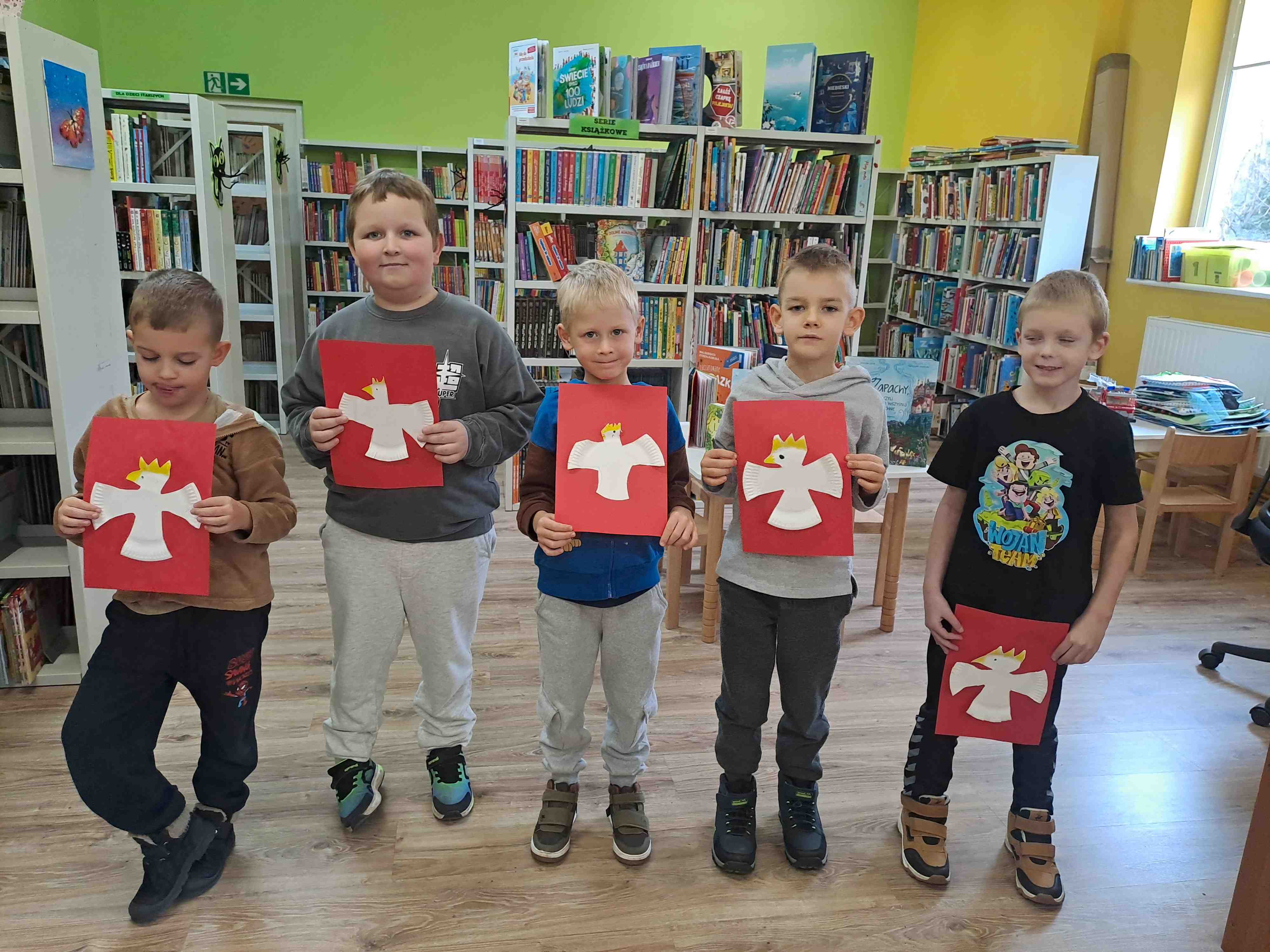 Podczas dzisiejszych zajęć w Bibliotece Miejskiej Motylki omawiały tematykę polskich symboli narodowych. Wspólnie z panią Moniką opowiedziały legendę o założeniu państwa polskiego - "O Lechu, Czechu i Rusie". Recytowały wiersz W. Bełzy "Katechizm polskiego dziecka". Miały okazję zaobserwować, jak zmieniał się wygląd polskiego godła na przestrzeni wieków. Zwieńczeniem zajęć było wykonanie pracy plastycznej z wykorzystaniem papierowych talerzyków i czerwonych kartek, które dzieci przerobiły na wizerunek białego orła na czerwonym tle czyli współczesnego godła Polski.