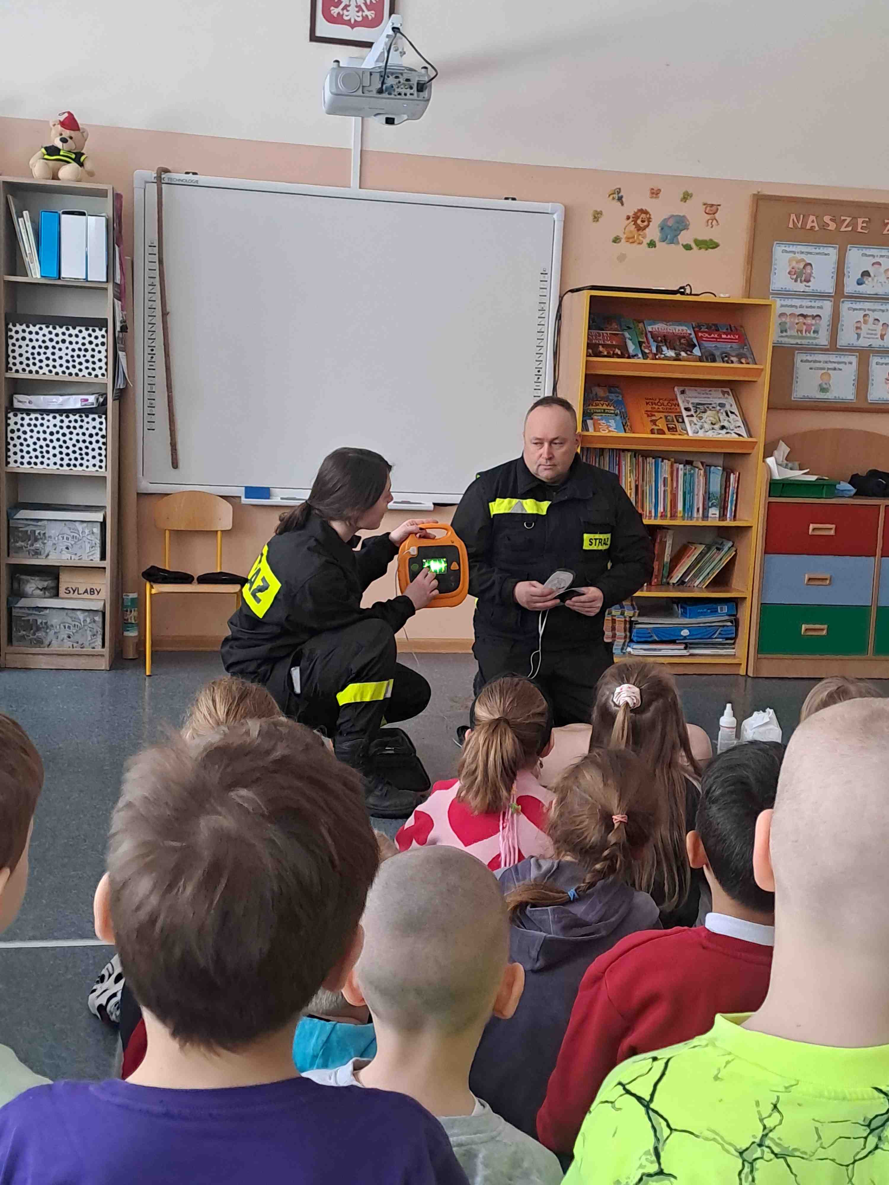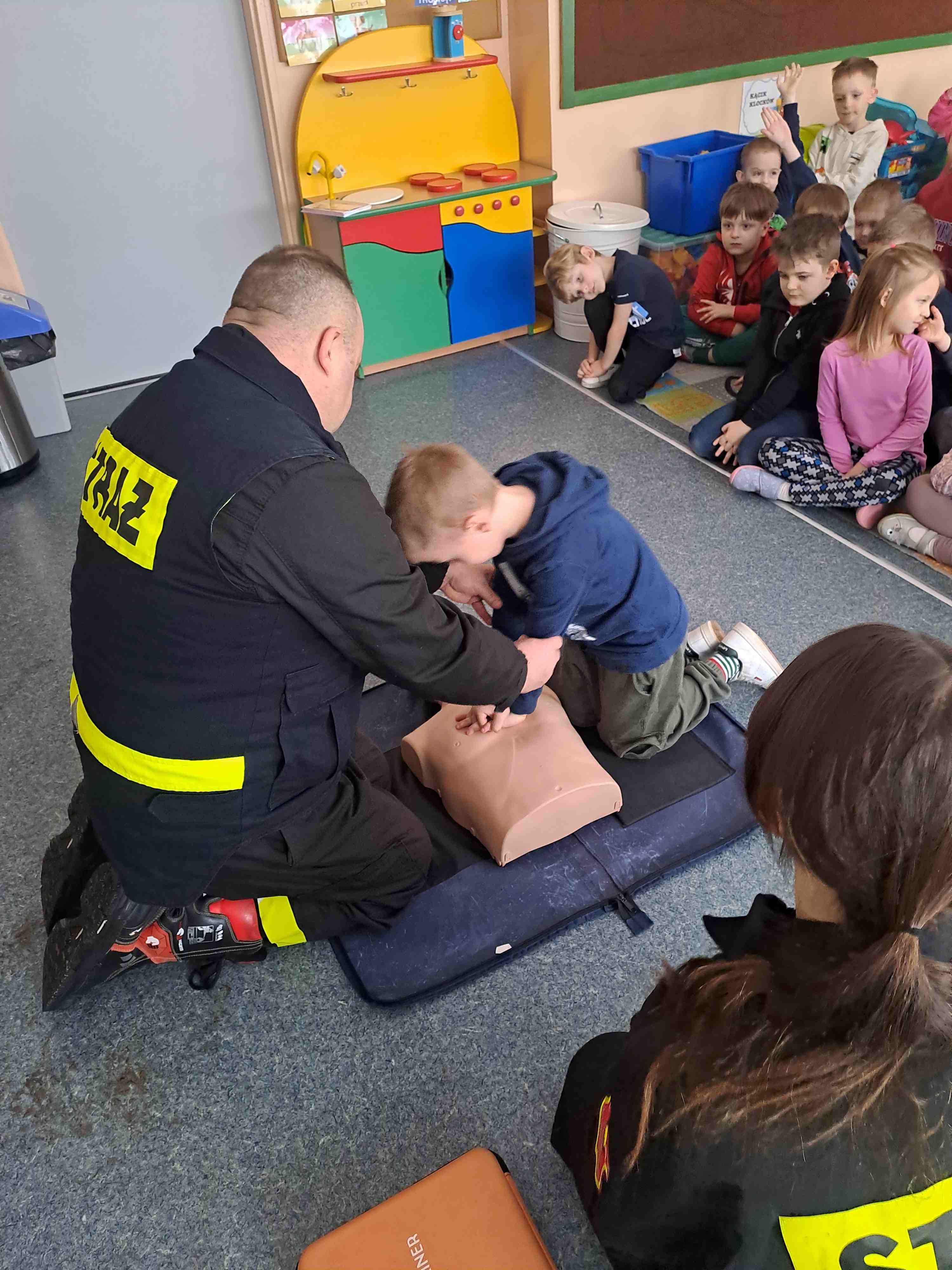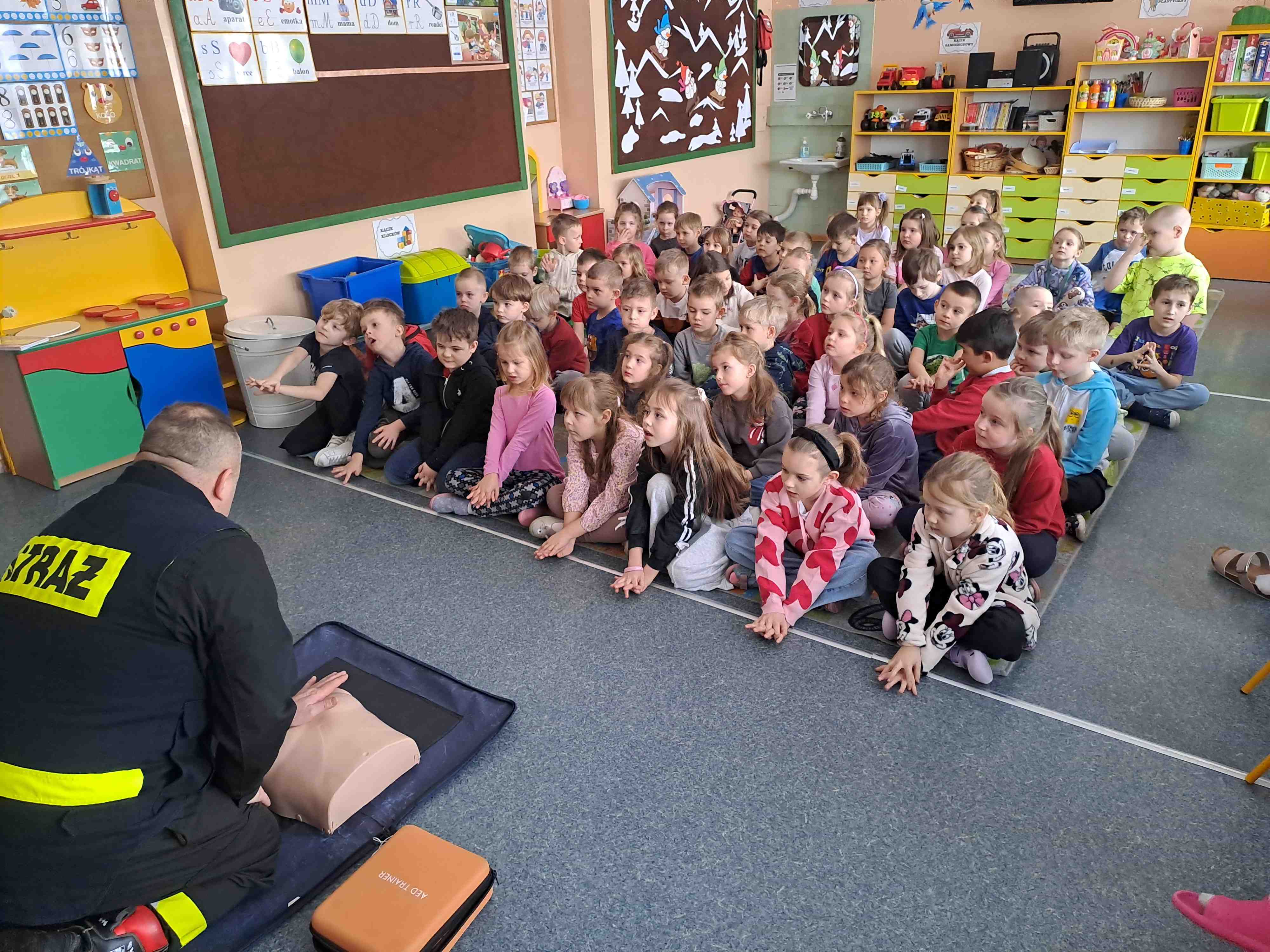 W dniu 17 lutego oddziały najstarsze naszego przedszkola odwiedzili strażacy z Ochotniczej Straży Pożarnej w Wierzbiu, którzy przybliżyli dzieciom zasady udzielania pierwszej pomocy osobom poszkodowanym. Na początku przedszkolaki wysłuchały pogadanki o konieczności zachowania bezpieczeństwa w sytuacjach zagrażających życiu i zdrowiu osób z ich otoczenia. Utrwaliły numery alarmowe oraz sposób informowania służb o zdarzeniu, w którym biorą udział. Następnie strażacy przy pomocy fantoma zaprezentowali dzieciom sposób dokonywania reanimacji osoby poszkodowanej. Chętni mogli w praktyce spróbować powtórzyć omawiane czynności.. Umiejętność udzielania pierwszej pomocy jest niezwykle ważna, gdyż nigdy nie wiemy, jakiej sytuacji możemy być świadkami. Dziękujemy strażakom za tę ważną i potrzebną lekcję.