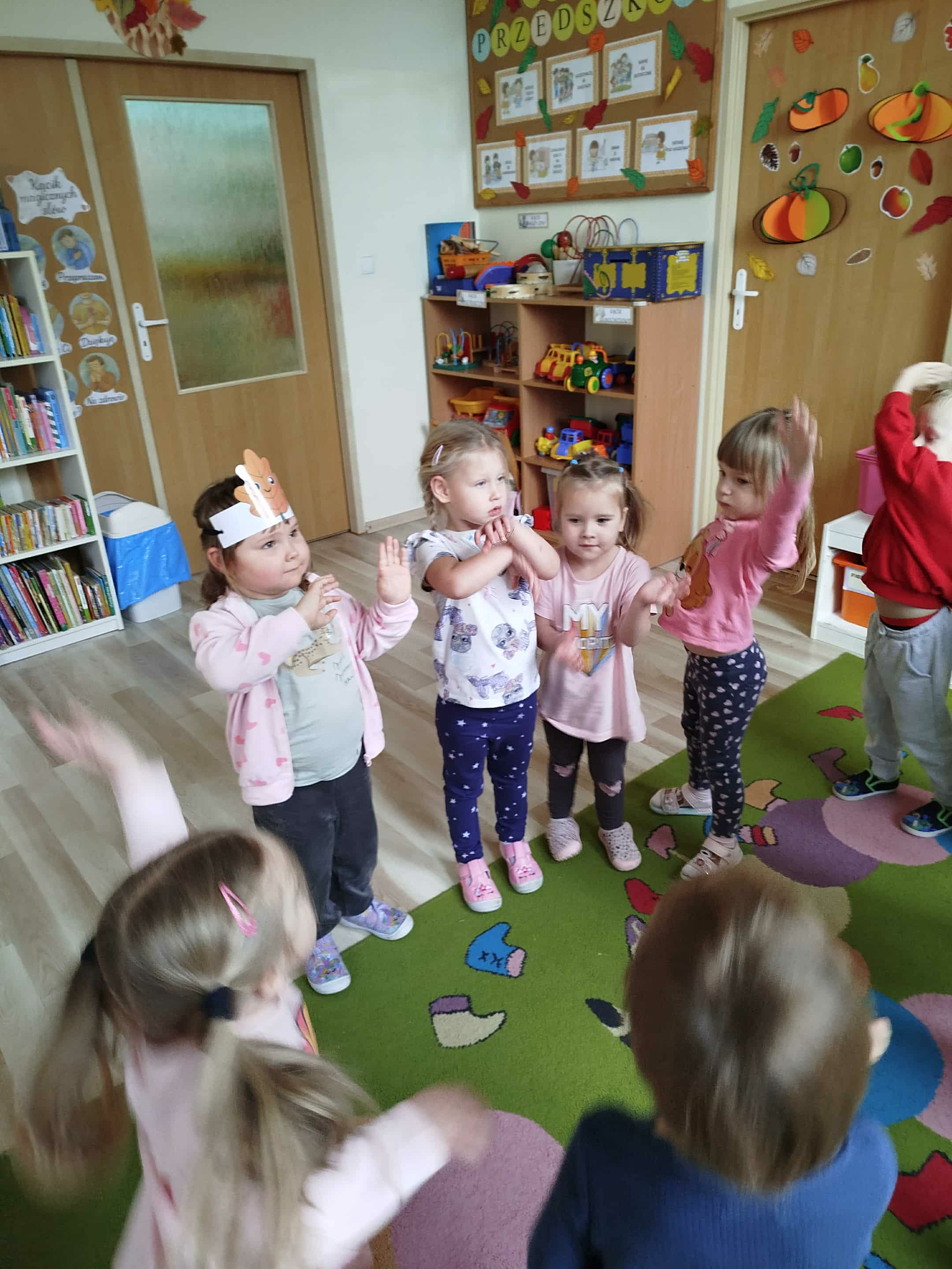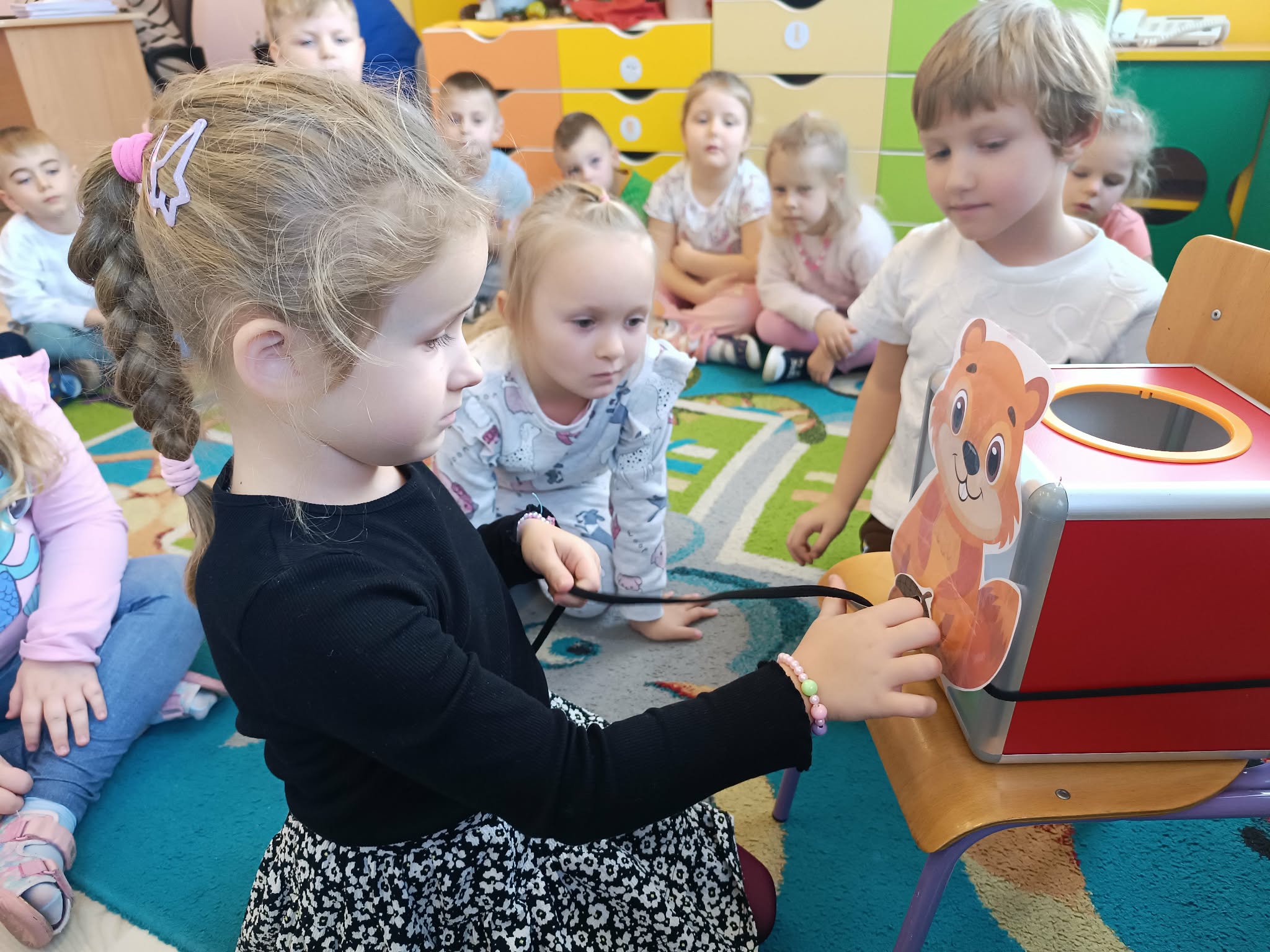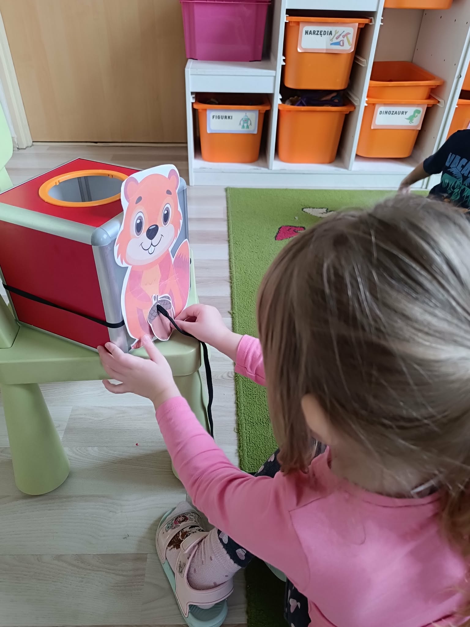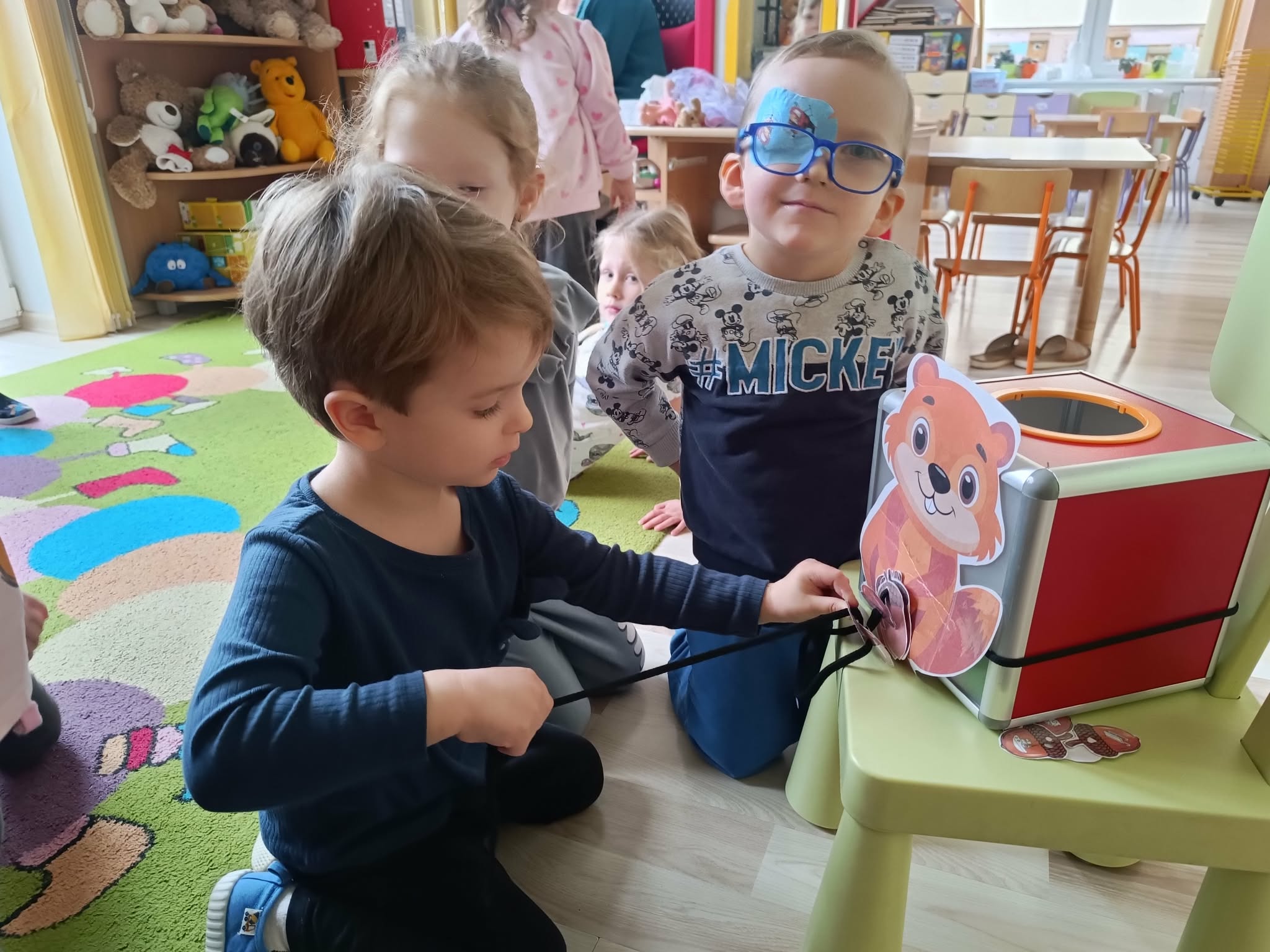 Dzieci brały udział w zabawach logopedycznych: karmiły wiewiórkę żołędziami ćwicząc małą motorykę.