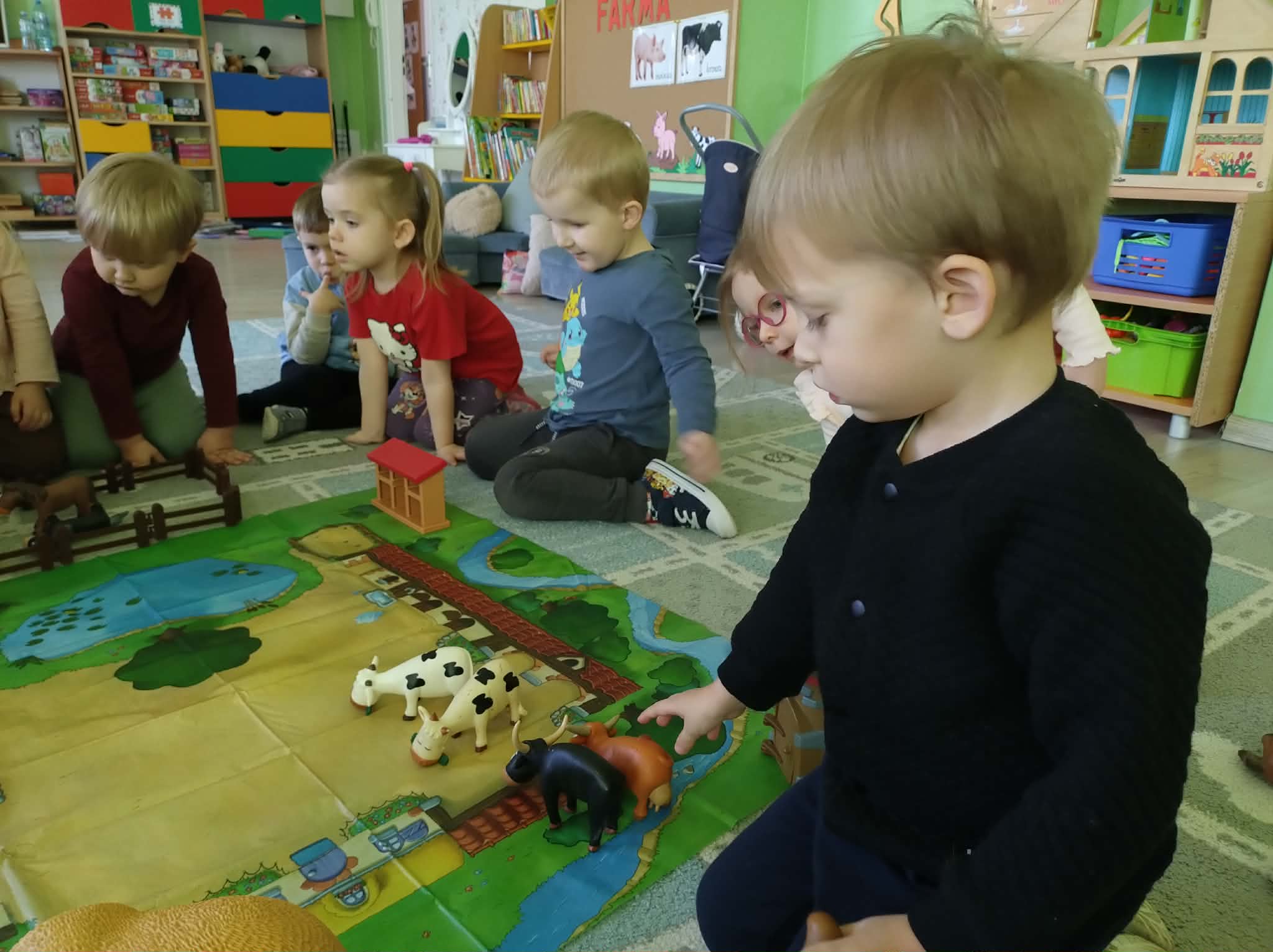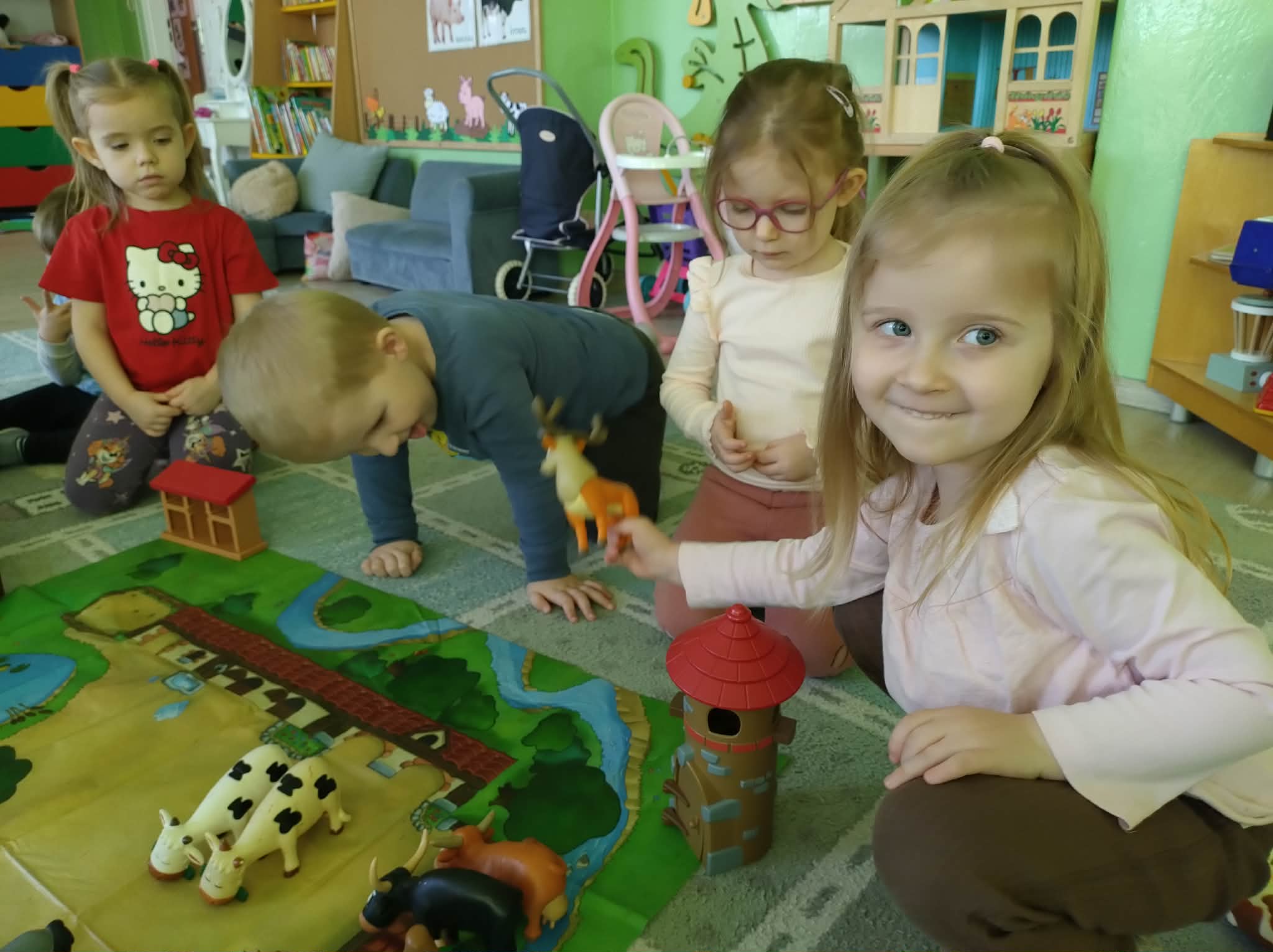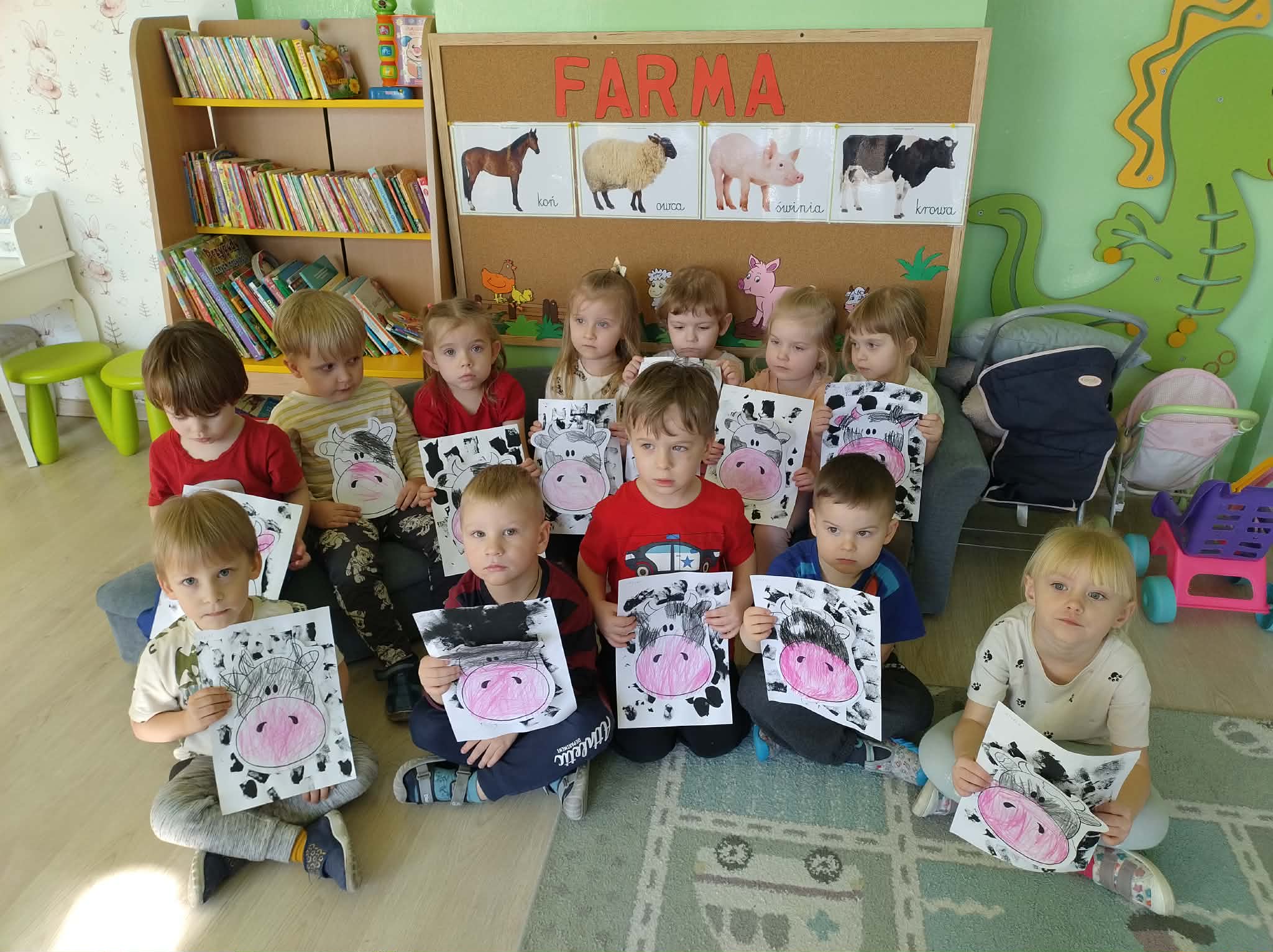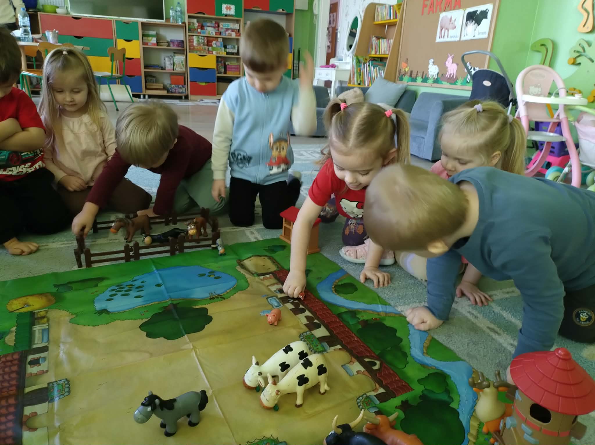 „Poznajemy zwierzęta gospodarskie”. Dzieci miały okazję dowiedzieć się, jakie zwierzęta mieszkają na wsi oraz jaką rolę pełnią w gospodarstwie. Podczas zajęć przedszkolaki oglądały obrazki i figurki zwierząt takich jak krowa, koń, świnia, kura, kaczka czy owca. Nauczycielka opowiadała, gdzie mieszkają te zwierzęta, czym się żywią oraz jakie produkty dzięki nim otrzymujemy, na przykład mleko, jajka czy wełnę. Dzieci chętnie naśladowały również odgłosy zwierząt, co sprawiło im wiele radości. Wspólnie zastanawiały się, jak mówi krowa, jak gdacze kura czy jak beczy owca. Była to świetna okazja do nauki poprzez zabawę. Nie zabrakło także zabaw ruchowych, podczas których przedszkolaki wcielały się w zwierzęta gospodarskie — chodziły jak kaczki, skakały jak koniki i naśladowały ich ruchy. Dzieci wykonały pracę plastyczną przedstawiającą wybrane zwierzęta z wiejskiego podwórka. Dzięki temu mogły utrwalić zdobytą wiedzę i rozwijać swoją kreatywność. Zajęcia były pełne śmiechu, ciekawostek i nowych doświadczeń. Dzieci z dużym zainteresowaniem poznawały świat zwierząt gospodarskich i świetnie się przy tym bawiły.