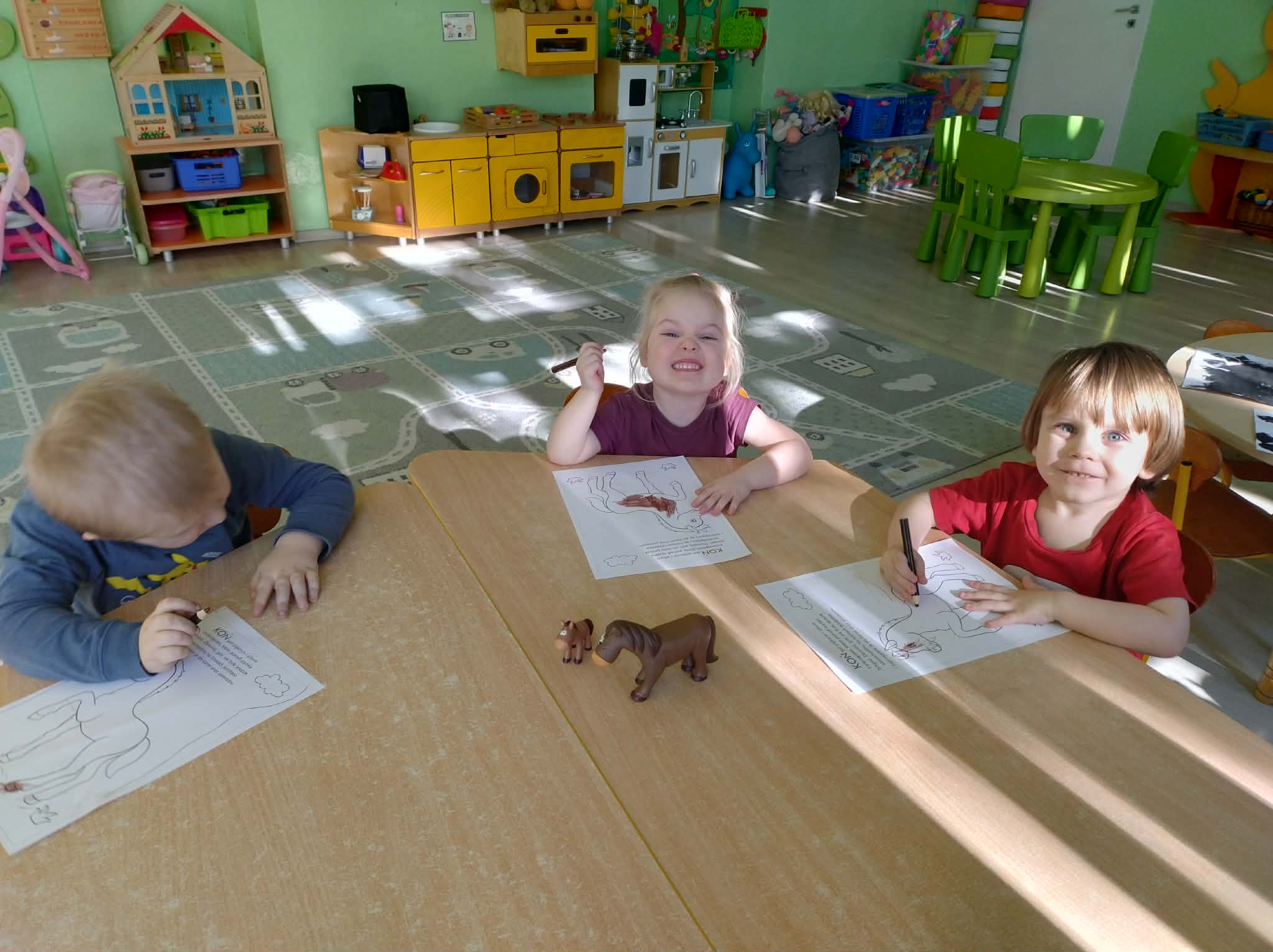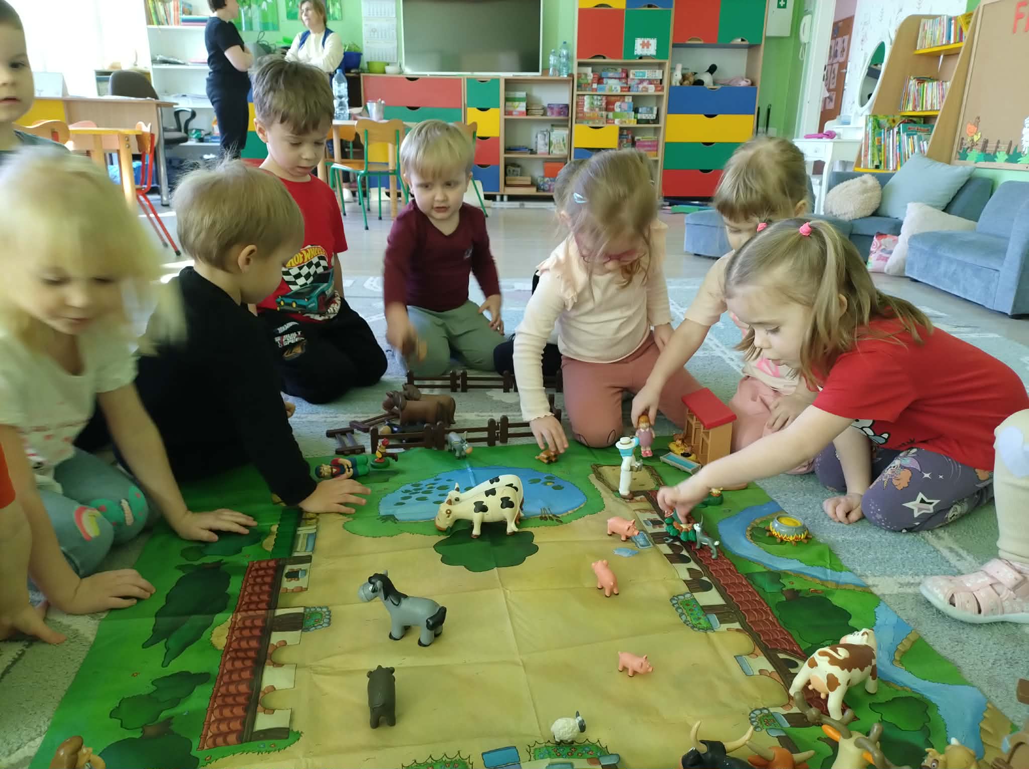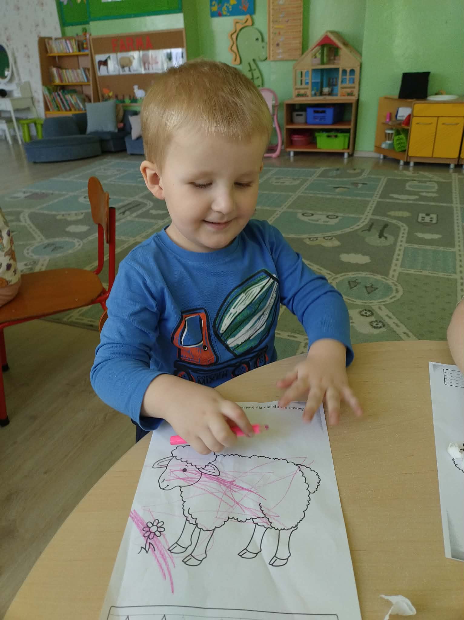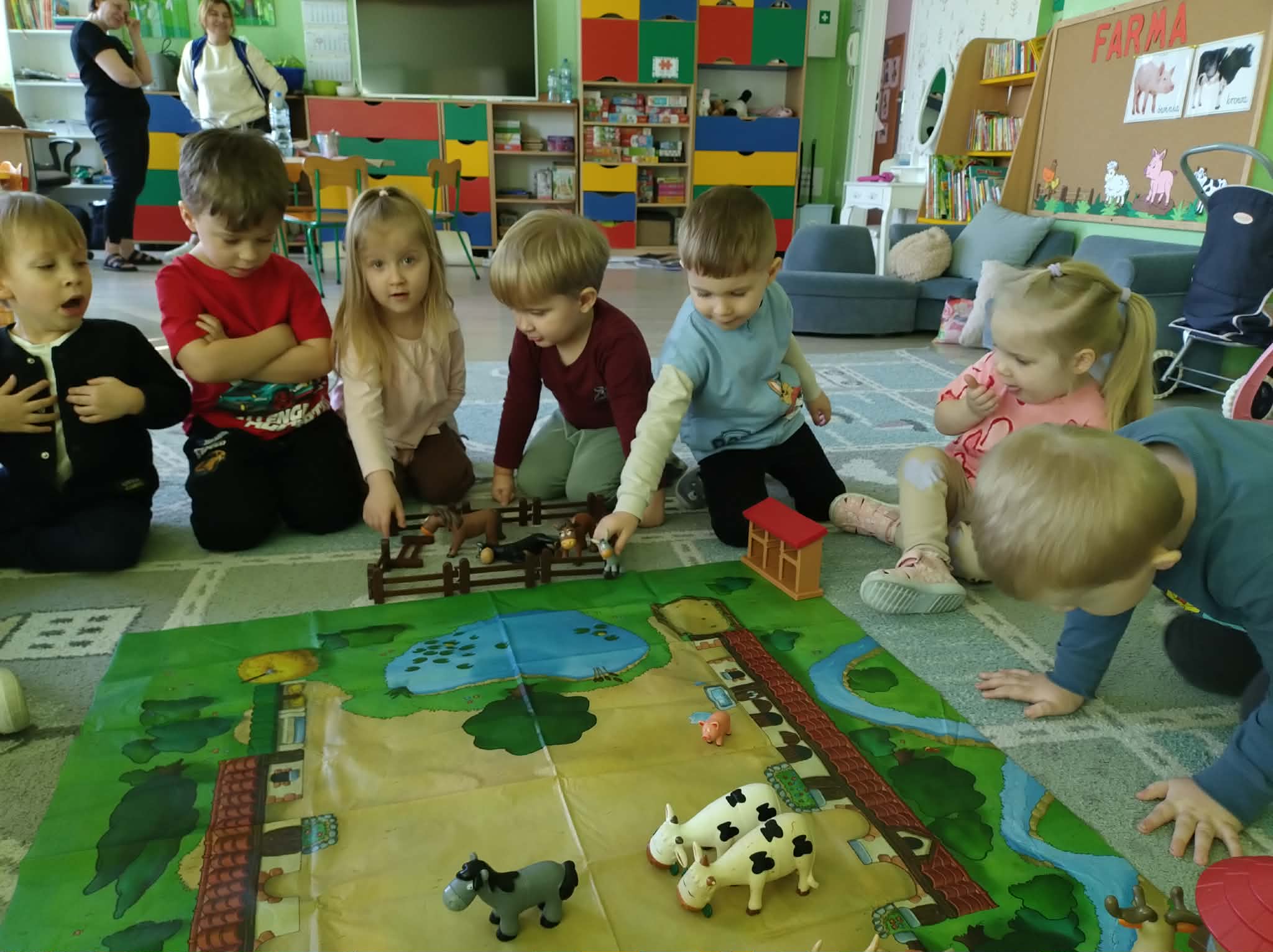 „Poznajemy zwierzęta gospodarskie”. Dzieci miały okazję dowiedzieć się, jakie zwierzęta mieszkają na wsi oraz jaką rolę pełnią w gospodarstwie. Podczas zajęć przedszkolaki oglądały obrazki i figurki zwierząt takich jak krowa, koń, świnia, kura, kaczka czy owca. Nauczycielka opowiadała, gdzie mieszkają te zwierzęta, czym się żywią oraz jakie produkty dzięki nim otrzymujemy, na przykład mleko, jajka czy wełnę. Dzieci chętnie naśladowały również odgłosy zwierząt, co sprawiło im wiele radości. Wspólnie zastanawiały się, jak mówi krowa, jak gdacze kura czy jak beczy owca. Była to świetna okazja do nauki poprzez zabawę. Nie zabrakło także zabaw ruchowych, podczas których przedszkolaki wcielały się w zwierzęta gospodarskie — chodziły jak kaczki, skakały jak koniki i naśladowały ich ruchy. Dzieci wykonały pracę plastyczną przedstawiającą wybrane zwierzęta z wiejskiego podwórka. Dzięki temu mogły utrwalić zdobytą wiedzę i rozwijać swoją kreatywność. Zajęcia były pełne śmiechu, ciekawostek i nowych doświadczeń. Dzieci z dużym zainteresowaniem poznawały świat zwierząt gospodarskich i świetnie się przy tym bawiły.