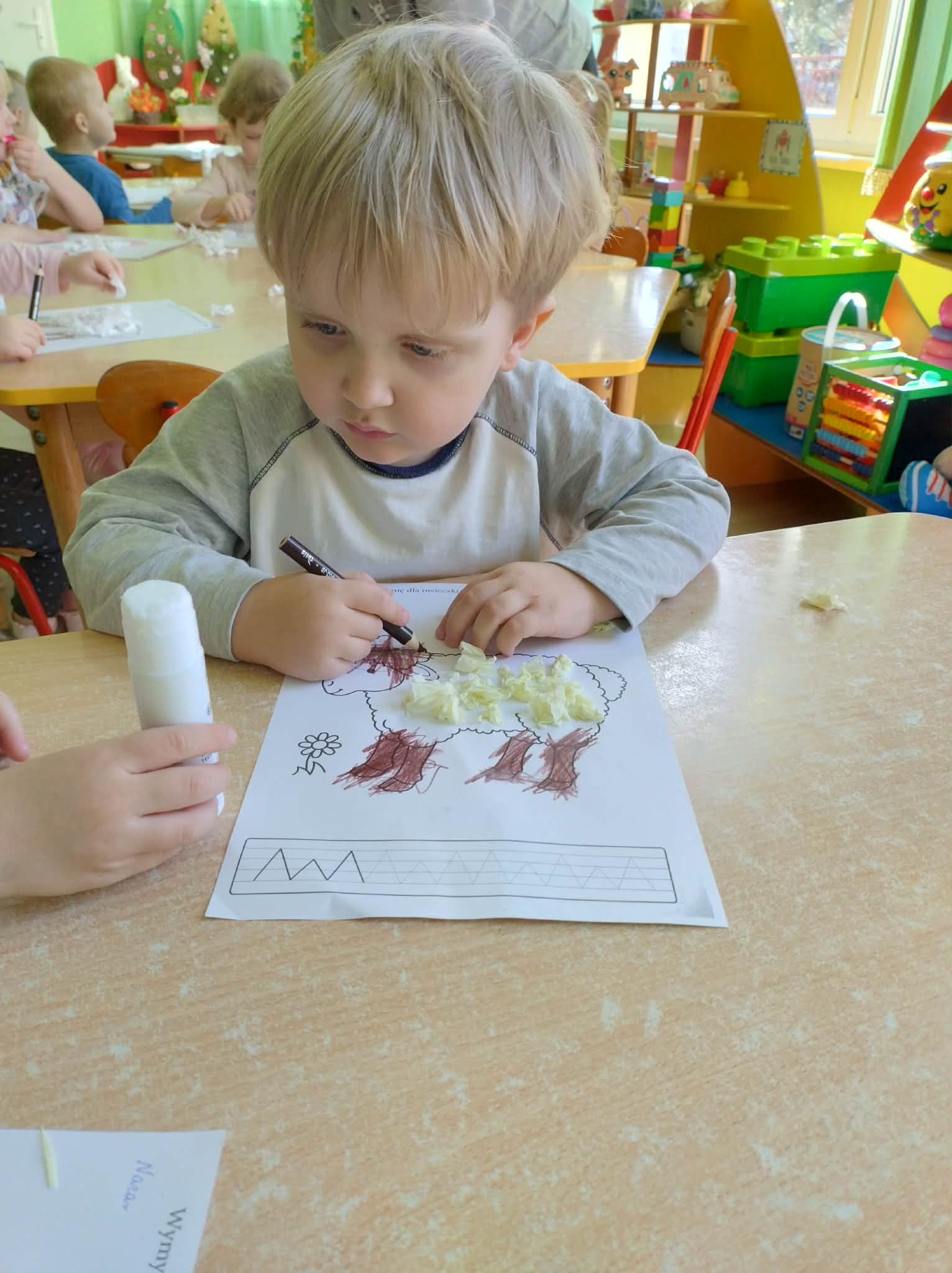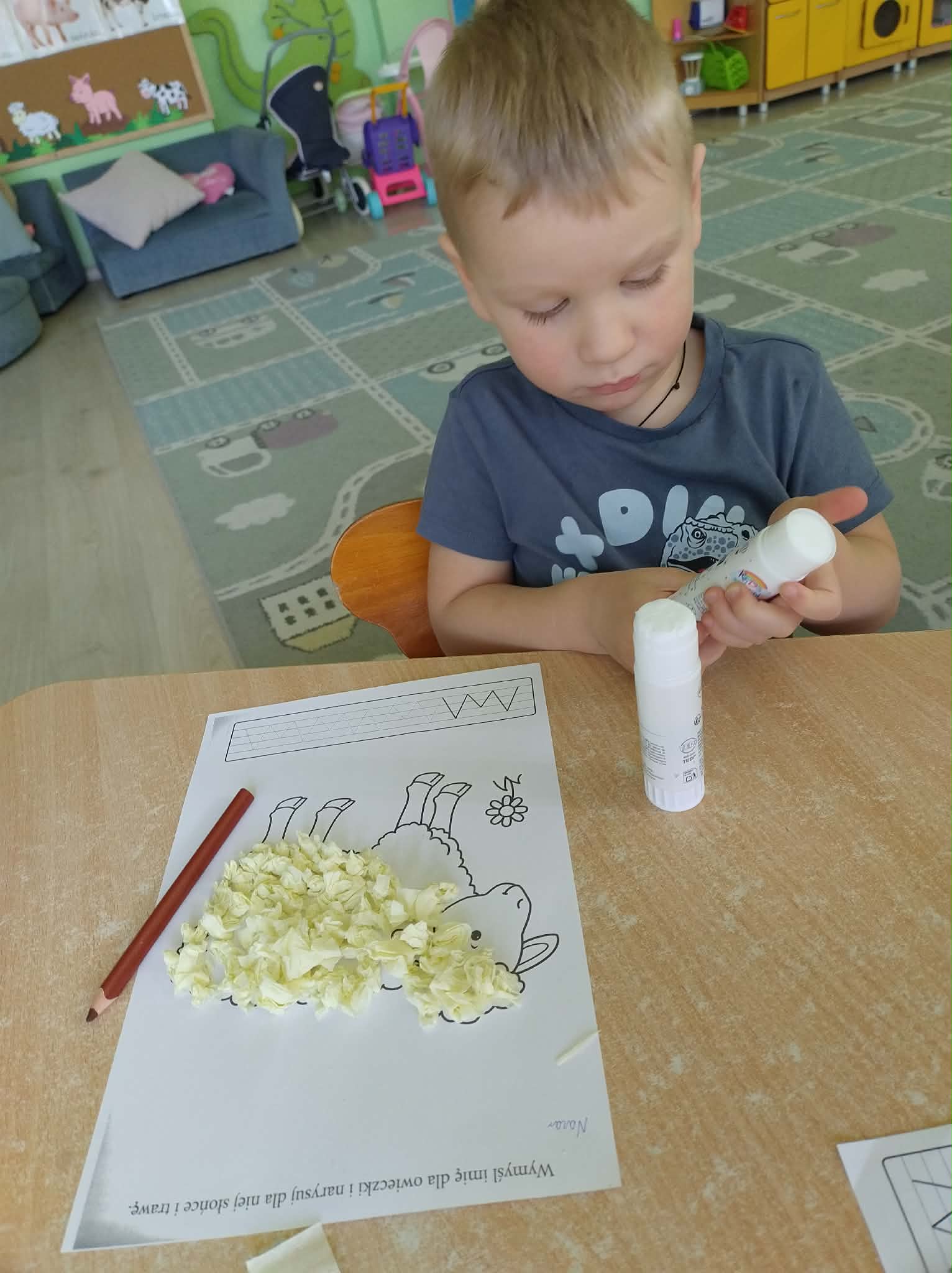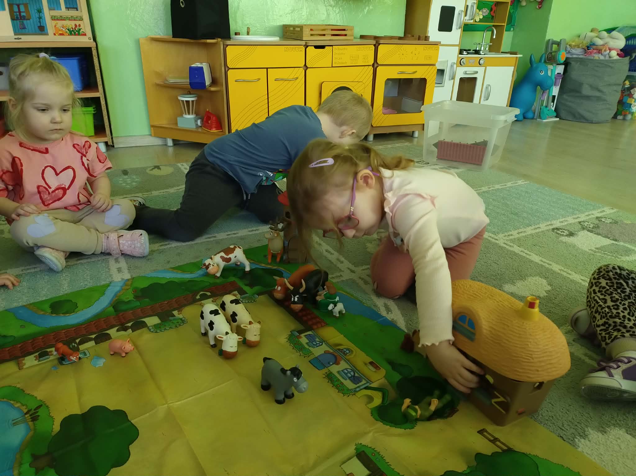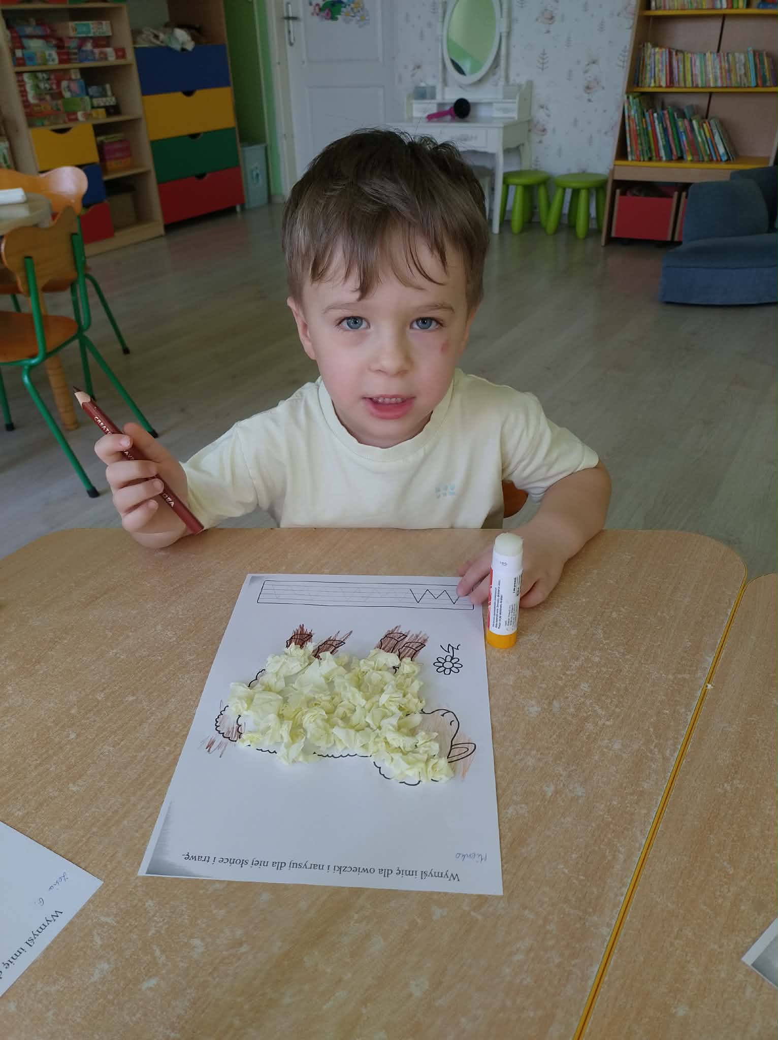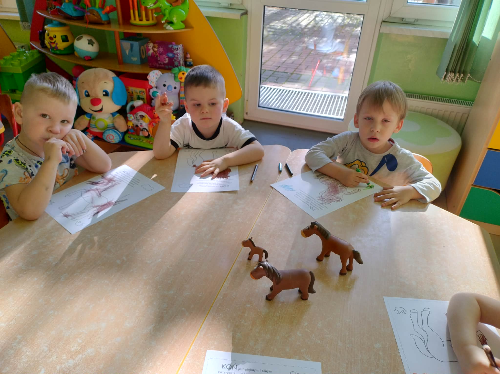 „Poznajemy zwierzęta gospodarskie”. Dzieci miały okazję dowiedzieć się, jakie zwierzęta mieszkają na wsi oraz jaką rolę pełnią w gospodarstwie. Podczas zajęć przedszkolaki oglądały obrazki i figurki zwierząt takich jak krowa, koń, świnia, kura, kaczka czy owca. Nauczycielka opowiadała, gdzie mieszkają te zwierzęta, czym się żywią oraz jakie produkty dzięki nim otrzymujemy, na przykład mleko, jajka czy wełnę. Dzieci chętnie naśladowały również odgłosy zwierząt, co sprawiło im wiele radości. Wspólnie zastanawiały się, jak mówi krowa, jak gdacze kura czy jak beczy owca. Była to świetna okazja do nauki poprzez zabawę. Nie zabrakło także zabaw ruchowych, podczas których przedszkolaki wcielały się w zwierzęta gospodarskie — chodziły jak kaczki, skakały jak koniki i naśladowały ich ruchy. Dzieci wykonały pracę plastyczną przedstawiającą wybrane zwierzęta z wiejskiego podwórka. Dzięki temu mogły utrwalić zdobytą wiedzę i rozwijać swoją kreatywność. Zajęcia były pełne śmiechu, ciekawostek i nowych doświadczeń. Dzieci z dużym zainteresowaniem poznawały świat zwierząt gospodarskich i świetnie się przy tym bawiły.