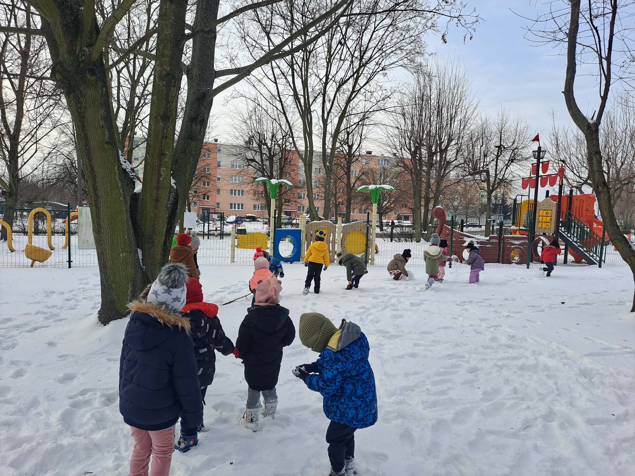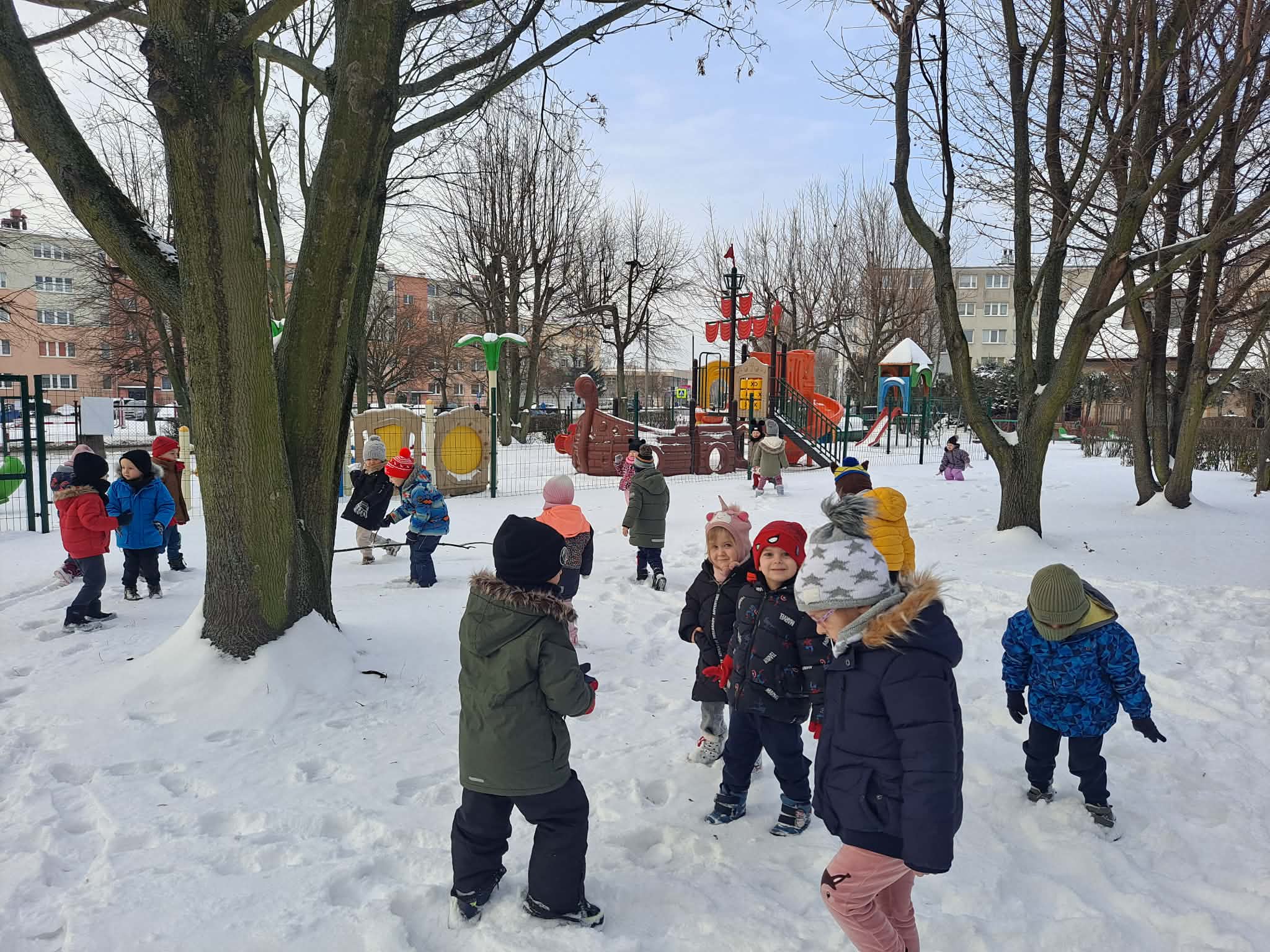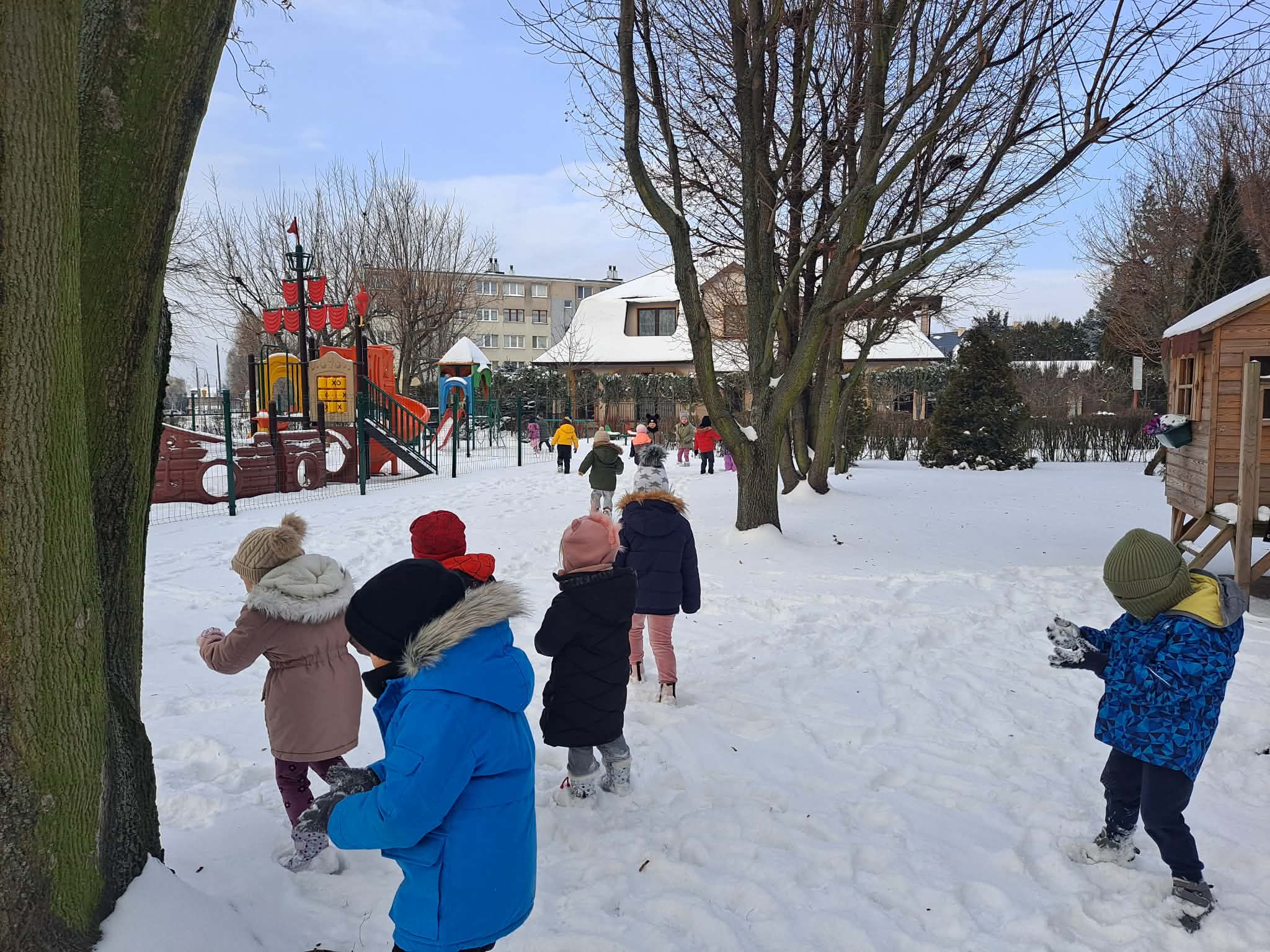 Dziś dzieci miały okazję skorzystać z zimowej aury i wyjść na teren ogrodu przedszkolnego, gdzie radośnie bawiły się w śniegu.