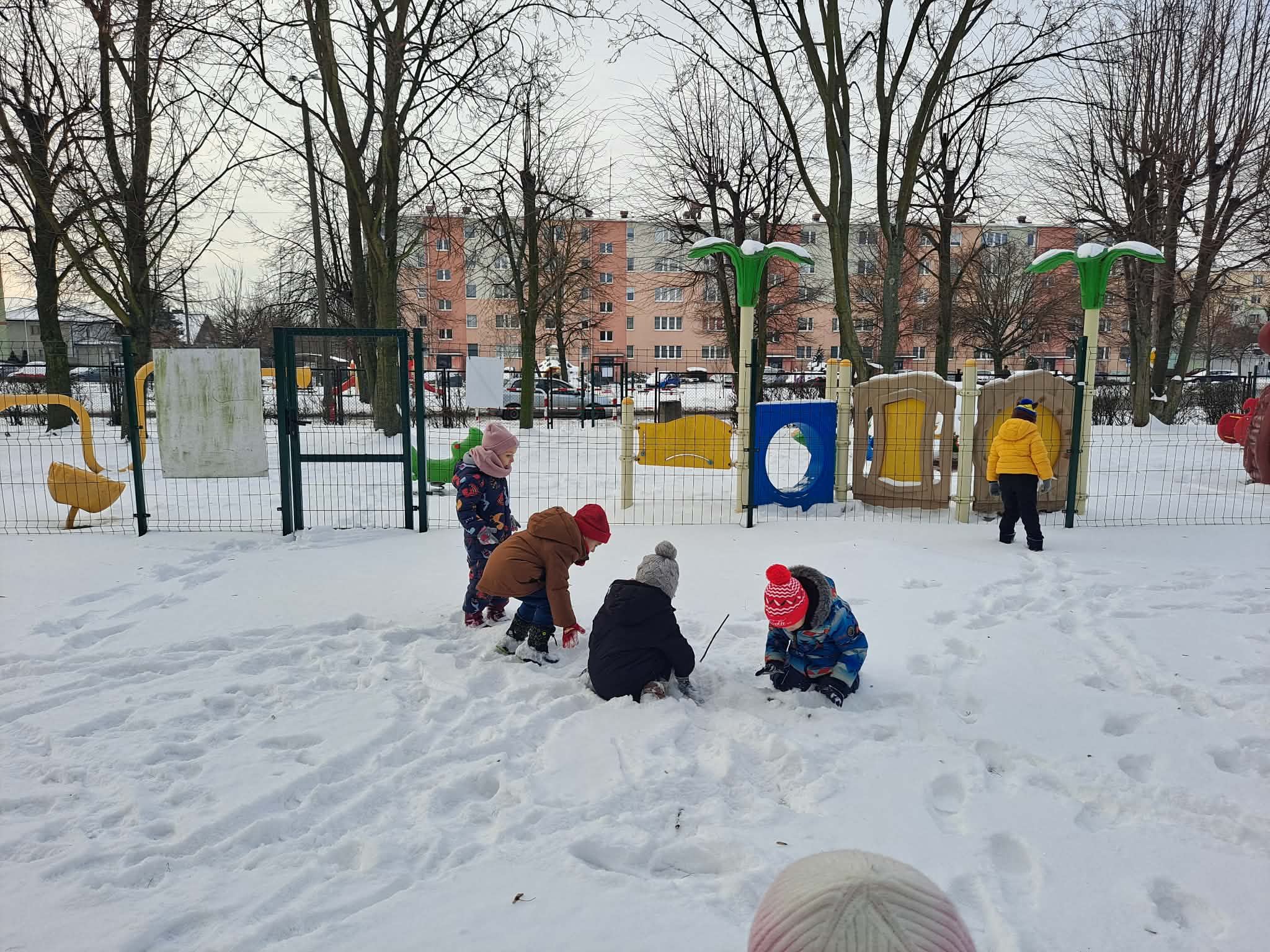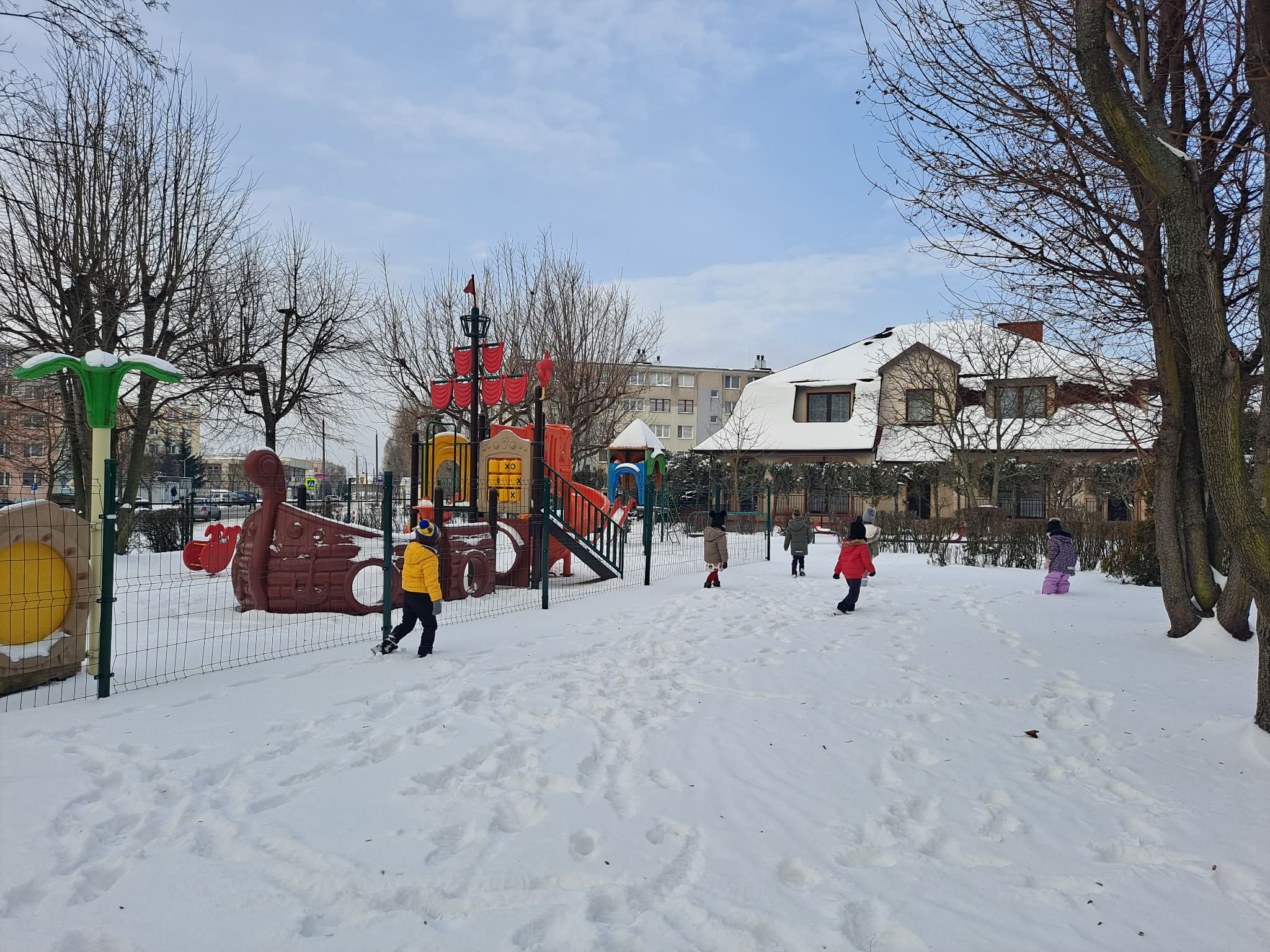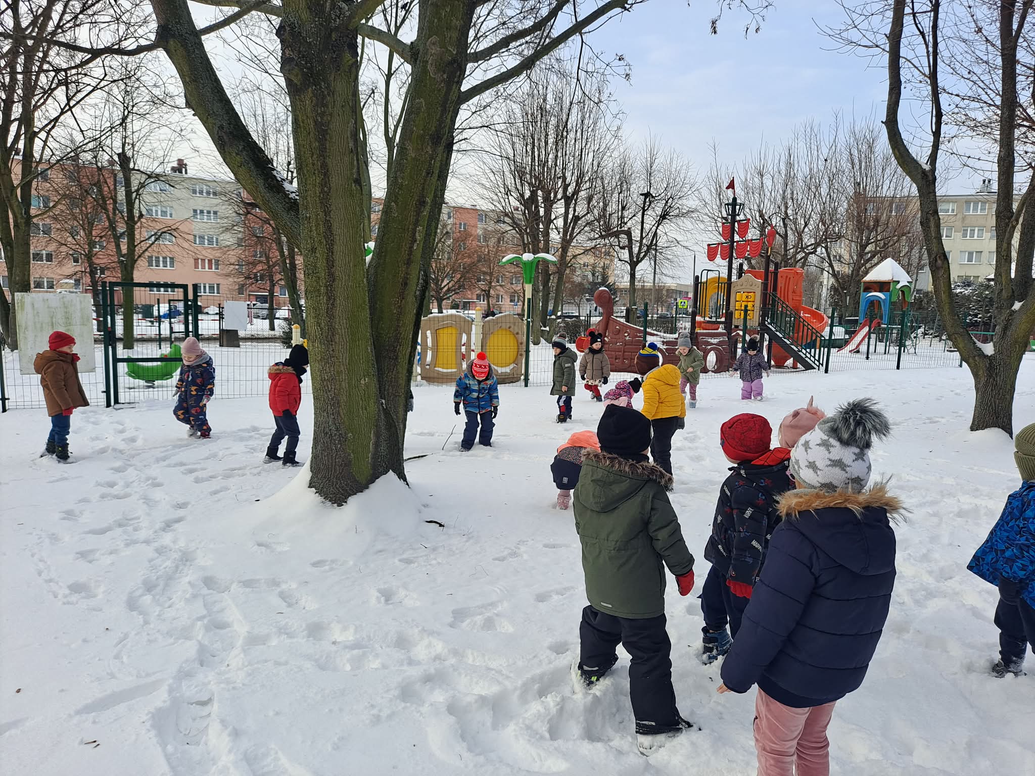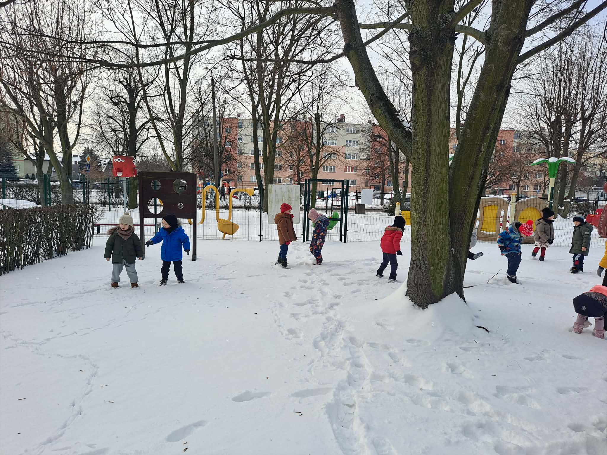 Dziś dzieci miały okazję skorzystać z zimowej aury i wyjść na teren ogrodu przedszkolnego, gdzie radośnie bawiły się w śniegu.