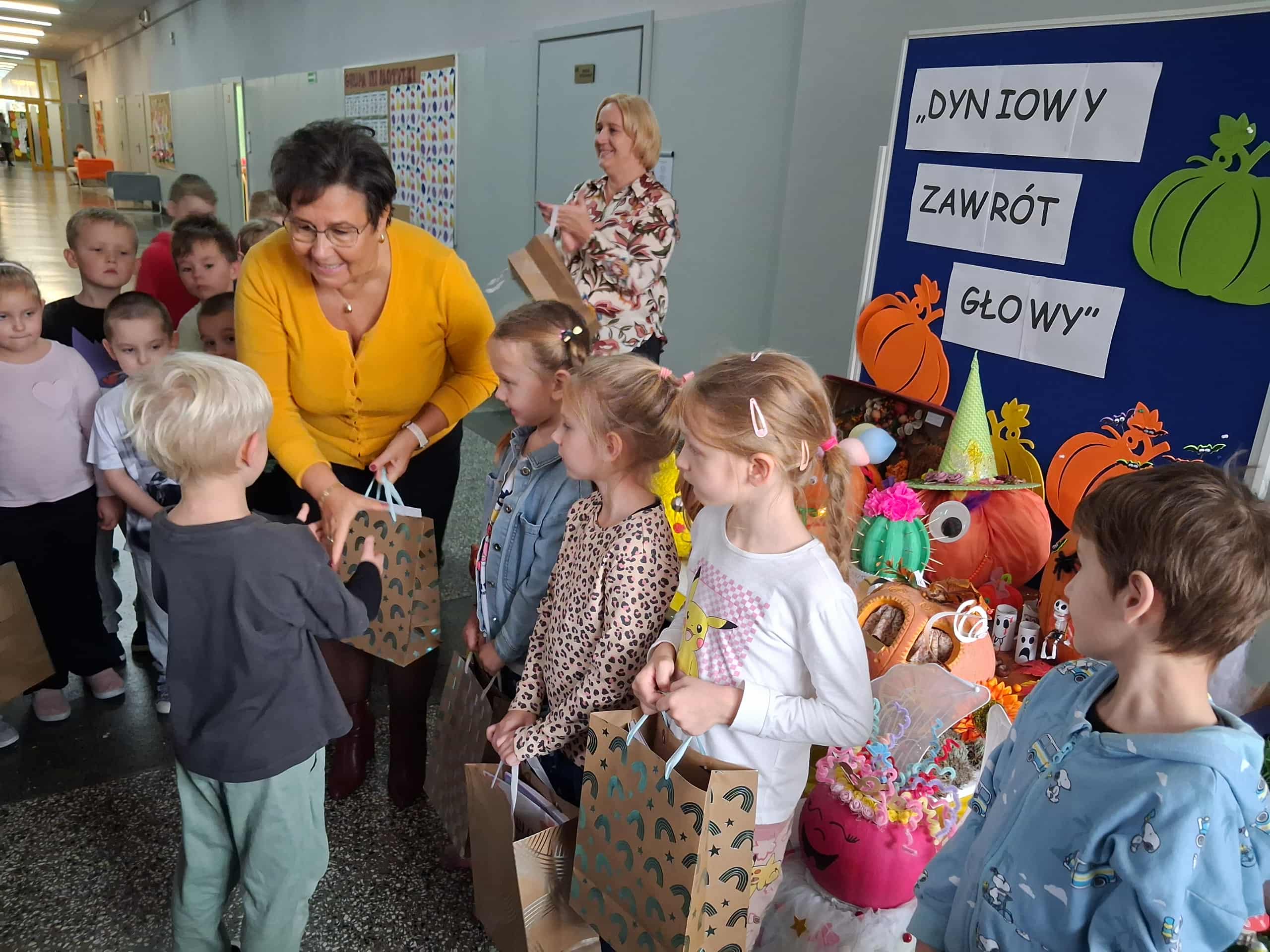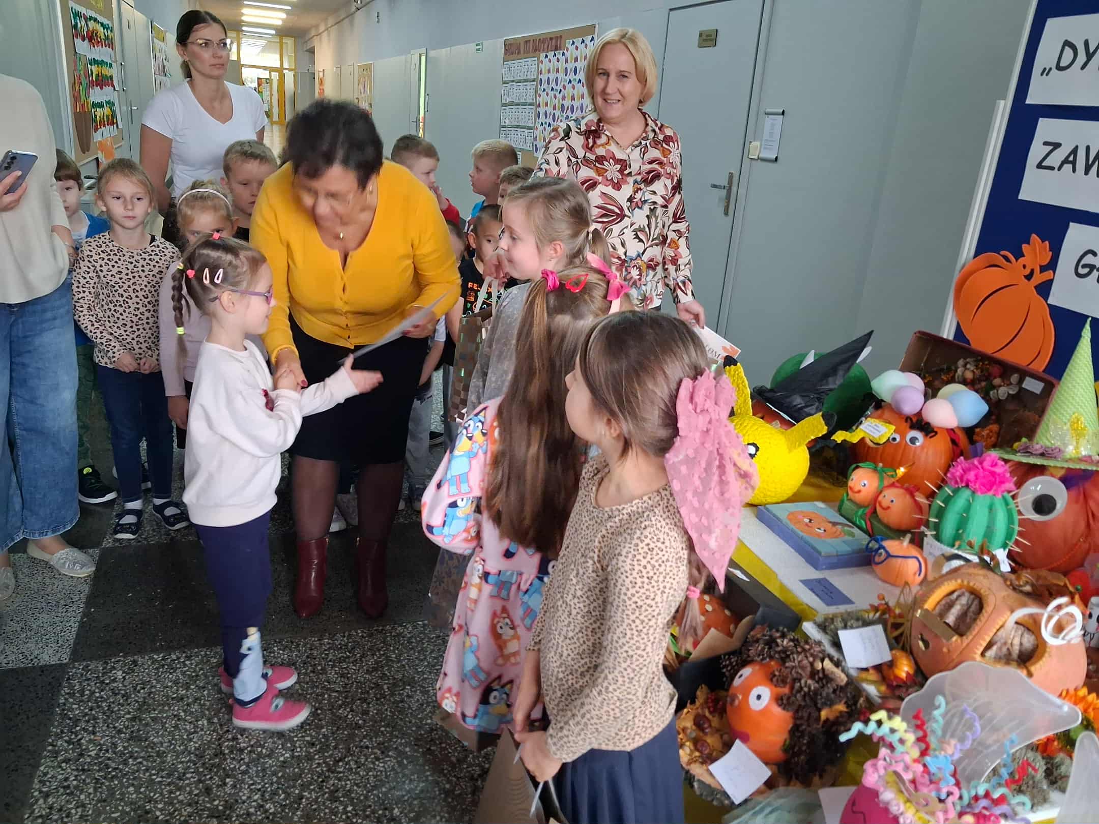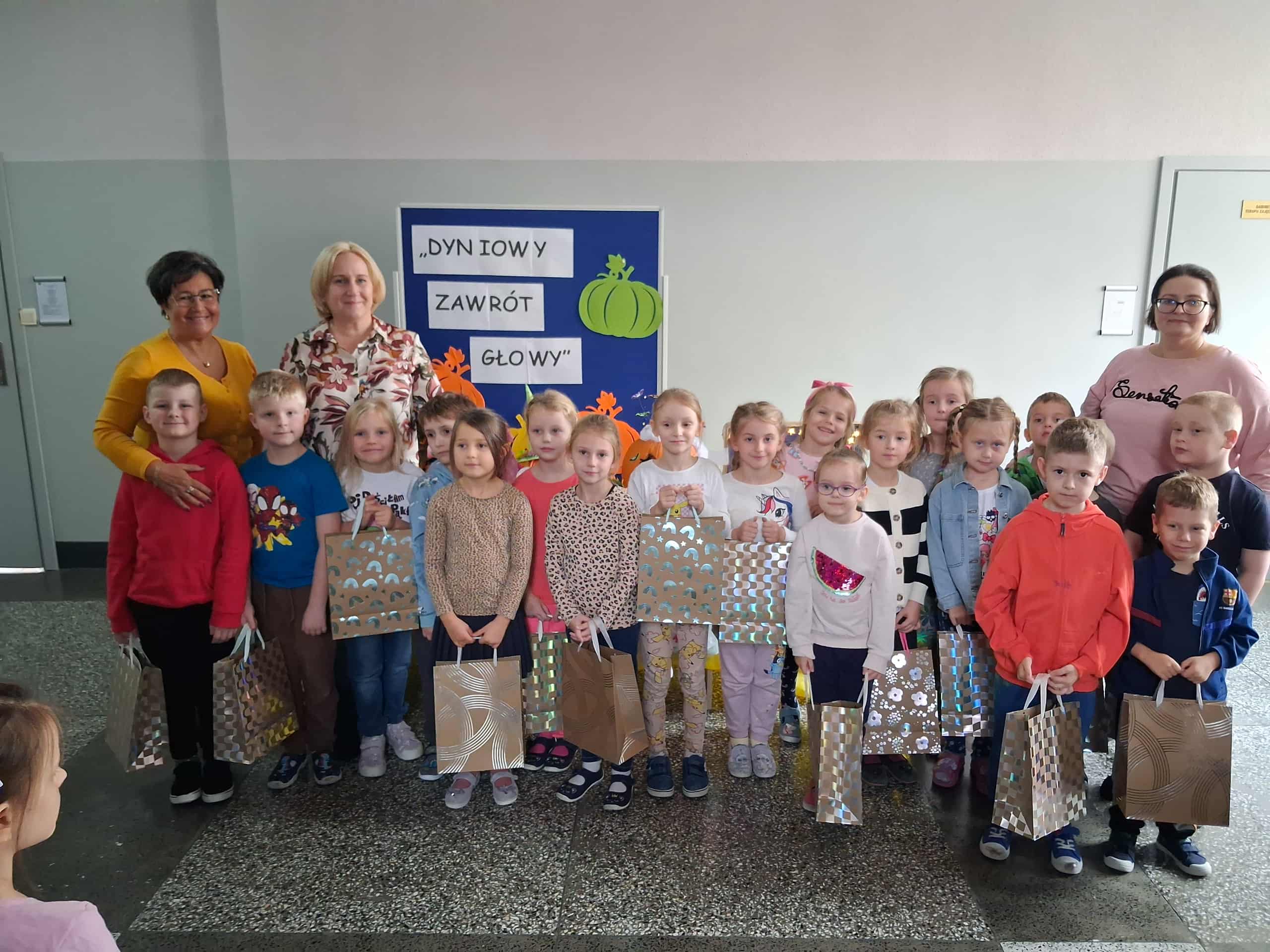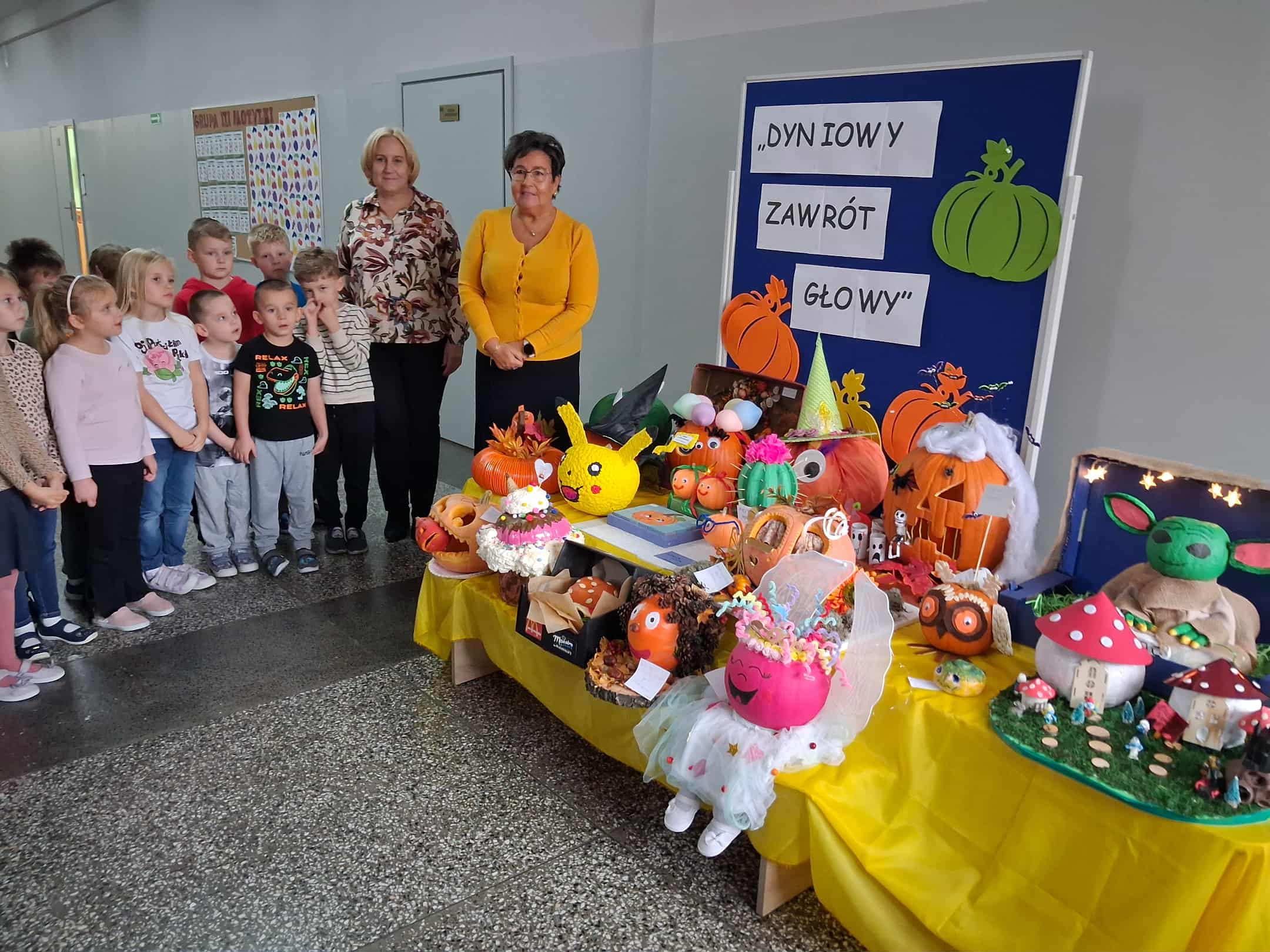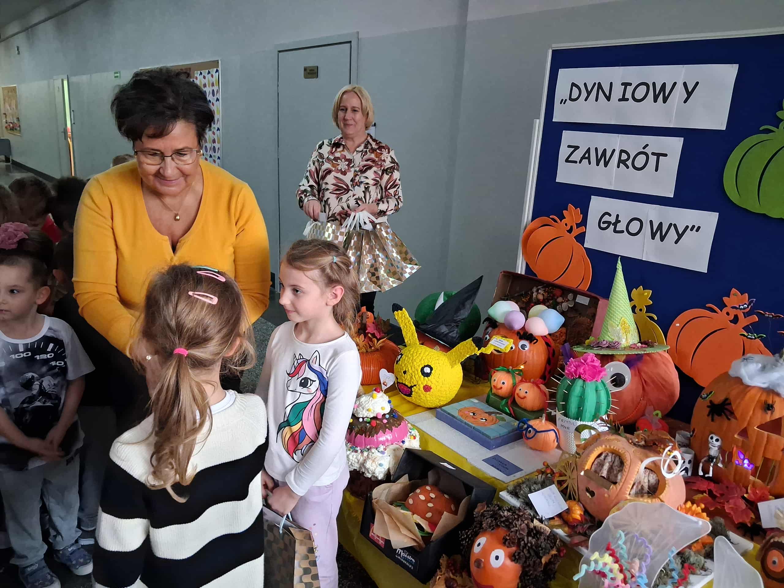 W październiku dzieci z grup najstarszych naszego przedszkola wzięły udział w konkursie plastycznym na pracę przestrzenną "Dyniowy zawrót głowy". Wraz z rodzicami przygotowały w domach przepiękne, bardzo pomysłowe prace. Na konkurs wpłynęło 20 dyniowych arcydzieł, a podziwiać je mogliśmy na urządzonej wystawie na holu szkoły. W dniu 30 października nastąpiło uroczyste rozstrzygnięcie konkursu i wręczenie nagród oraz pamiątkowych dyplomów przez p. dyrektor Jolantę Siudę i organizatorki konkursu - p. Angelikę Ziółkowską i p. Annę Pałczyńską. Z uwagi na bardzo wysoki poziom konkursu wszyscy uczestnicy znaleźli się na podium i zdobyli zasłużone nagrody. Gratulujemy dzieciom i ich rodzicom pomysłowości i wkładu pracy w wykonanie dyniowych dzieł.