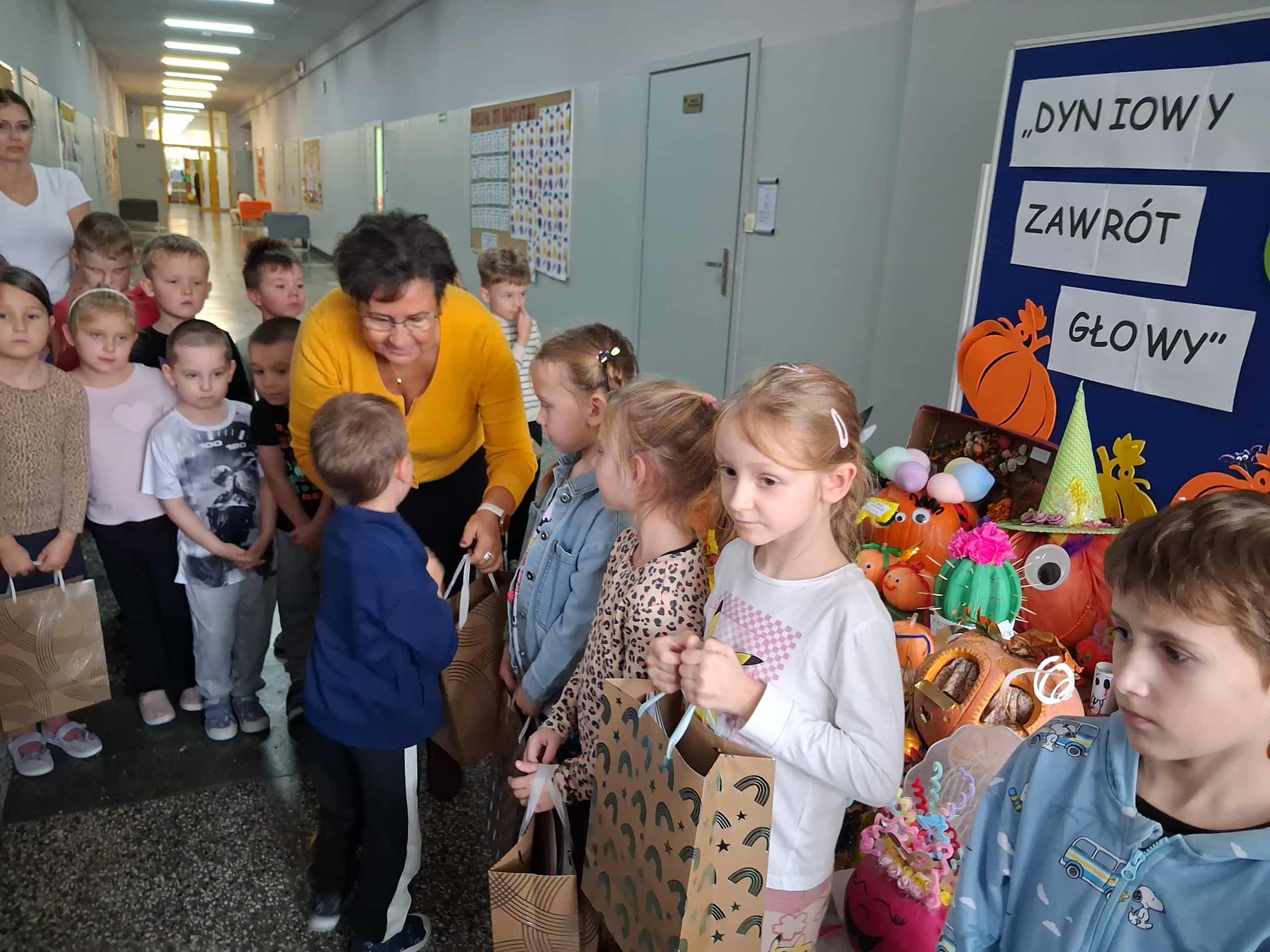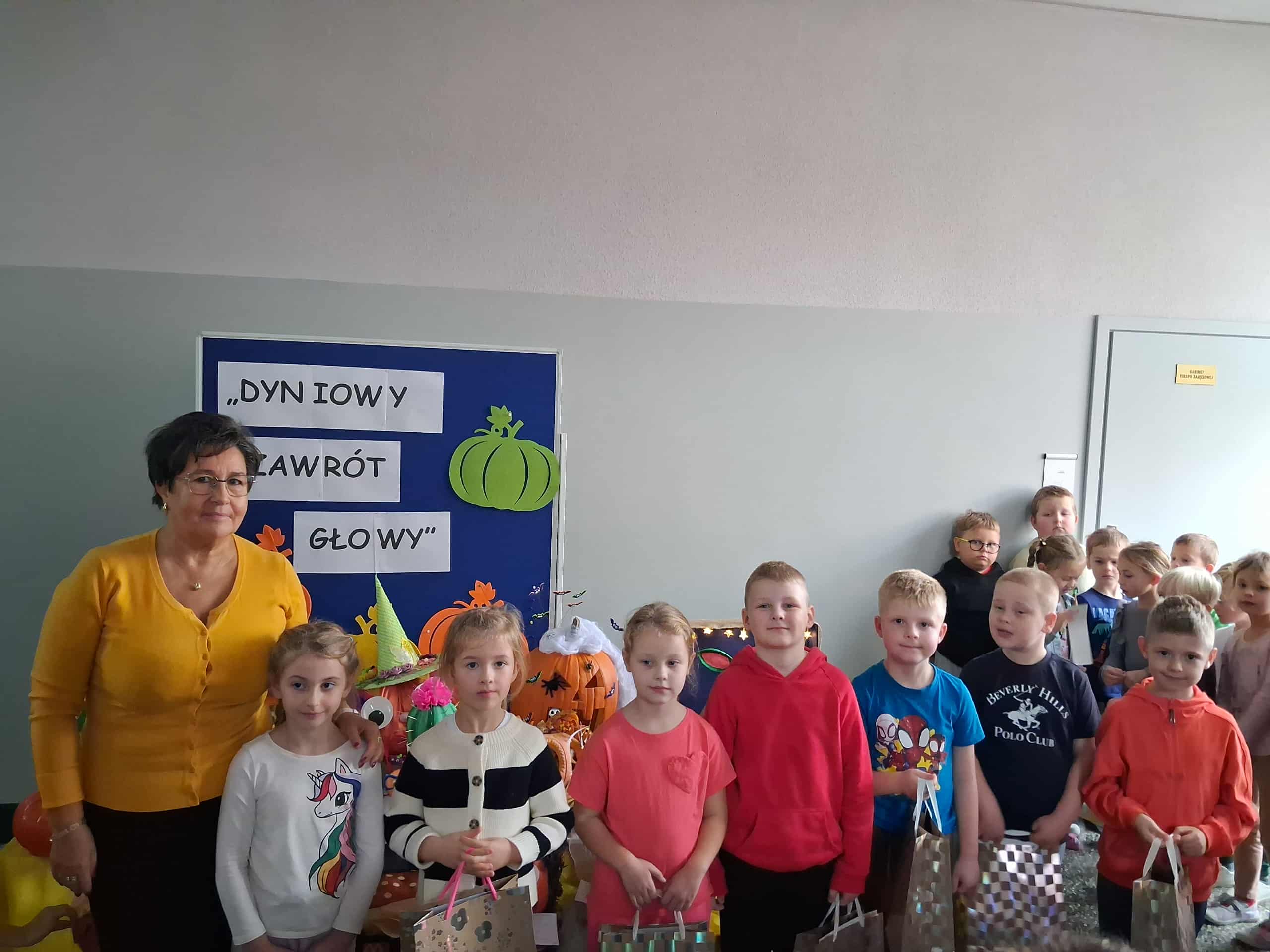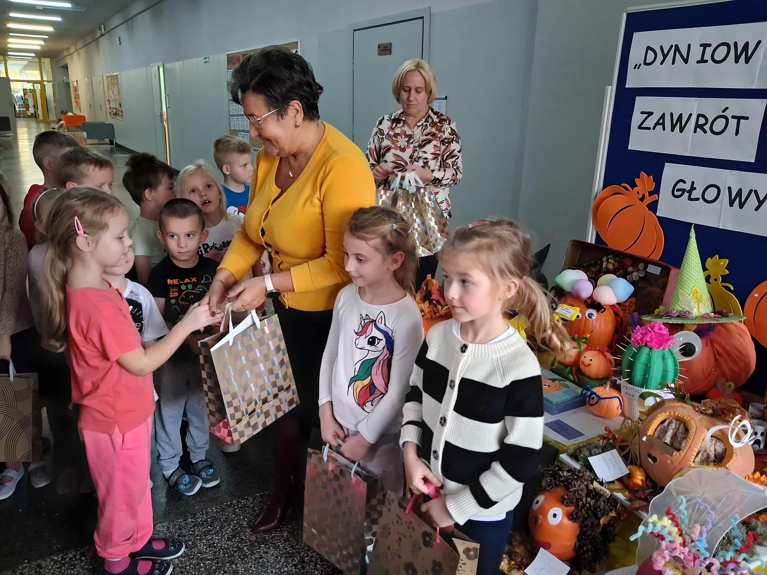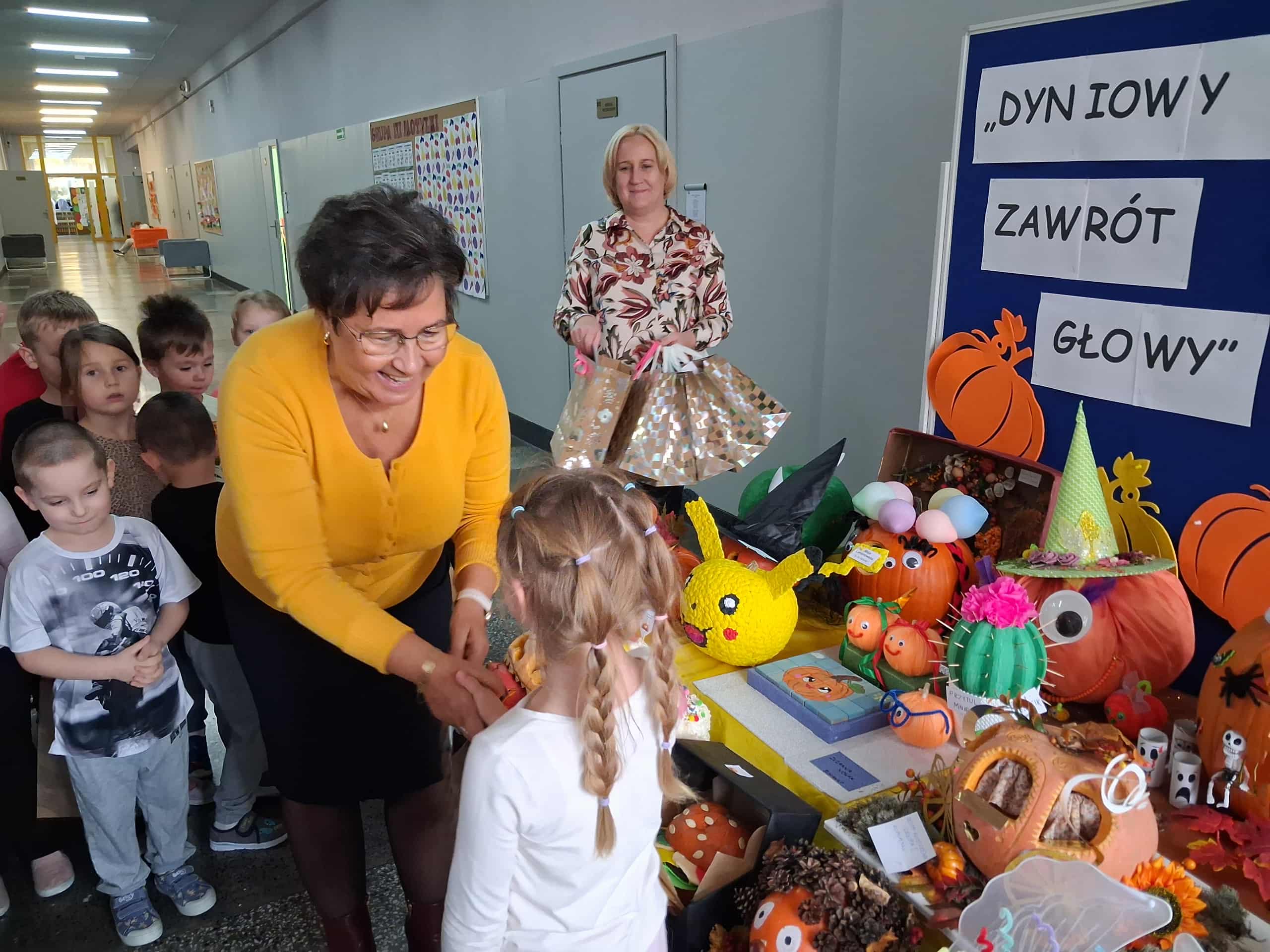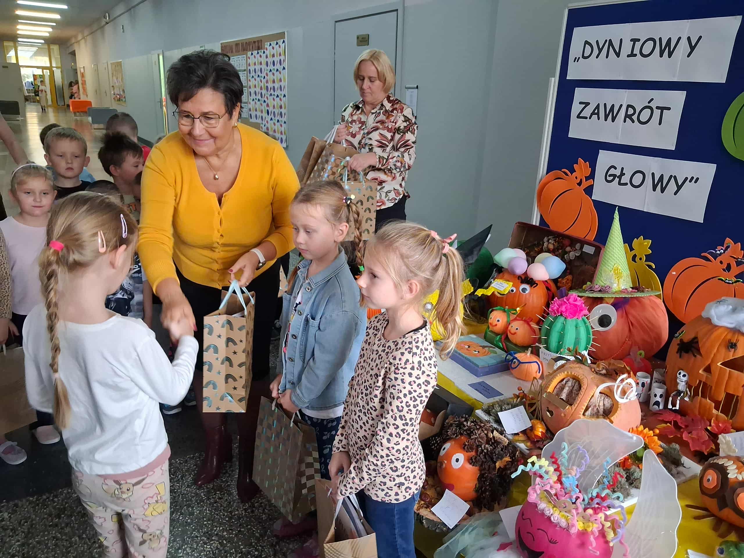 W październiku dzieci z grup najstarszych naszego przedszkola wzięły udział w konkursie plastycznym na pracę przestrzenną "Dyniowy zawrót głowy". Wraz z rodzicami przygotowały w domach przepiękne, bardzo pomysłowe prace. Na konkurs wpłynęło 20 dyniowych arcydzieł, a podziwiać je mogliśmy na urządzonej wystawie na holu szkoły. W dniu 30 października nastąpiło uroczyste rozstrzygnięcie konkursu i wręczenie nagród oraz pamiątkowych dyplomów przez p. dyrektor Jolantę Siudę i organizatorki konkursu - p. Angelikę Ziółkowską i p. Annę Pałczyńską. Z uwagi na bardzo wysoki poziom konkursu wszyscy uczestnicy znaleźli się na podium i zdobyli zasłużone nagrody. Gratulujemy dzieciom i ich rodzicom pomysłowości i wkładu pracy w wykonanie dyniowych dzieł.
