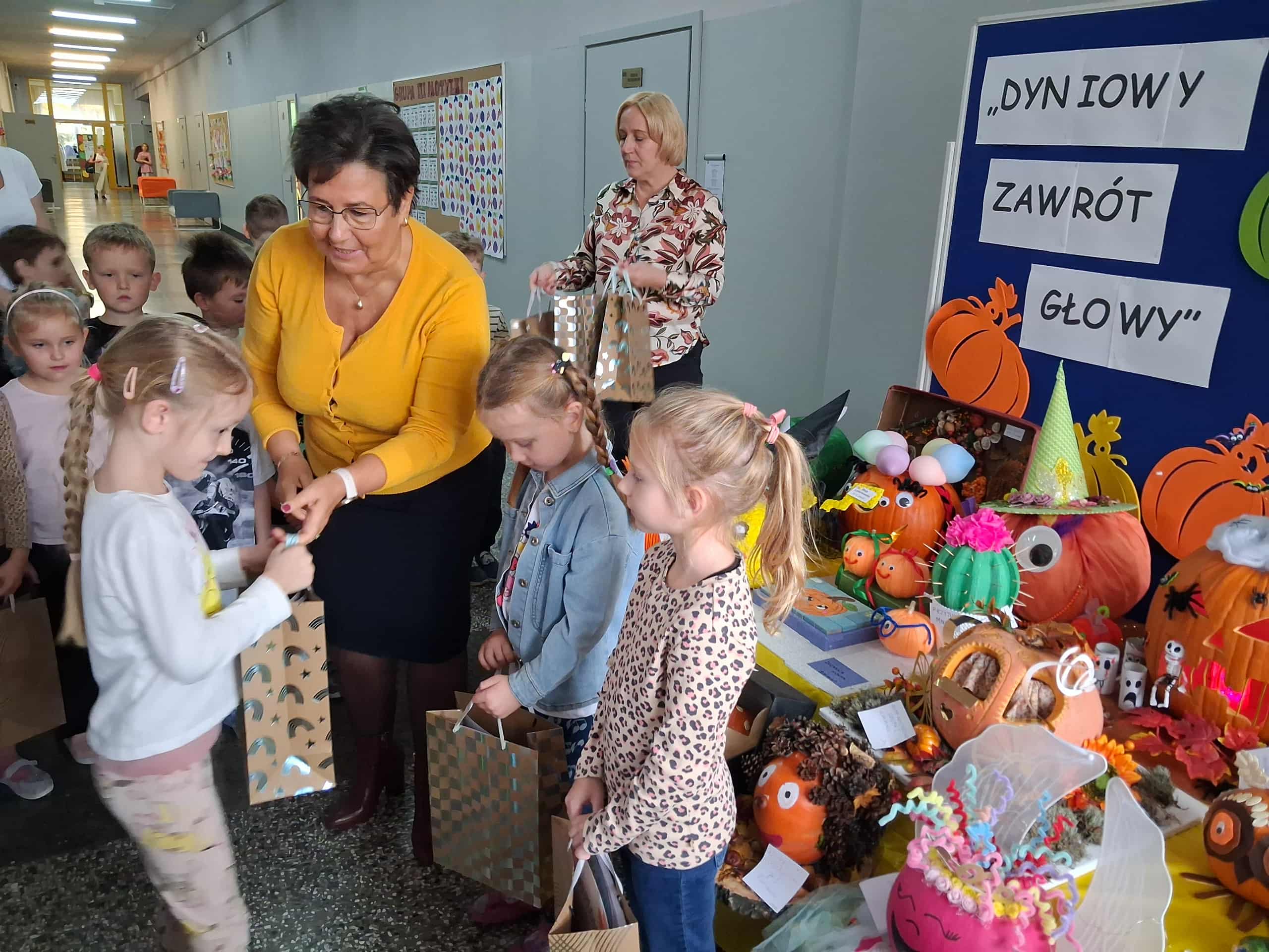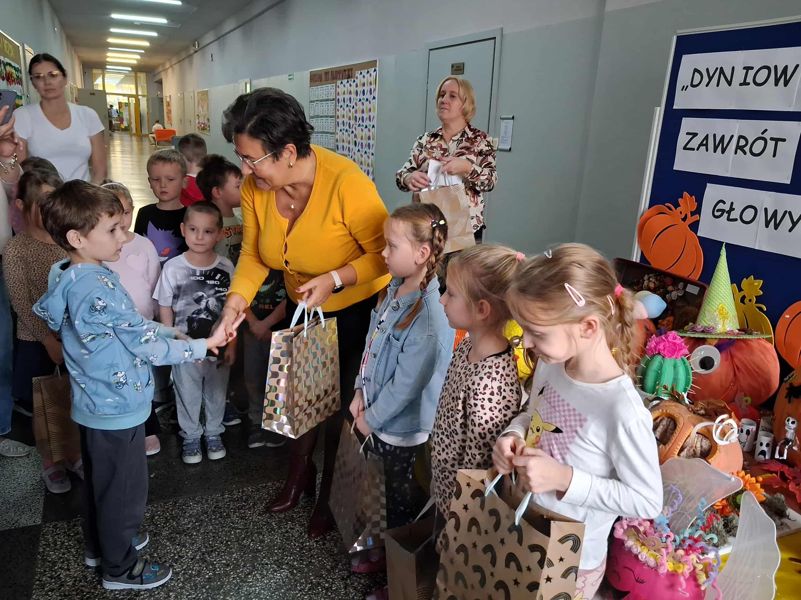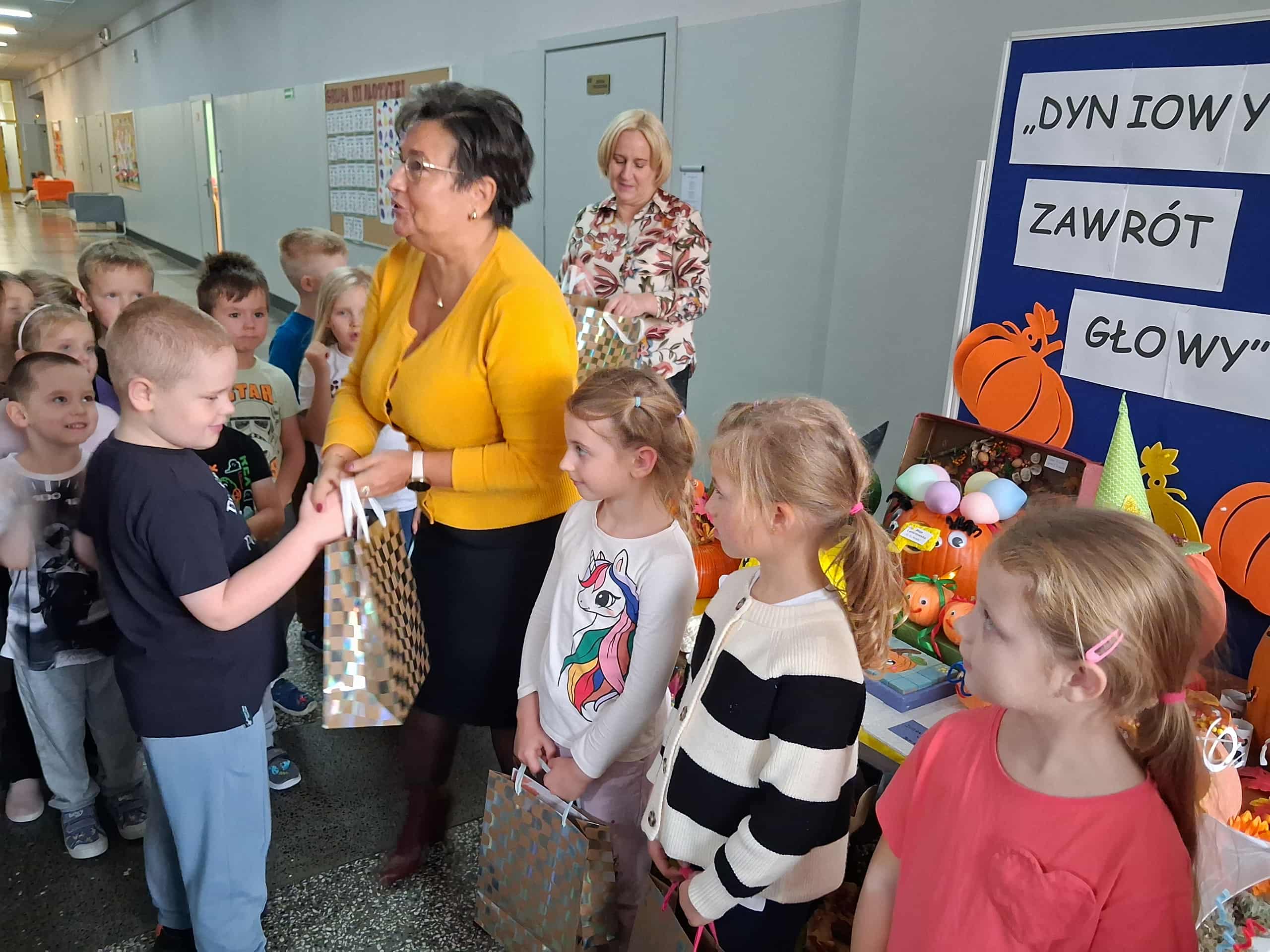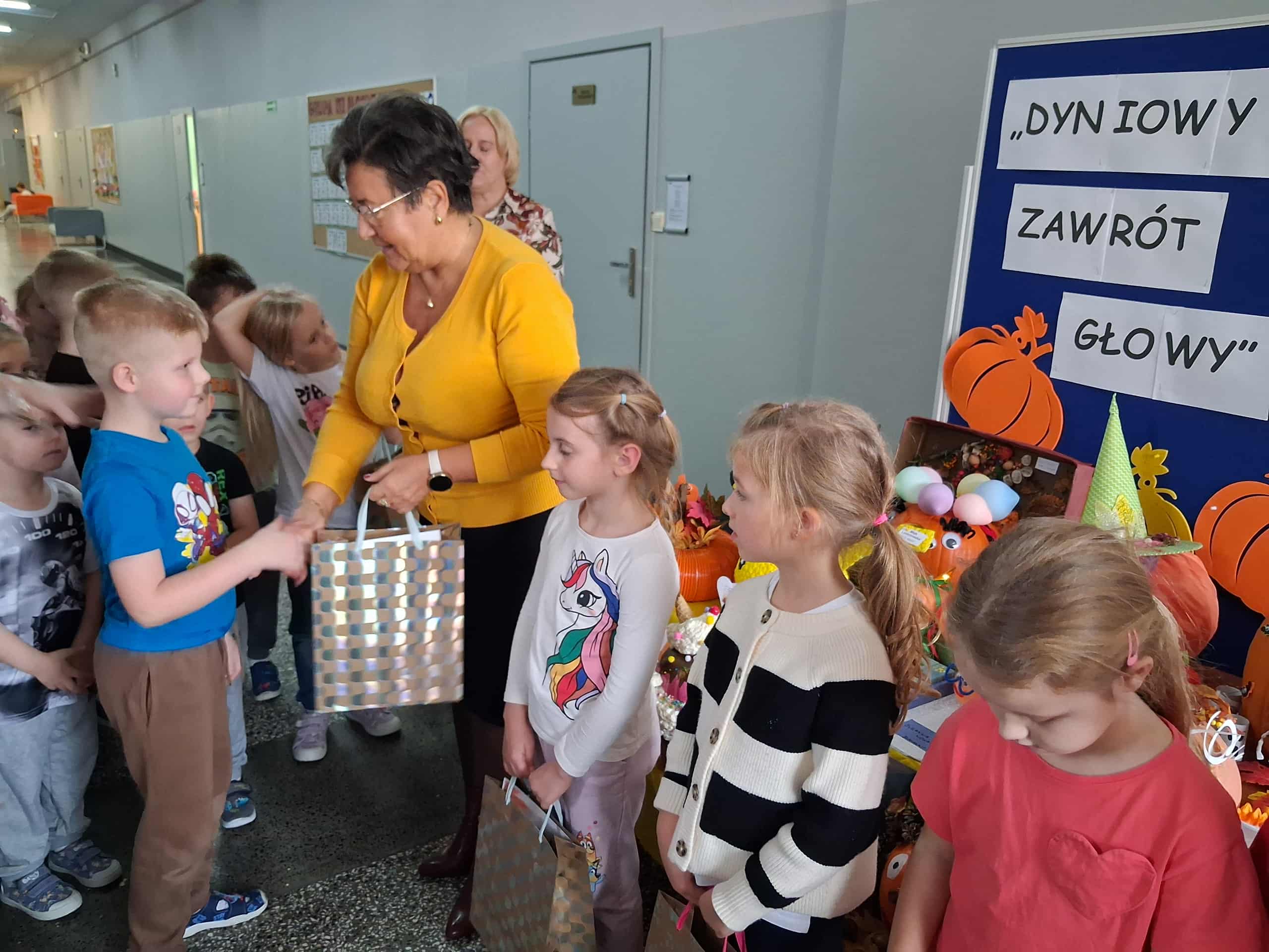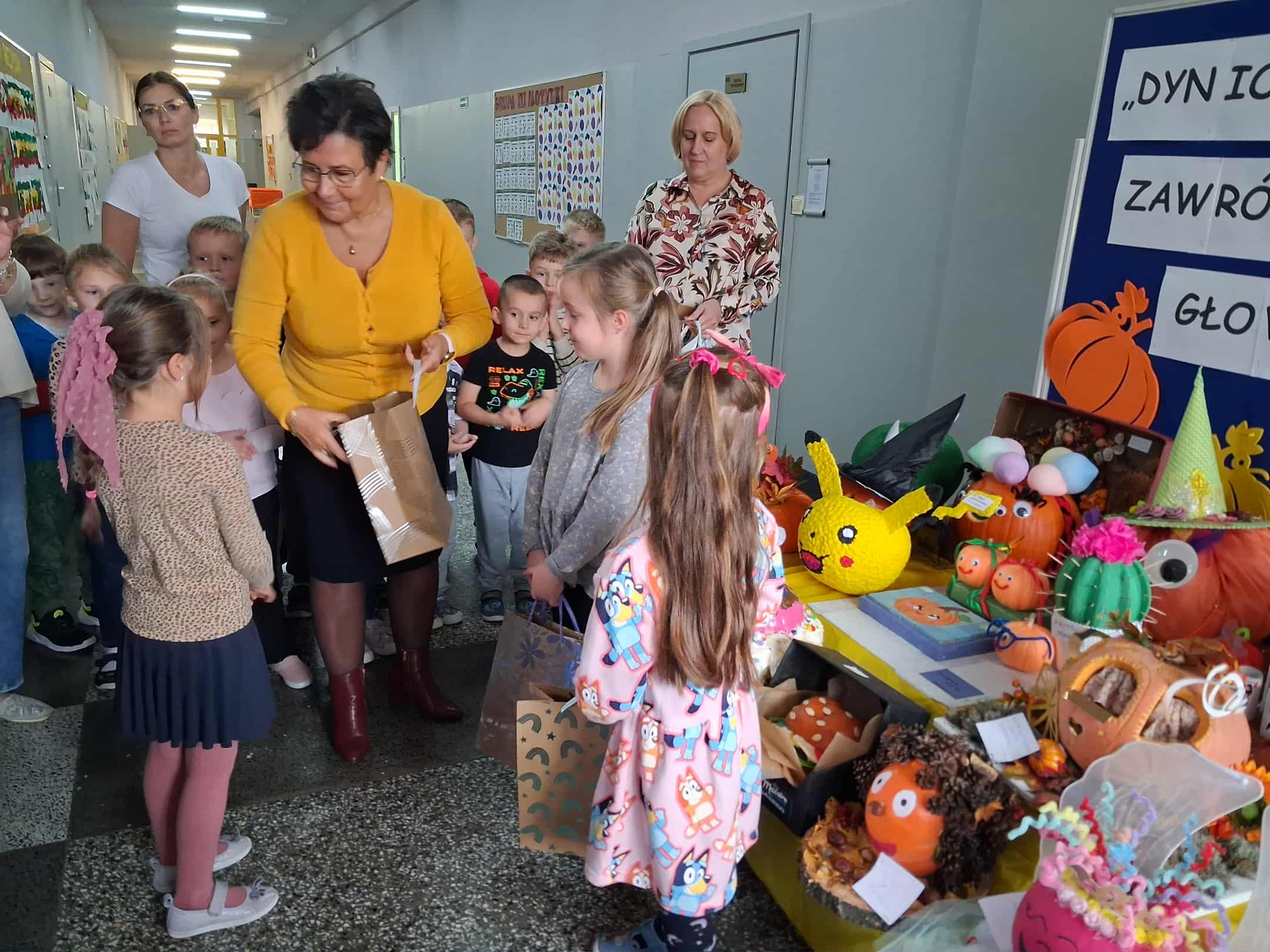 W październiku dzieci z grup najstarszych naszego przedszkola wzięły udział w konkursie plastycznym na pracę przestrzenną "Dyniowy zawrót głowy". Wraz z rodzicami przygotowały w domach przepiękne, bardzo pomysłowe prace. Na konkurs wpłynęło 20 dyniowych arcydzieł, a podziwiać je mogliśmy na urządzonej wystawie na holu szkoły. W dniu 30 października nastąpiło uroczyste rozstrzygnięcie konkursu i wręczenie nagród oraz pamiątkowych dyplomów przez p. dyrektor Jolantę Siudę i organizatorki konkursu - p. Angelikę Ziółkowską i p. Annę Pałczyńską. Z uwagi na bardzo wysoki poziom konkursu wszyscy uczestnicy znaleźli się na podium i zdobyli zasłużone nagrody. Gratulujemy dzieciom i ich rodzicom pomysłowości i wkładu pracy w wykonanie dyniowych dzieł.