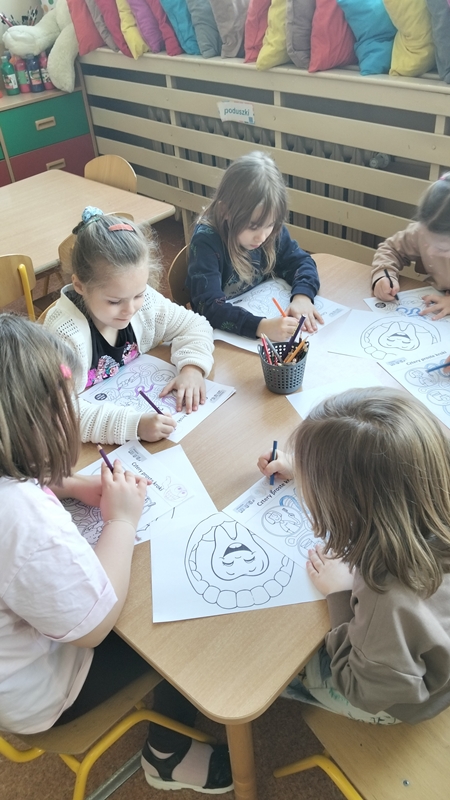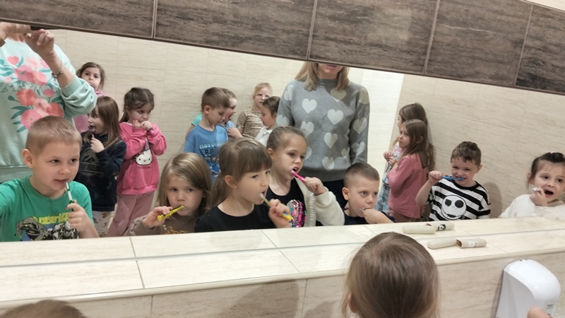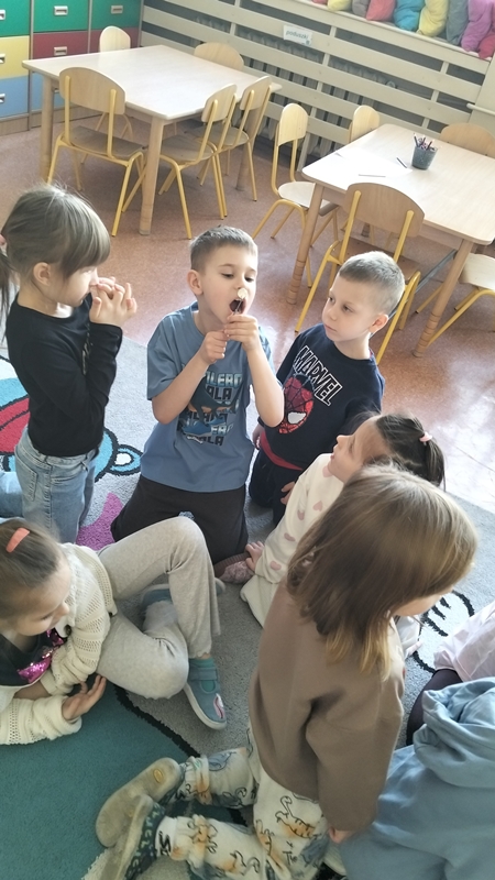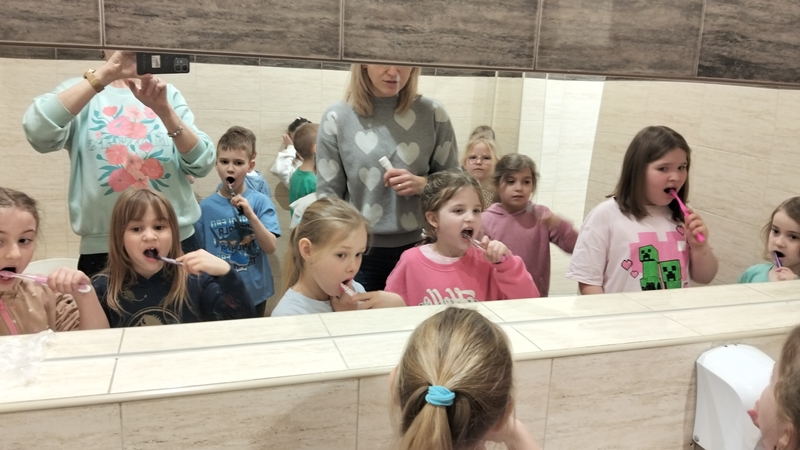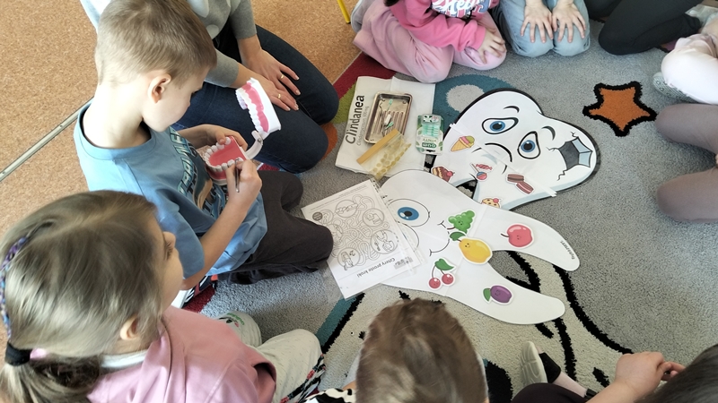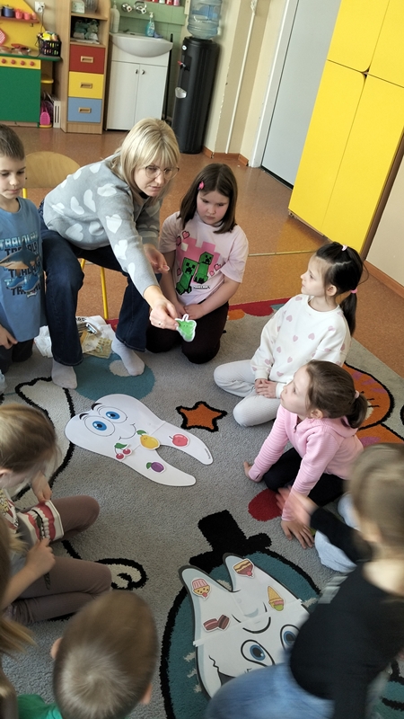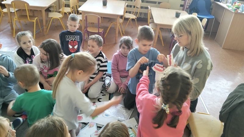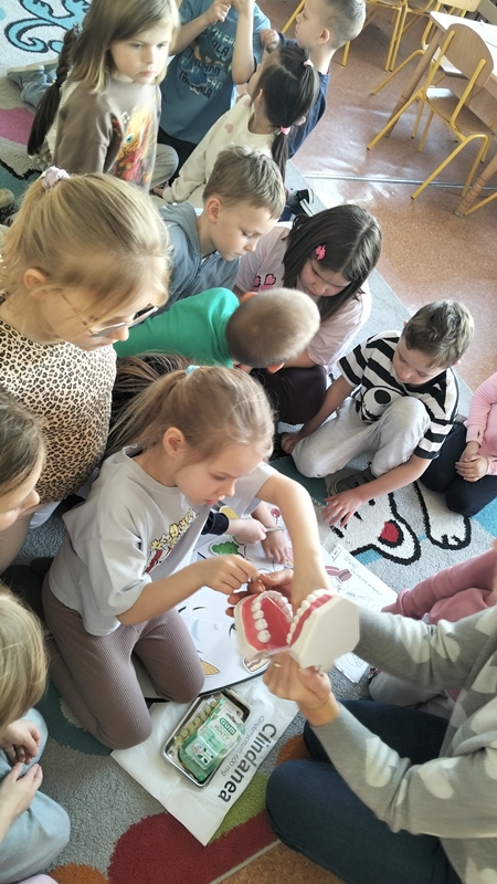 10 marca odbyło się spotkanie z higienistką stomatologiczną, które miało na celu edukację zdrowotną dzieci, ucząc je prawidłowego mycia zębów i dbania o nie. Dzieci dowiedziały się o szkodliwości produktów słodkich, które negatywnie wpływają na ząbki. Nasza grupa dowiedziała się wielu ciekawostek na temat zdrowego odżywiania i wpływu diety na zdrowe ząbki. Dziękujemy Pani Izie za przeprowadzenie ciekawych zajęć edukacyjnych i za drobne upominki.