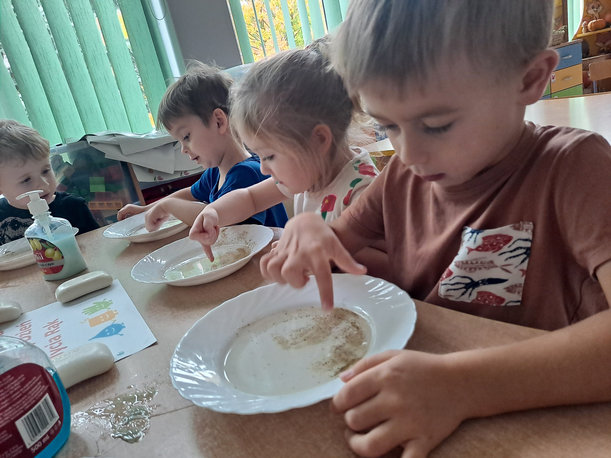 Wykonaliśmy również ciekawy eksperyment z wodą, pieprzem i mydłem, który pokazał, jak mydło „ucieka” przed brudem i zarazkami.