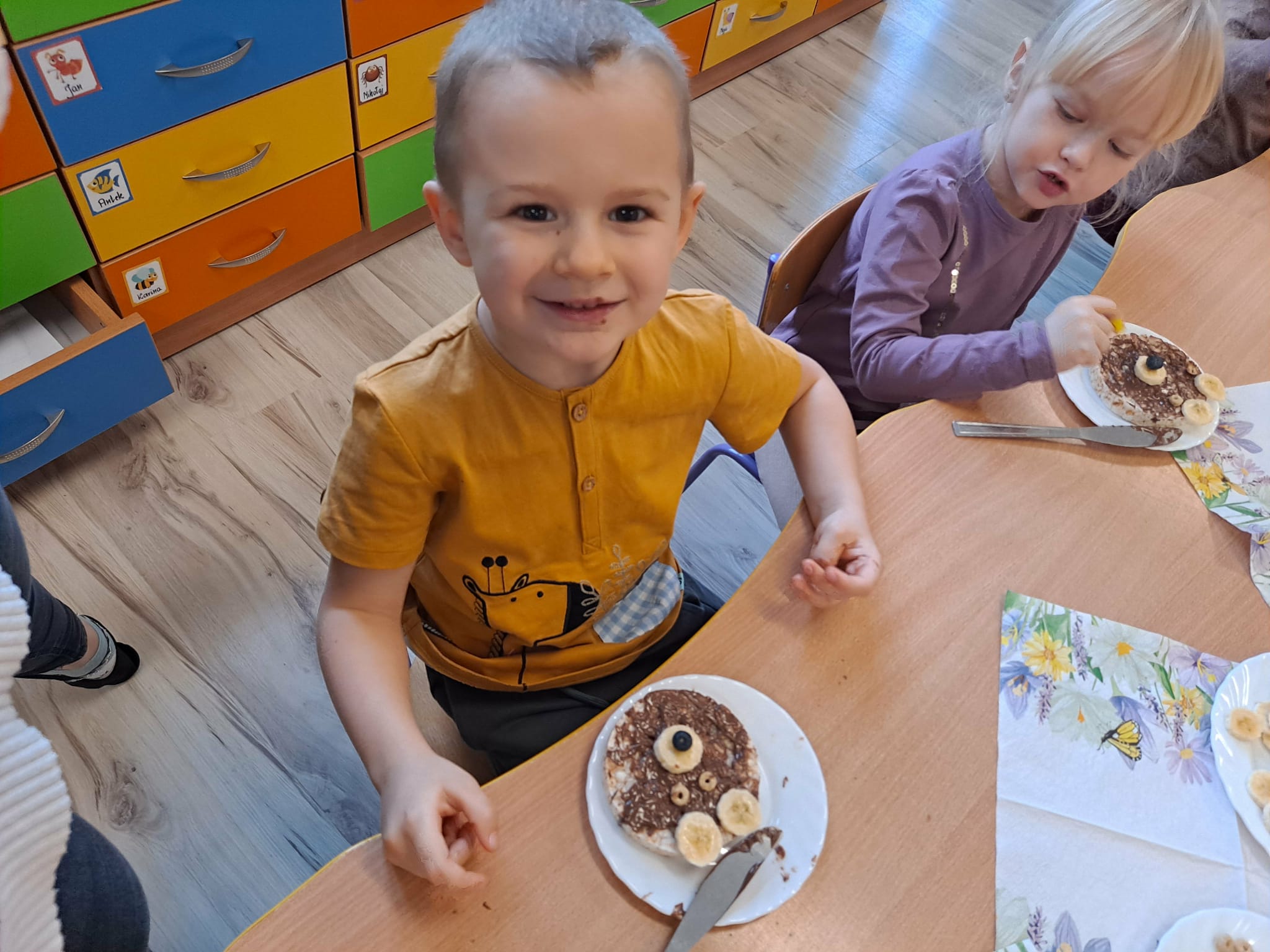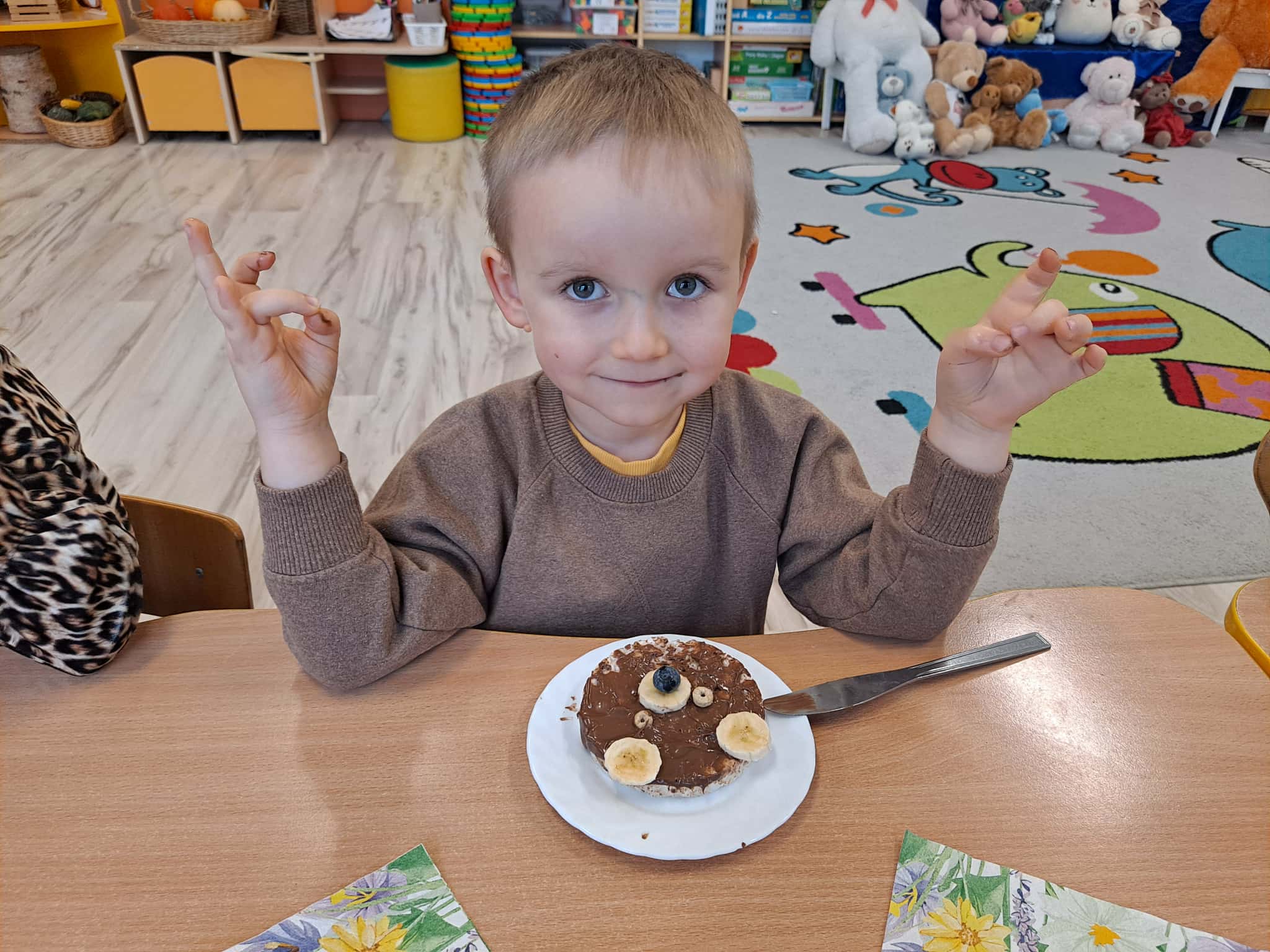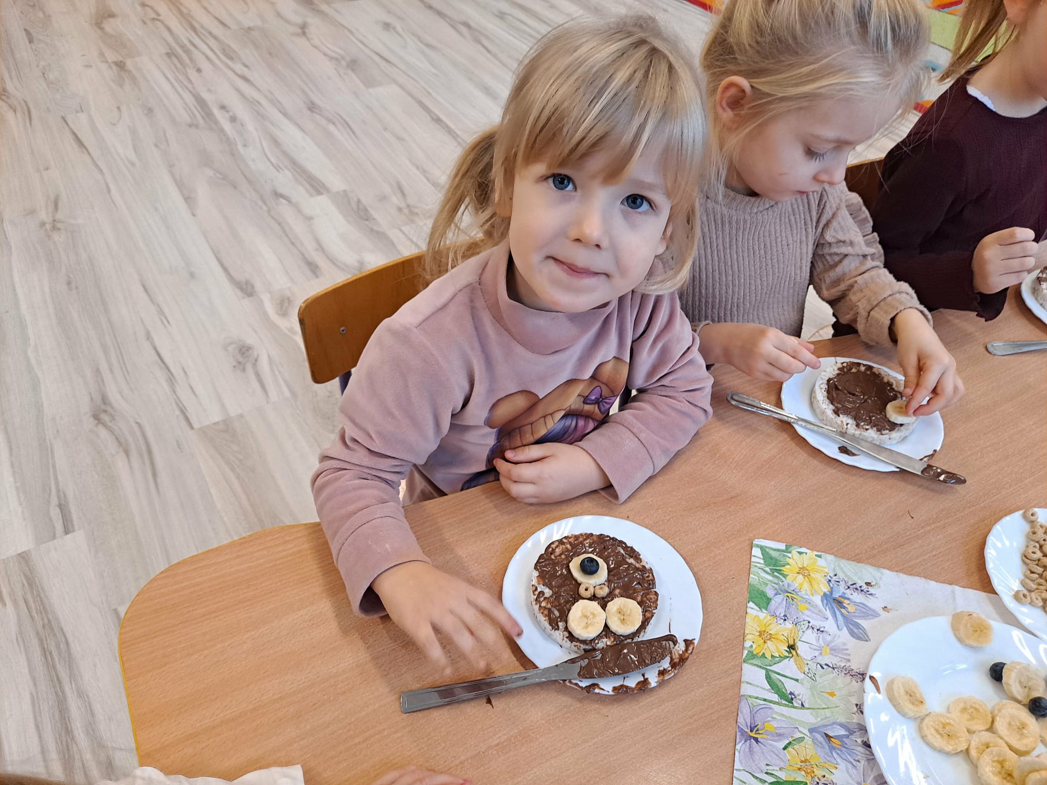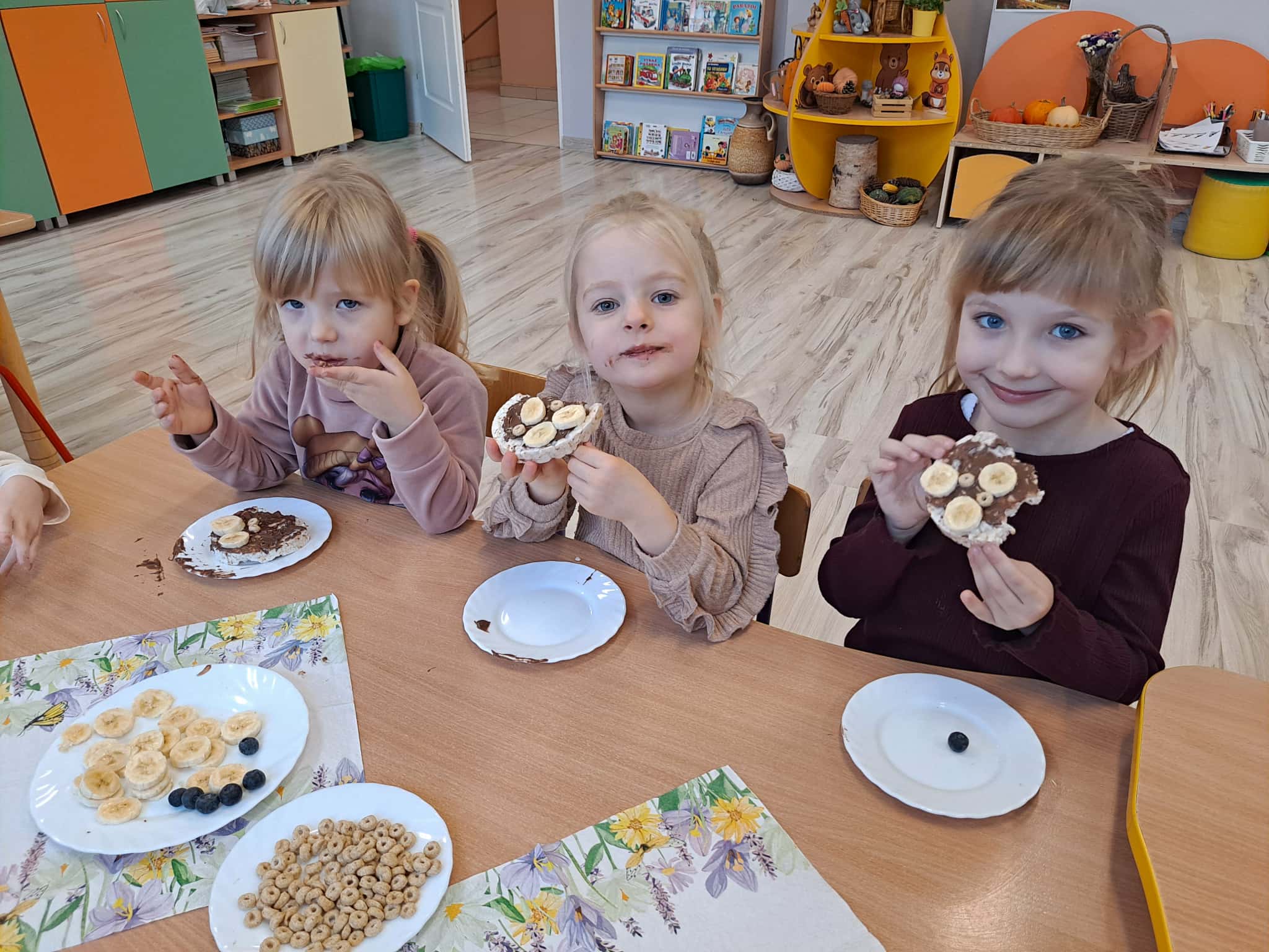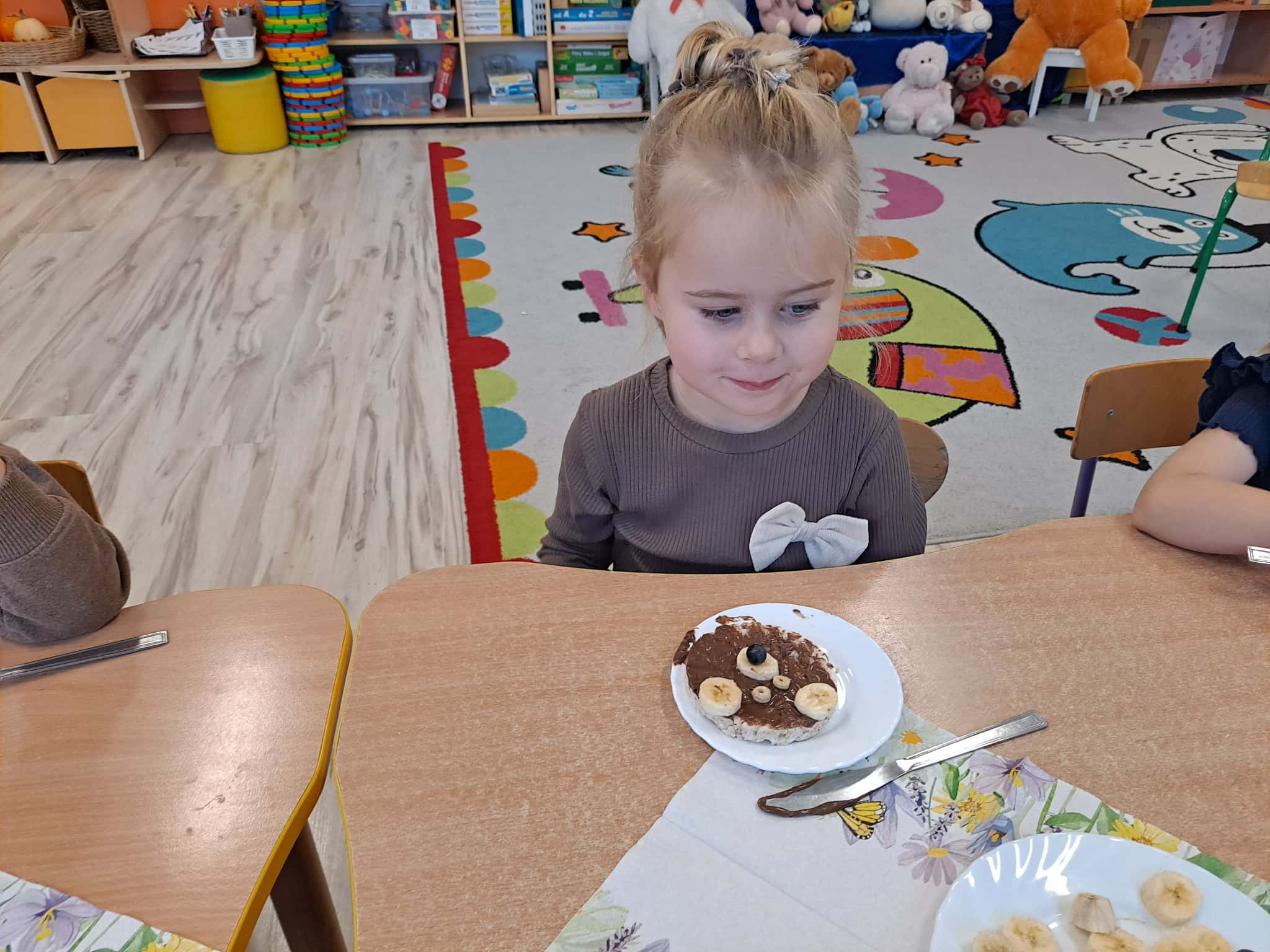 Każde dziecko wykonało „główkę misia” z wafla ryżowego, smarując go czekoladą i ozdabiając ją bananami oraz płatkami śniadaniowymi.