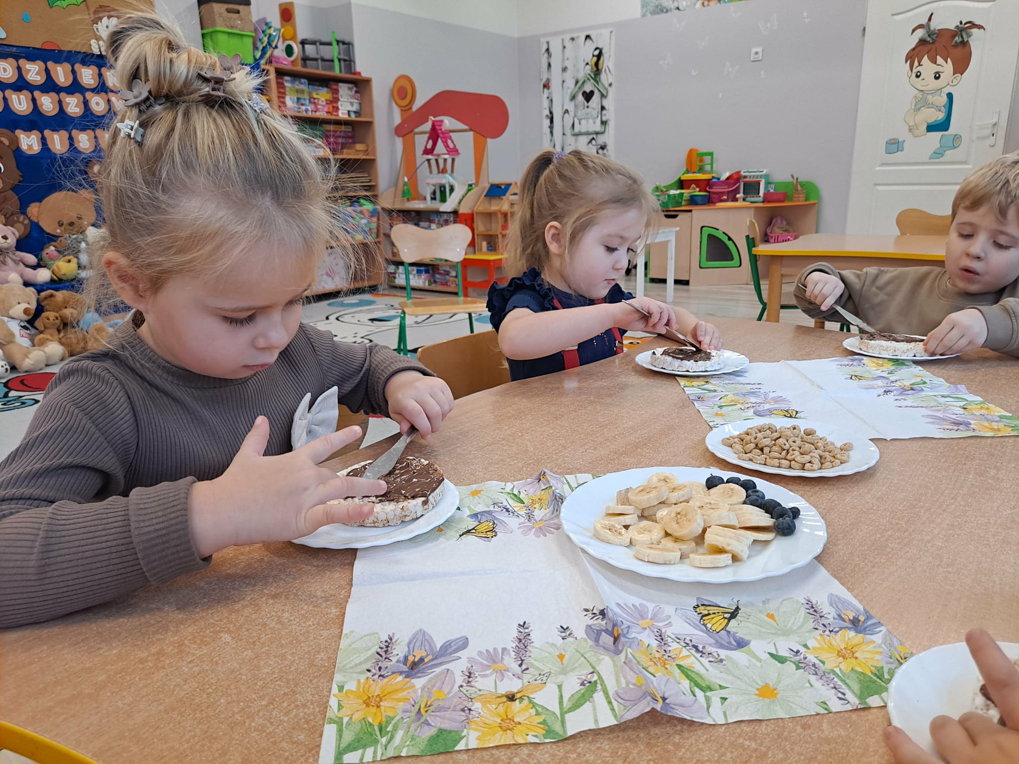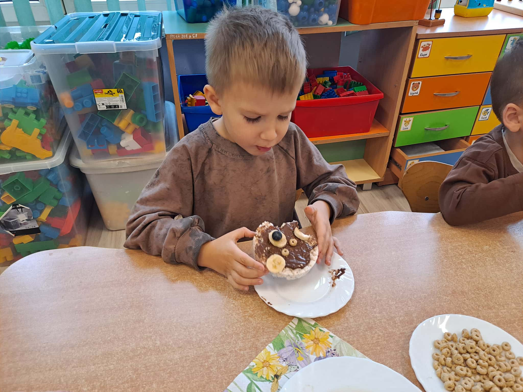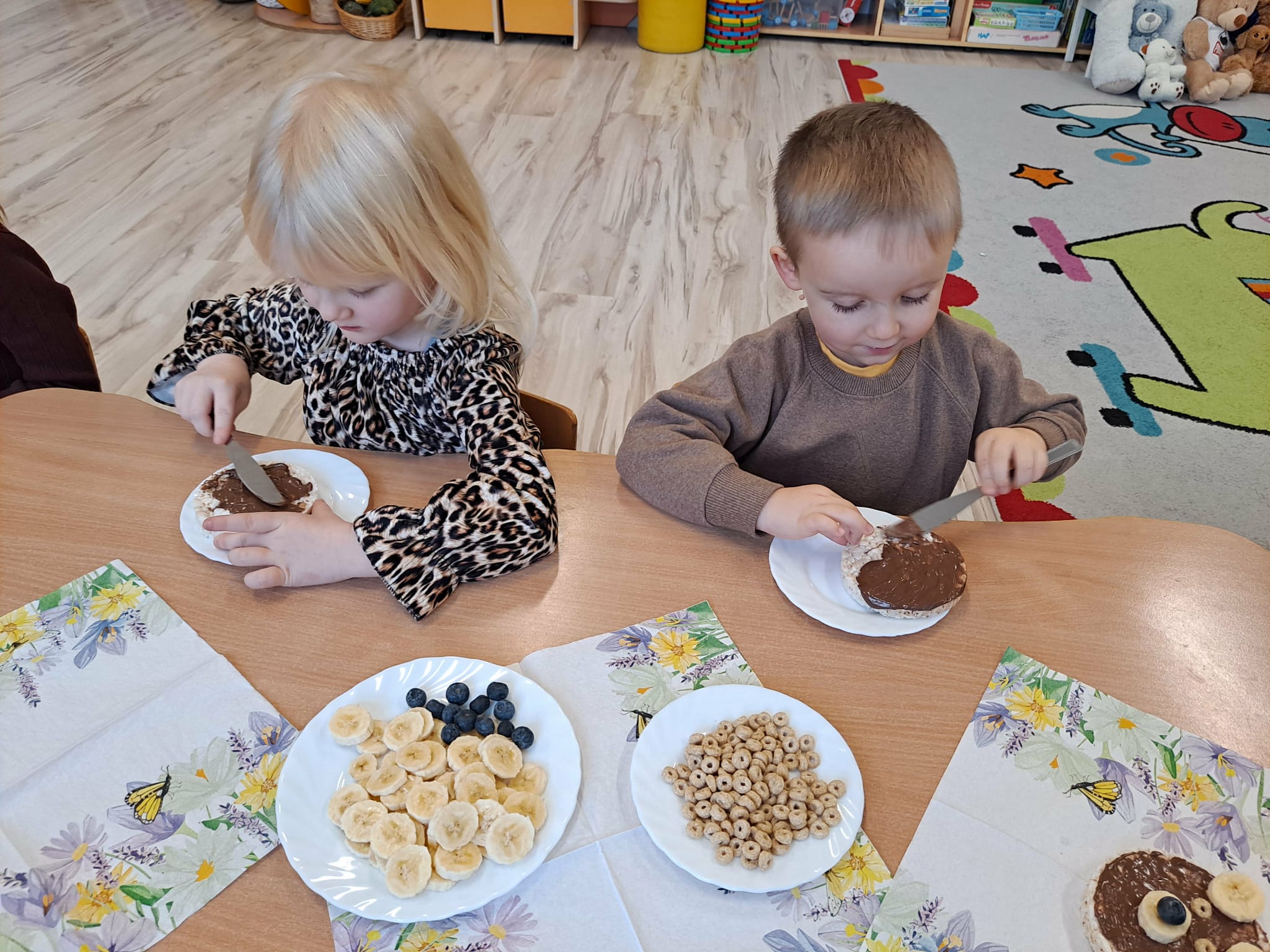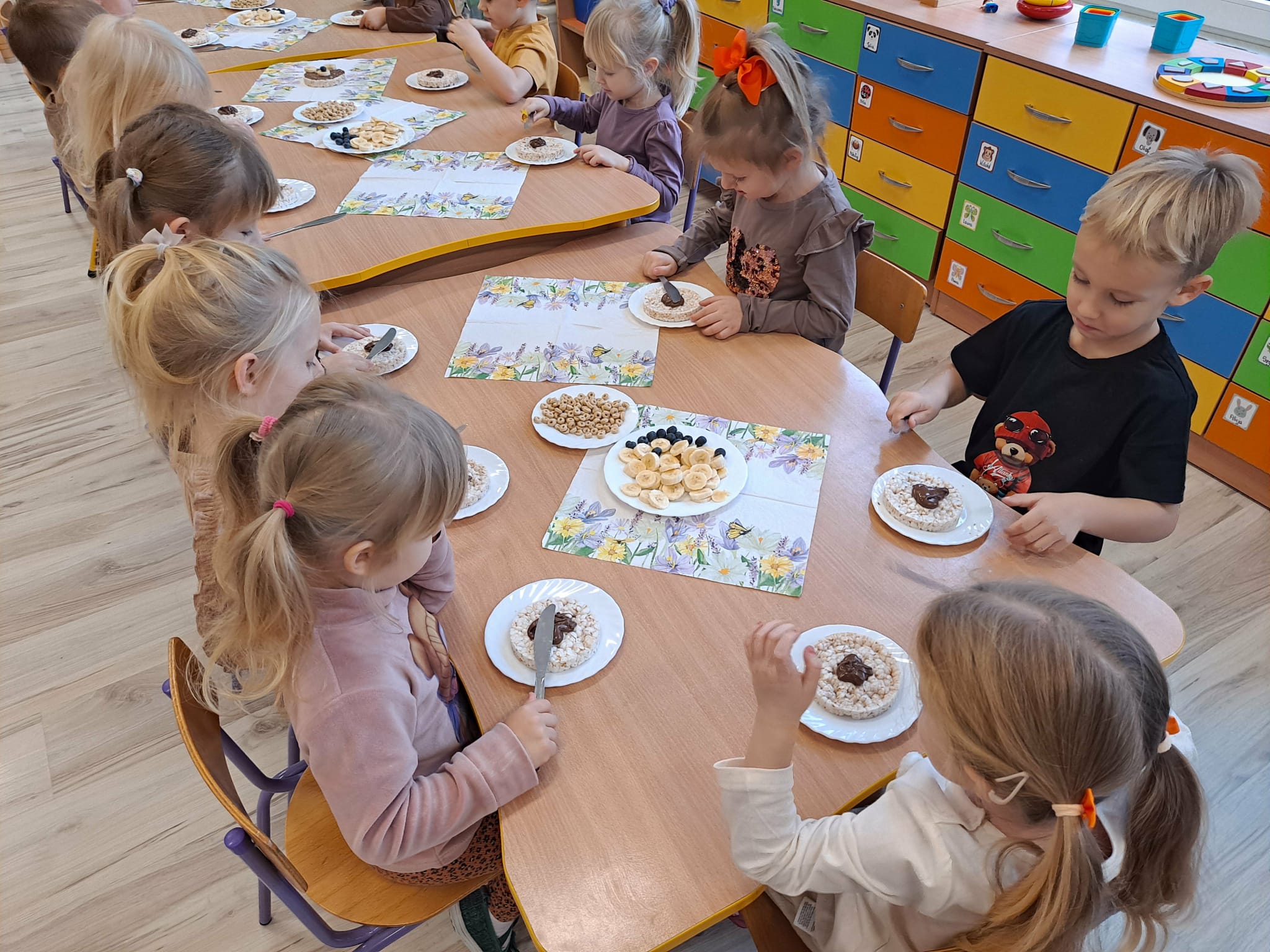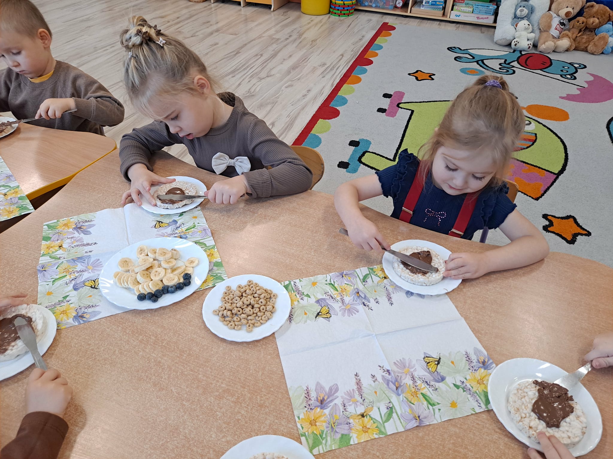 Każde dziecko wykonało „główkę misia” z wafla ryżowego, smarując go czekoladą i ozdabiając ją bananami oraz płatkami śniadaniowymi.