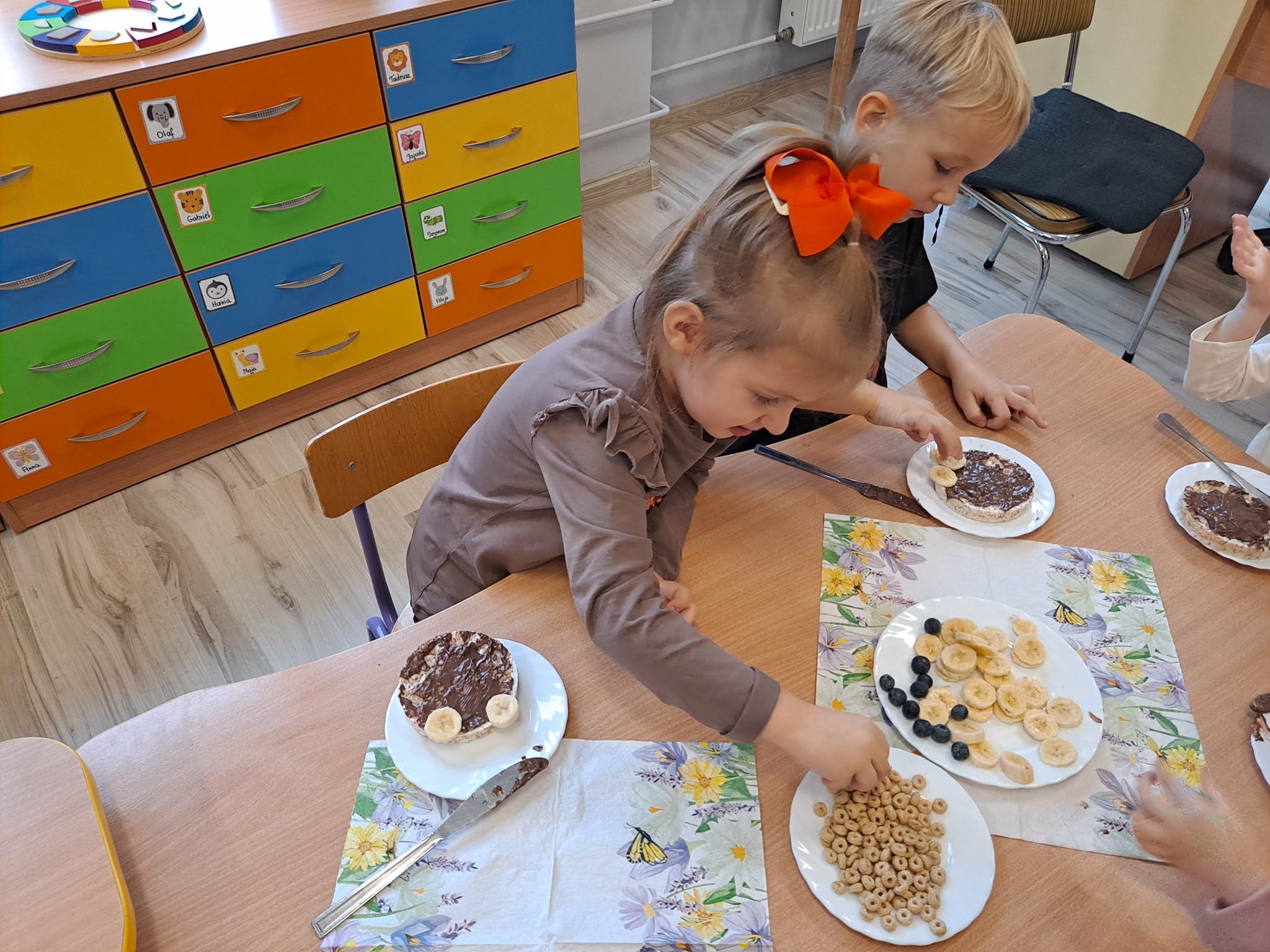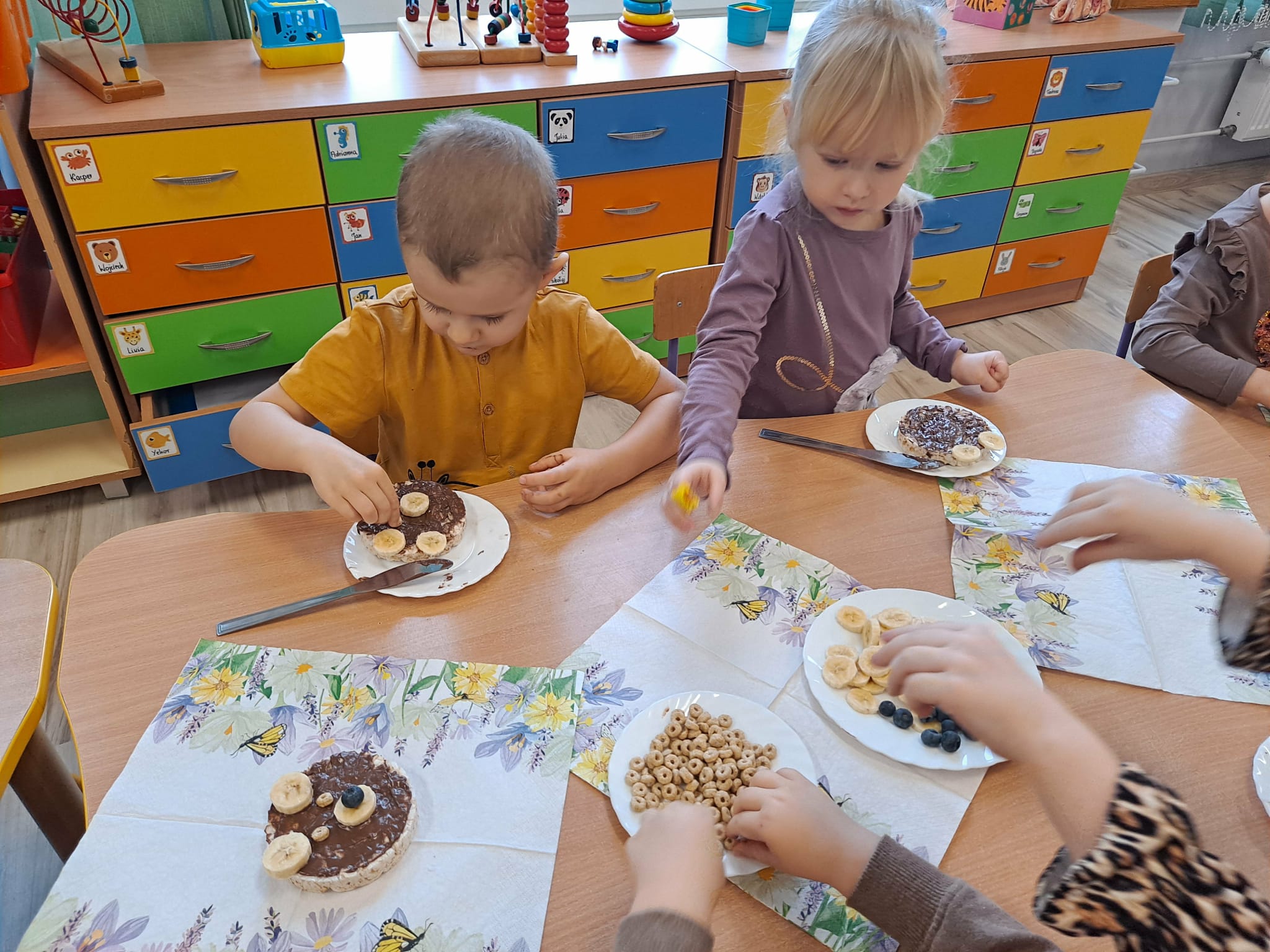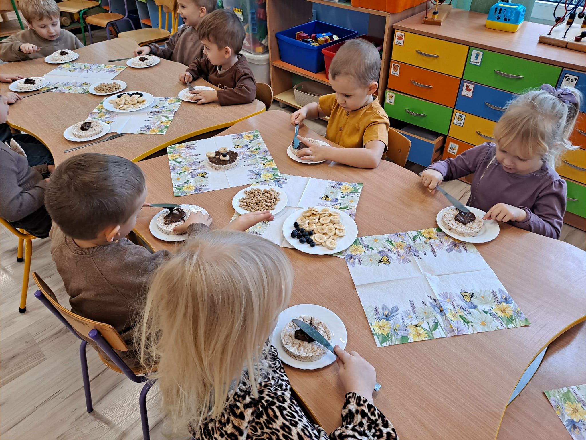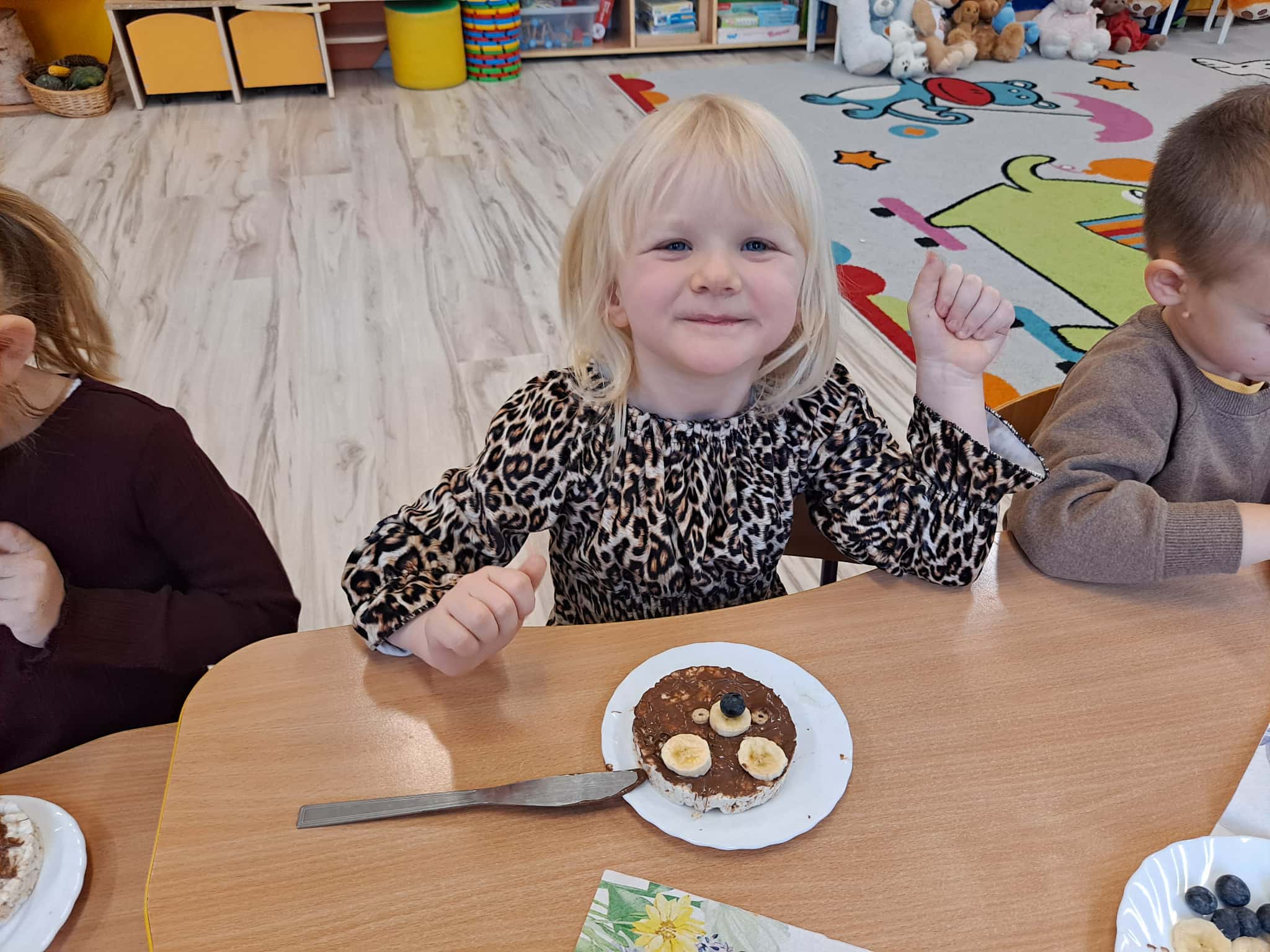 Każde dziecko wykonało „główkę misia” z wafla ryżowego, smarując go czekoladą i ozdabiając ją bananami oraz płatkami śniadaniowymi.