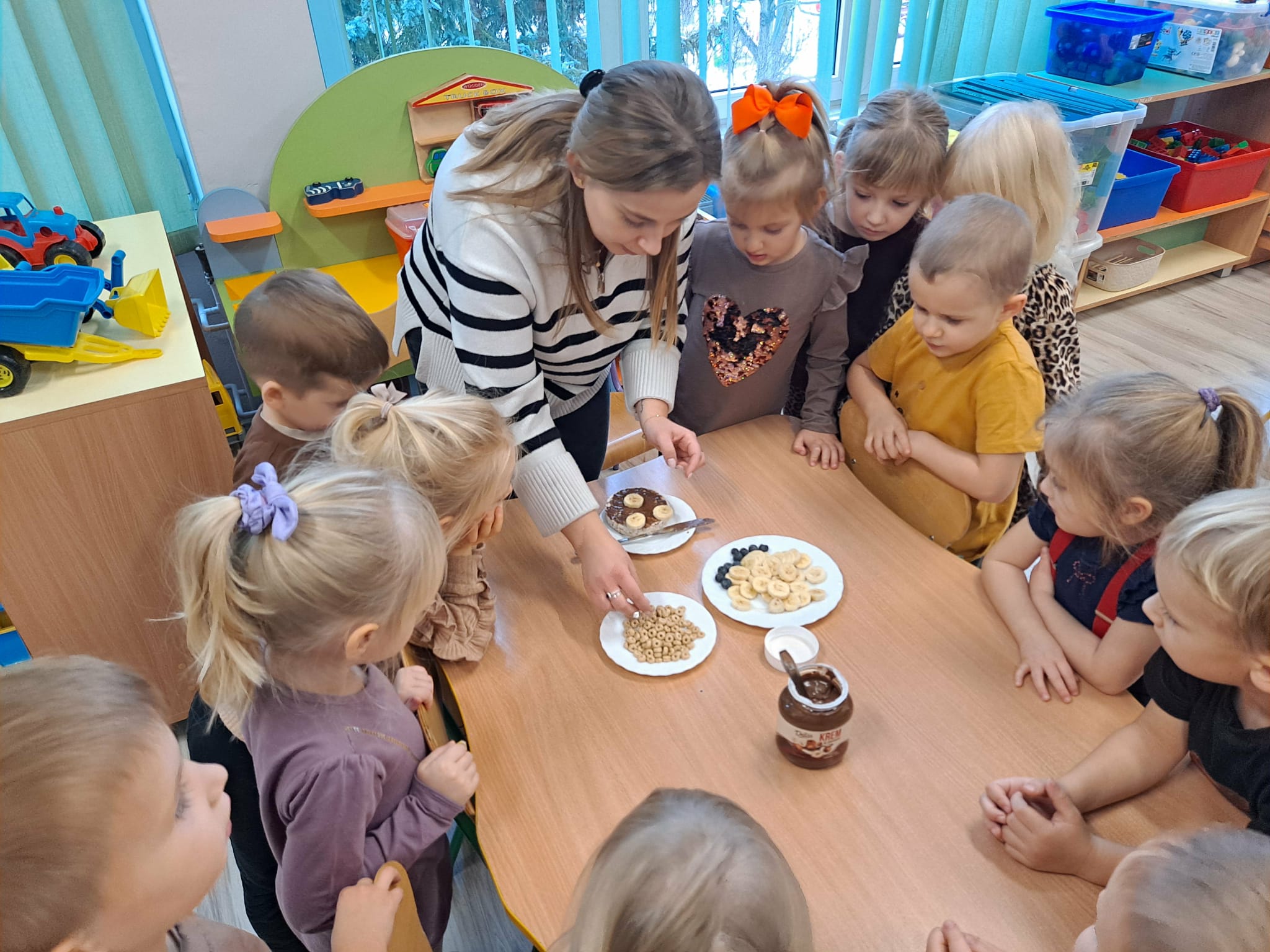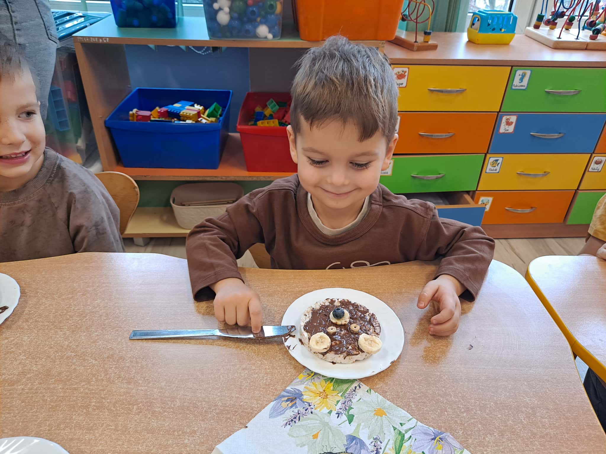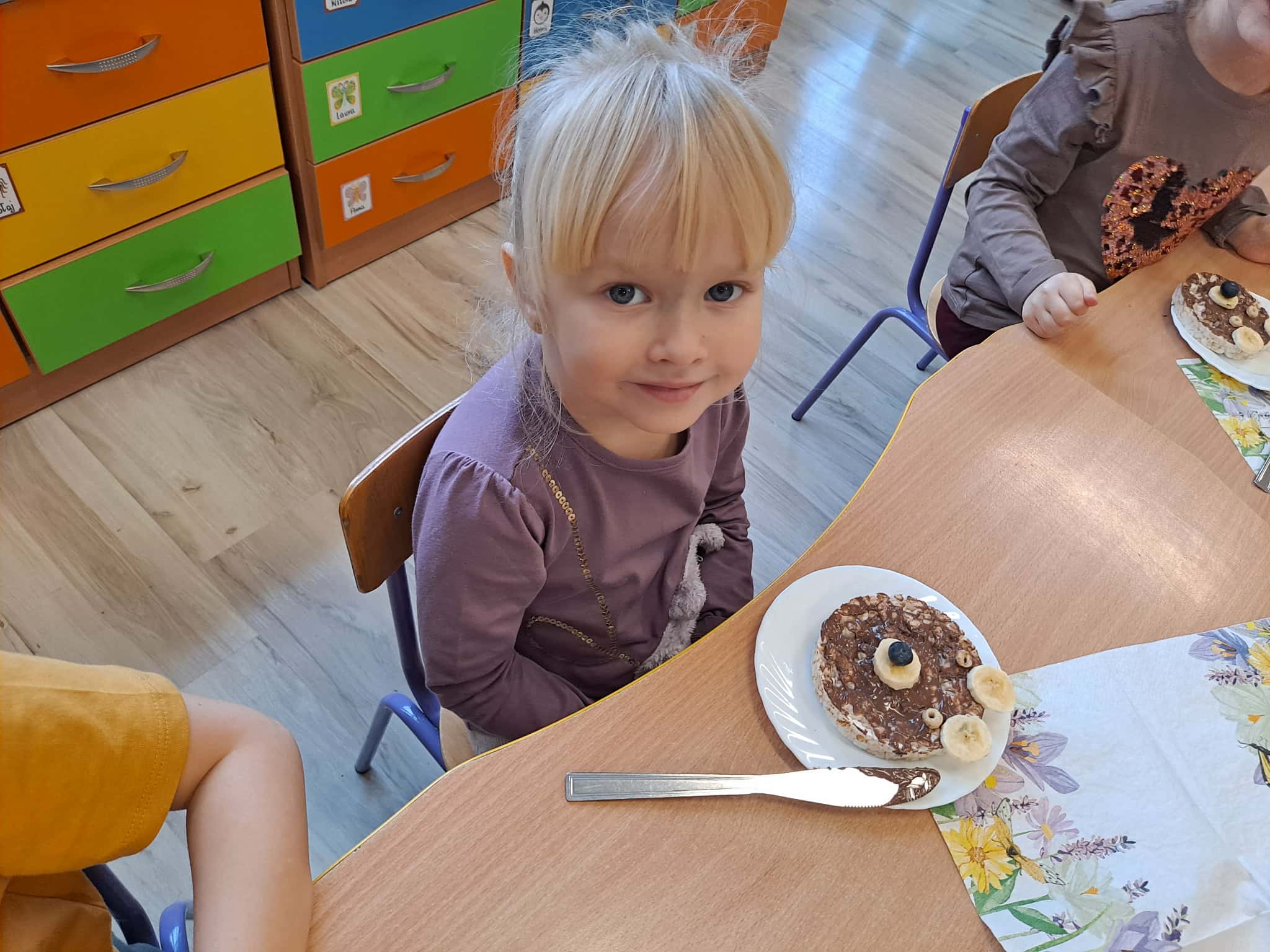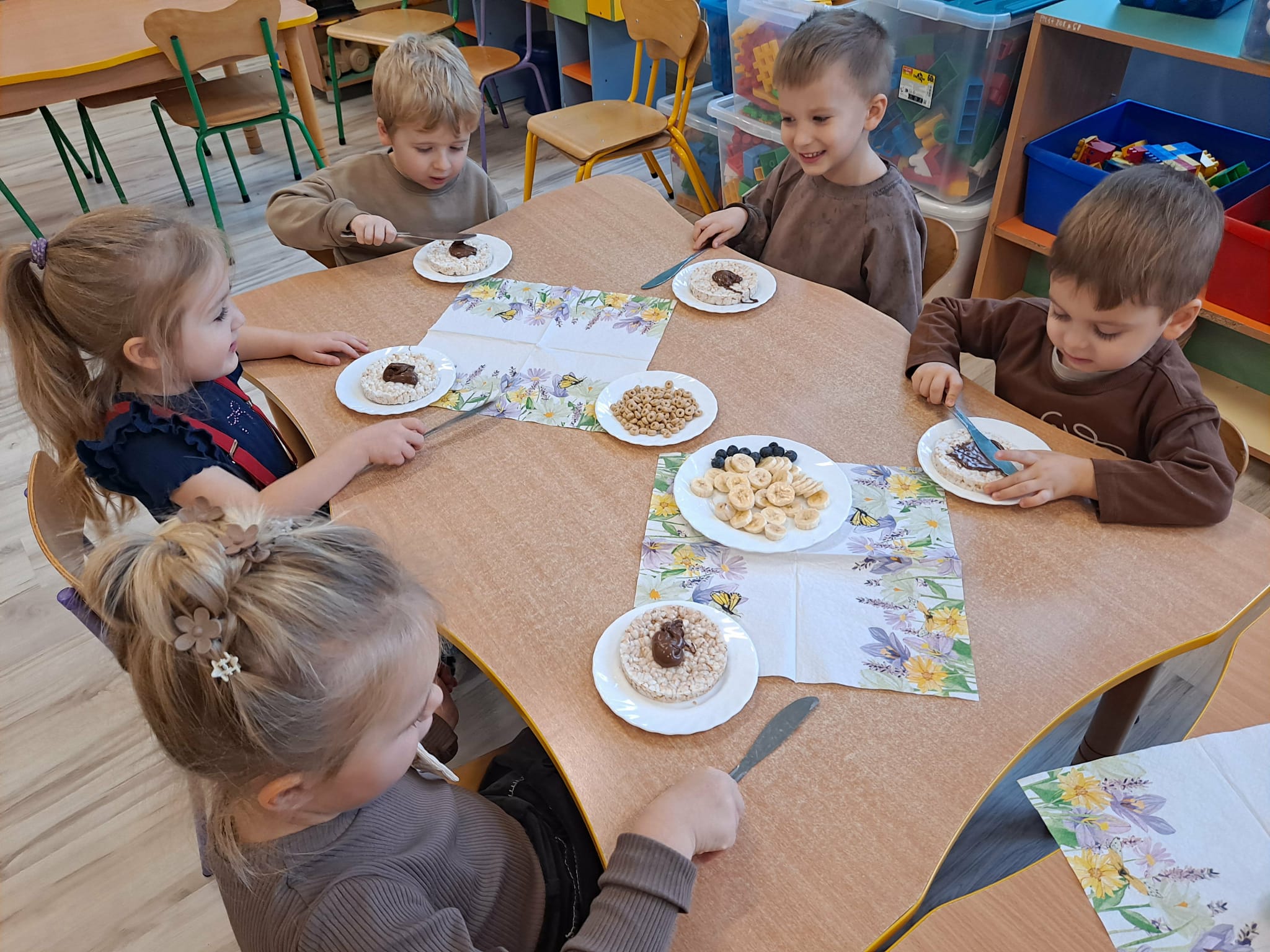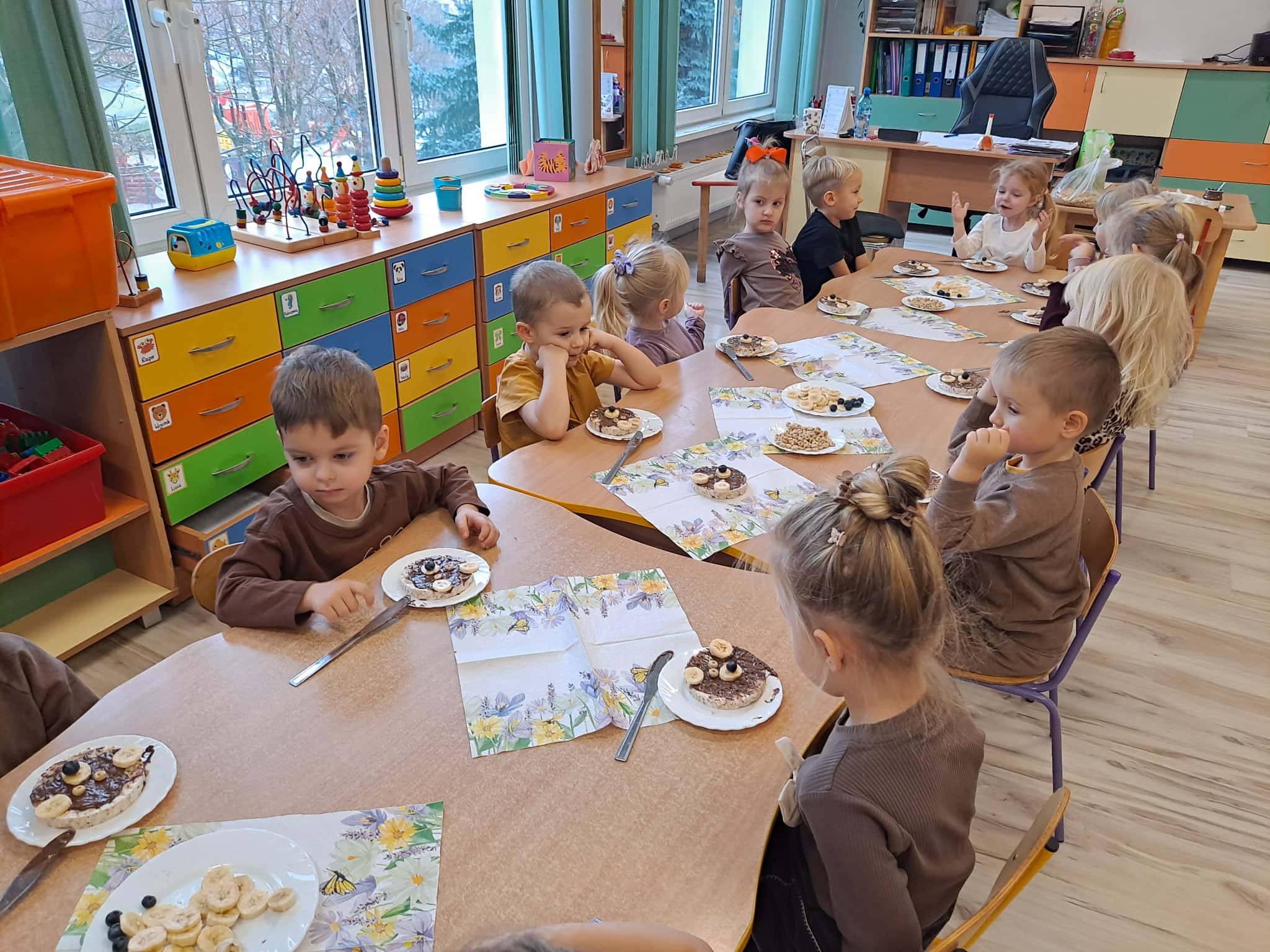 Każde dziecko wykonało „główkę misia” z wafla ryżowego, smarując go czekoladą i ozdabiając ją bananami oraz płatkami śniadaniowymi.