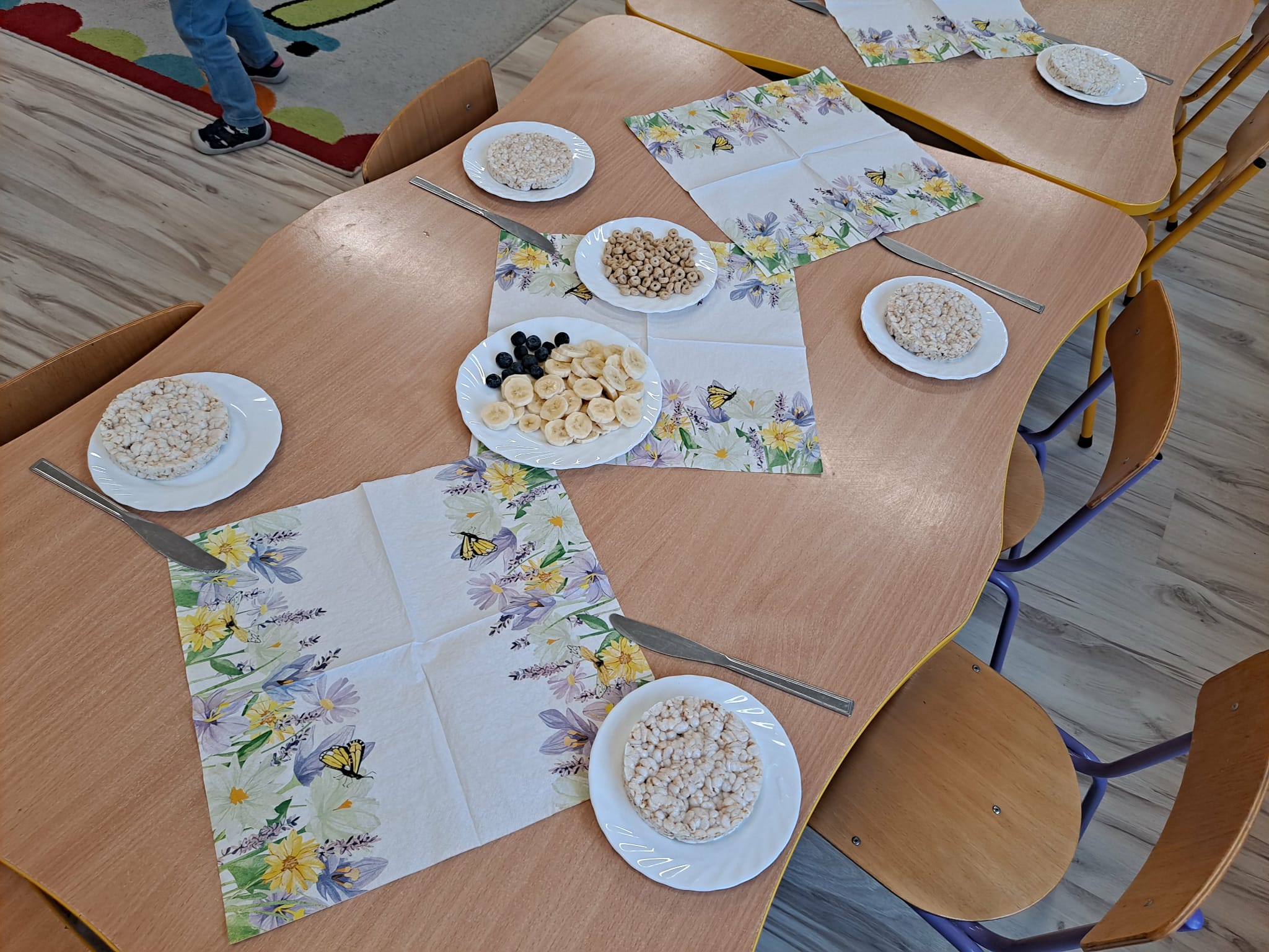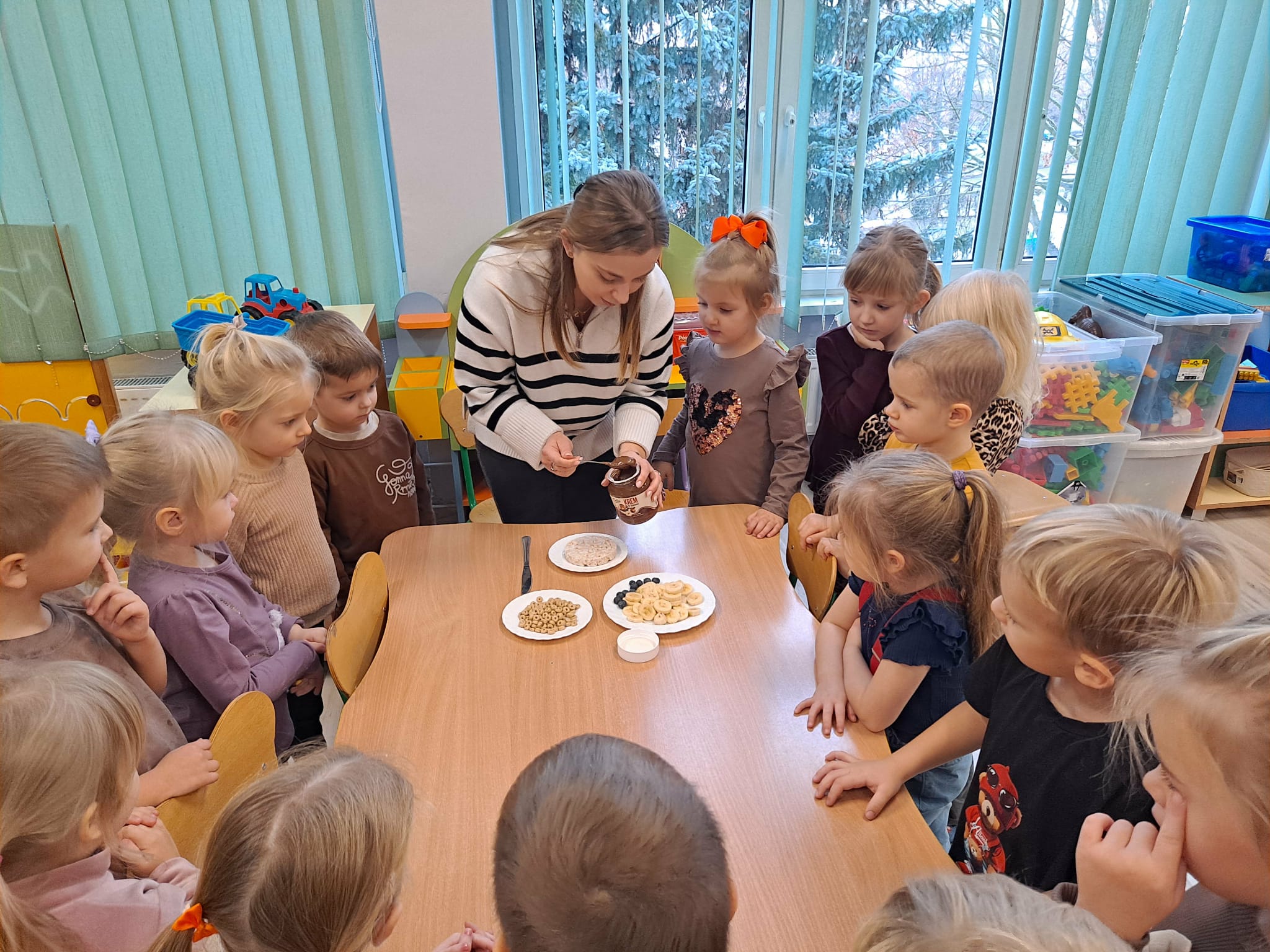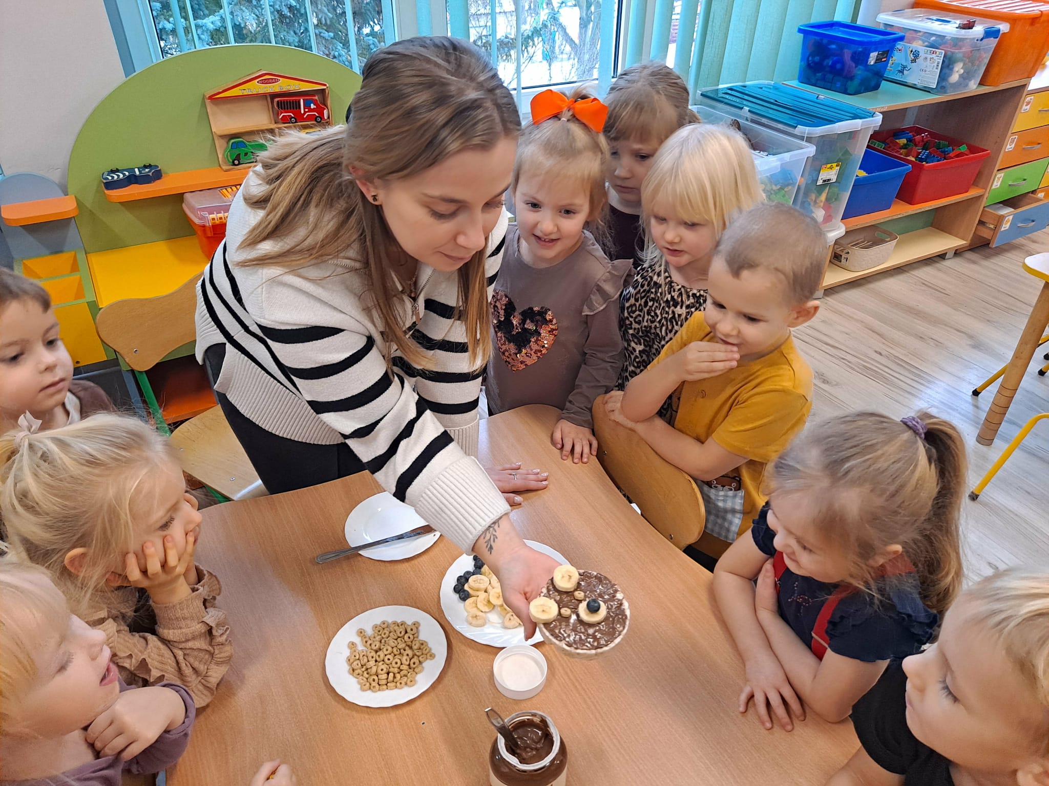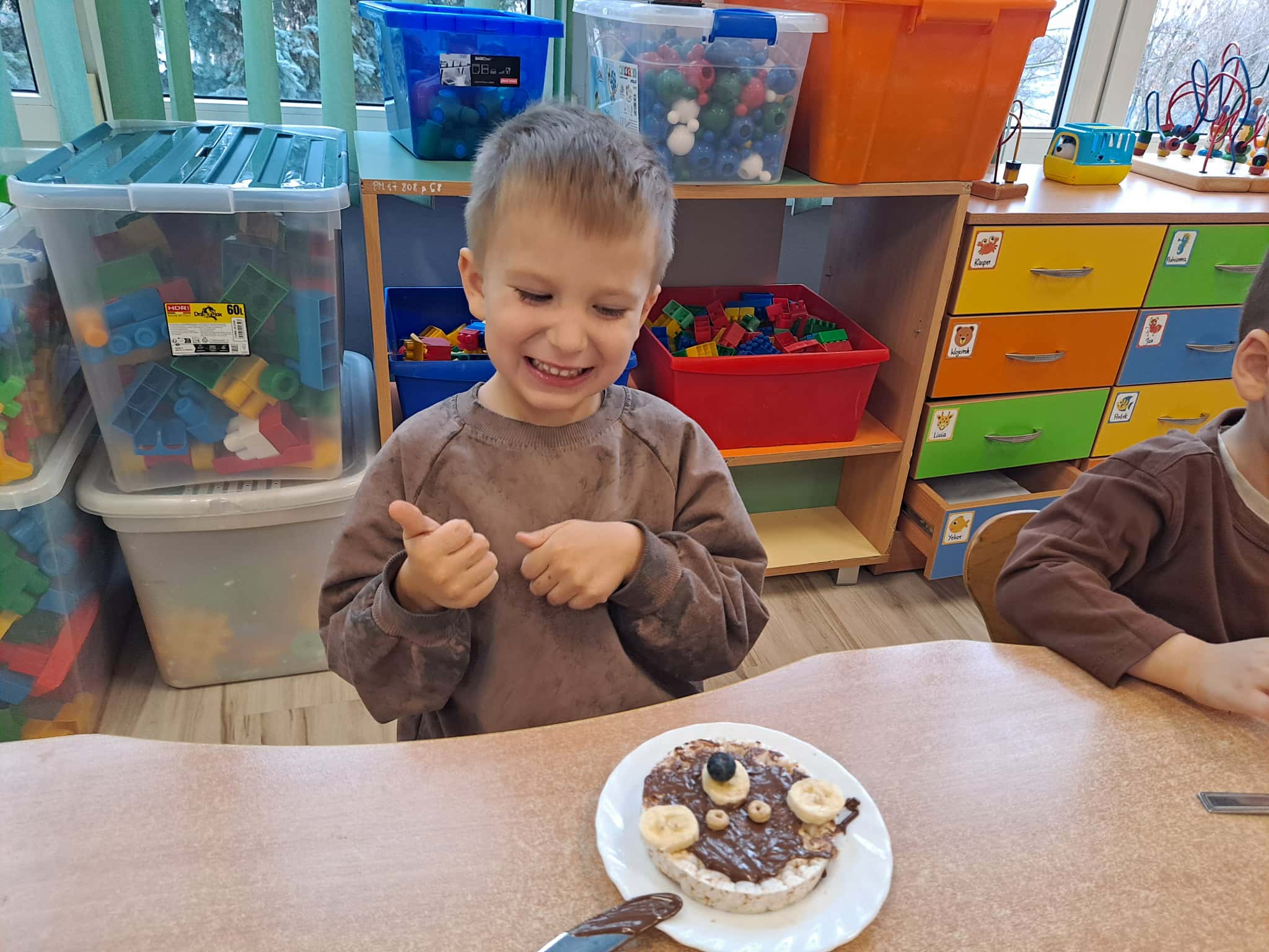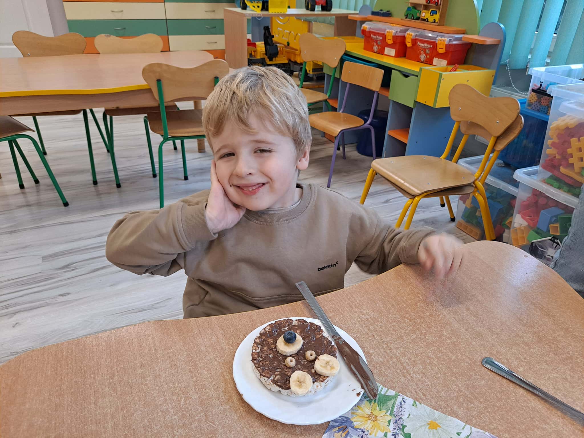 Każde dziecko wykonało „główkę misia” z wafla ryżowego, smarując go czekoladą i ozdabiając ją bananami oraz płatkami śniadaniowymi.