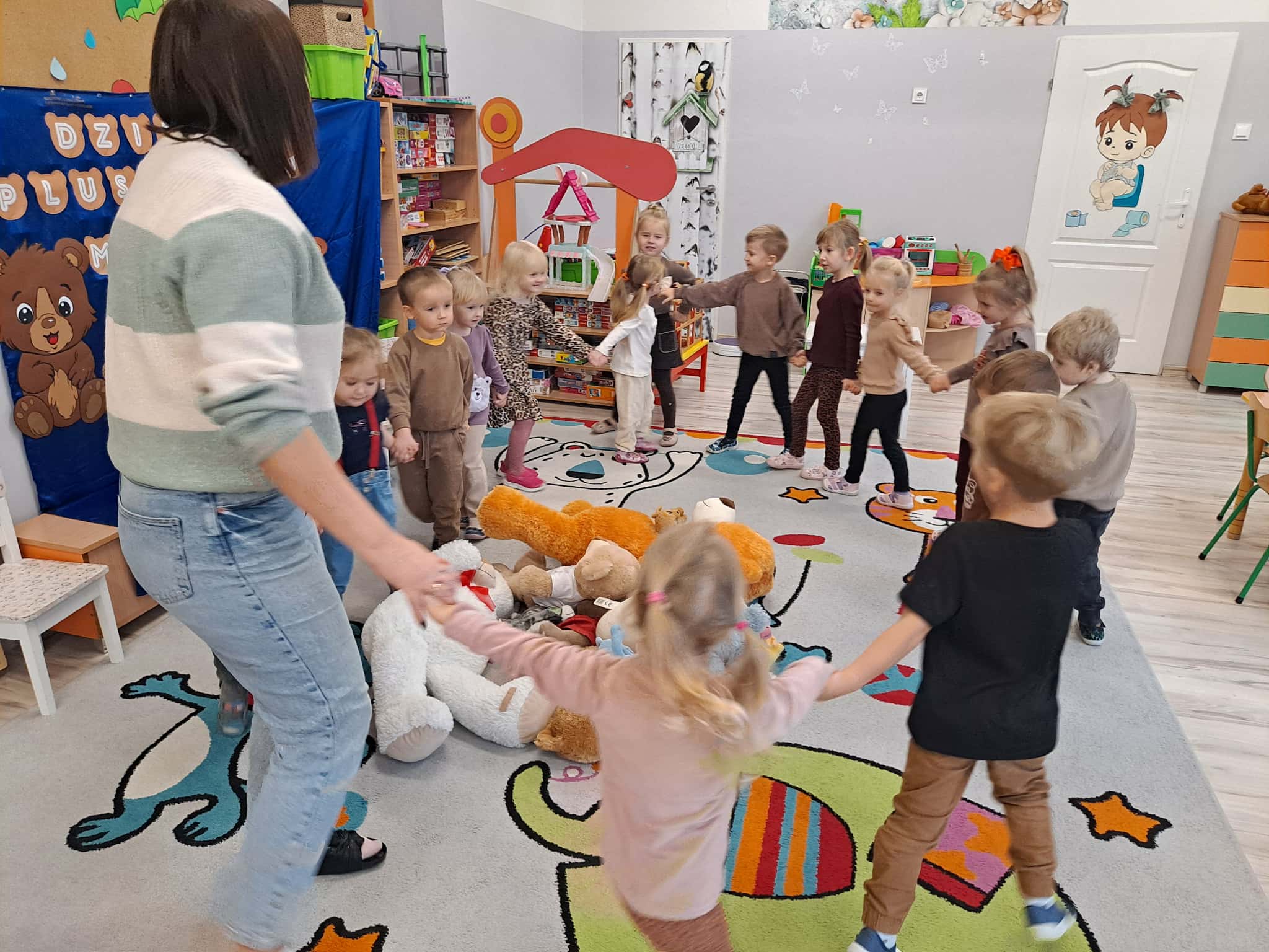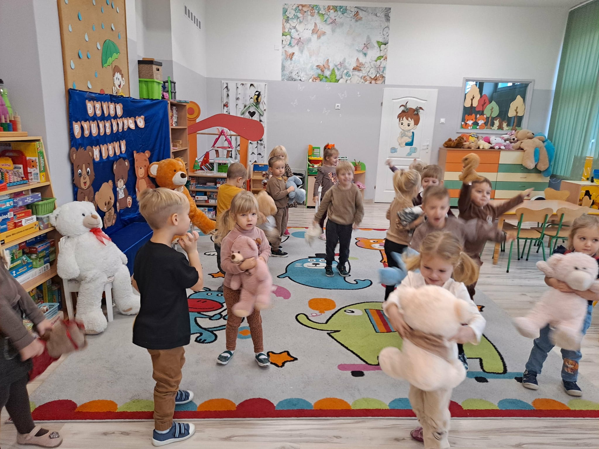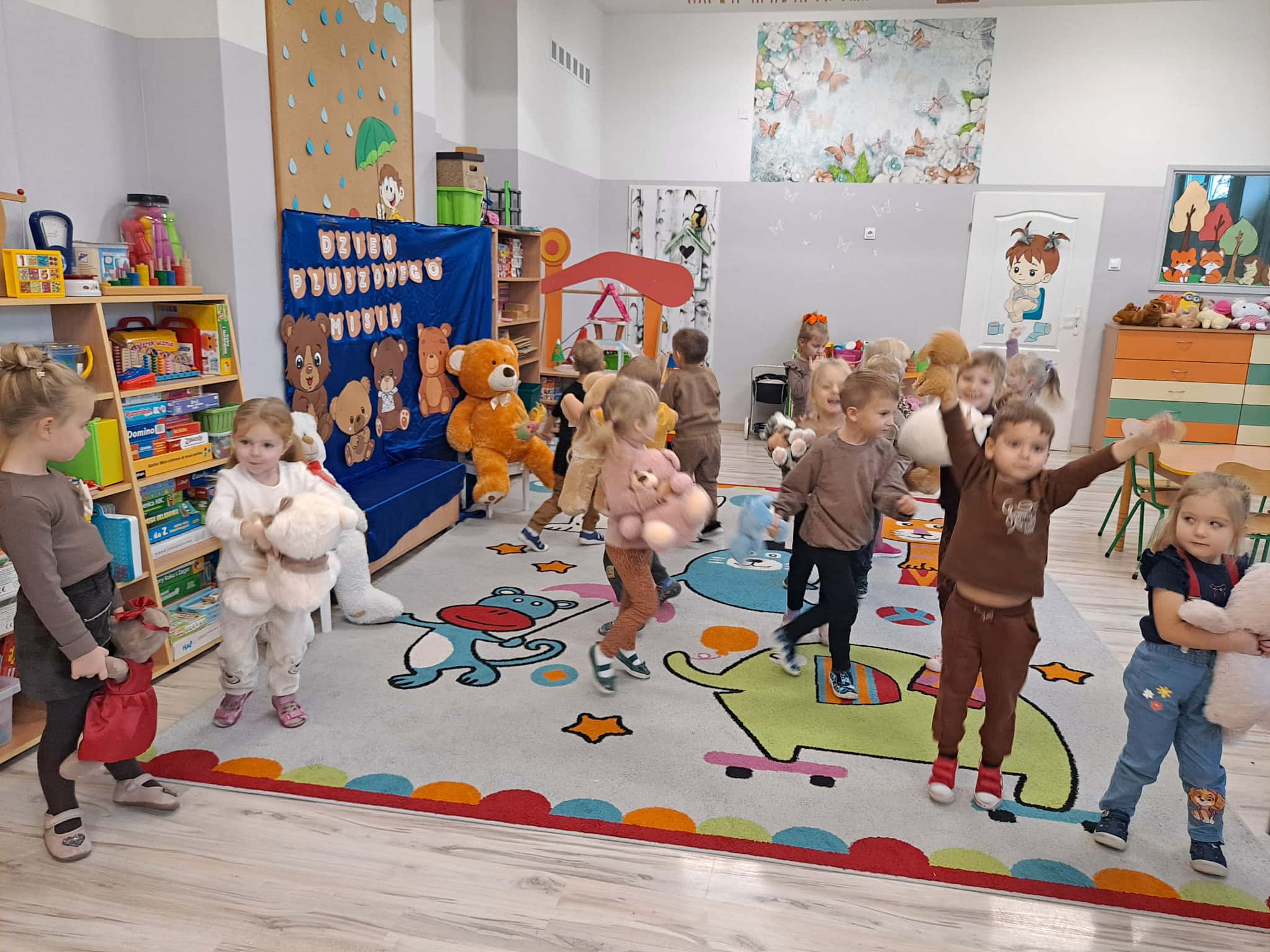 Nie zabrakło także ruchu – dzieci wzięły udział w wesołym tańcu z misiami, który pozwolił im spożytkować energię i rozwijał koordynację ruchową.