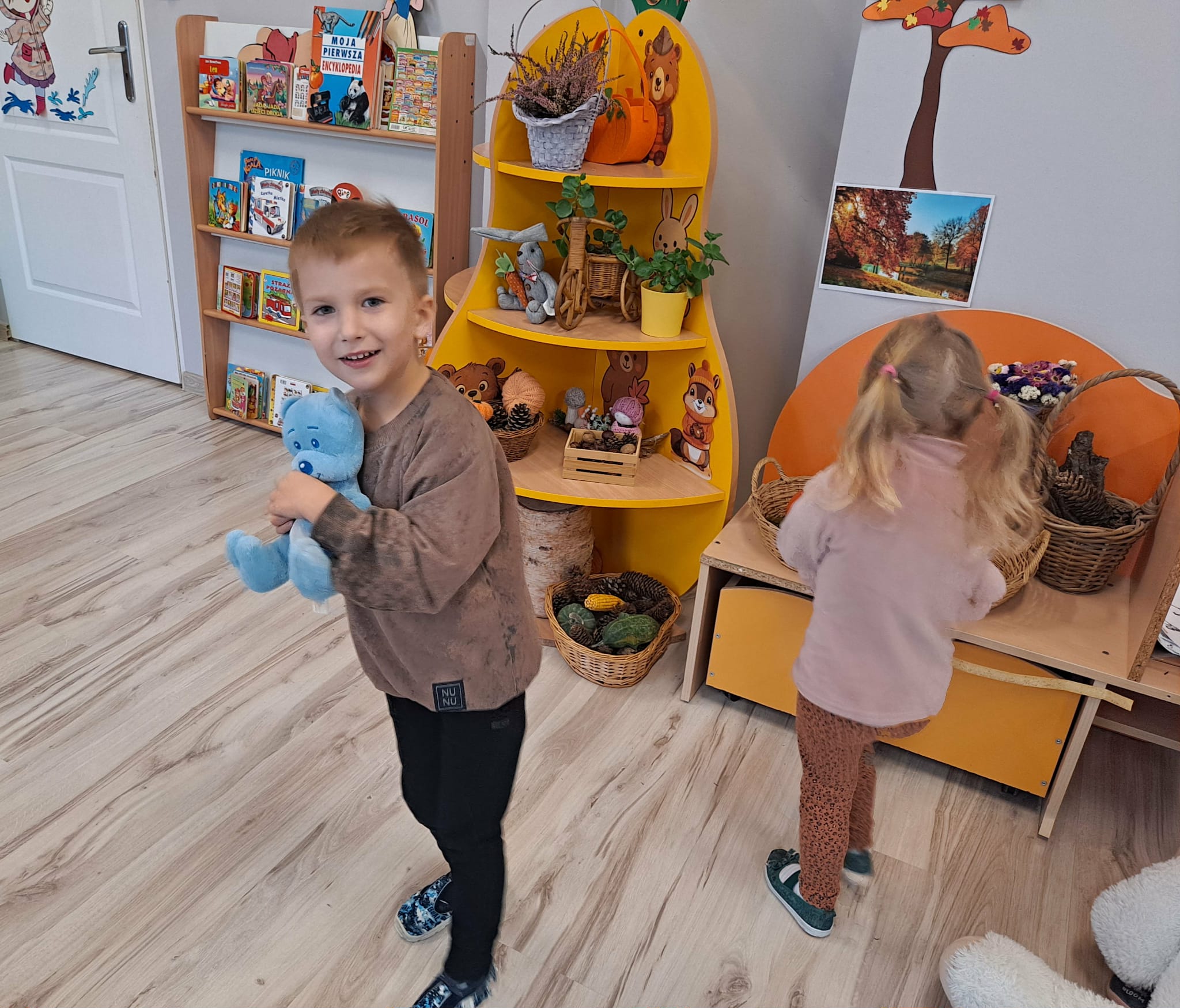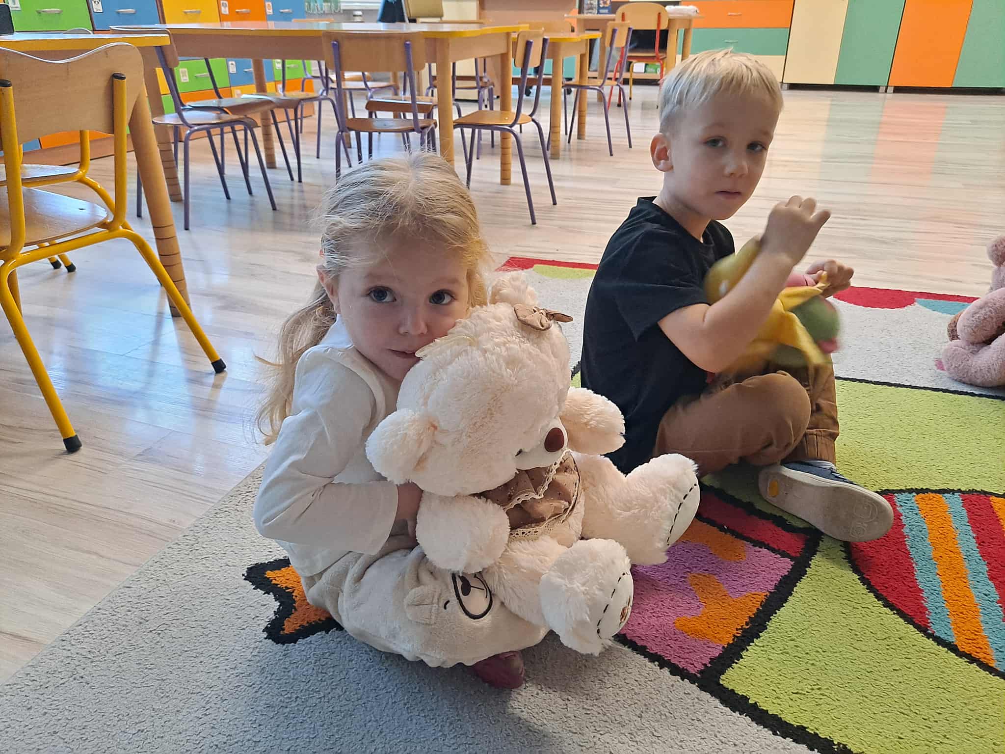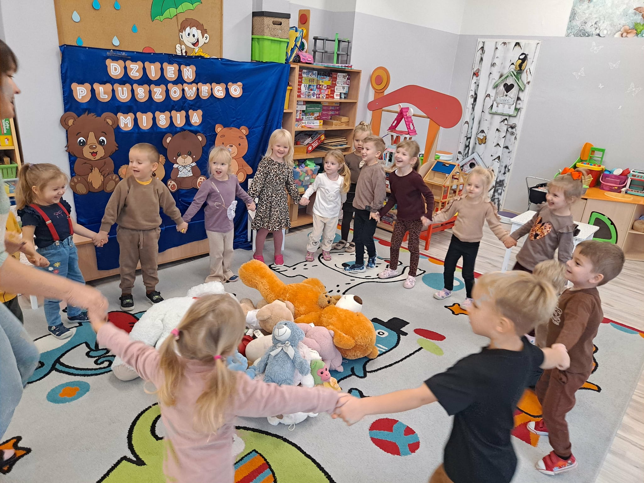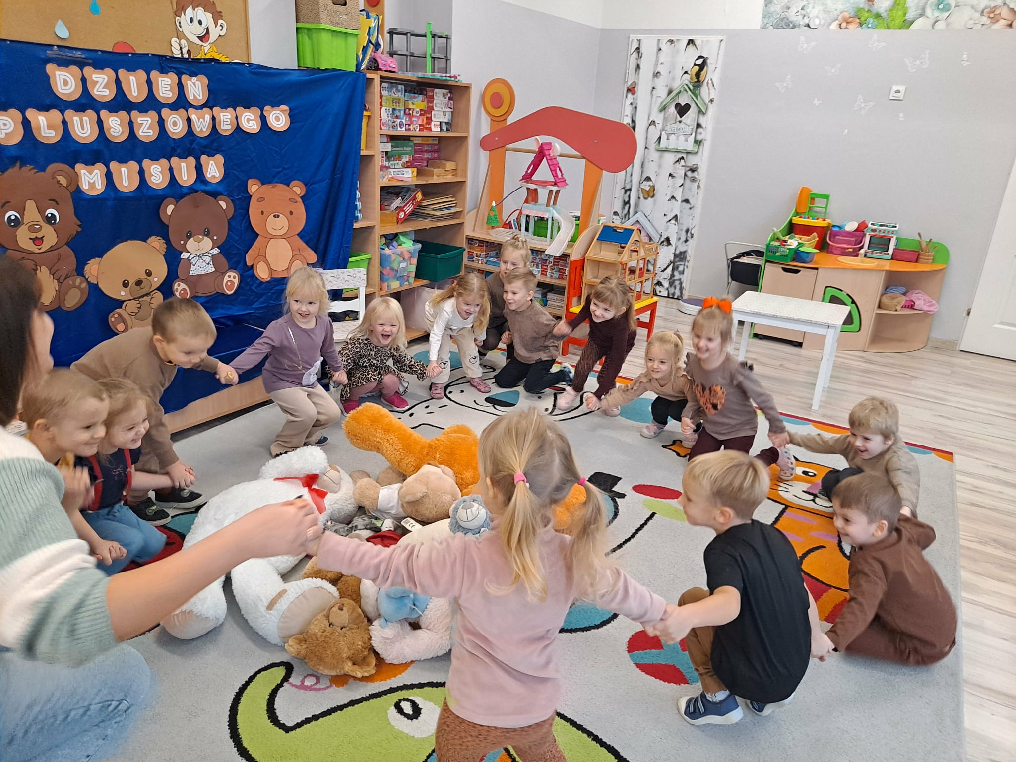 Nie zabrakło także ruchu – dzieci wzięły udział w wesołym tańcu z misiami, który pozwolił im spożytkować energię i rozwijał koordynację ruchową.