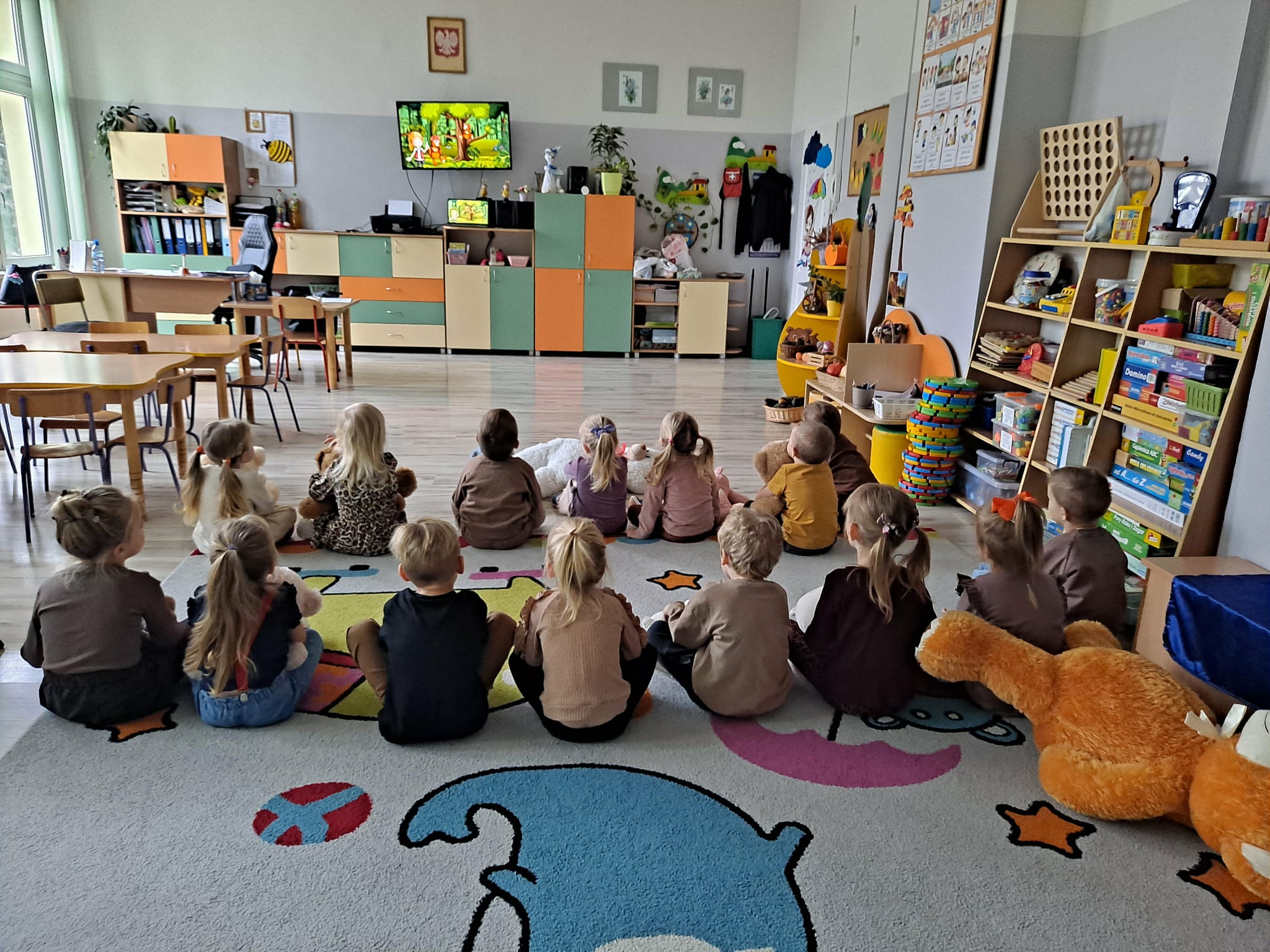 Przedszkolaki obejrzały również krótki film edukacyjny przedstawiający historię pluszowego misia – dowiedziały się, skąd wzięła się ta znana zabawka i dlaczego jest tak popularna na całym świecie.
