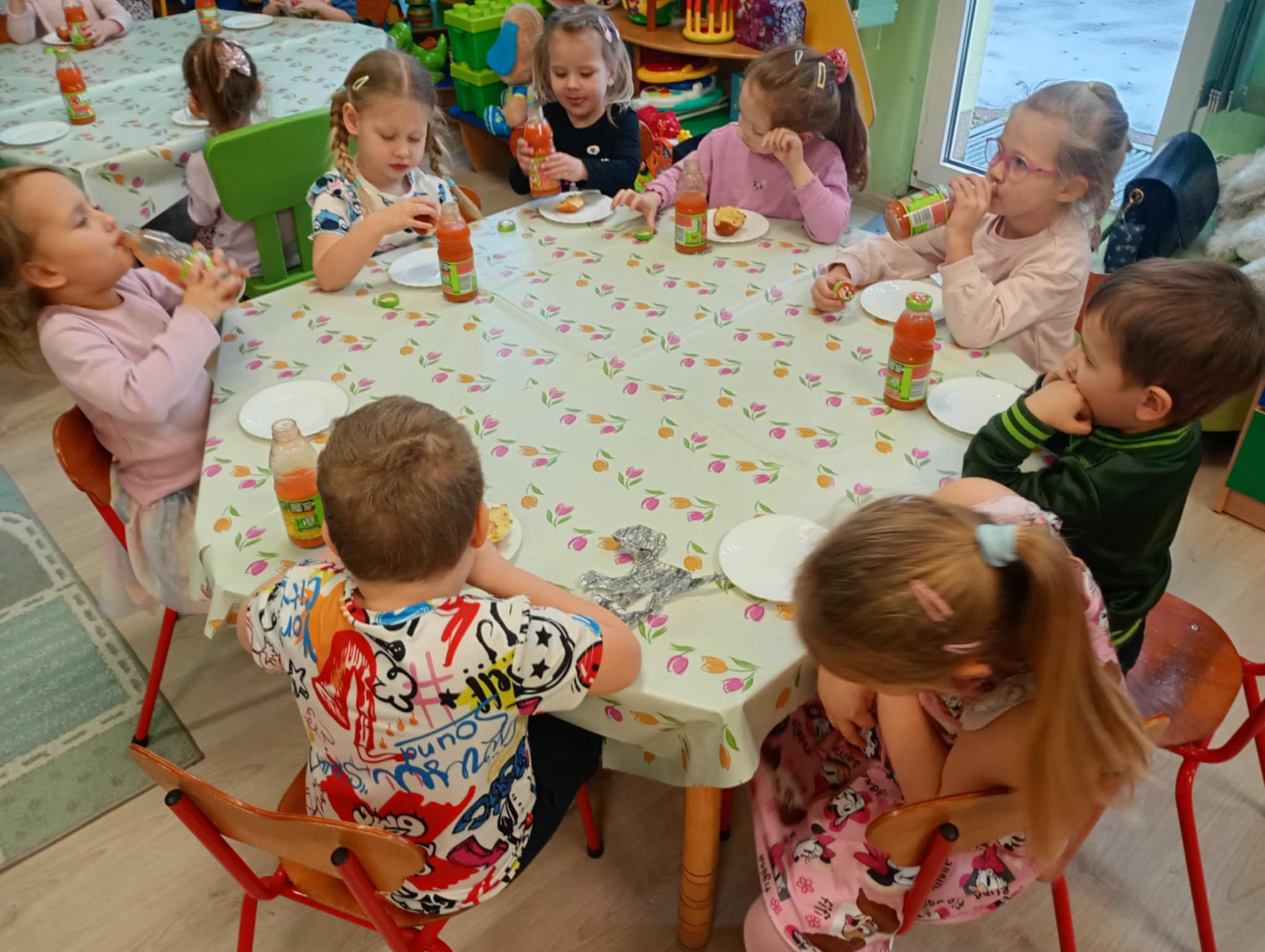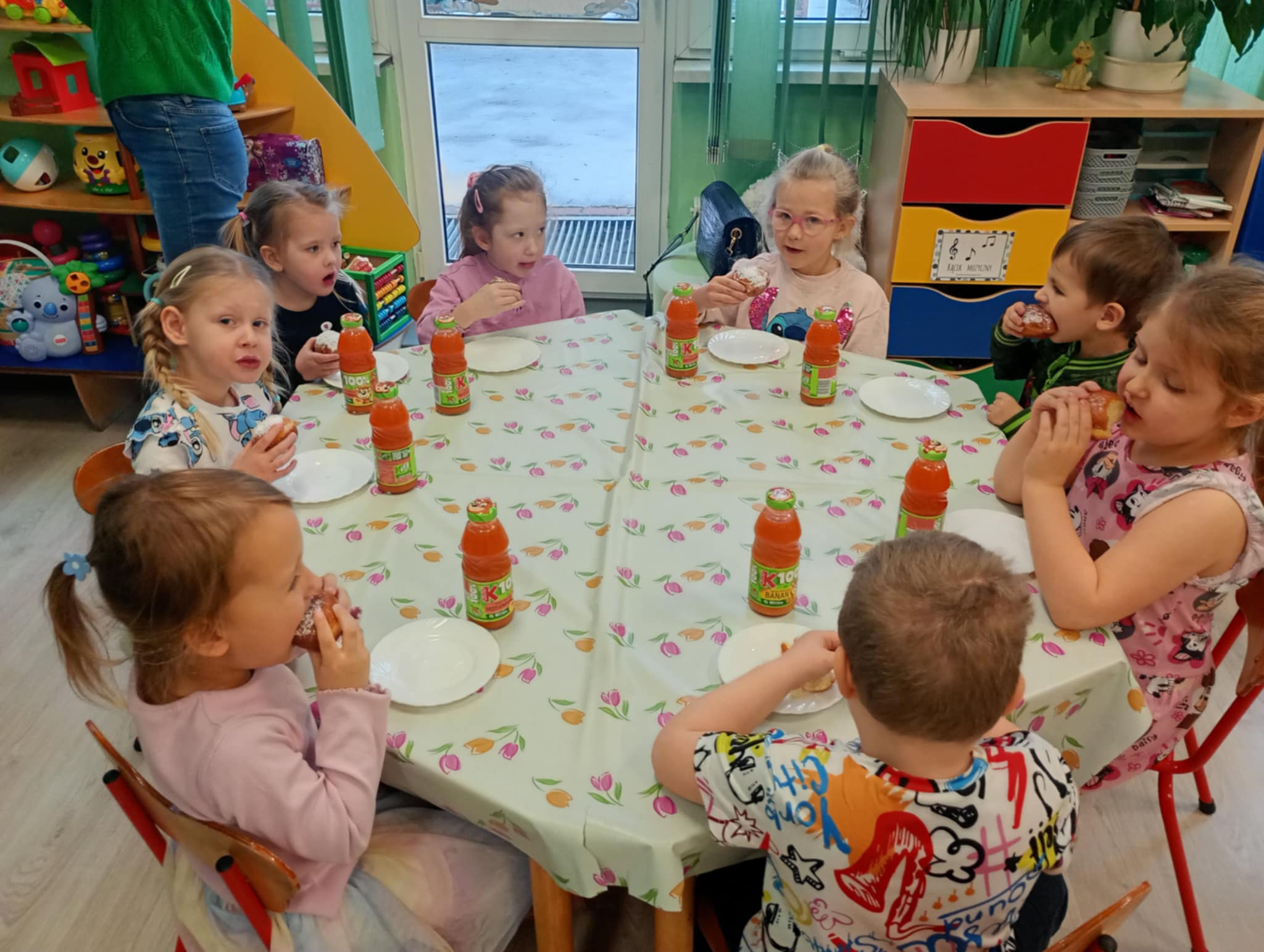 Wszystkie dzieci z przedszkola mogły spróbować pysznych wypieków z okazji Tłustego Czwartku. Puszyste pączki królowały na stole, a ich smak pozostawił uśmiech na buziach chłopców i dziewczynek.