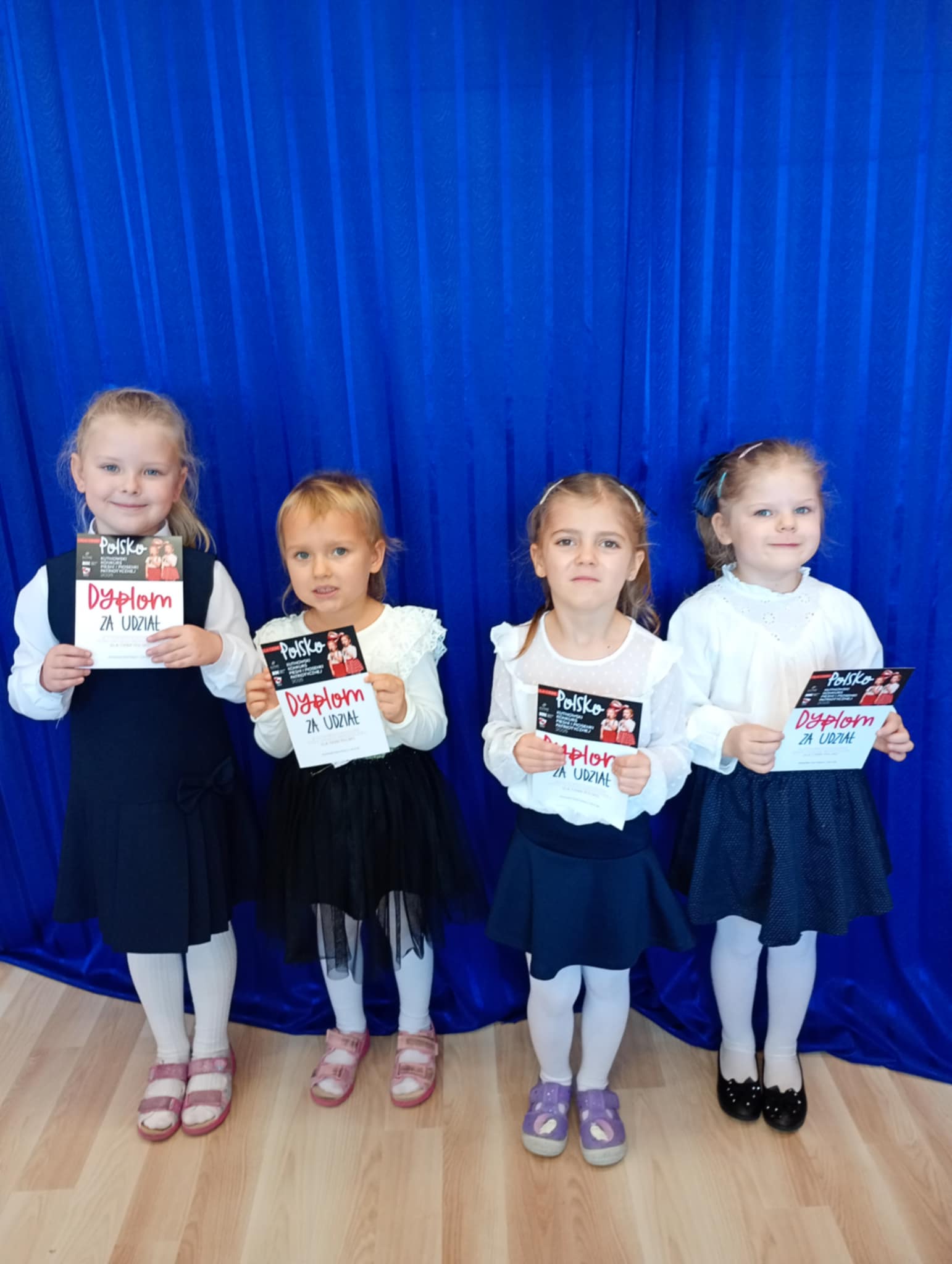 Nasz oddział przedszkolny reprezentowały dziewczynki z grupy I ,,Niezabudki" i grupy II ,,Stokrotki" pięknie wykonując piosenkę ,,Polska to My" sł. i muz. A. Szewczyk. Za udział w przesłuchaniach dziewczynki otrzymały pamiątkowe dyplomy. Gratulujemy!