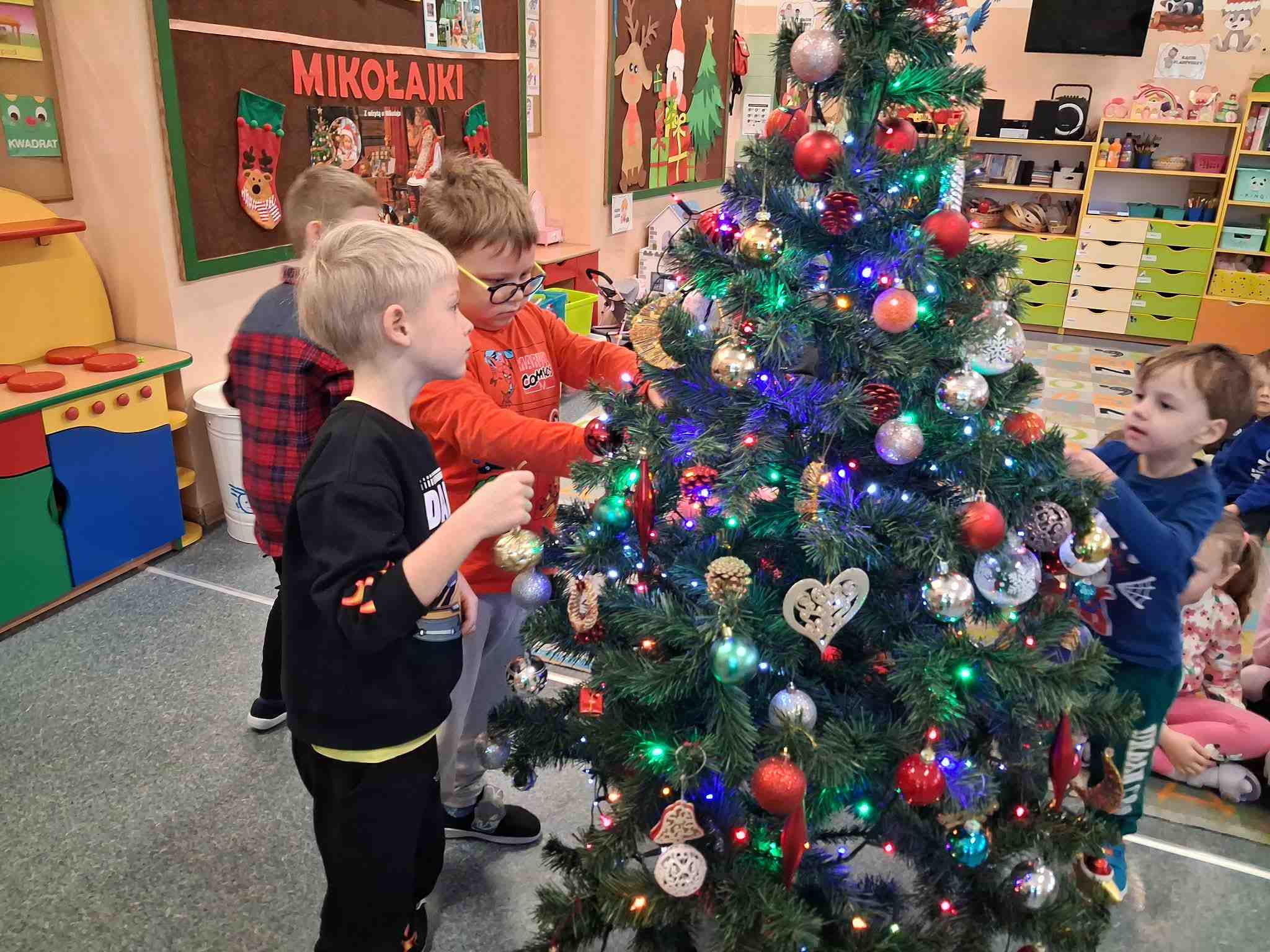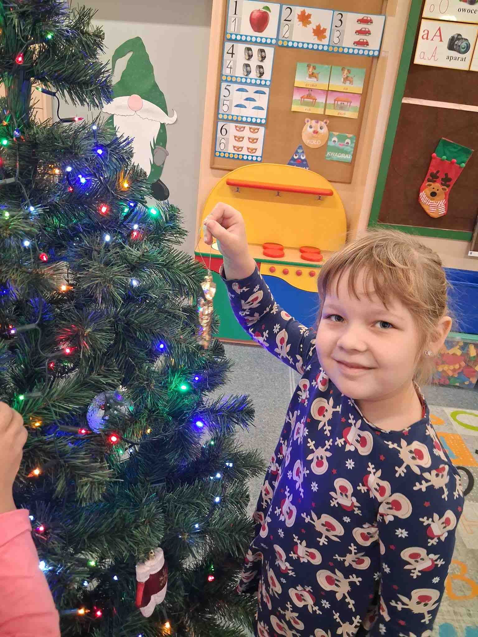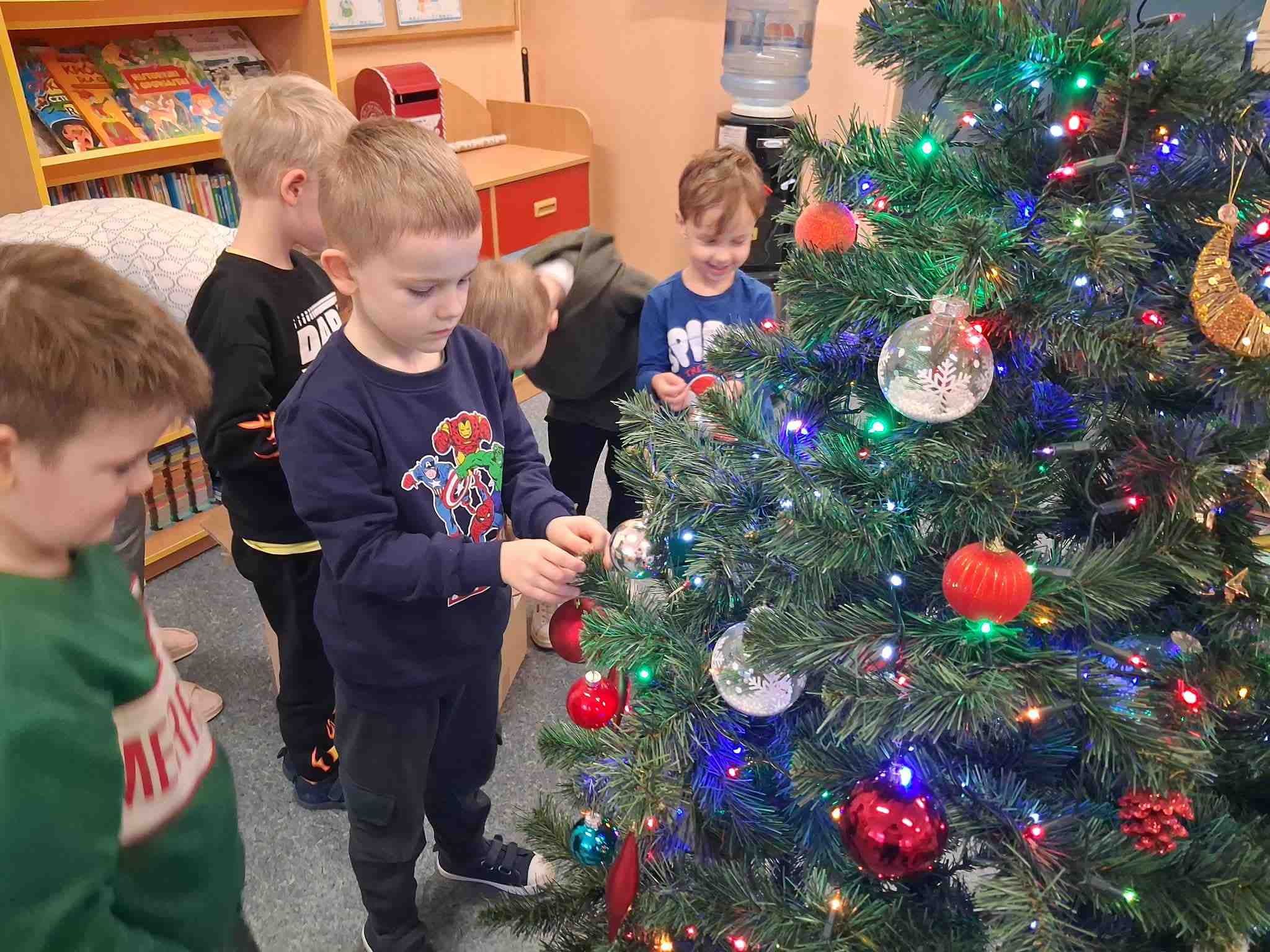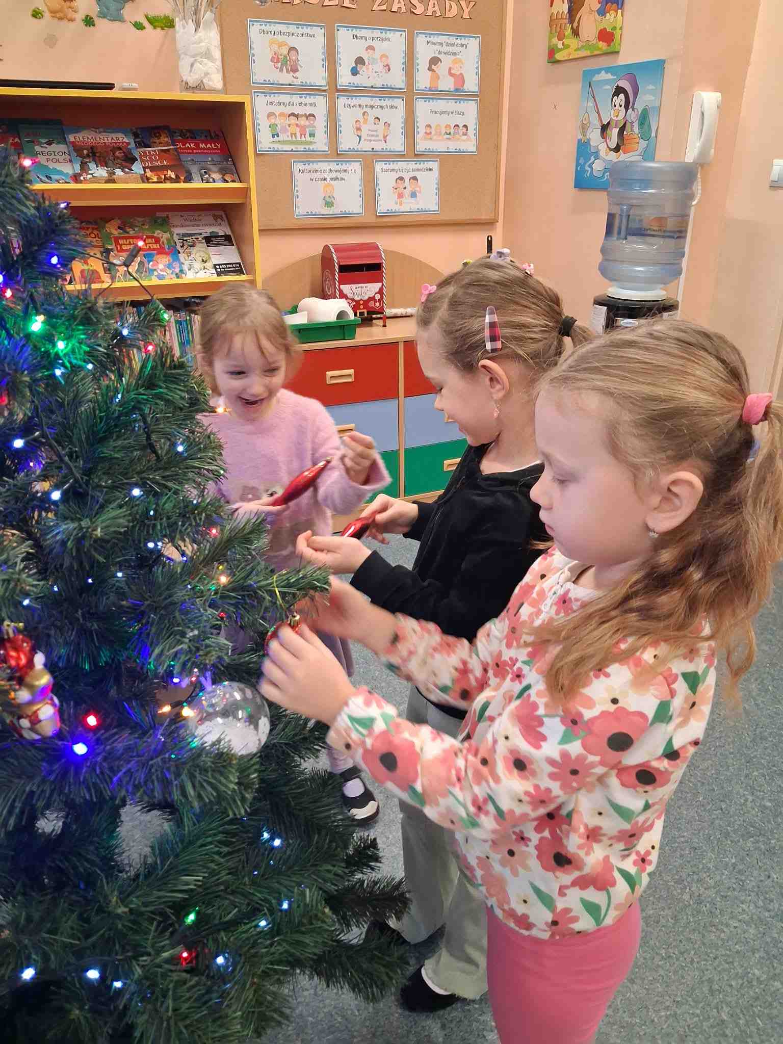 Jedną z najpiękniejszych i najbardziej wyczekiwanych przez dzieci tradycji przedświątecznych jest ubieranie choinki. W naszej sali również stanęło pięknie udekorowane drzewko. Motylki z radością przystąpiły do strojenia choinki w kolorowe bombki i łańcuchy. Obok drzewka skonstruowaliśmy i ozdobiliśmy także świąteczny kominek, obowiązkowo ze skarpetkami, do których Mikołaj może wrzucić nam drobne upominki. W tak pięknej scenerii nie mogło zabraknąć pamiątkowych fotografii.