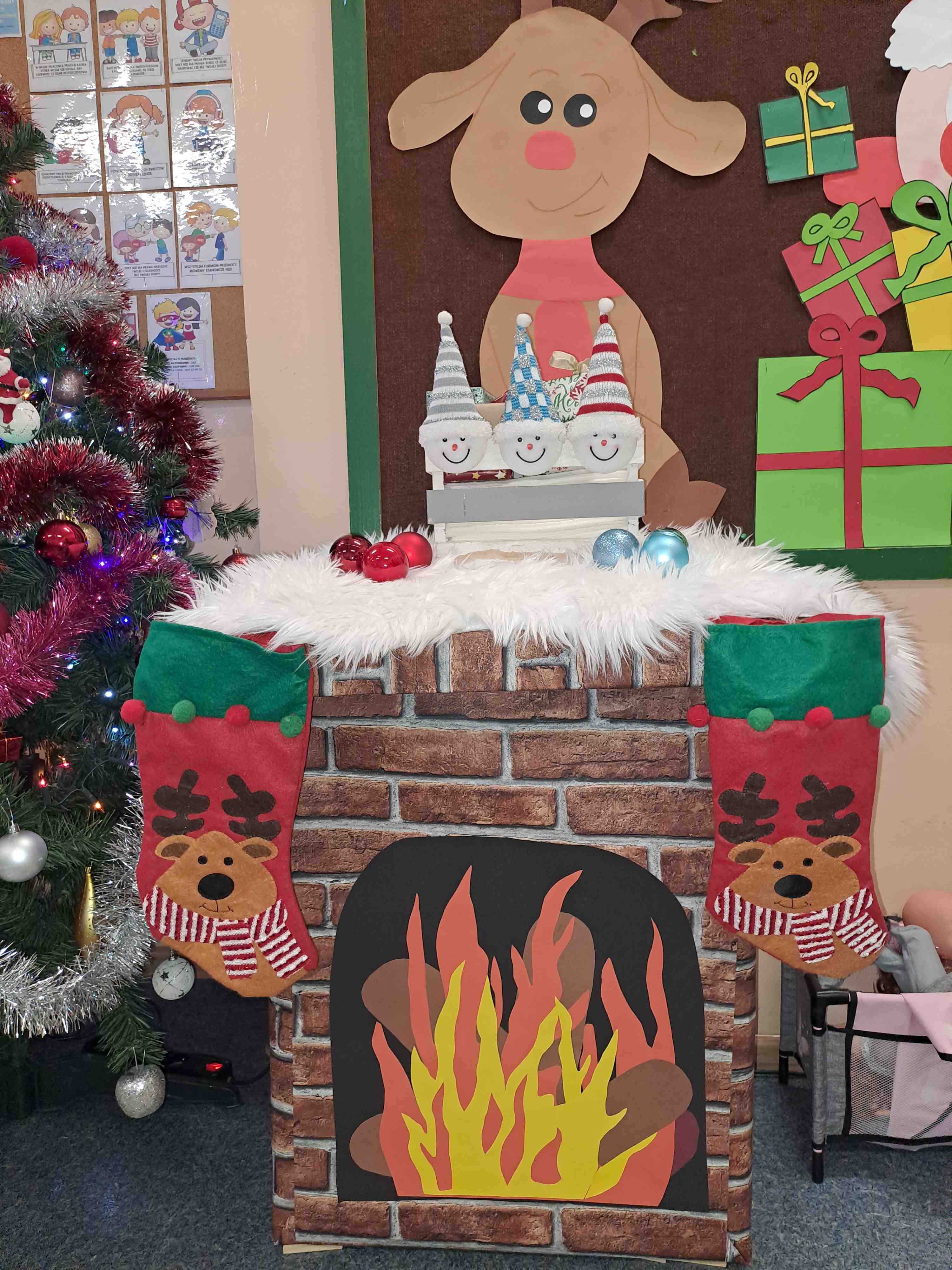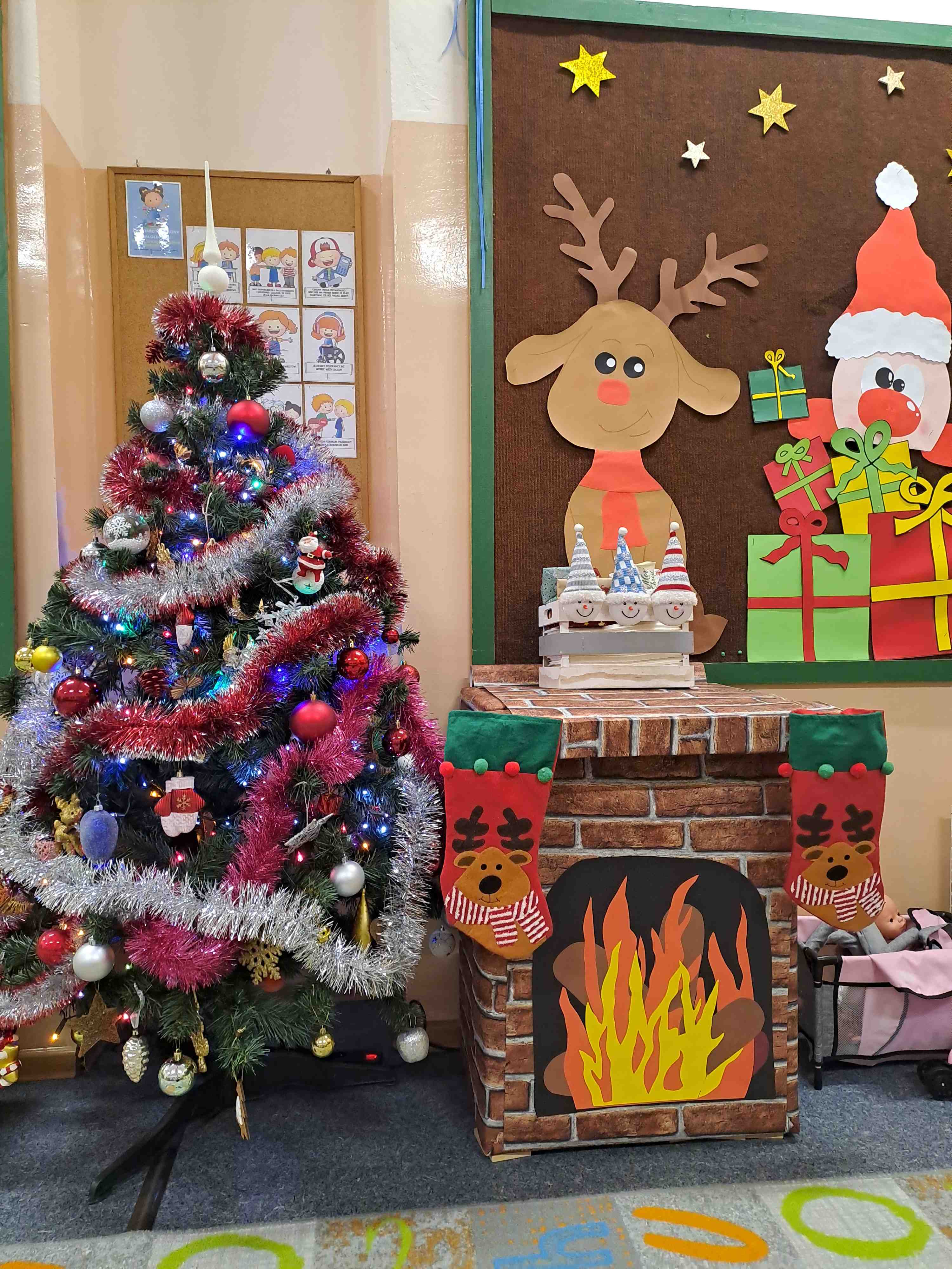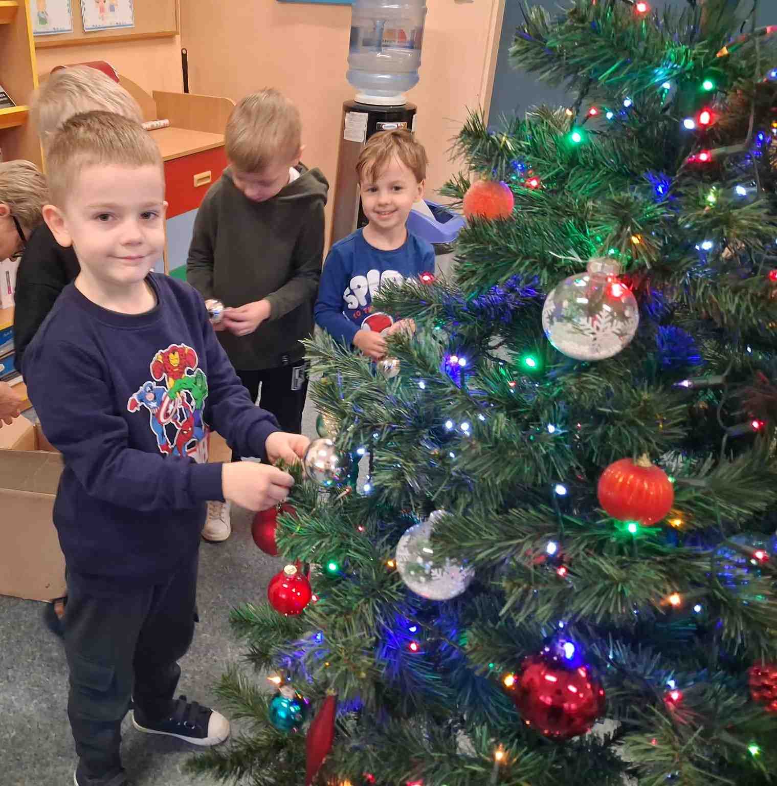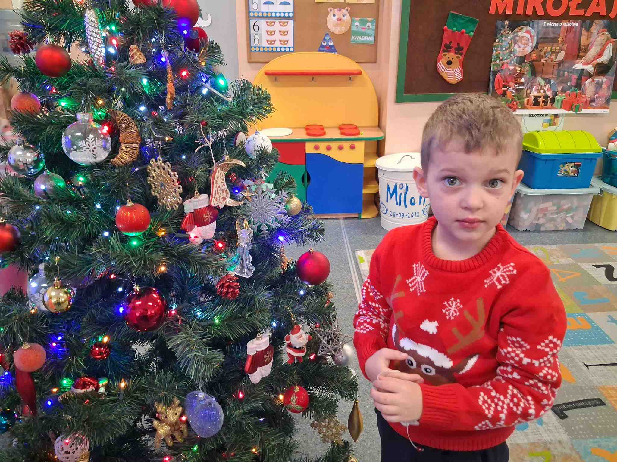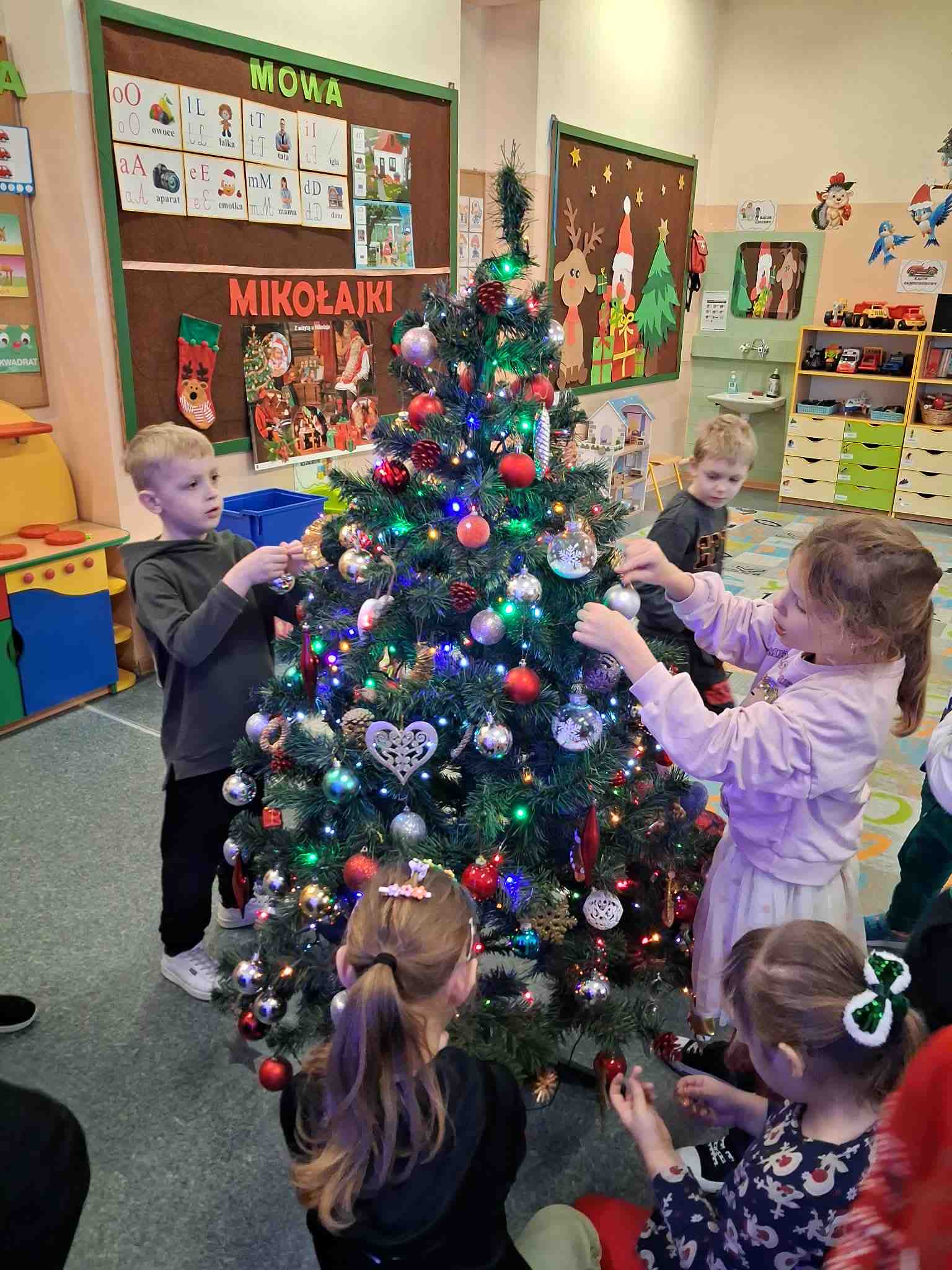 Jedną z najpiękniejszych i najbardziej wyczekiwanych przez dzieci tradycji przedświątecznych jest ubieranie choinki. W naszej sali również stanęło pięknie udekorowane drzewko. Motylki z radością przystąpiły do strojenia choinki w kolorowe bombki i łańcuchy. Obok drzewka skonstruowaliśmy i ozdobiliśmy także świąteczny kominek, obowiązkowo ze skarpetkami, do których Mikołaj może wrzucić nam drobne upominki. W tak pięknej scenerii nie mogło zabraknąć pamiątkowych fotografii.
