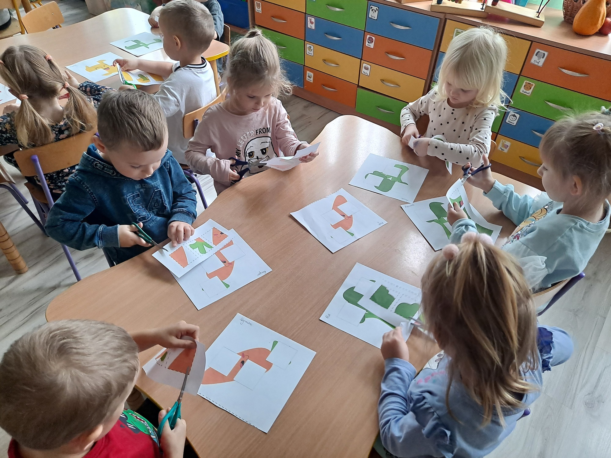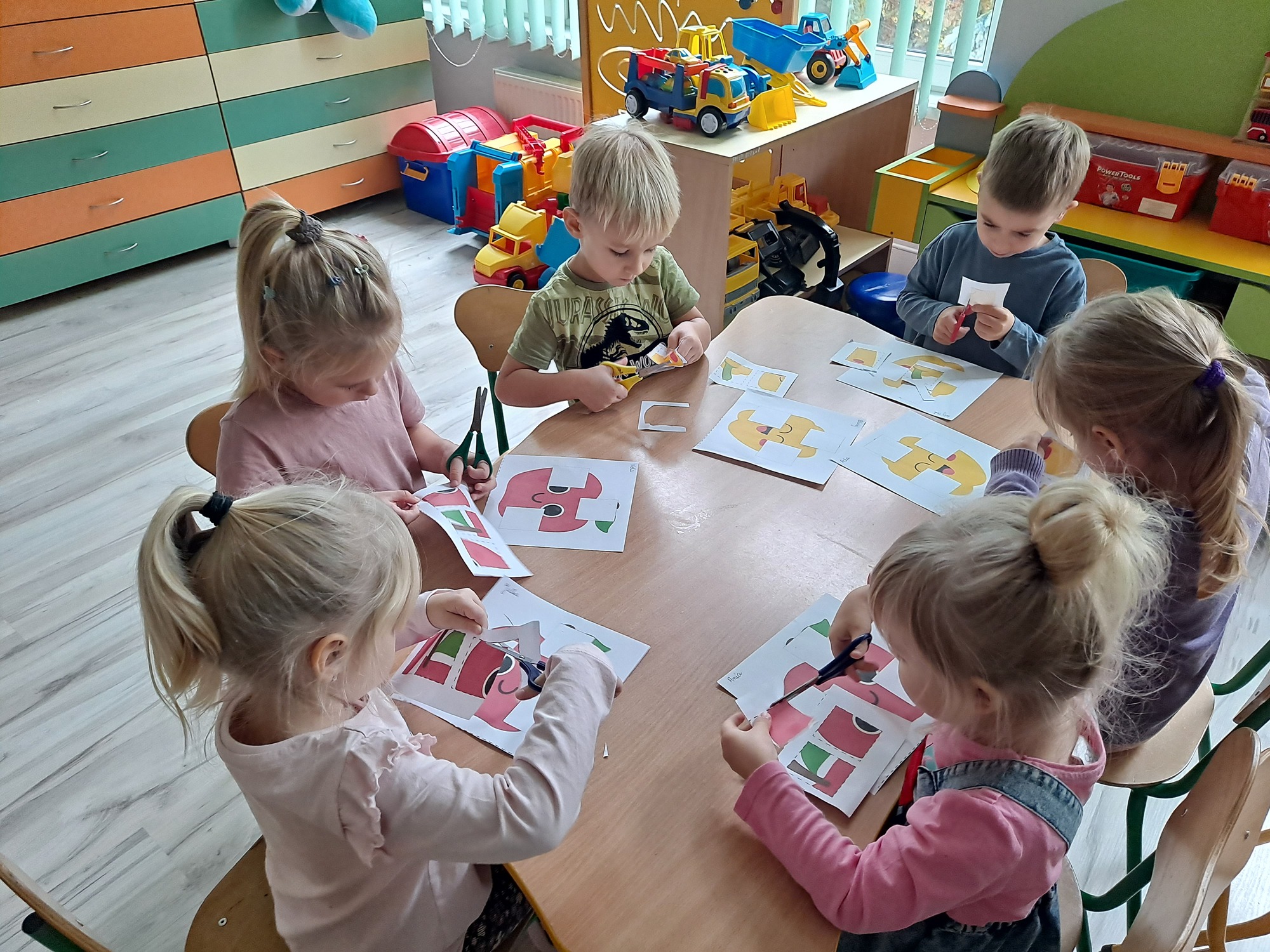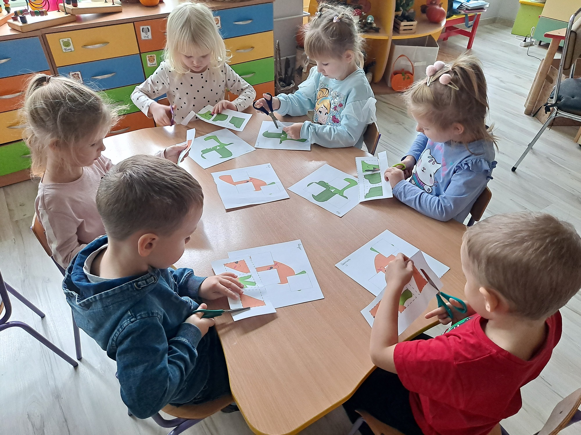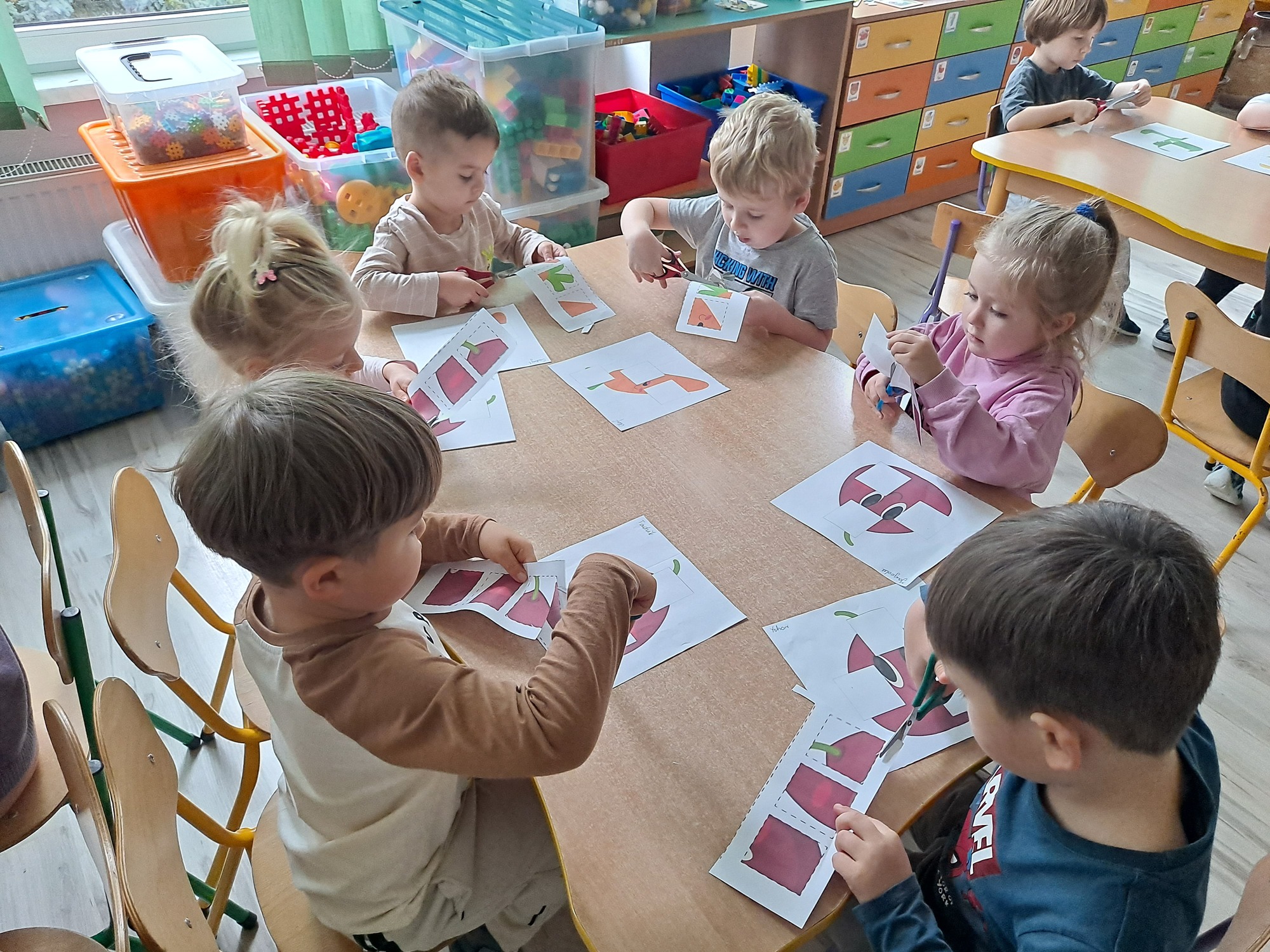 Na zakończenie zajęć każdy przedszkolak wykonał kartę pracy, w której należało wyciąć brakujące elementy i uzupełnić obrazek. Zadanie wymagało spostrzegawczości, precyzji i cierpliwości, a dzieci poradziły sobie z nim doskonale!