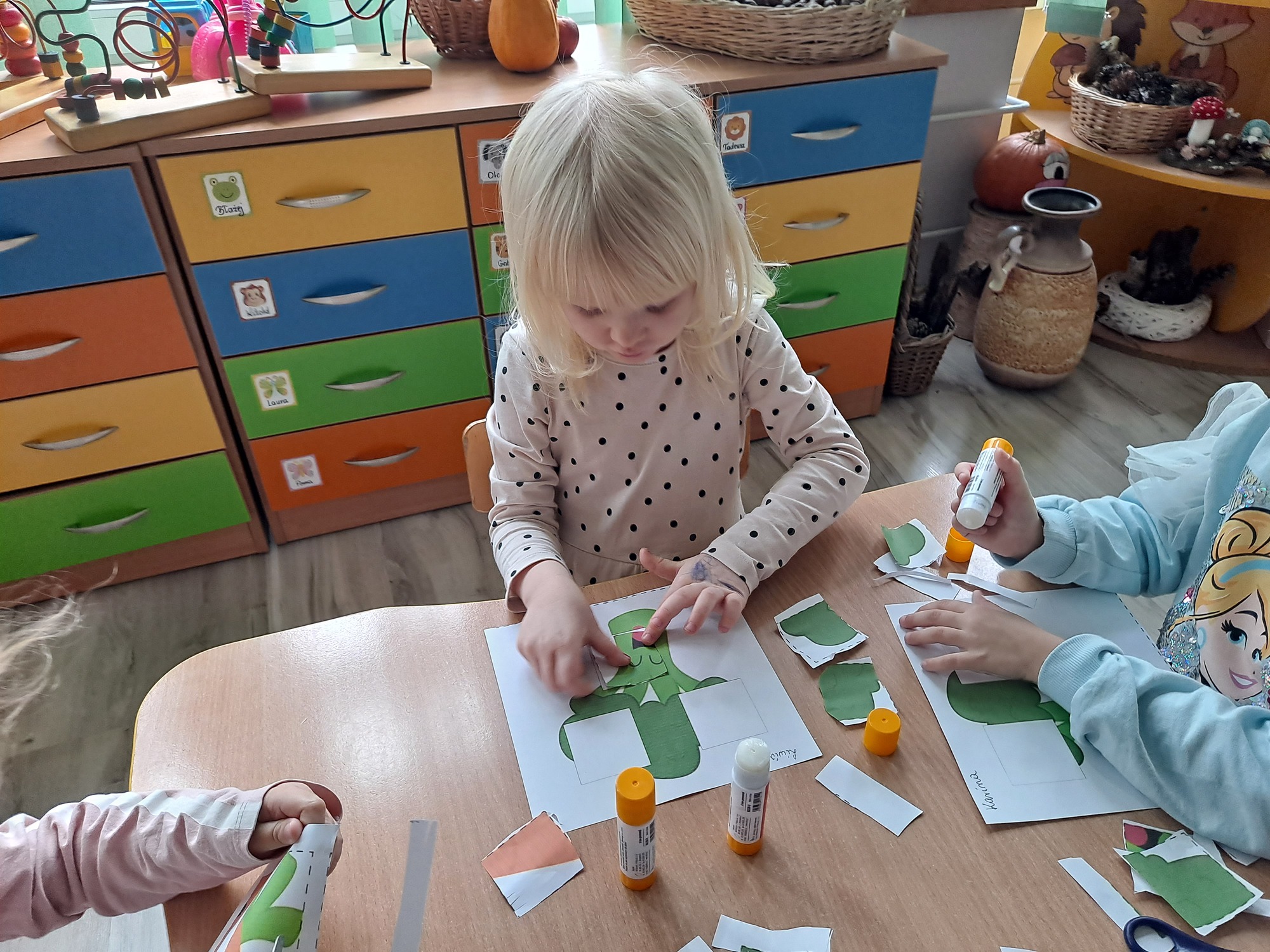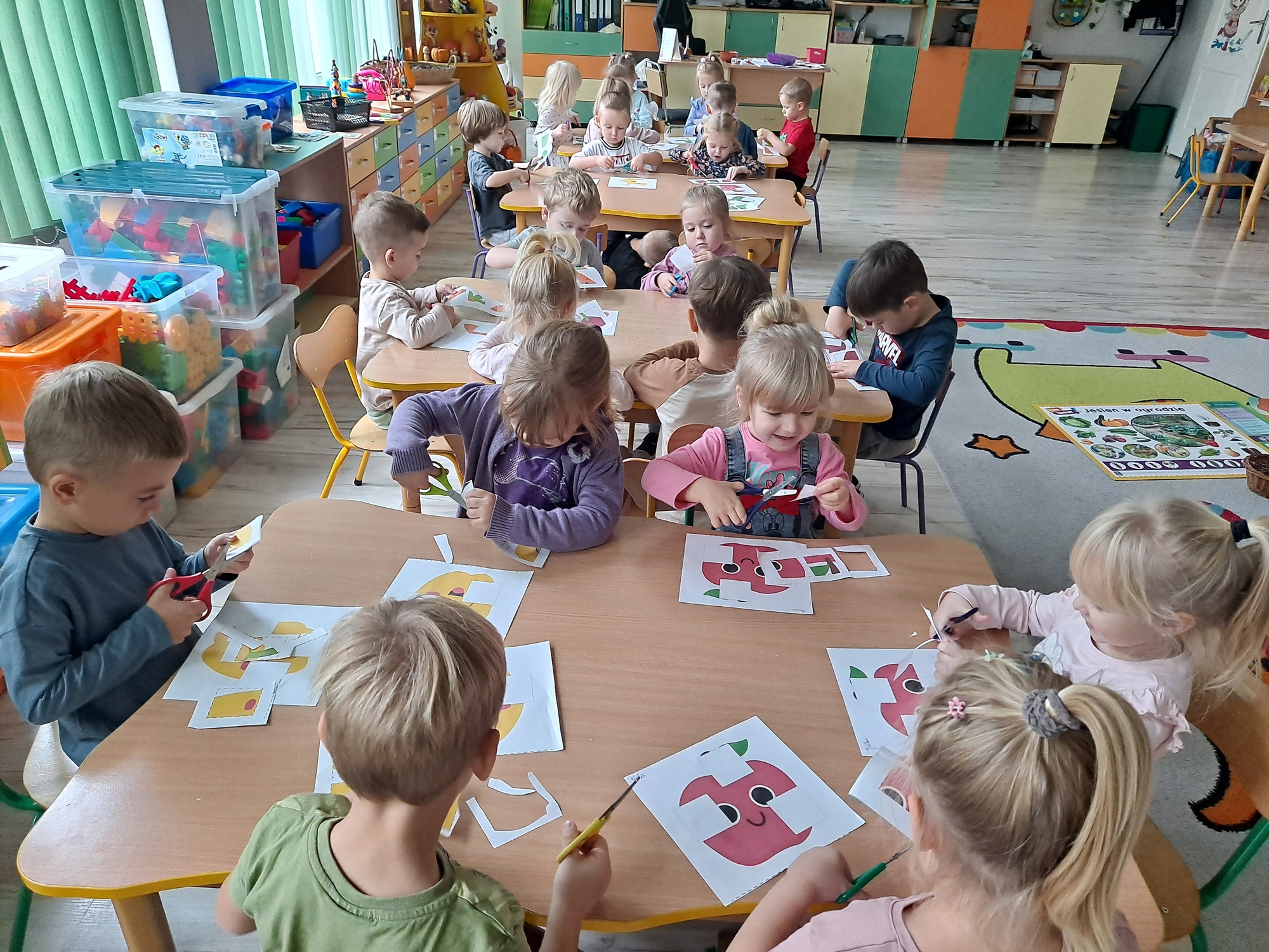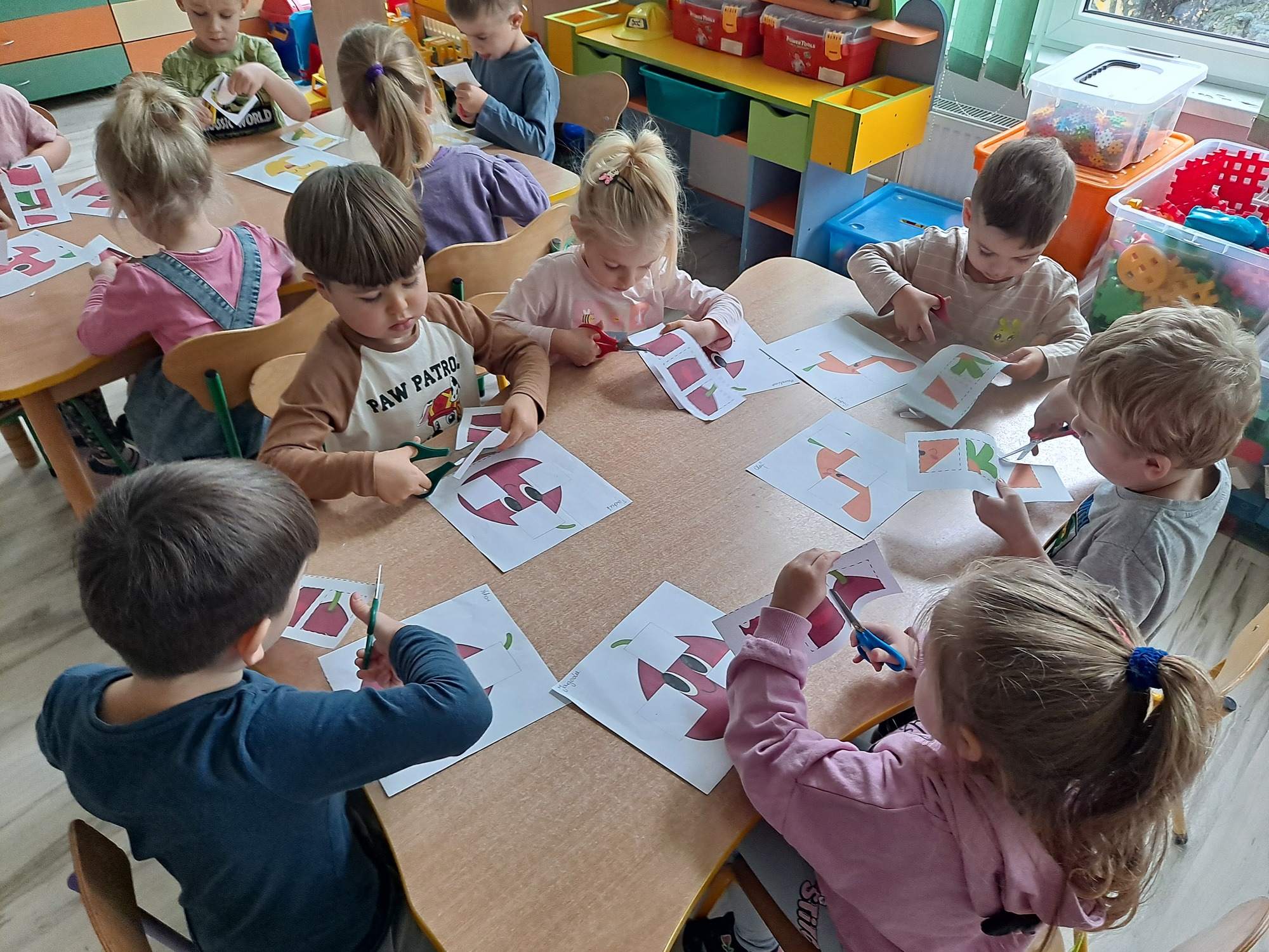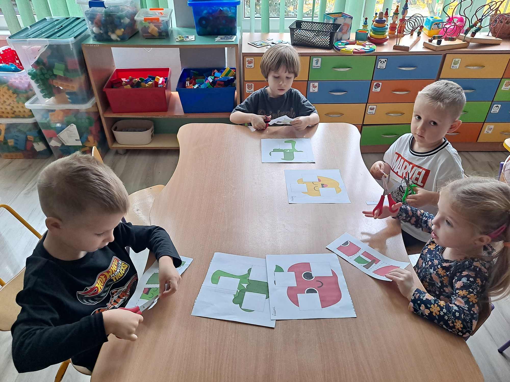 Na zakończenie zajęć każdy przedszkolak wykonał kartę pracy, w której należało wyciąć brakujące elementy i uzupełnić obrazek. Zadanie wymagało spostrzegawczości, precyzji i cierpliwości, a dzieci poradziły sobie z nim doskonale!