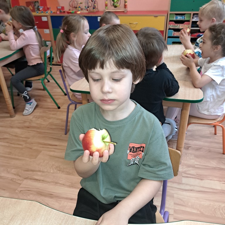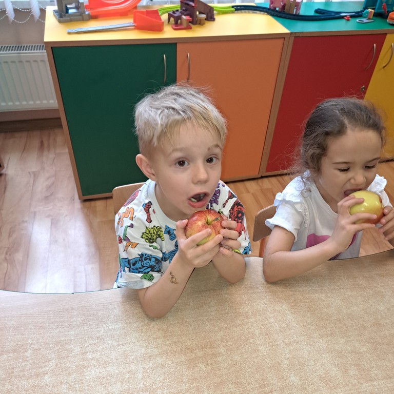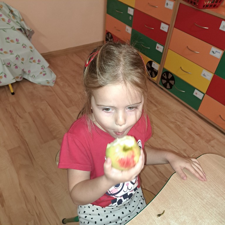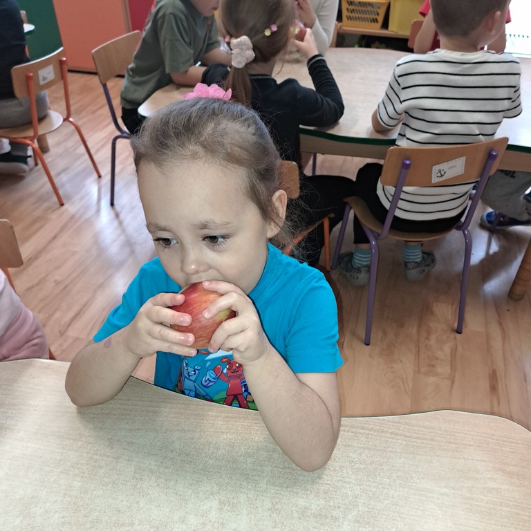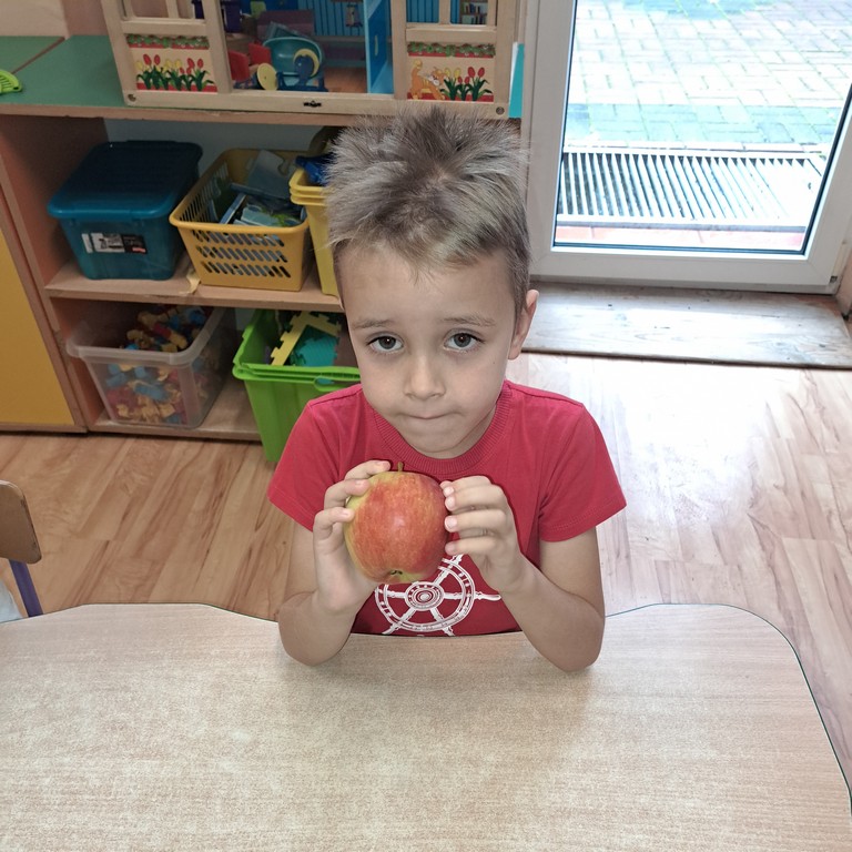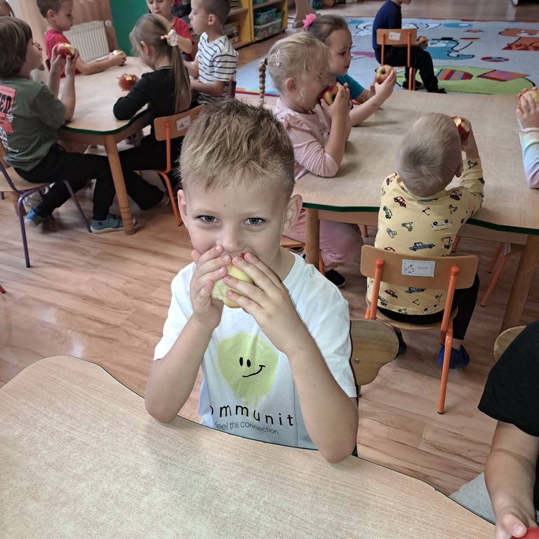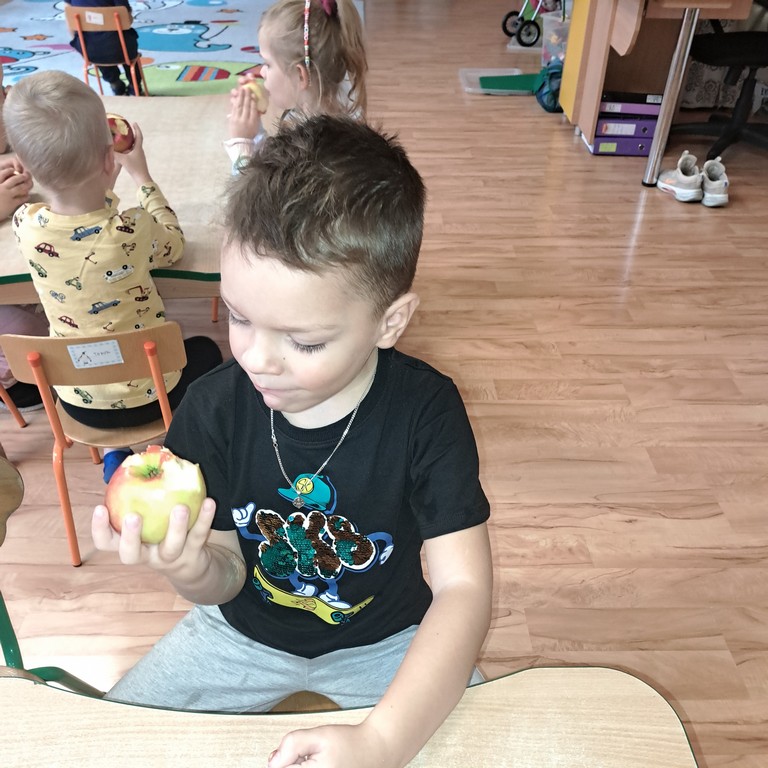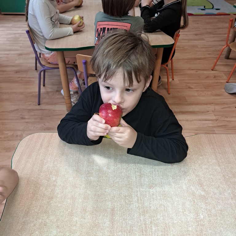 W sadzie powitał nas Właściciel, który oprowadził nas i opowiedział kilka ciekawostek na temat różnych odmian jabłoni. Dzieci grzecznie spacerowały pośród małych drzewek podziwiając i zbierając rumiane jabłka. Wszystkie Przedszkolaki zostały poczęstowane pachnącymi i soczystymi owocami. Zapach i błyszcząca skórka jabłek była najlepszą zachętą do spożywania witamin.