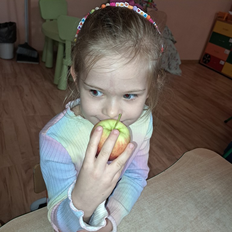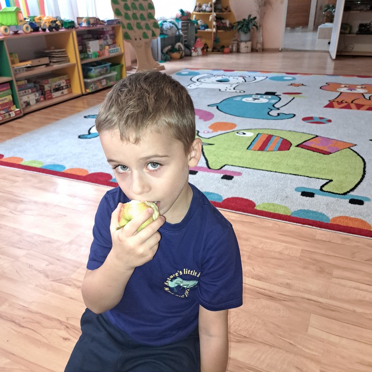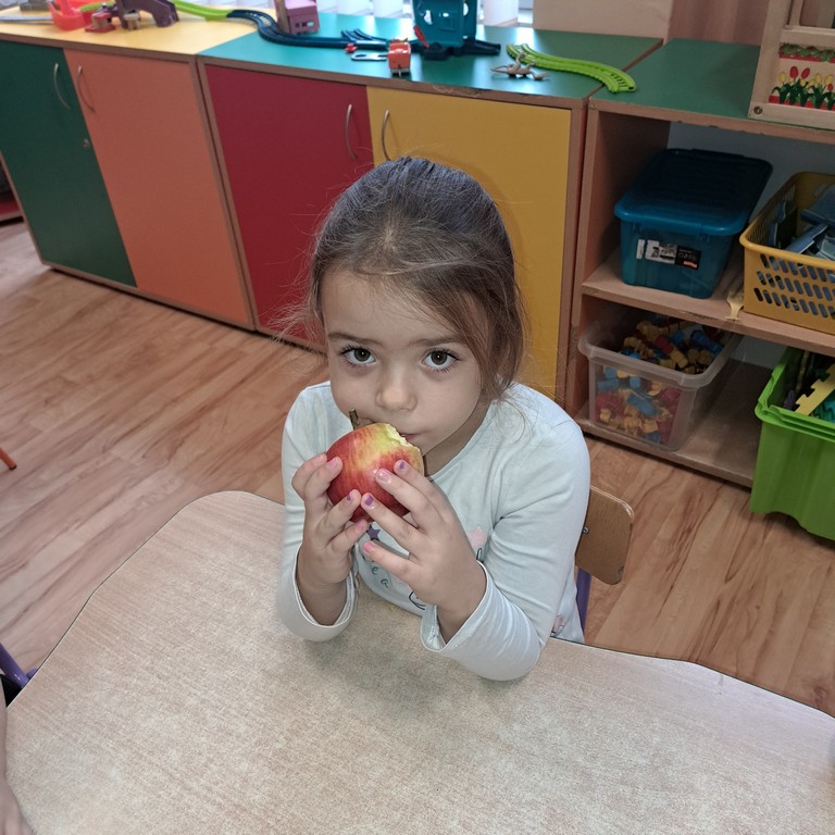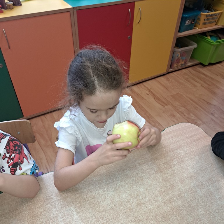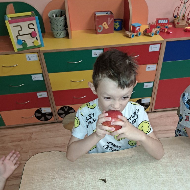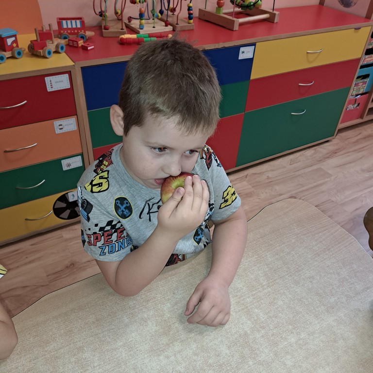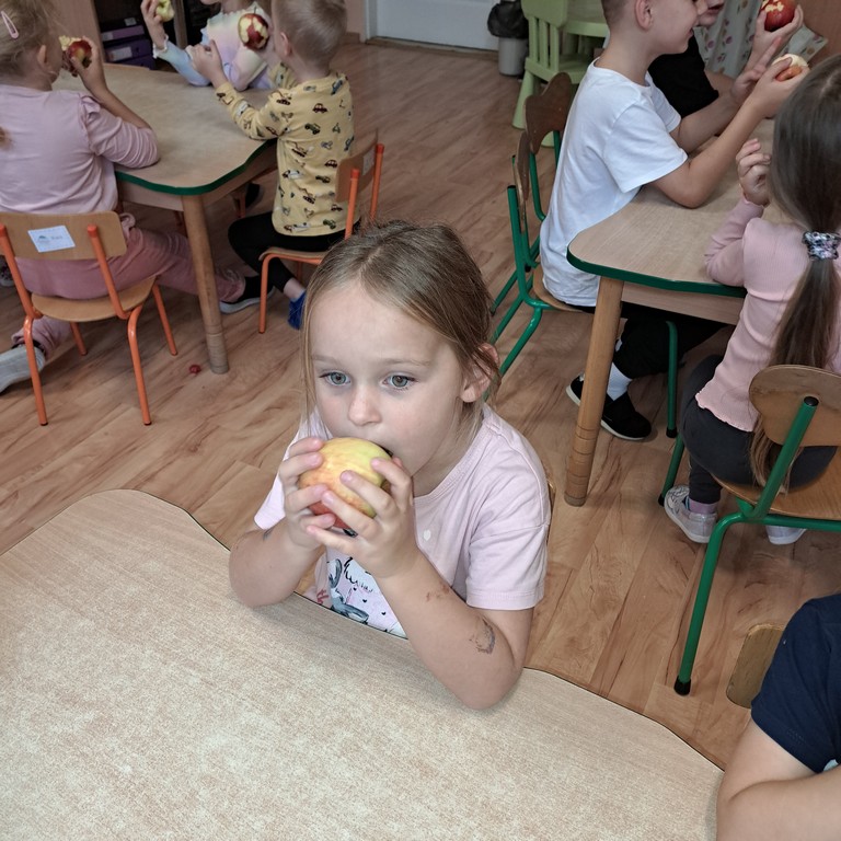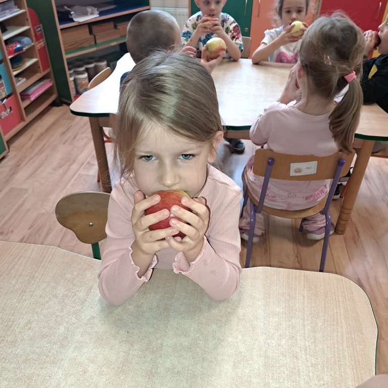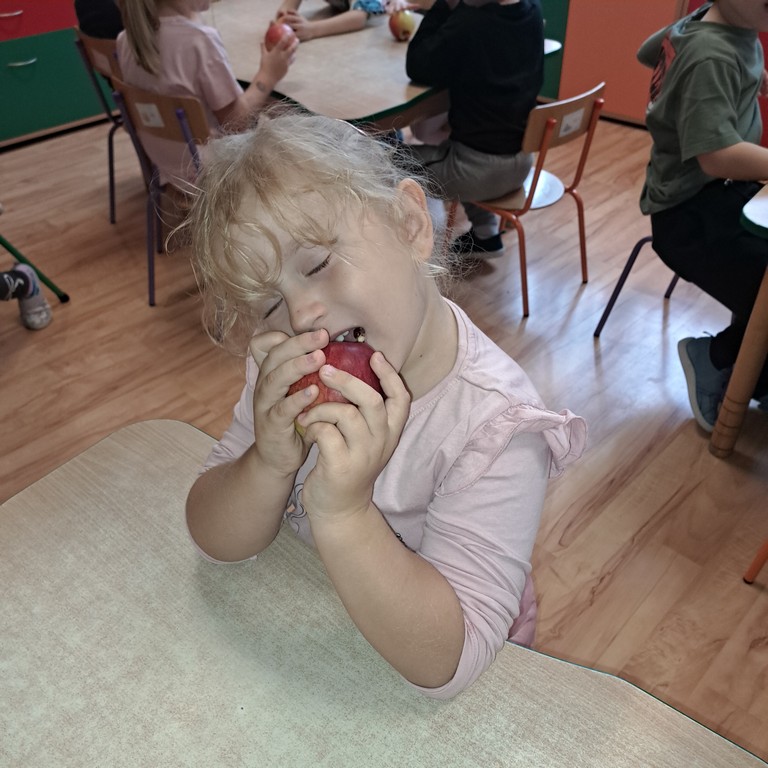 W sadzie powitał nas Właściciel, który oprowadził nas i opowiedział kilka ciekawostek na temat różnych odmian jabłoni. Dzieci grzecznie spacerowały pośród małych drzewek podziwiając i zbierając rumiane jabłka. Wszystkie Przedszkolaki zostały poczęstowane pachnącymi i soczystymi owocami. Zapach i błyszcząca skórka jabłek była najlepszą zachętą do spożywania witamin.