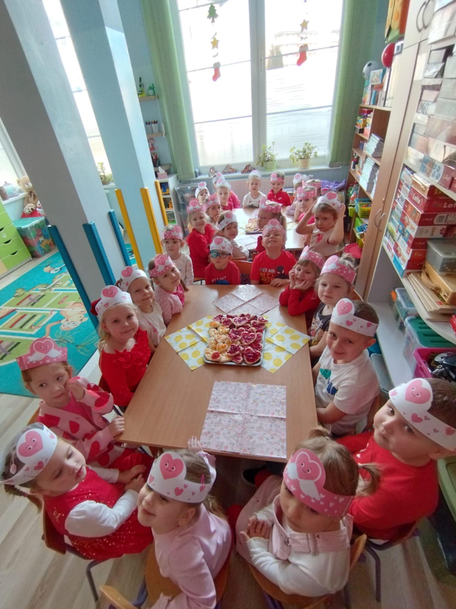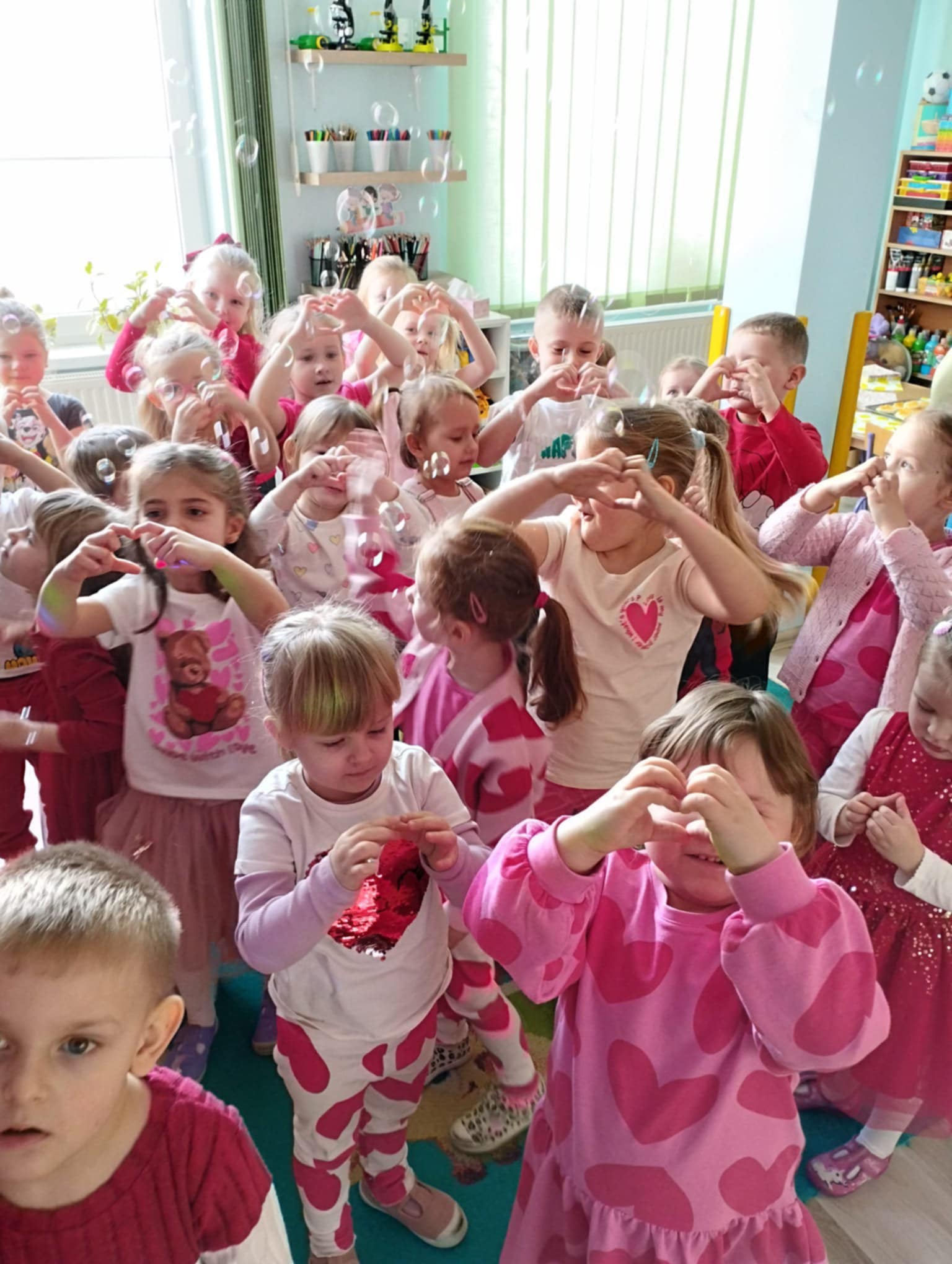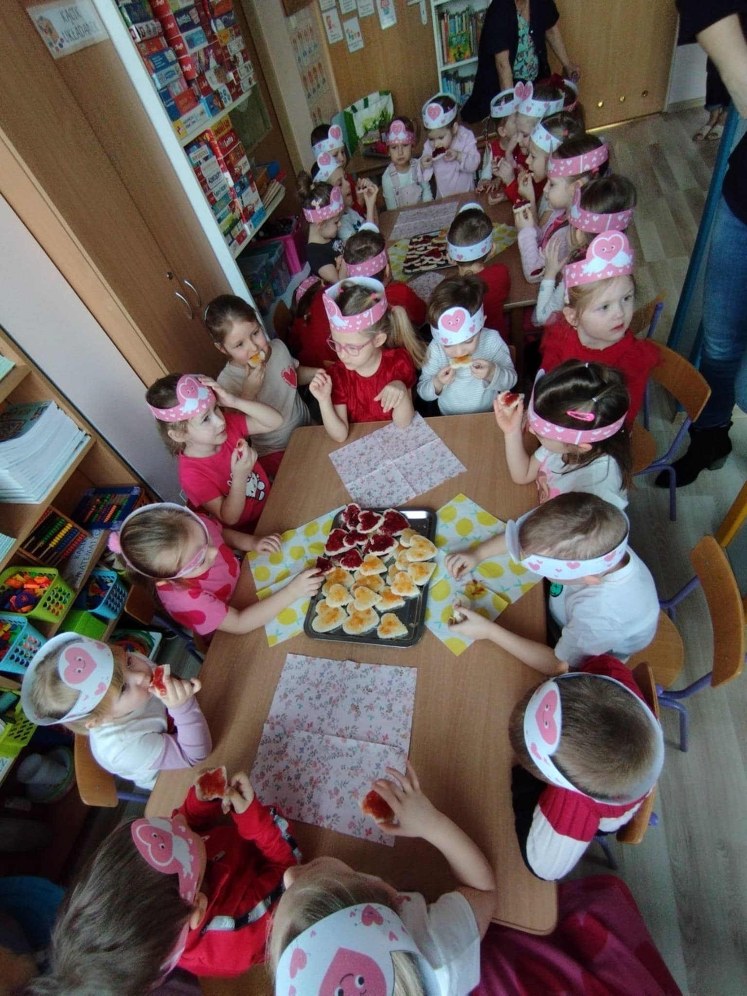 Chłopcy i dziewczęta w oczekiwaniu na liściki i laurki, dowiedziały się, na czym polega fenomen tego dnia oraz chętnie uczestniczyły w tańcach i pląsach przy walentynkowych piosenkach, a także pozowały do zdjęć na tle dekoracji. Dla każdego czekał także słodki poczęstunek w kształcie tostowego serduszka z pysznym dżemem.