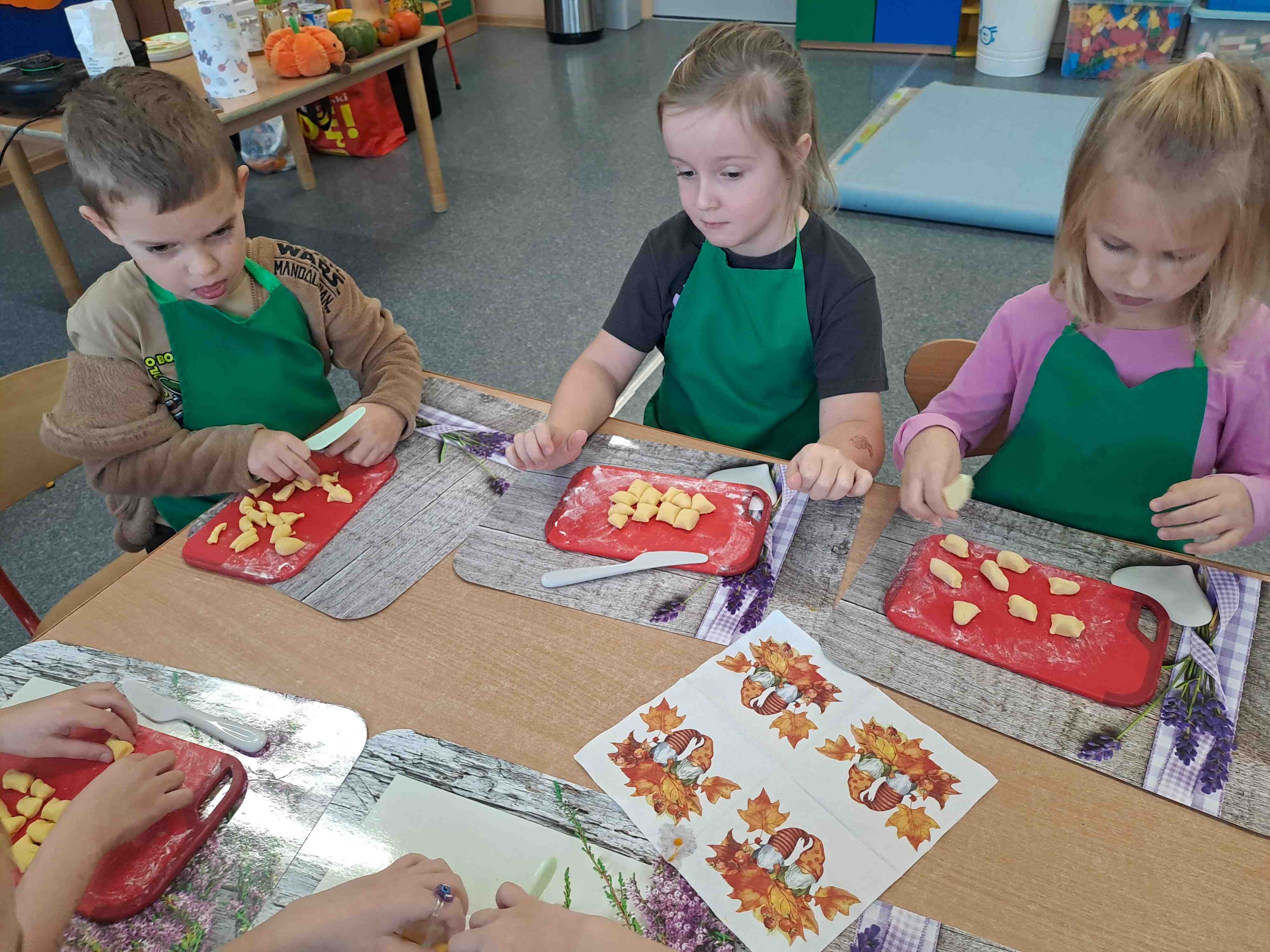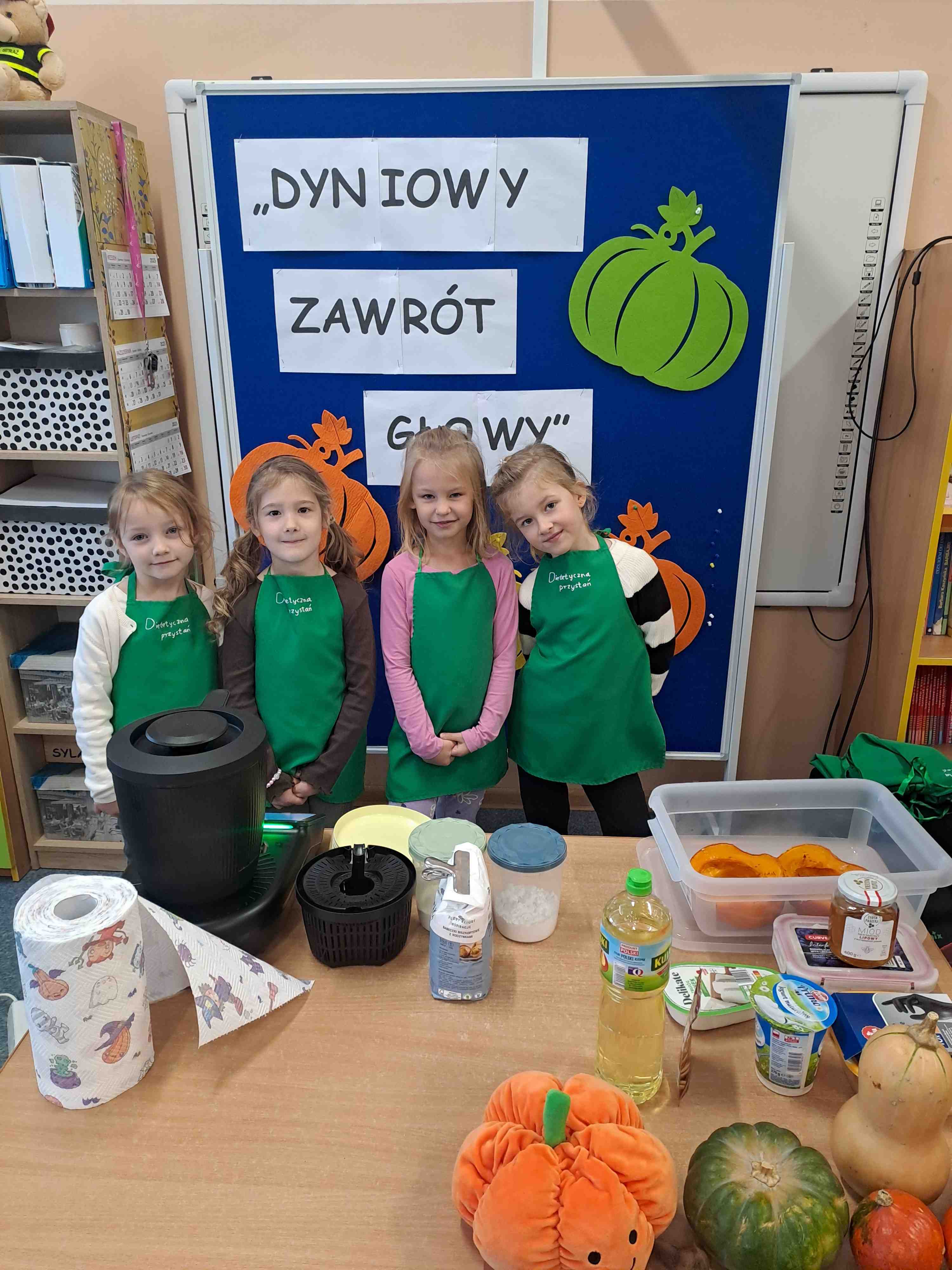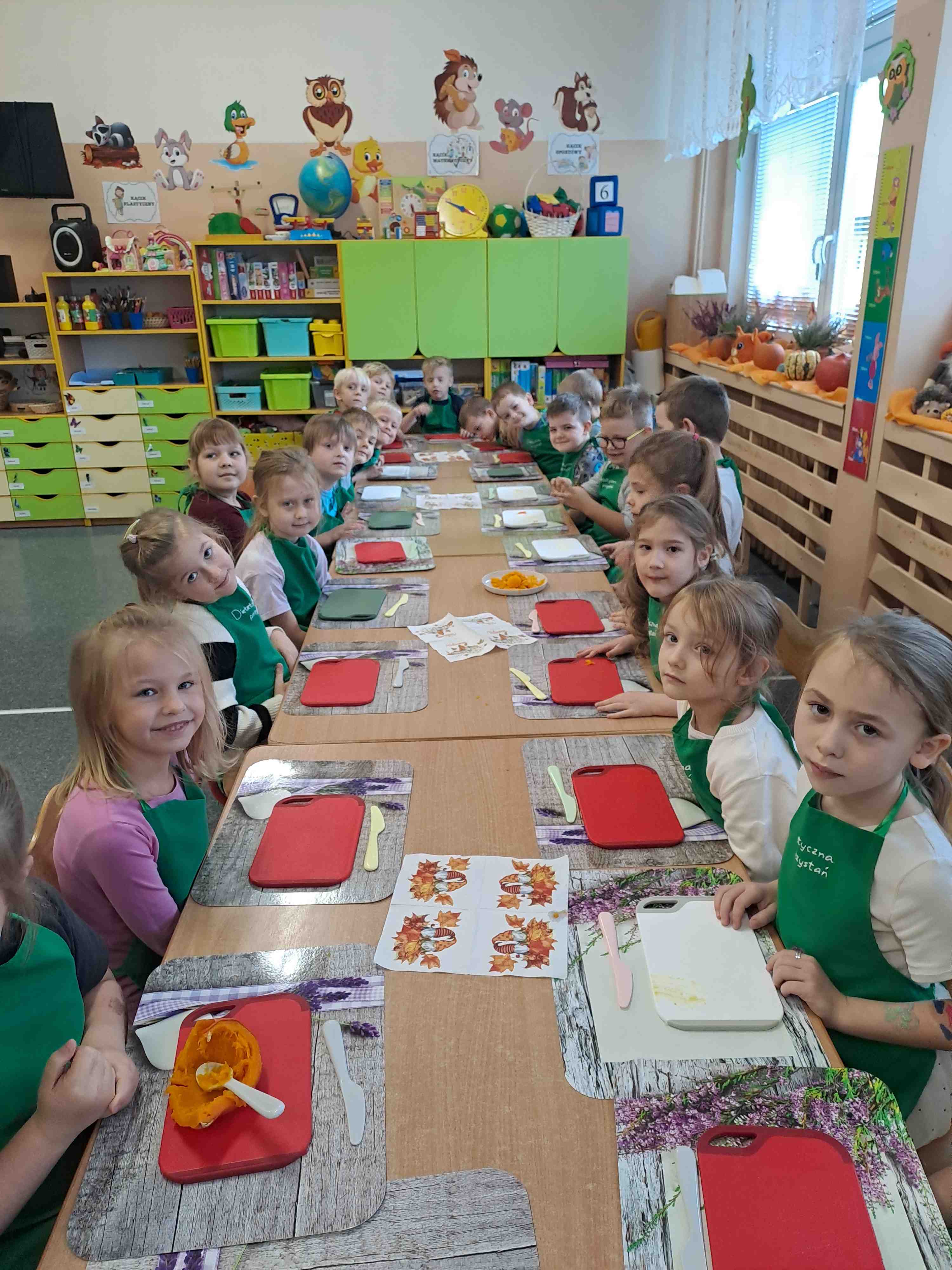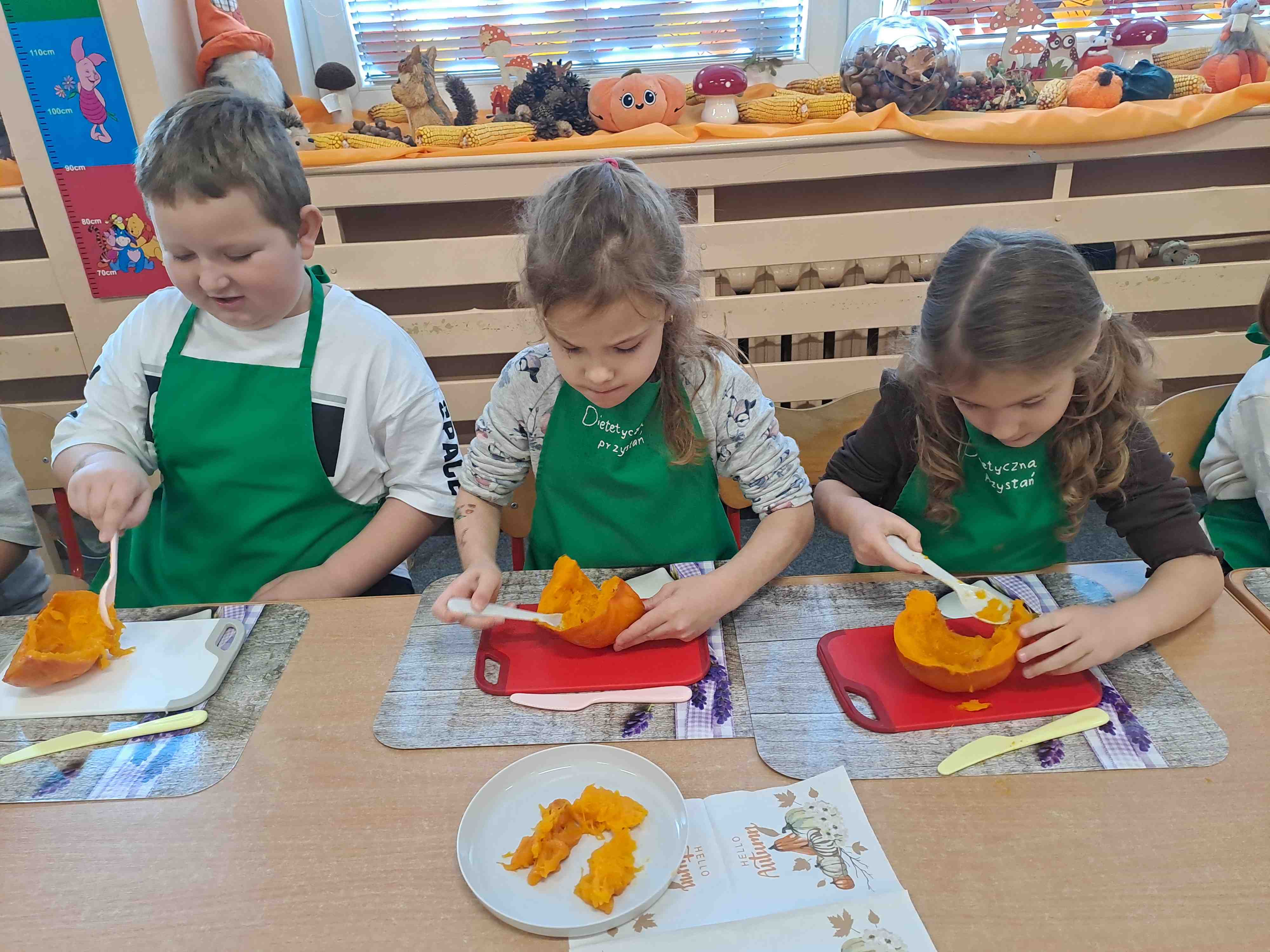 W dniu dzisiejszym Motylki miały możliwość uczestniczyć w warsztatach kulinarnych, przeprowadzonych przez p. Weronikę Moruzgałę z "Dietetycznej przystani". Tematem przewodnim tegorocznego spotkania z panią dietetyk była dynia. Dzieci usłyszały wiele cennych ciekawostek na temat tego warzywa, opisywały jego walory smakowe i zdrowotne. Oglądały różne gatunki dyń. Ale najważniejszym punktem warsztatów było przygotowanie przez dzieci dyniowych kopytek, które bardzo nam wszystkim smakowały!