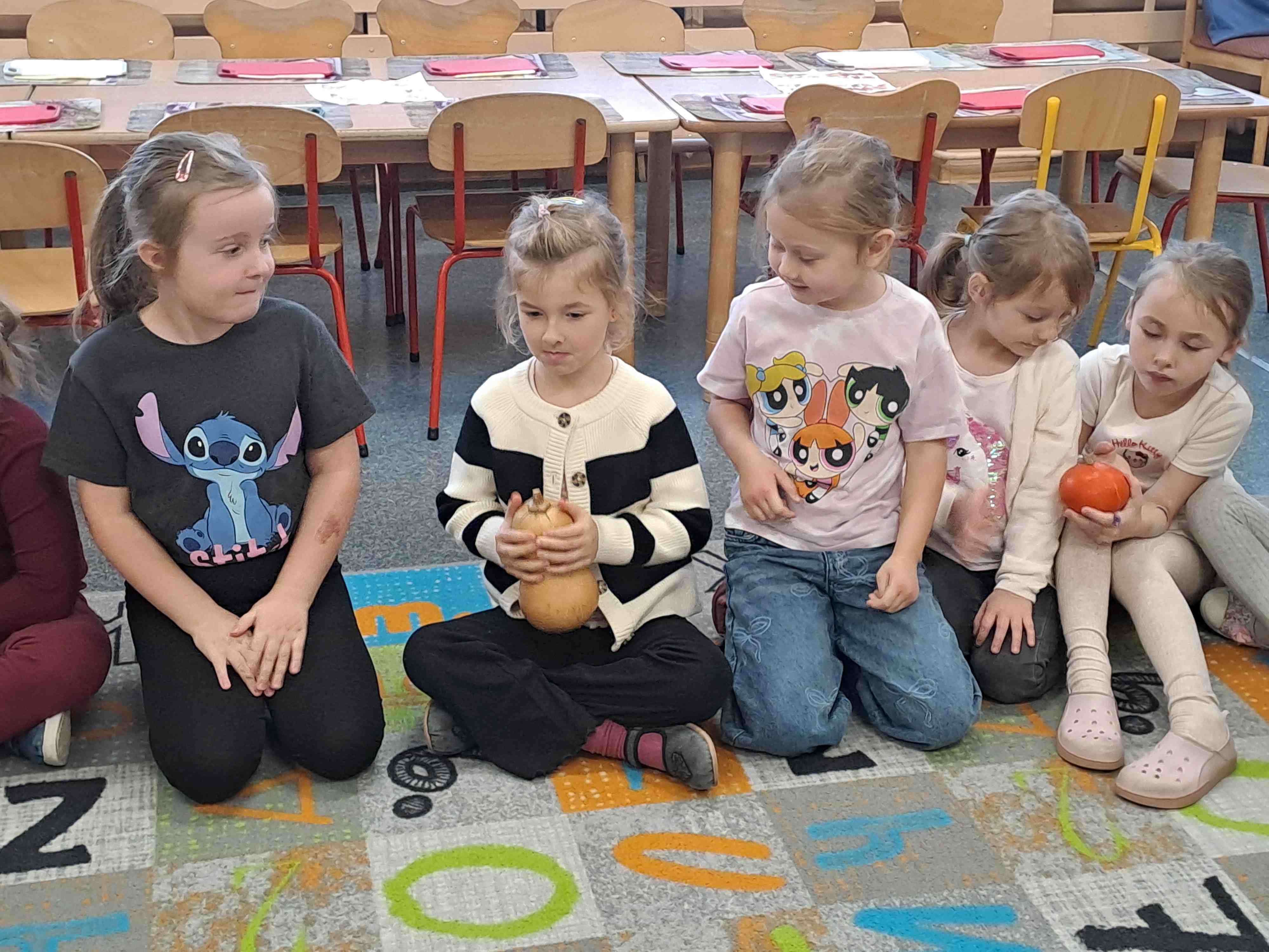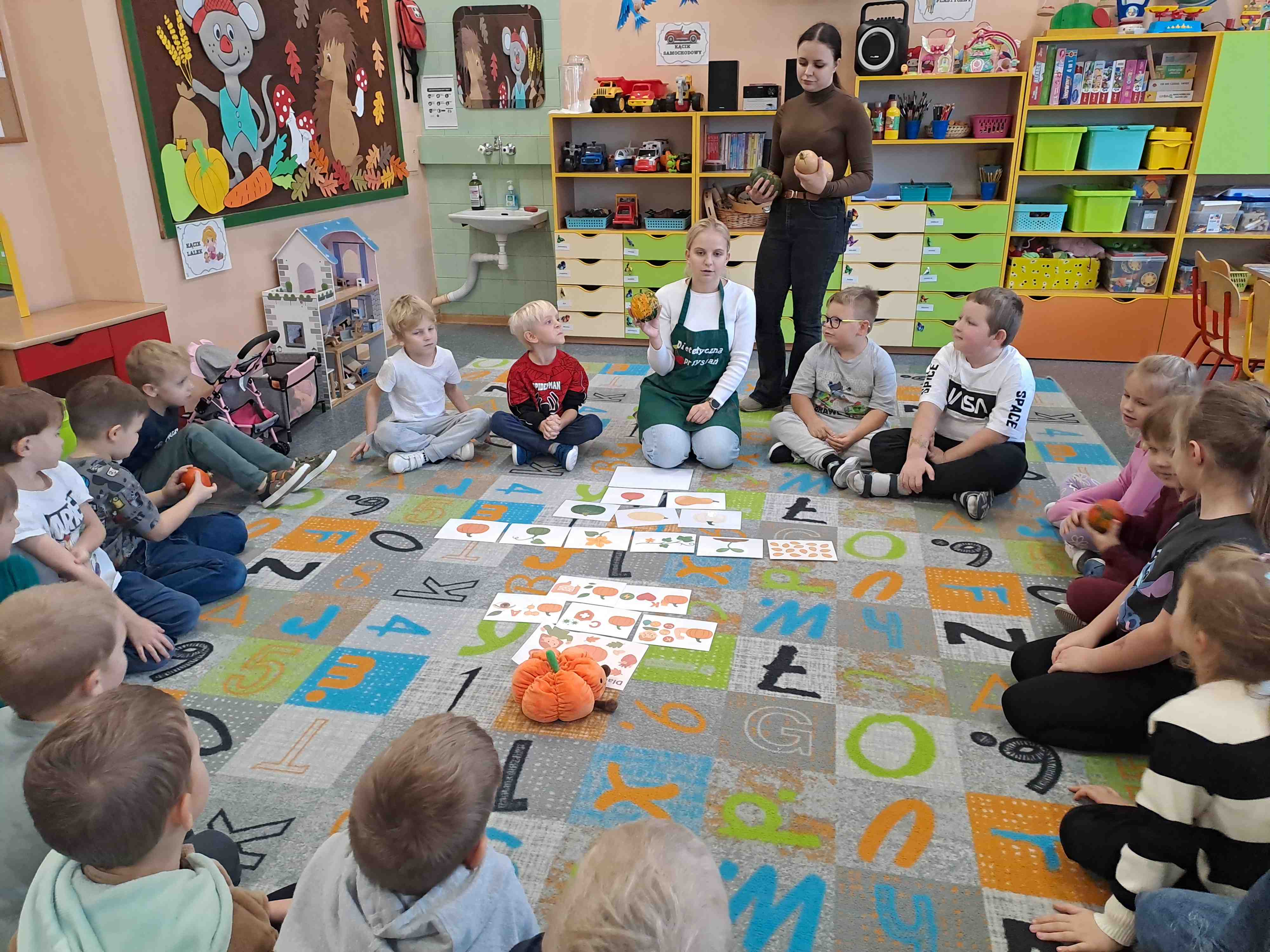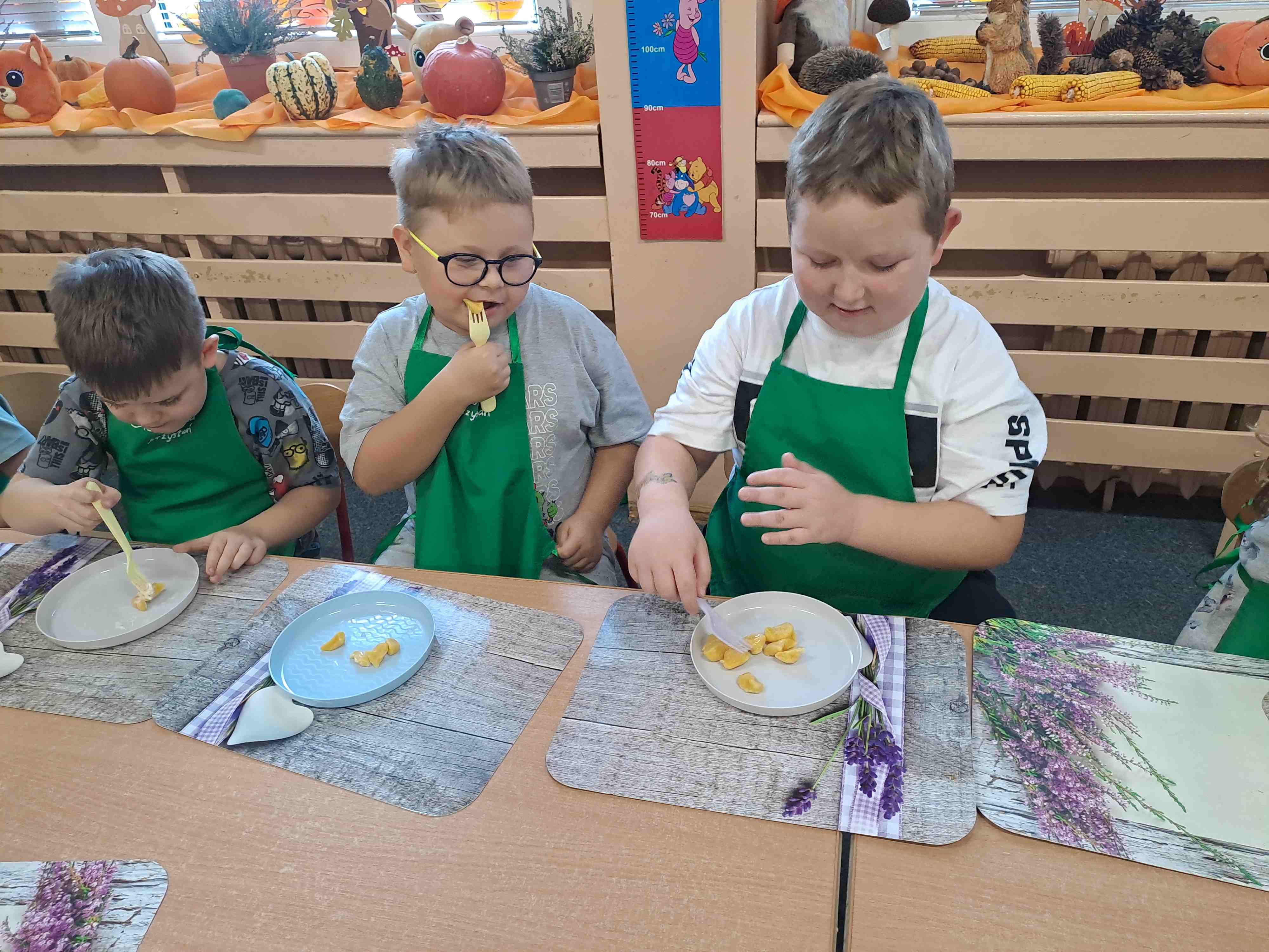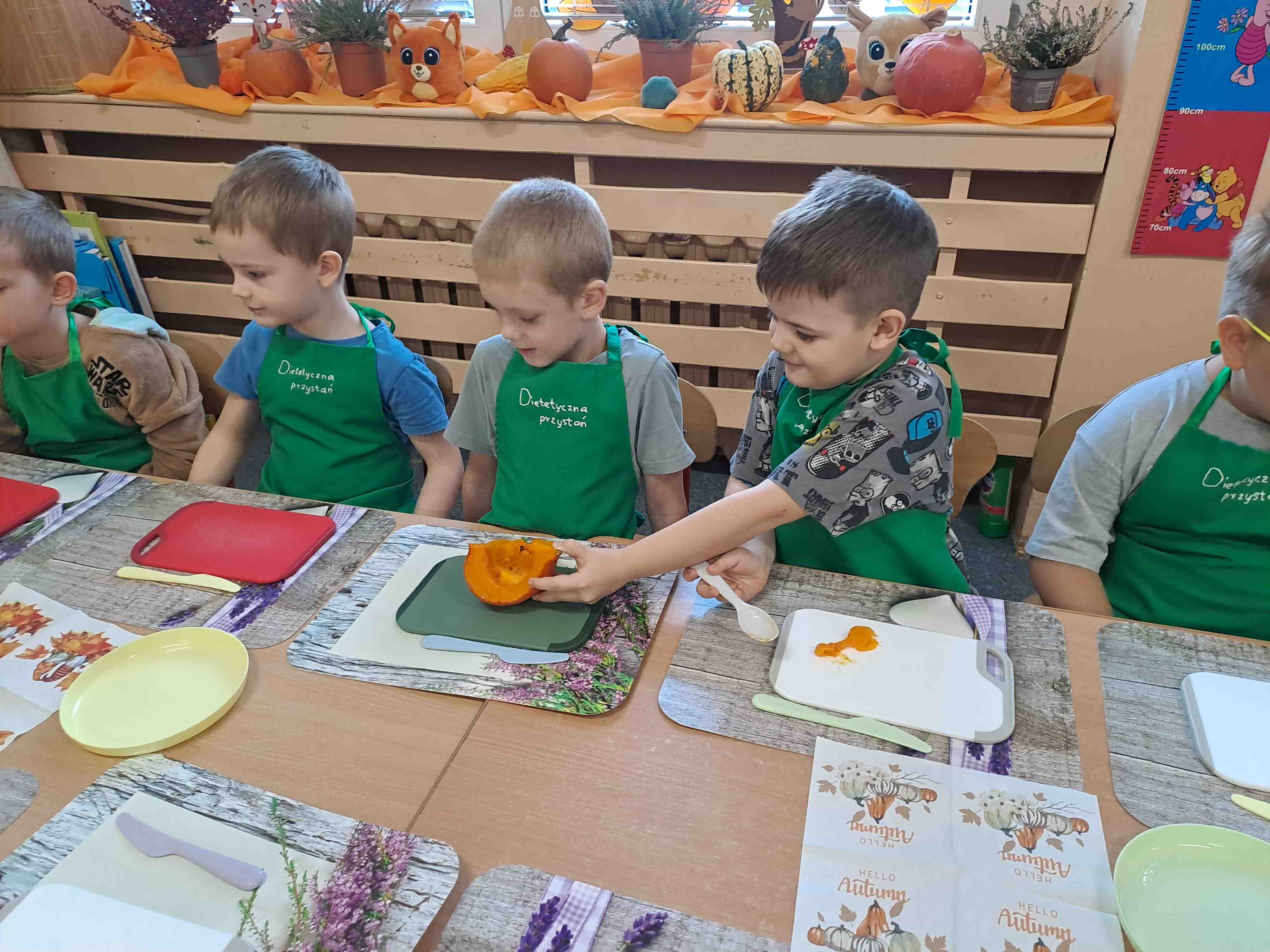 W dniu dzisiejszym Motylki miały możliwość uczestniczyć w warsztatach kulinarnych, przeprowadzonych przez p. Weronikę Moruzgałę z "Dietetycznej przystani". Tematem przewodnim tegorocznego spotkania z panią dietetyk była dynia. Dzieci usłyszały wiele cennych ciekawostek na temat tego warzywa, opisywały jego walory smakowe i zdrowotne. Oglądały różne gatunki dyń. Ale najważniejszym punktem warsztatów było przygotowanie przez dzieci dyniowych kopytek, które bardzo nam wszystkim smakowały!