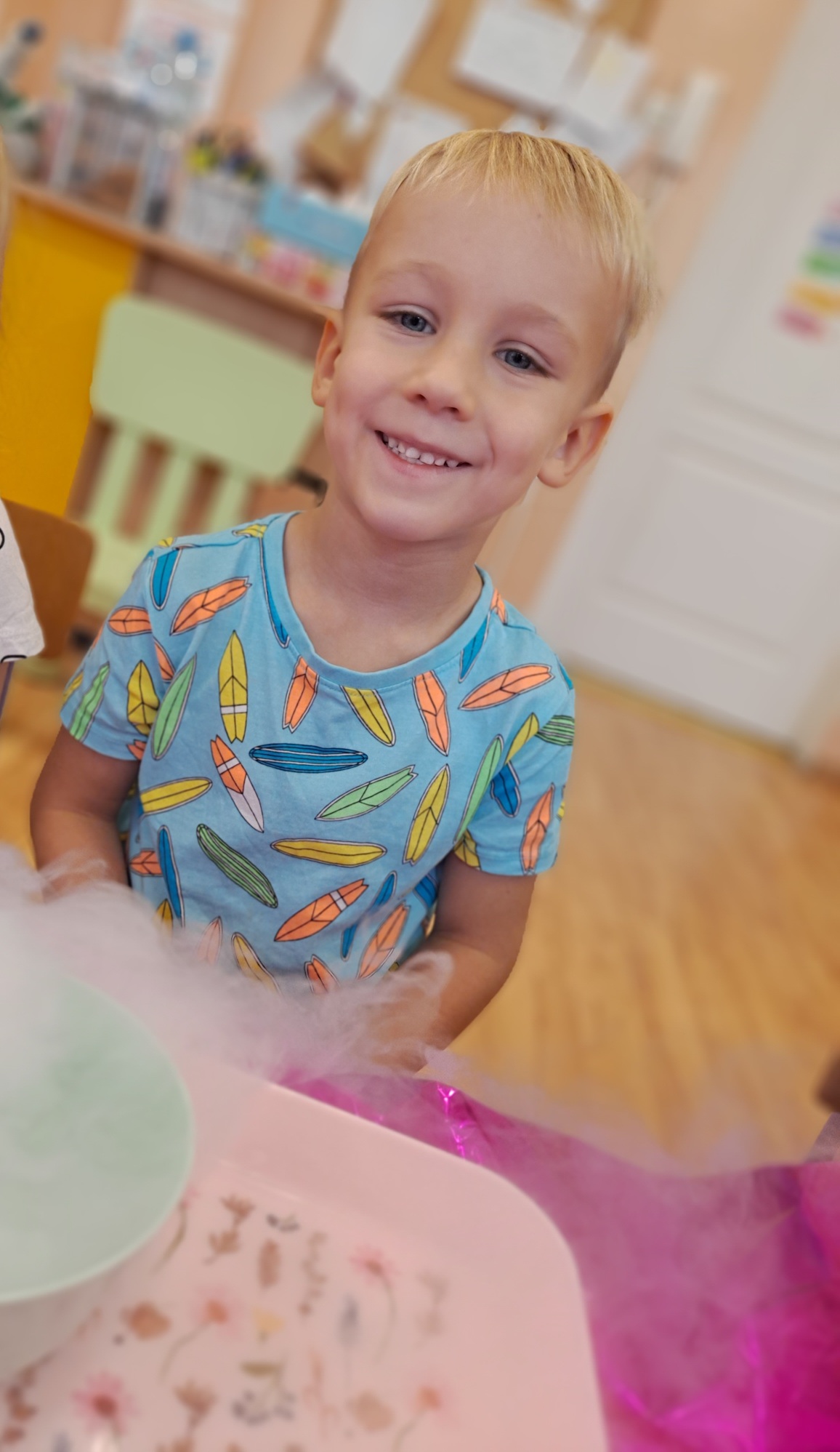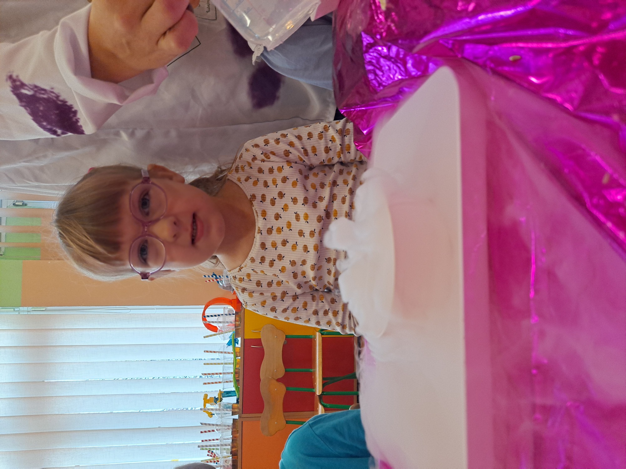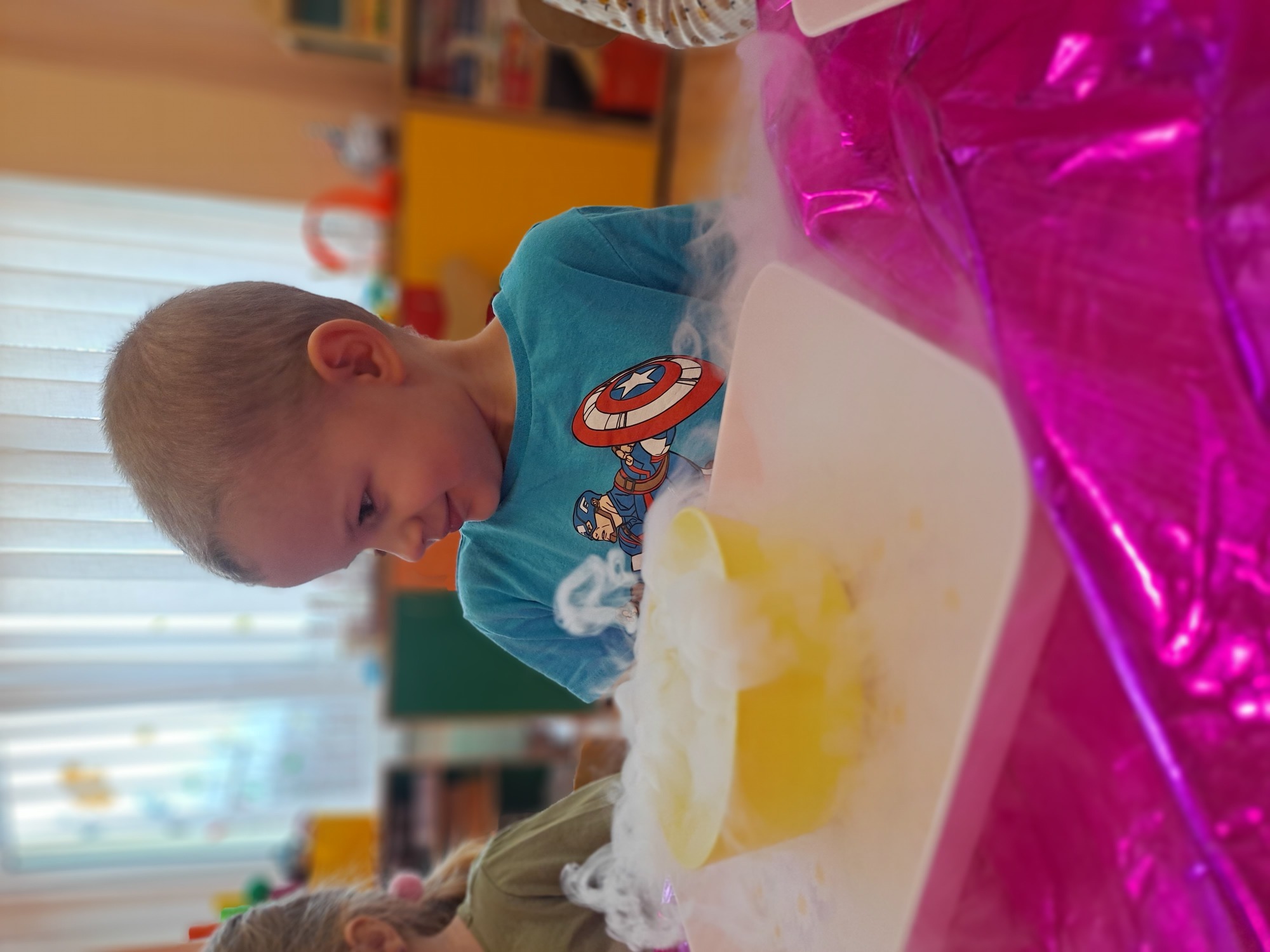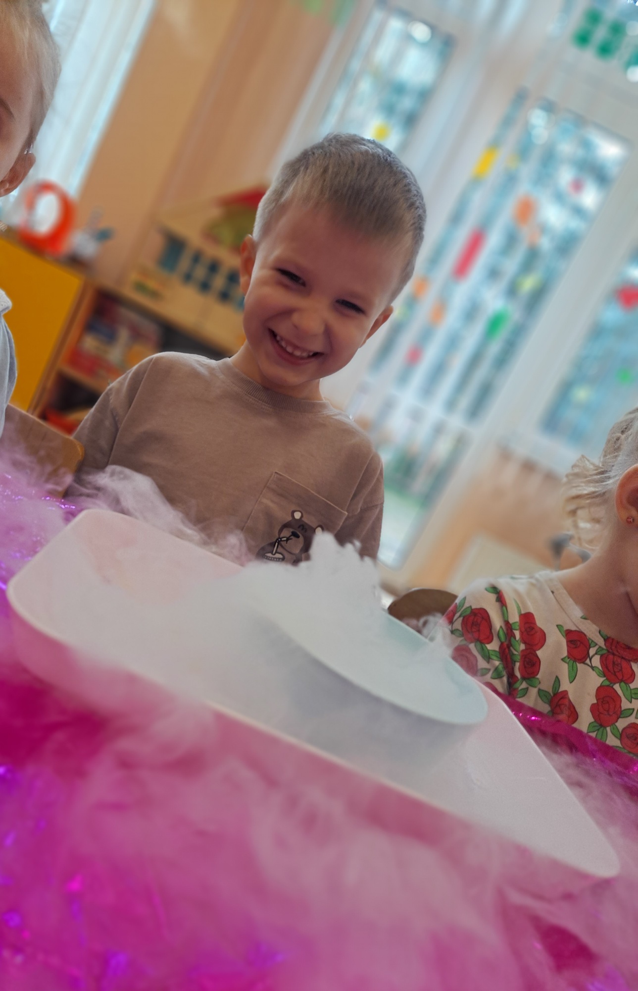 Dzieci miały okazję uczestniczyć w fascynujących doświadczeniach, w tym w zabawach z suchym lodem, które wywołały wiele śmiechu i zachwytu.