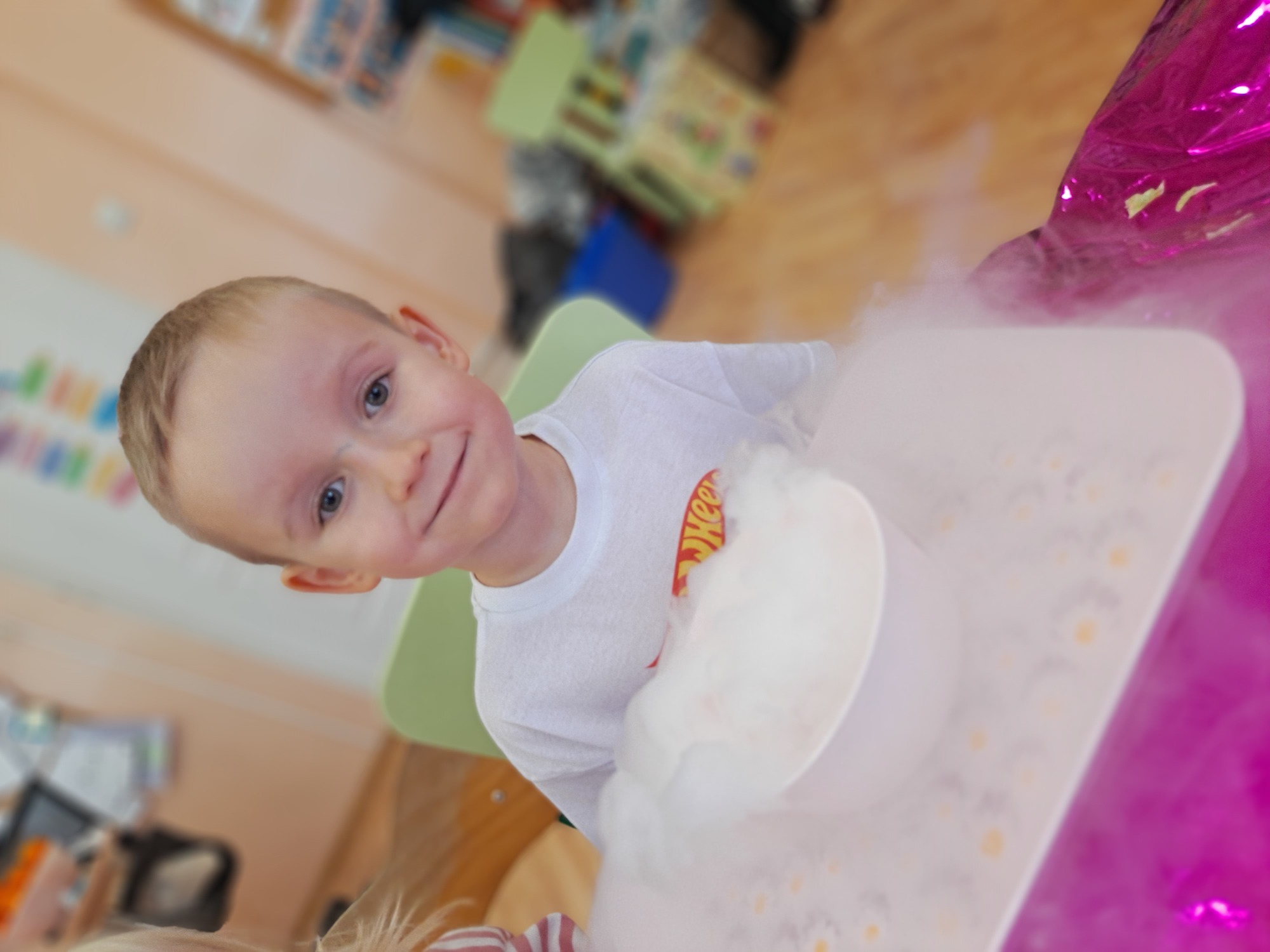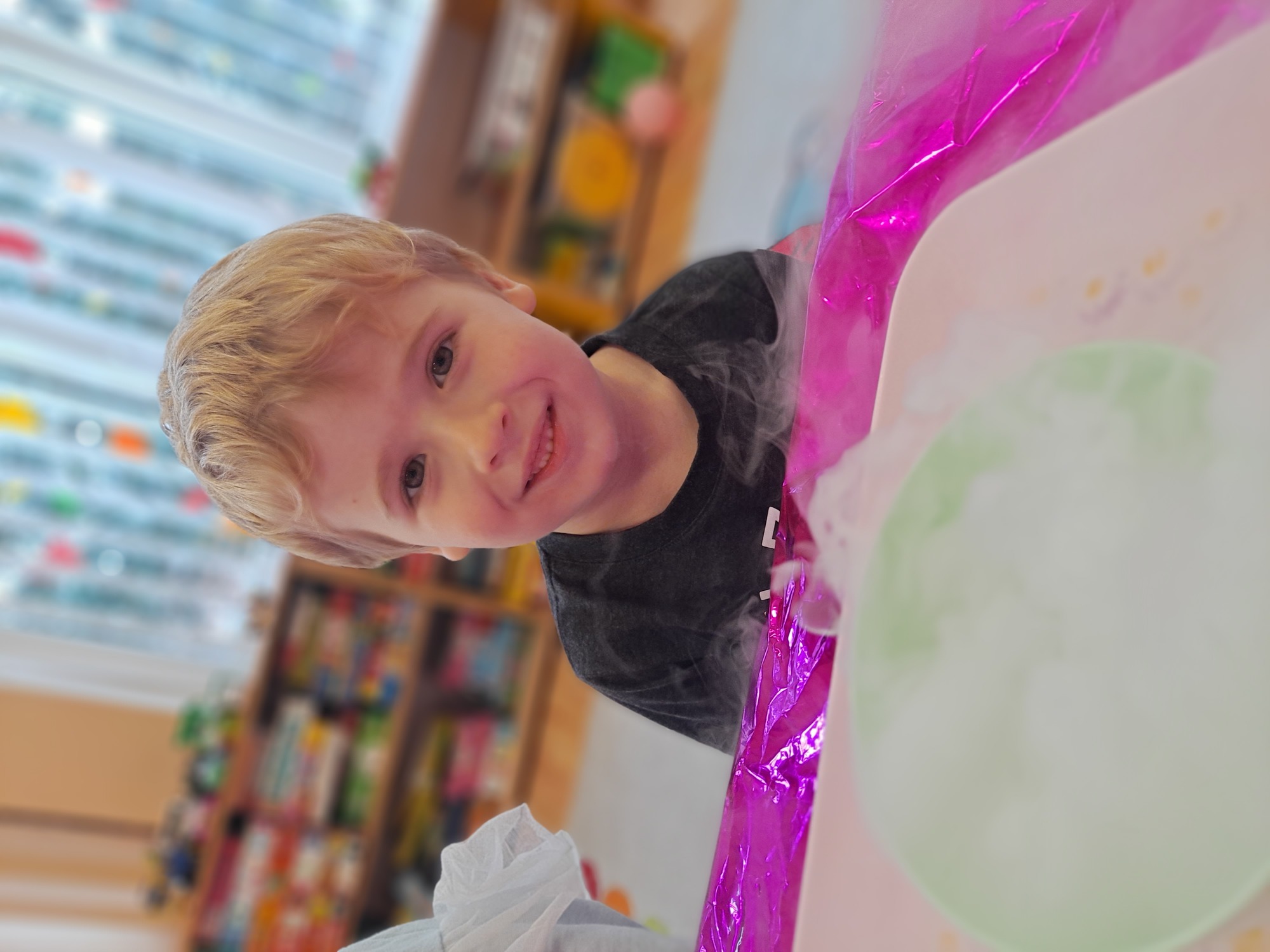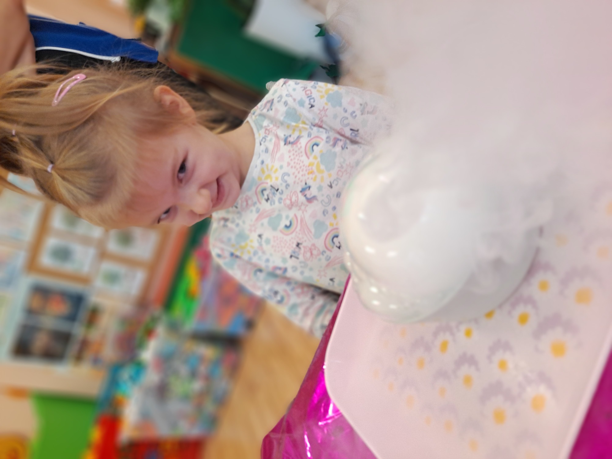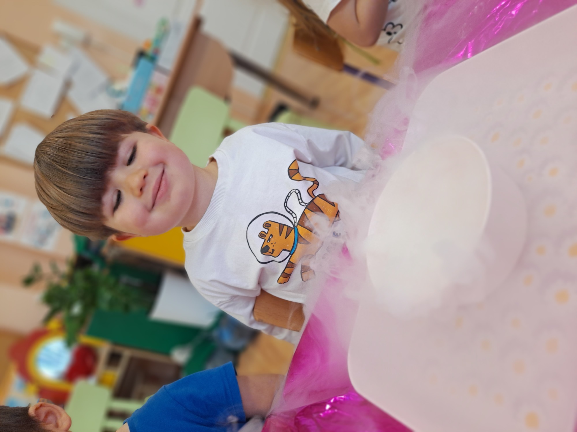 Dzieci miały okazję uczestniczyć w fascynujących doświadczeniach, w tym w zabawach z suchym lodem, które wywołały wiele śmiechu i zachwytu.