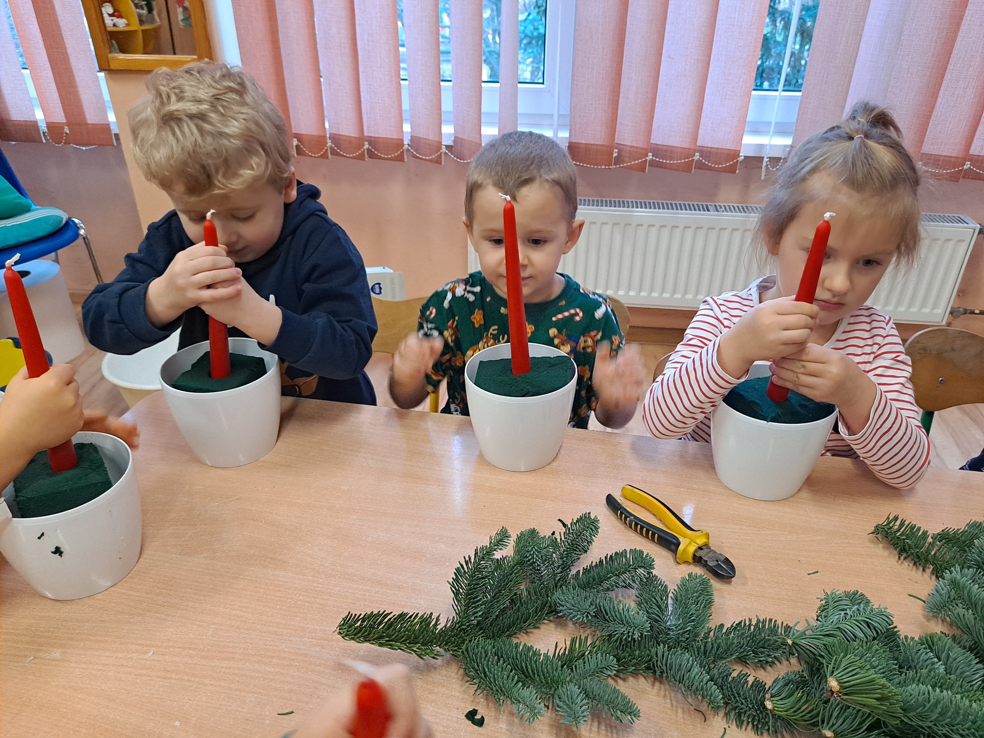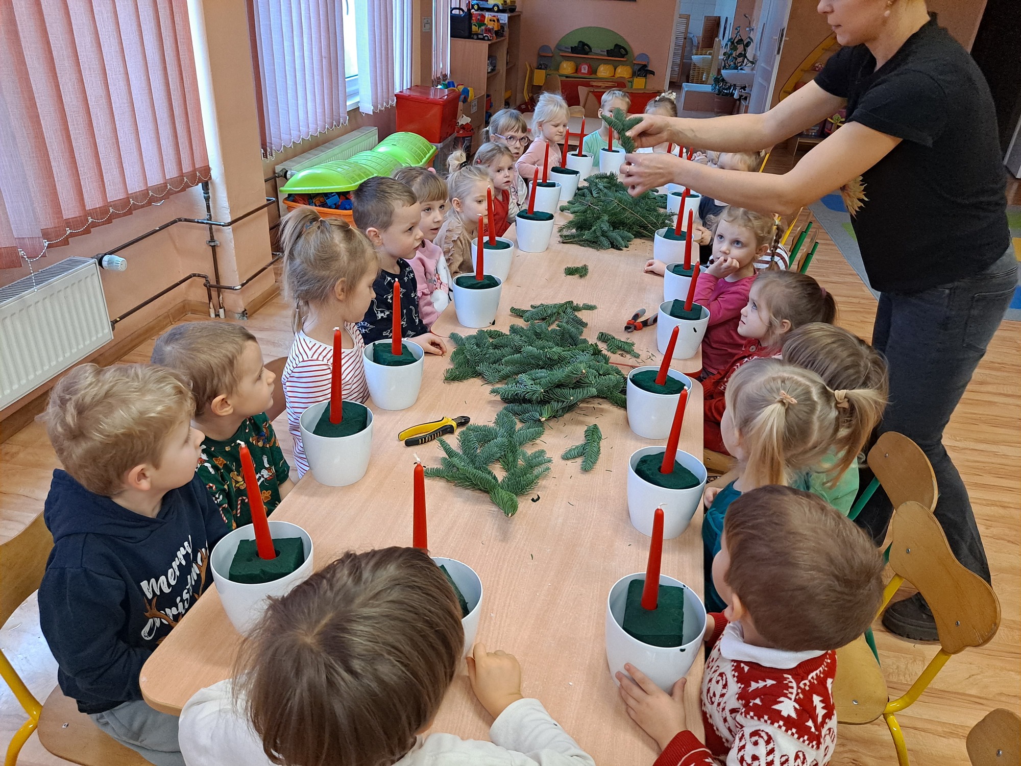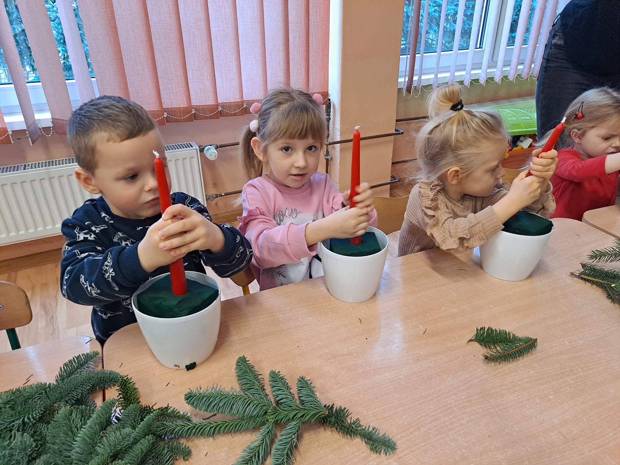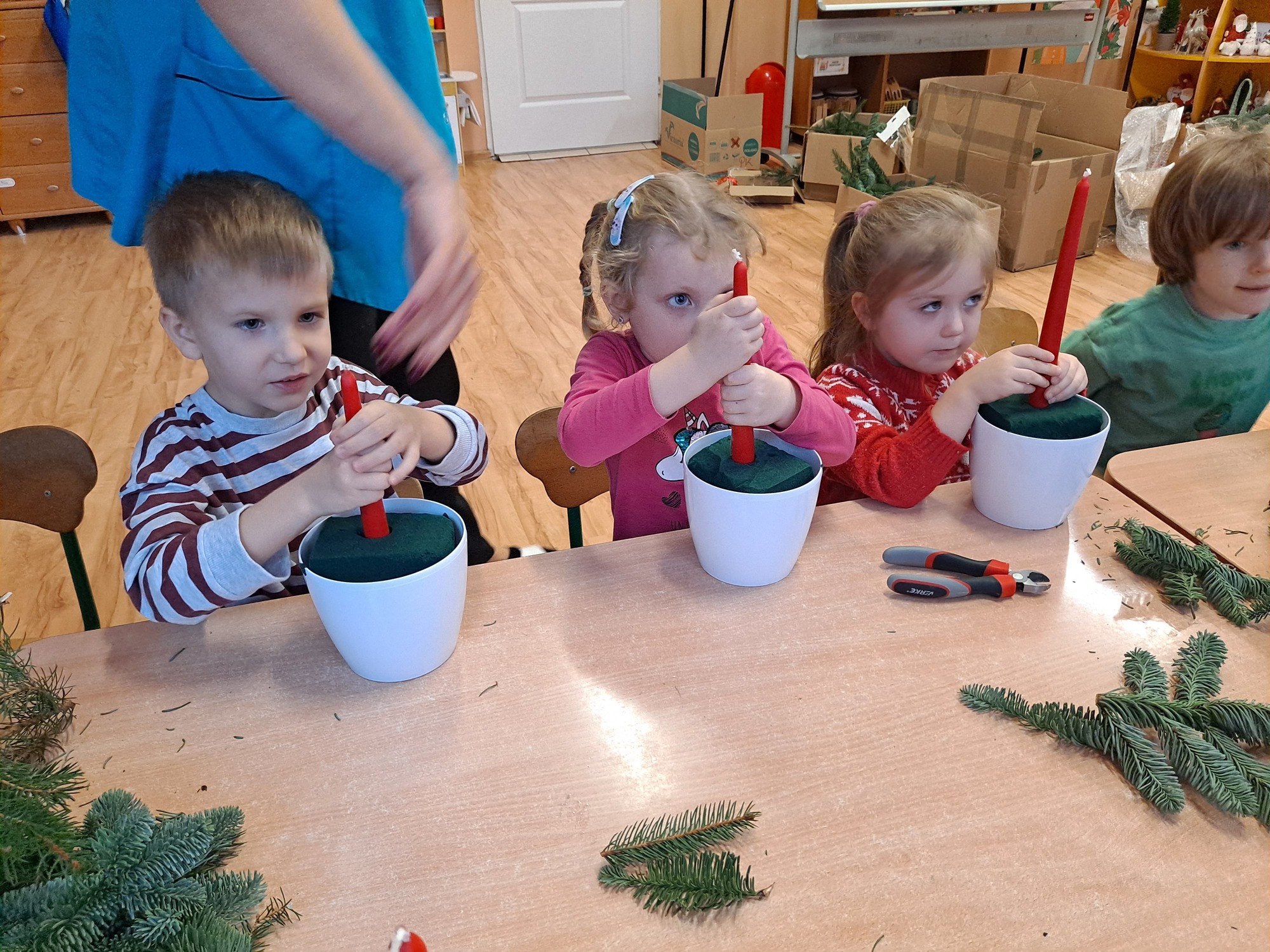Gościem specjalnym była pani Kasia, która krok po kroku wytłumaczyła dzieciom, jak powstaje stroik. Omówiła wszystkie dekoracje i materiały, z których korzystaliśmy, a następnie z wielką cierpliwością i uśmiechem pomagała dzieciom w pracy. Dzięki jasnym wskazówkom każde dziecko mogło samodzielnie stworzyć swoją wyjątkową ozdobę.