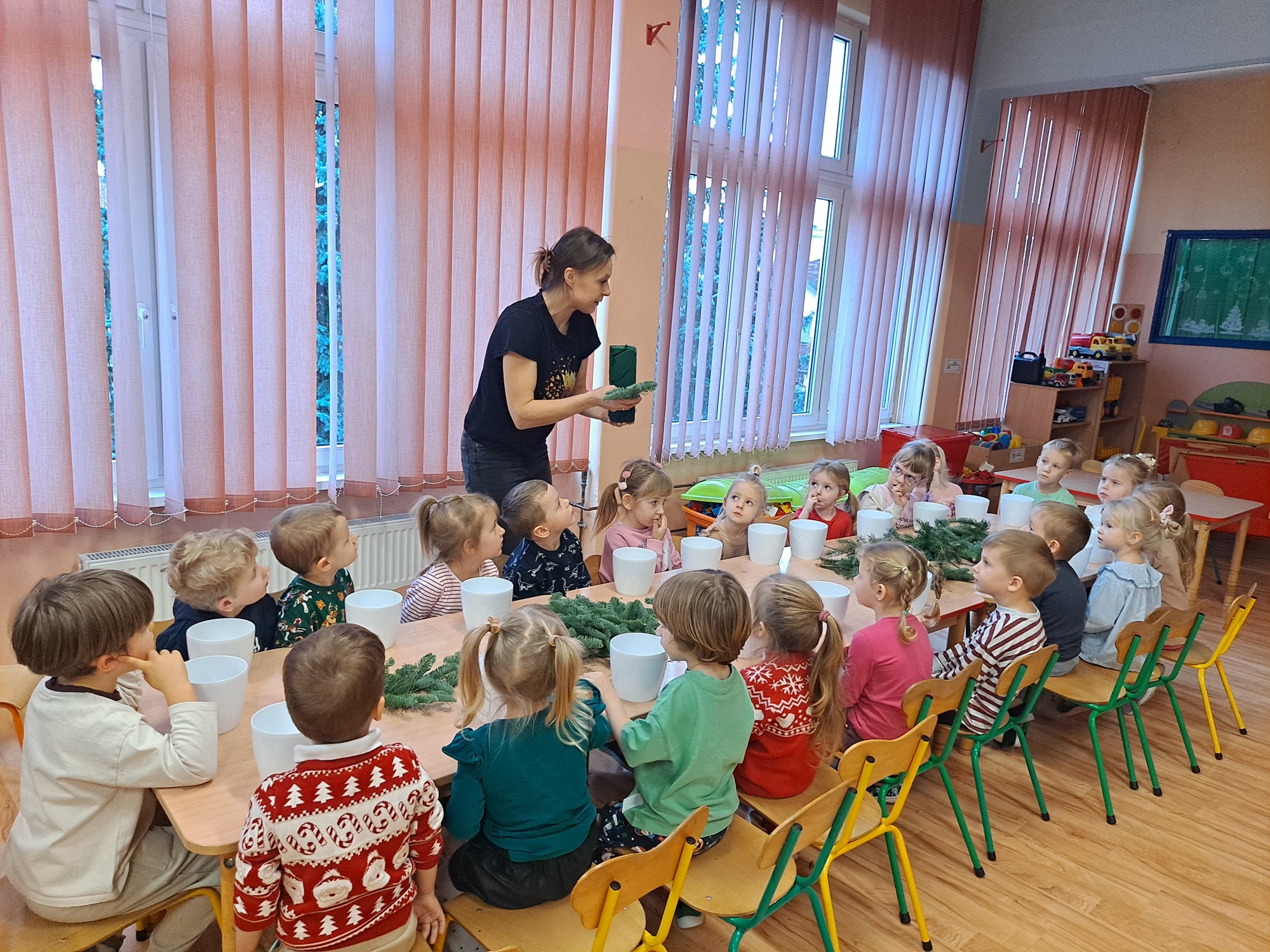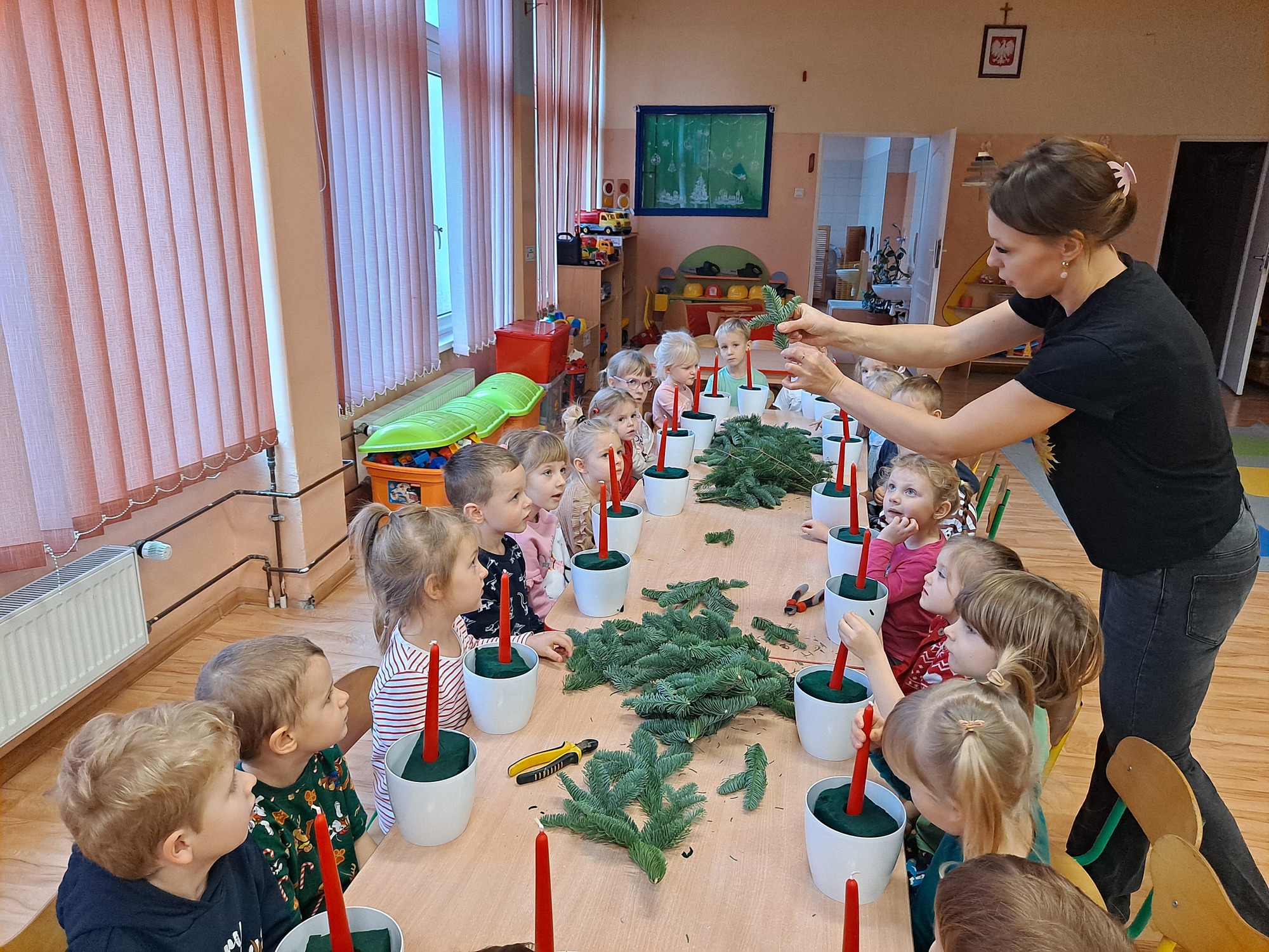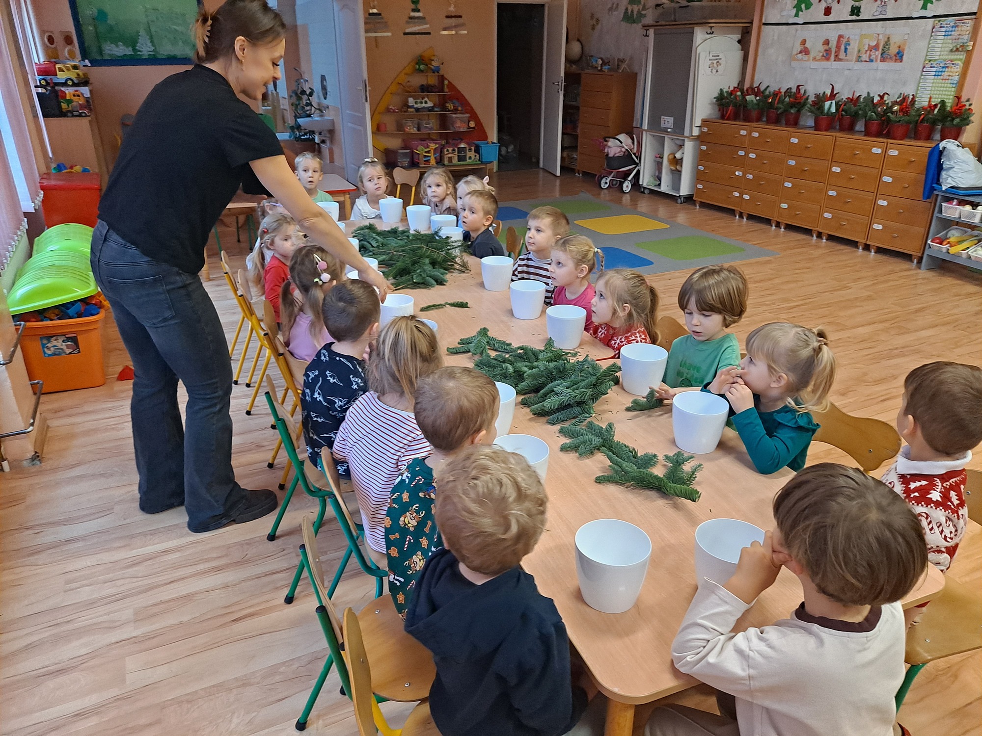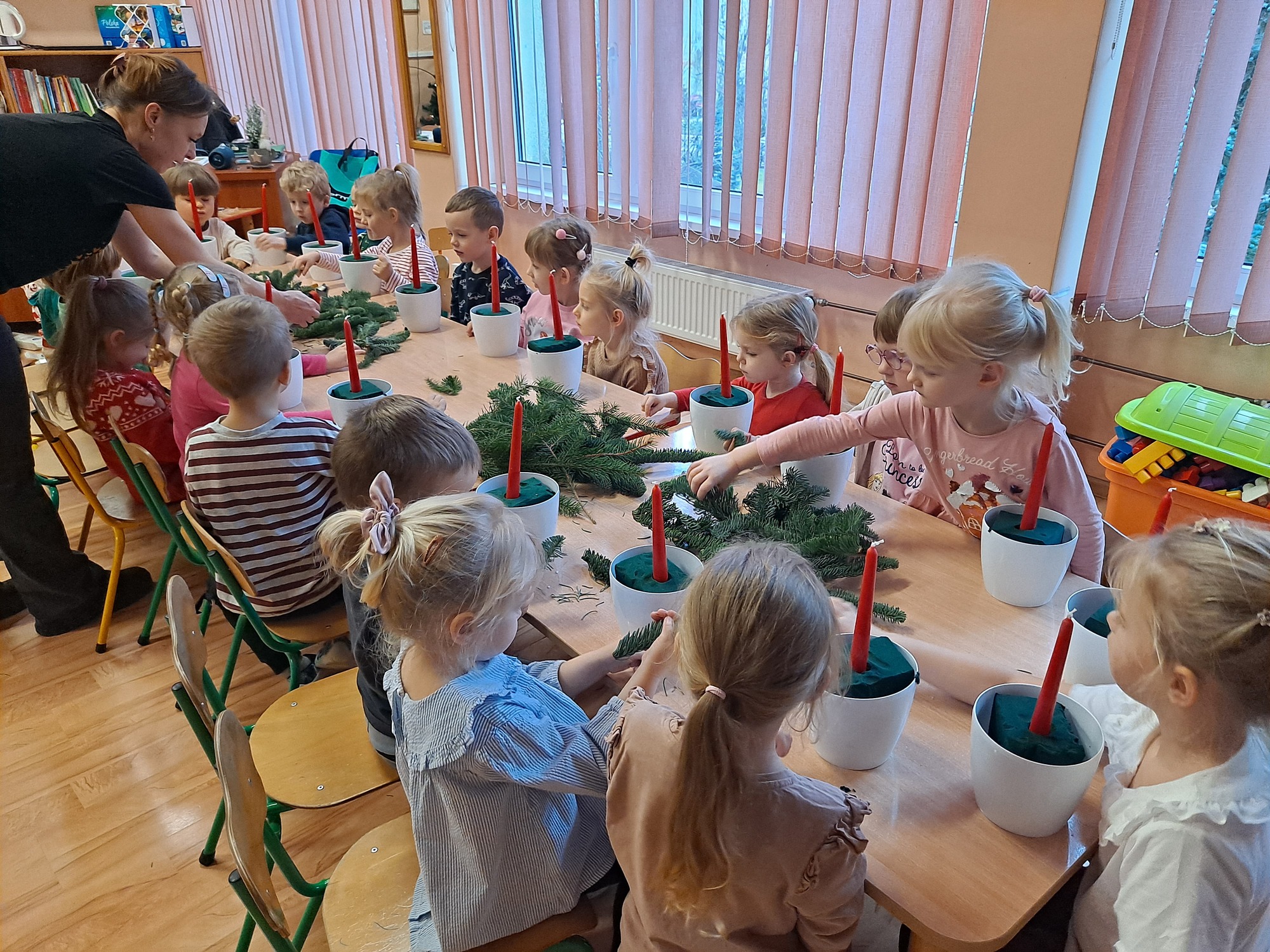 Gościem specjalnym była pani Kasia, która krok po kroku wytłumaczyła dzieciom, jak powstaje stroik. Omówiła wszystkie dekoracje i materiały, z których korzystaliśmy, a następnie z wielką cierpliwością i uśmiechem pomagała dzieciom w pracy. Dzięki jasnym wskazówkom każde dziecko mogło samodzielnie stworzyć swoją wyjątkową ozdobę.