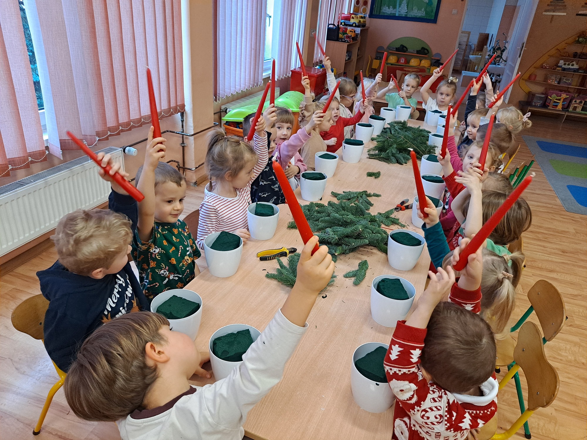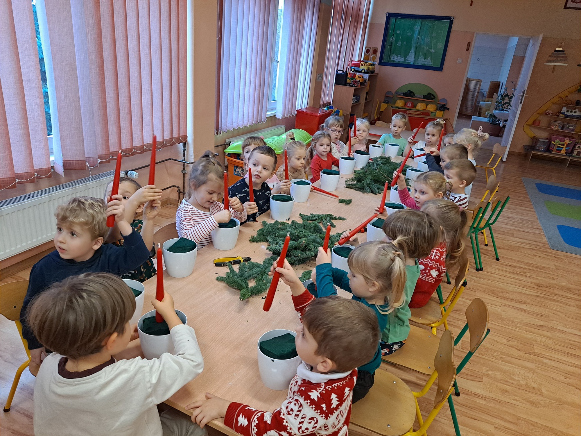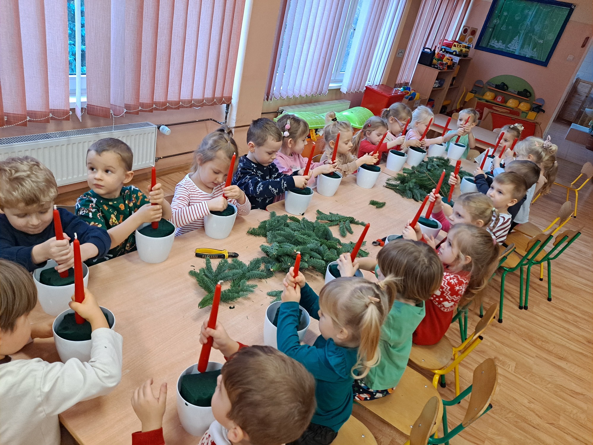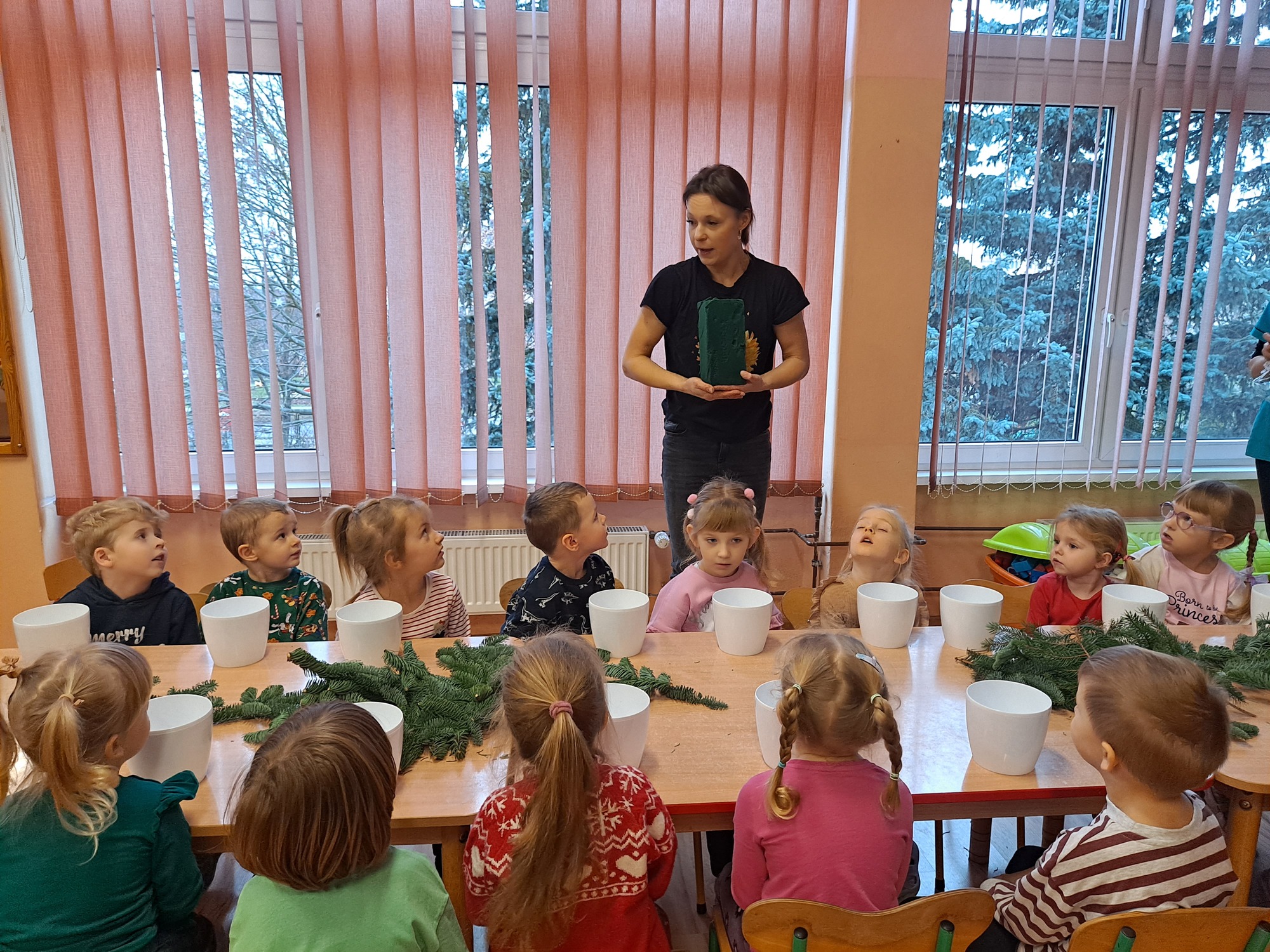 Gościem specjalnym była pani Kasia, która krok po kroku wytłumaczyła dzieciom, jak powstaje stroik. Omówiła wszystkie dekoracje i materiały, z których korzystaliśmy, a następnie z wielką cierpliwością i uśmiechem pomagała dzieciom w pracy. Dzięki jasnym wskazówkom każde dziecko mogło samodzielnie stworzyć swoją wyjątkową ozdobę.