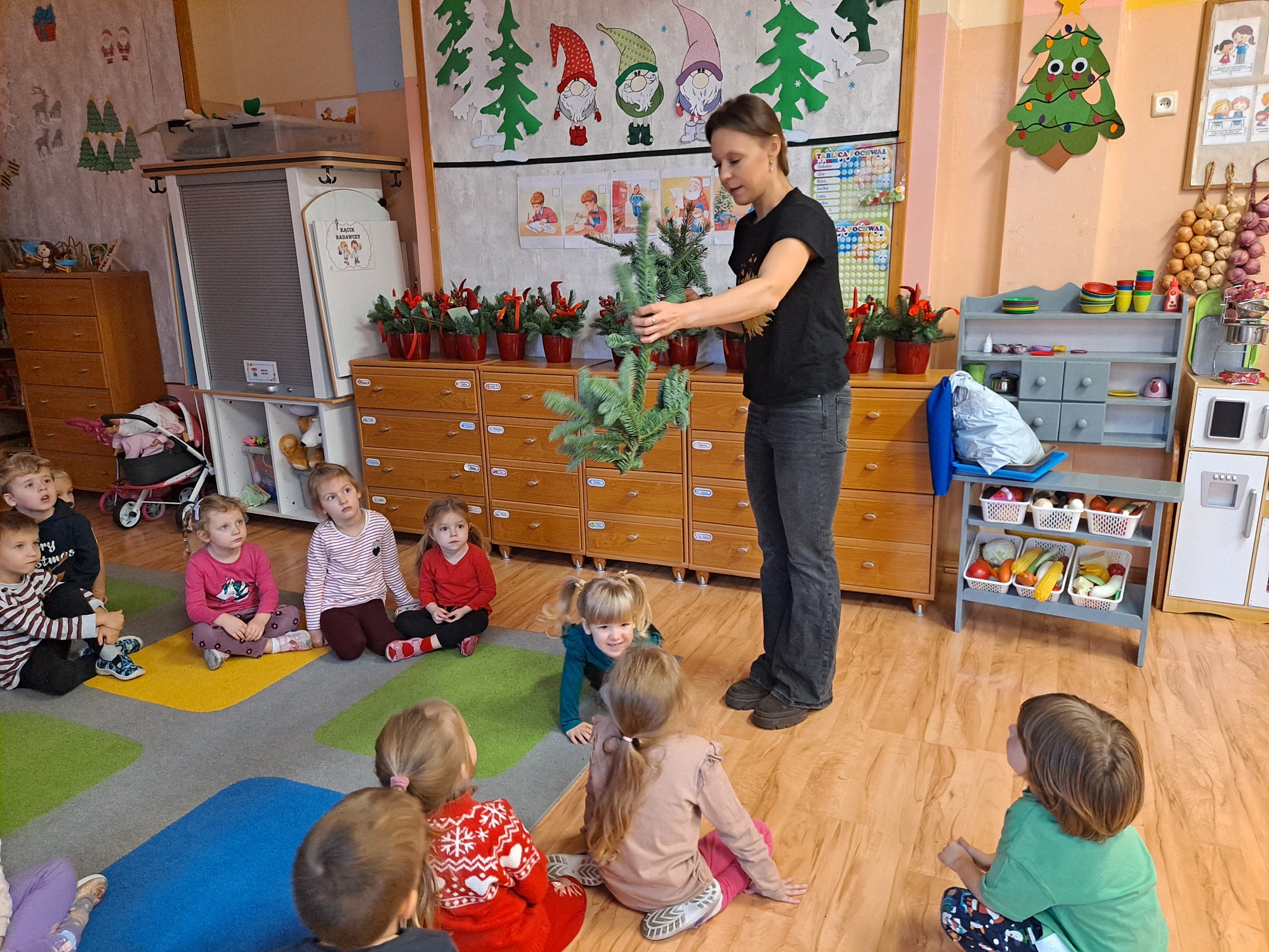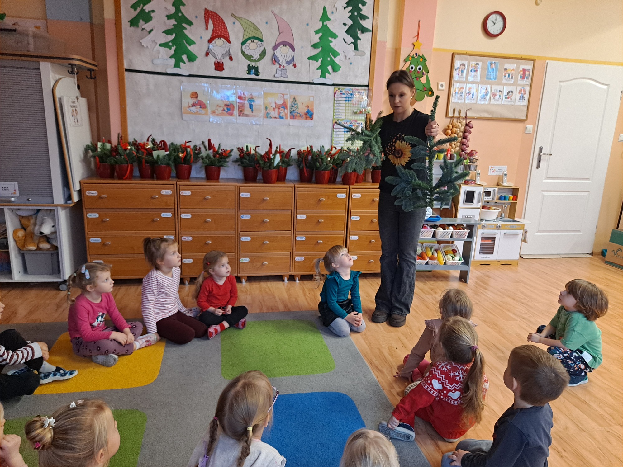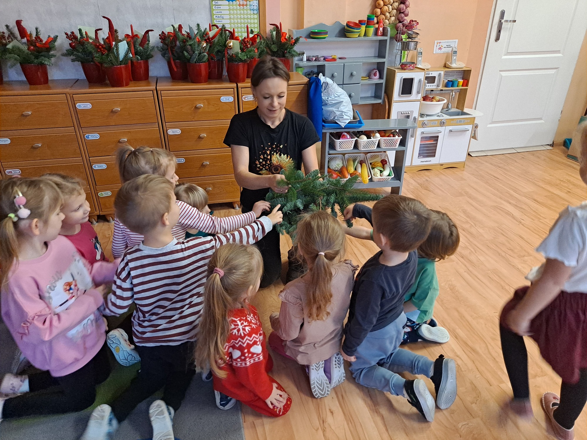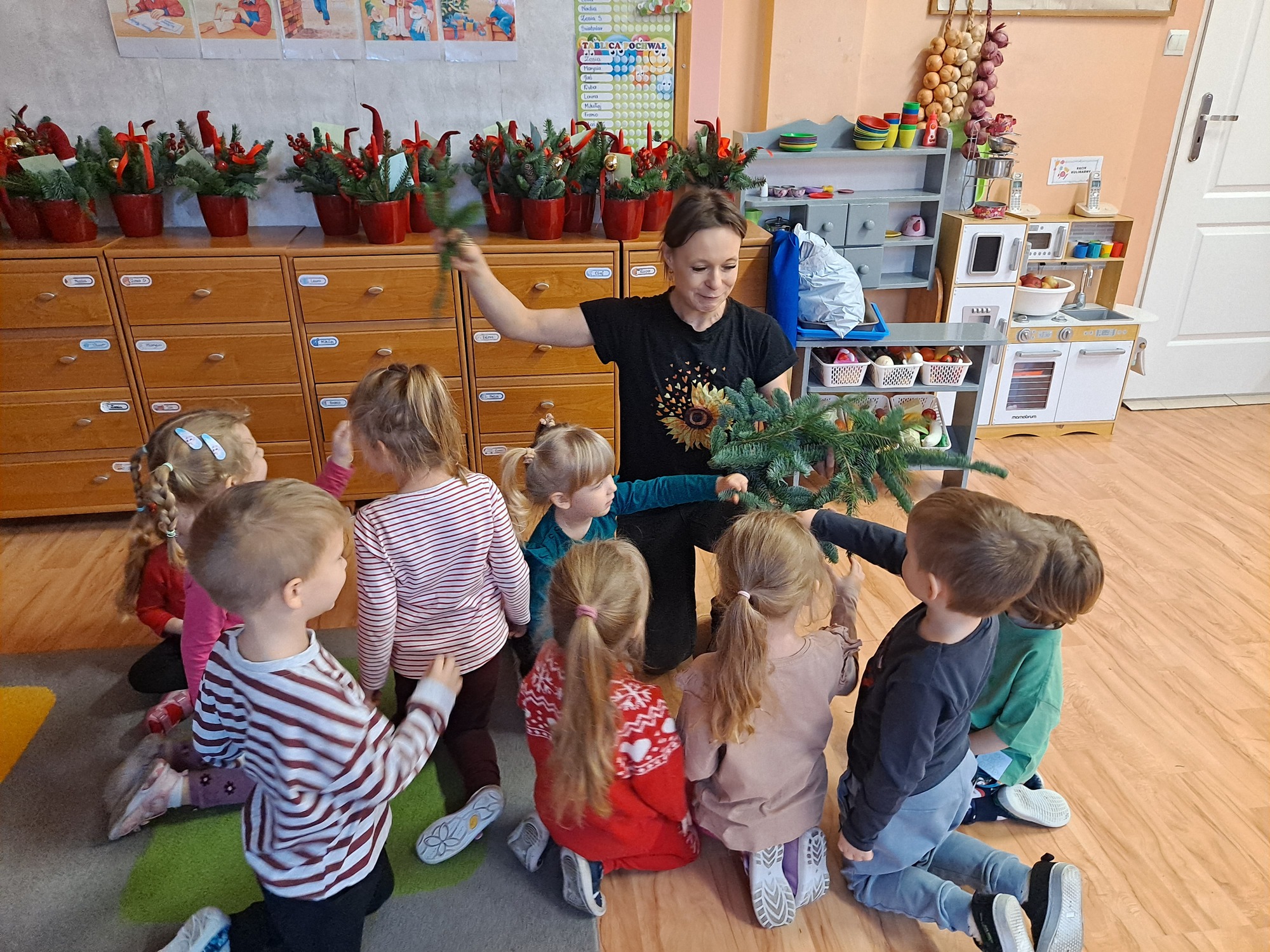 Gościem specjalnym była pani Kasia, która krok po kroku wytłumaczyła dzieciom, jak powstaje stroik. Omówiła wszystkie dekoracje i materiały, z których korzystaliśmy, a następnie z wielką cierpliwością i uśmiechem pomagała dzieciom w pracy. Dzięki jasnym wskazówkom każde dziecko mogło samodzielnie stworzyć swoją wyjątkową ozdobę.