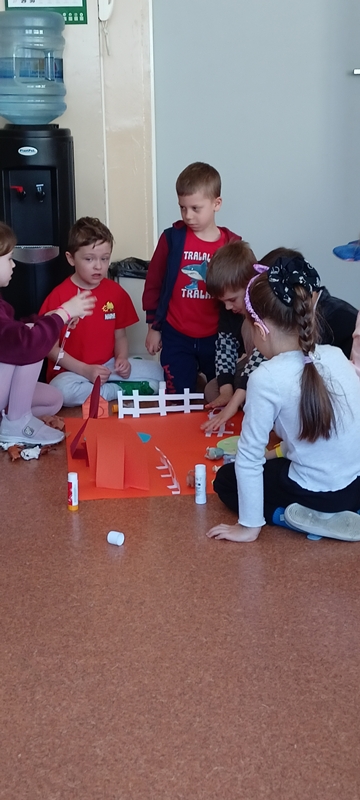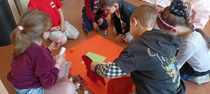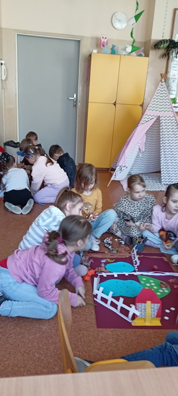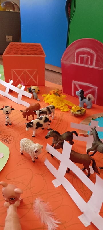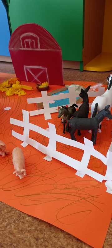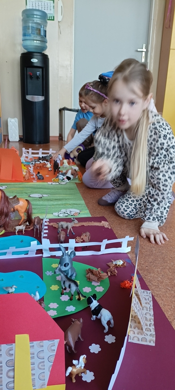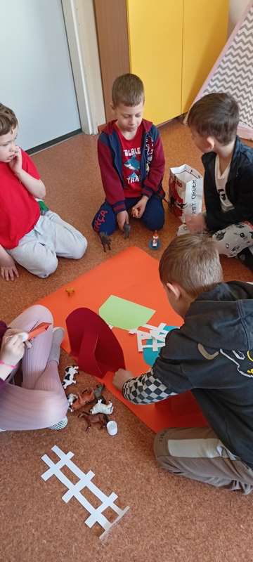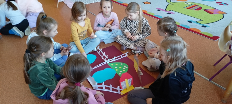 W ramach omawianej tematyki w tym miesiącu w czasie zajęć plastycznych dzieci wykonywały makiety wiejskiego podwórka. Praca polegała na współpracy w zespołach i aranżacji gospodarstwa wiejskiego. W czasie zajęć dzieci wykazały się wiedzą i dużą kreatywnością, a po skończonych zajęciach makiety służyły dzieciom do zabawy.